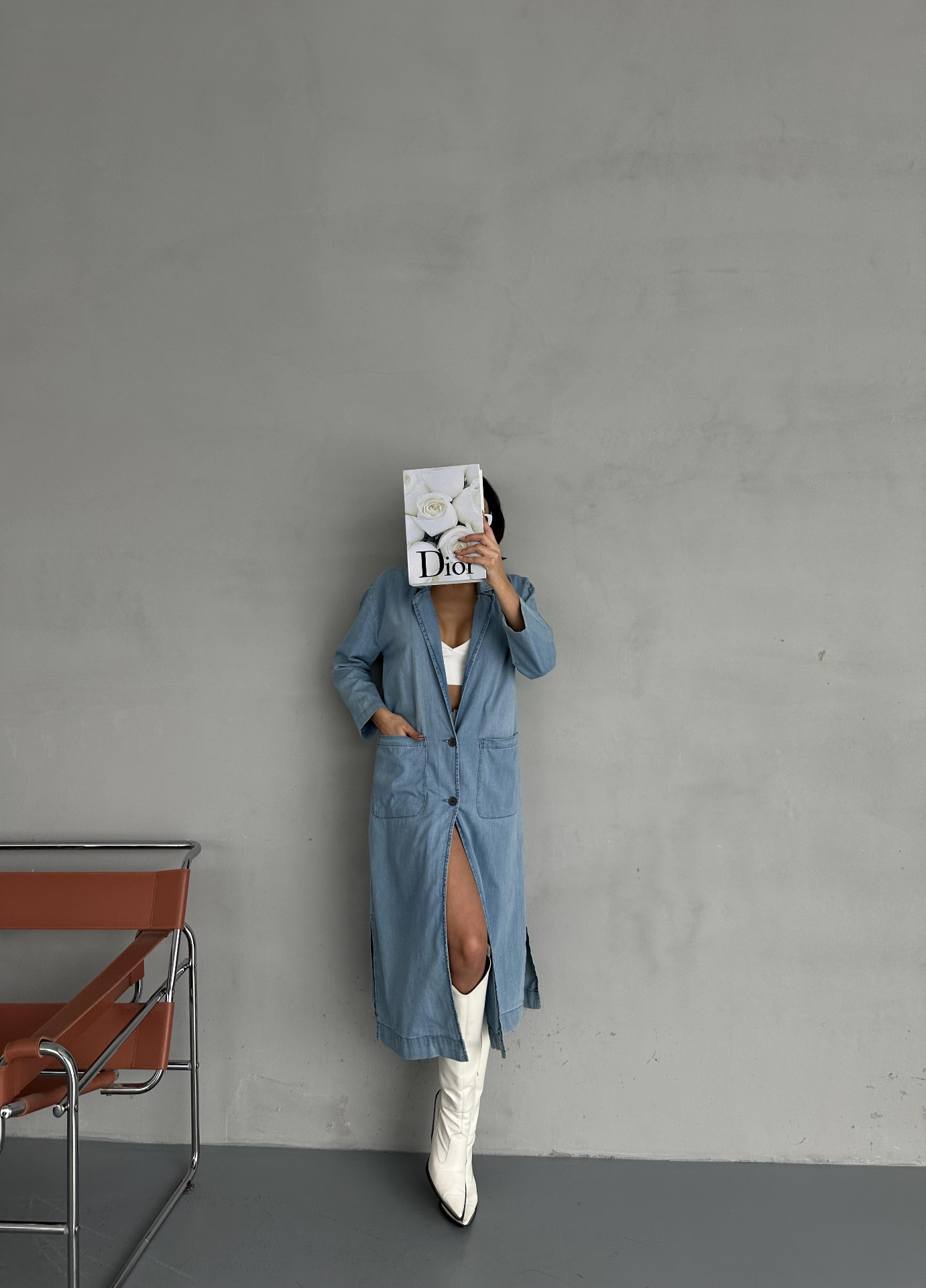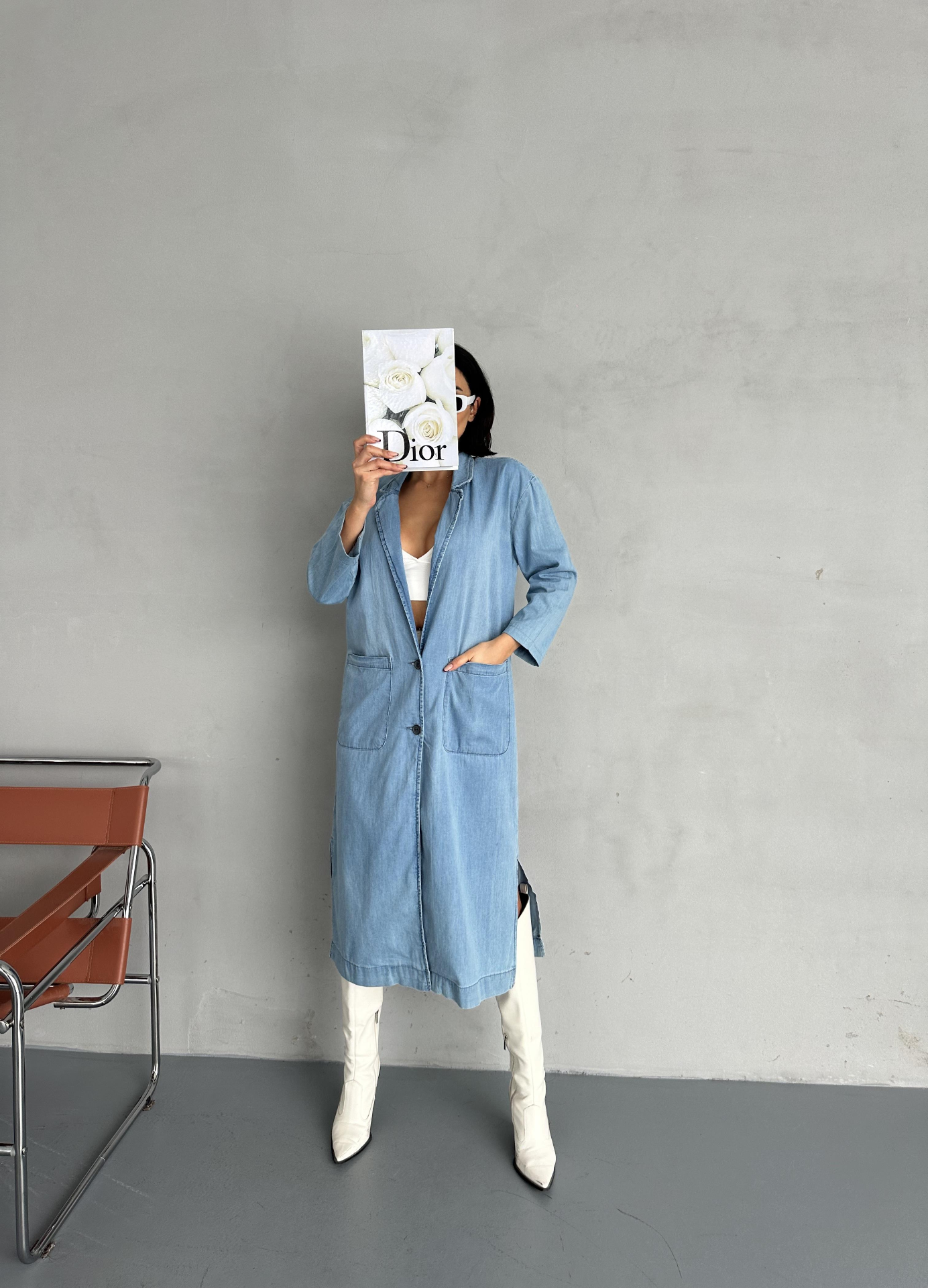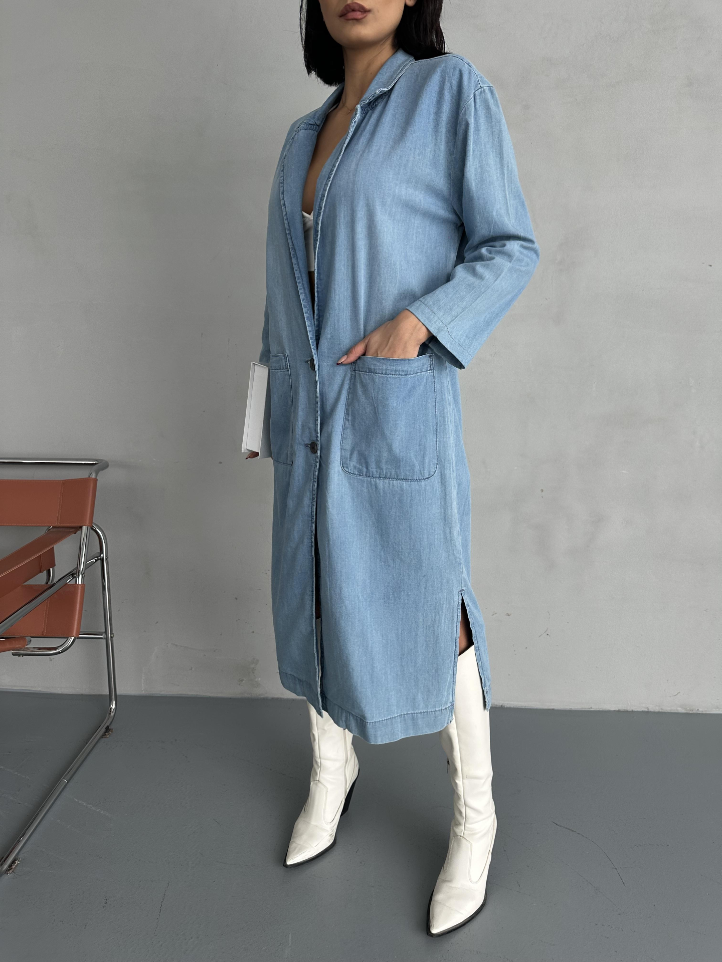Açık Mavi Bornoz Yaka Cep Detaylı Kadın Trençkot