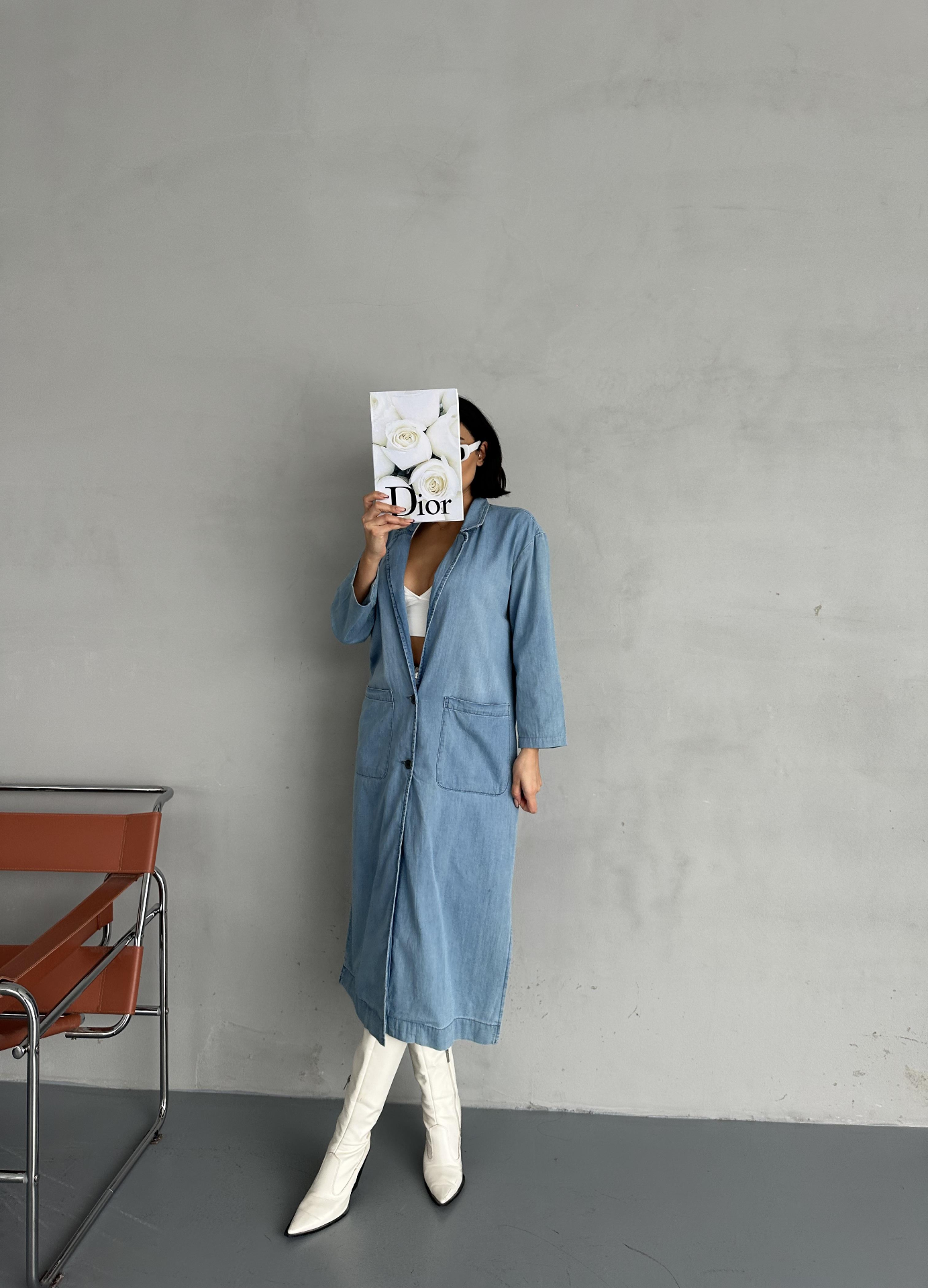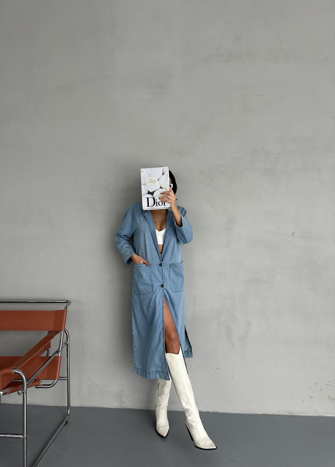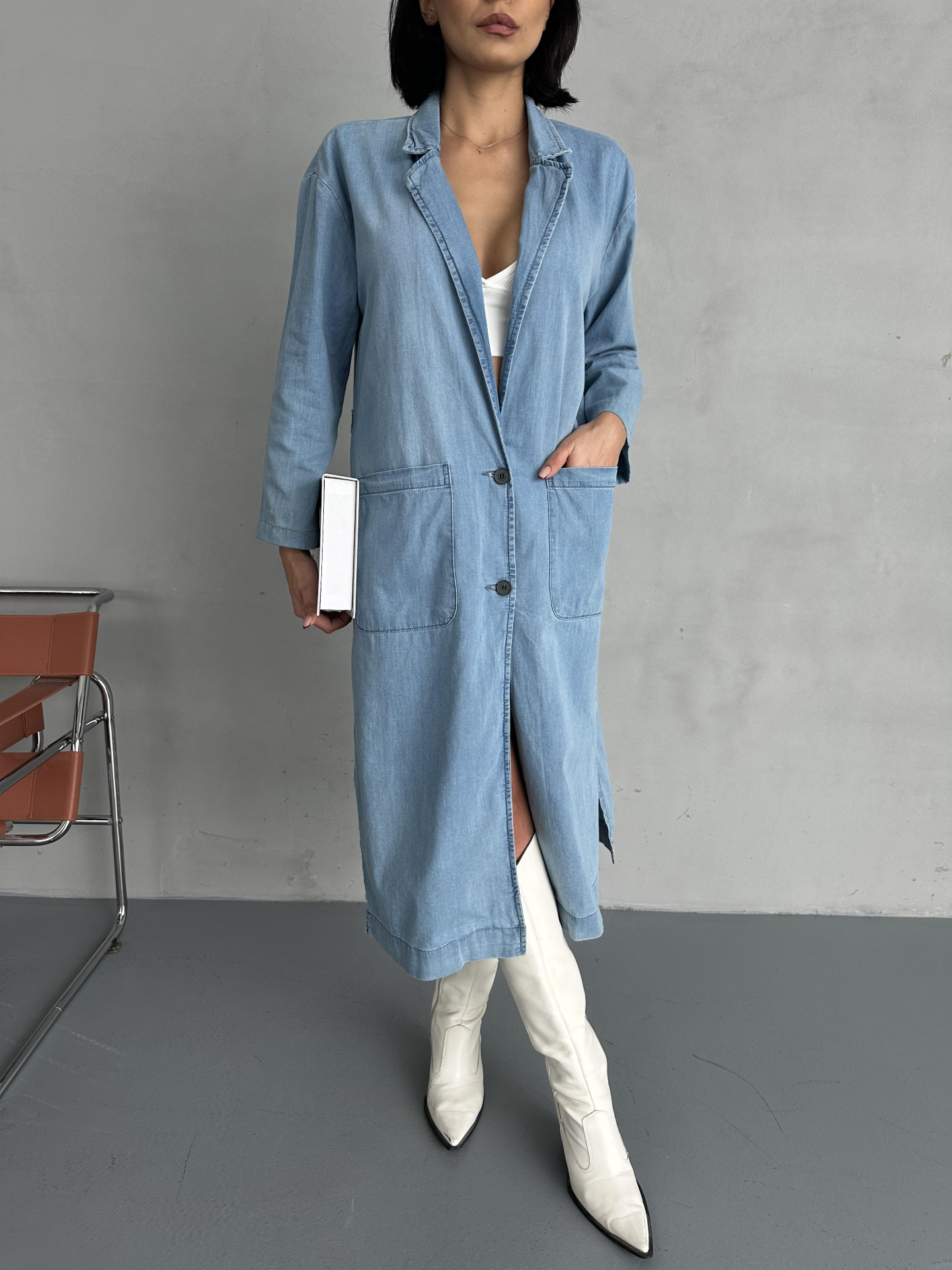 Açık Mavi Bornoz Yaka Cep Detaylı Kadın Trençkot