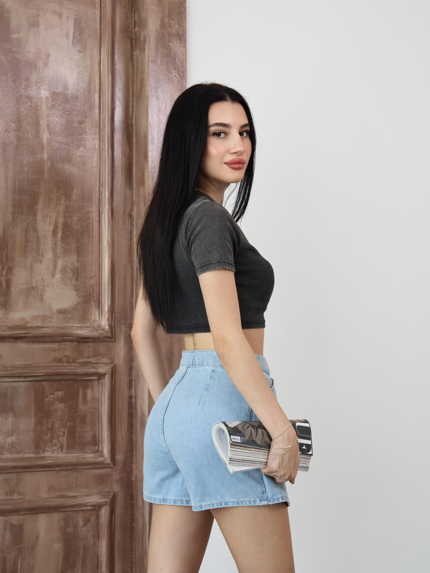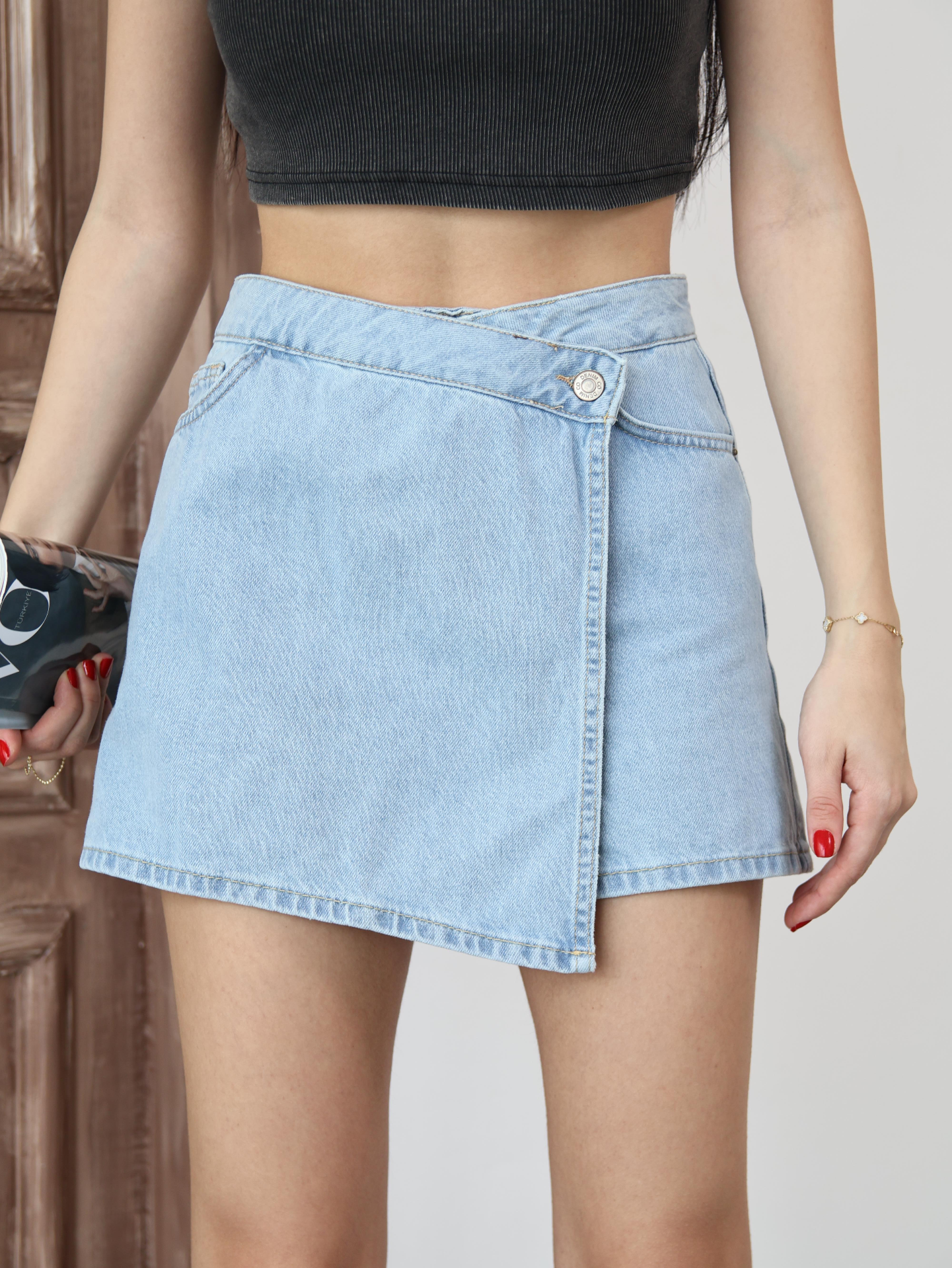 Açık Mavi Kruvaze Mini Denim Şort Etek