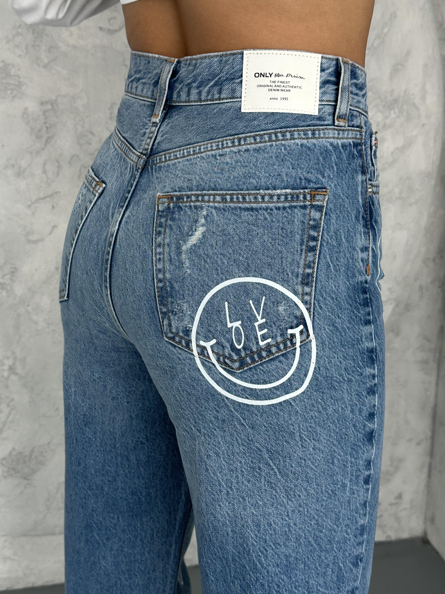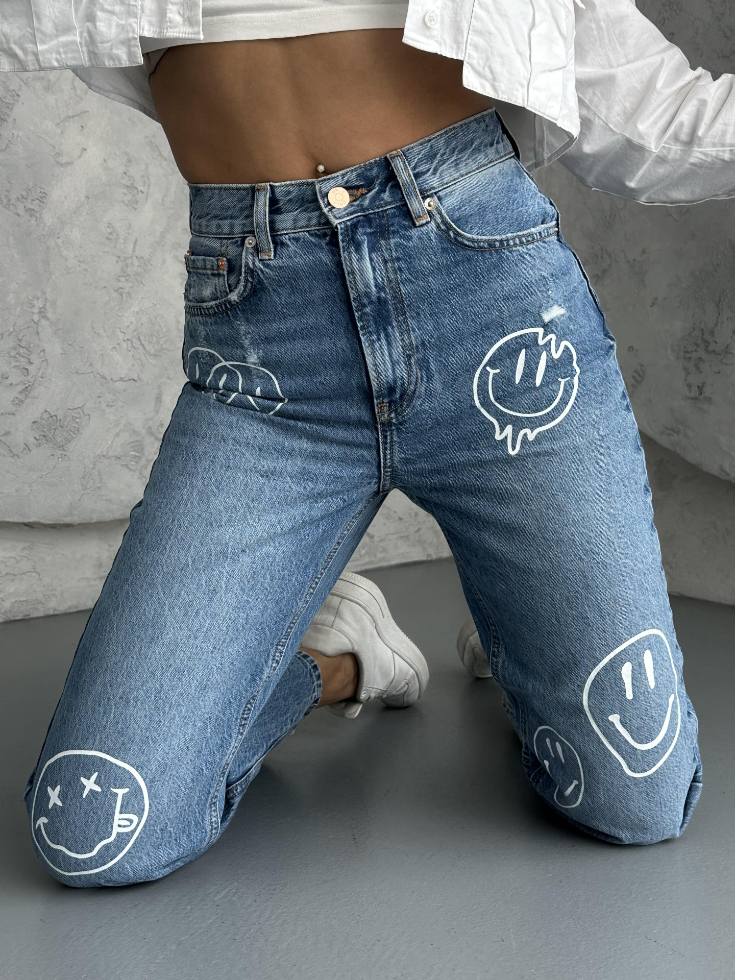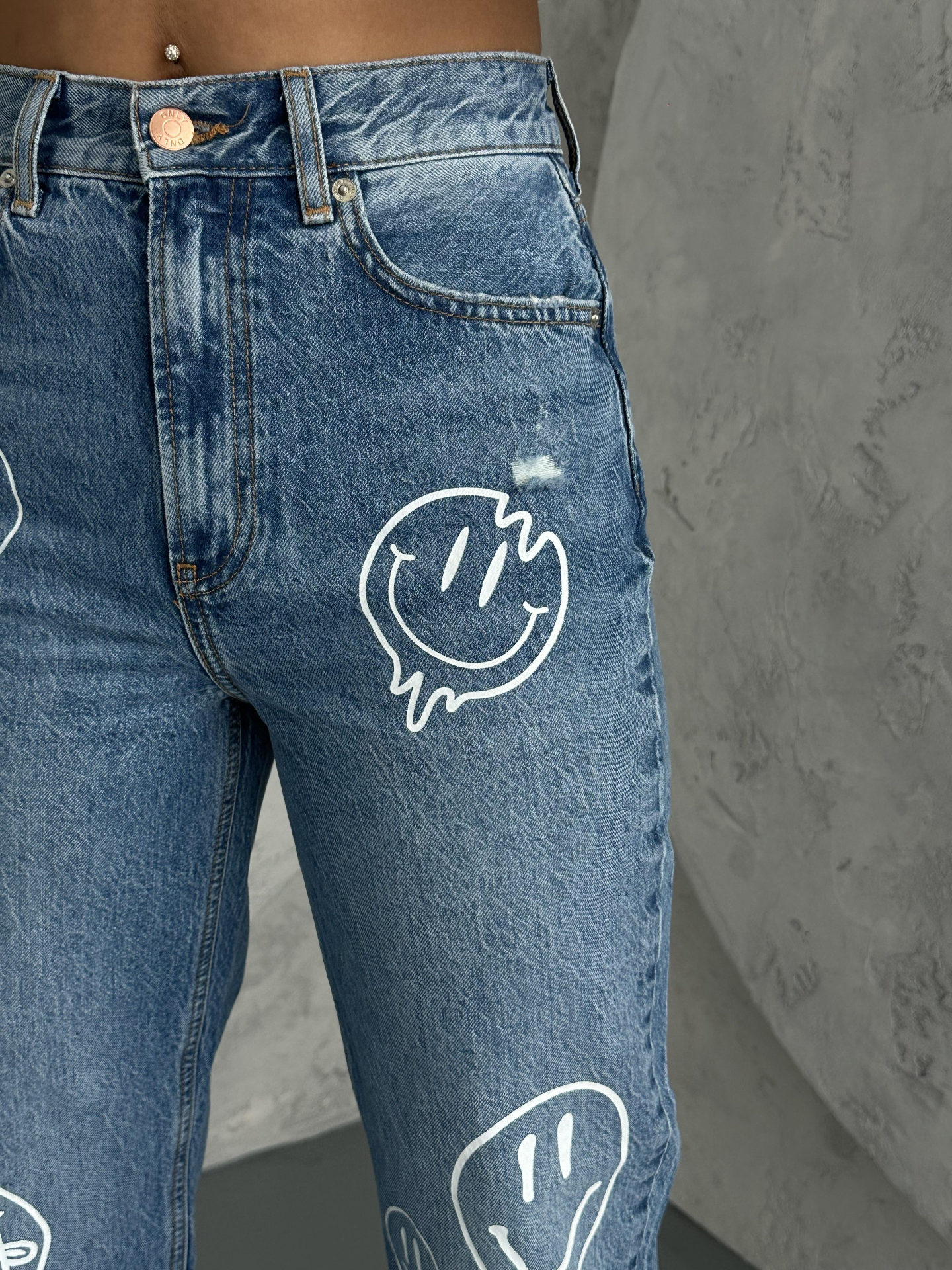 Açık Mavi Şekillendiren Etki Smile Baskılı Yüksel Bel Mom Jean