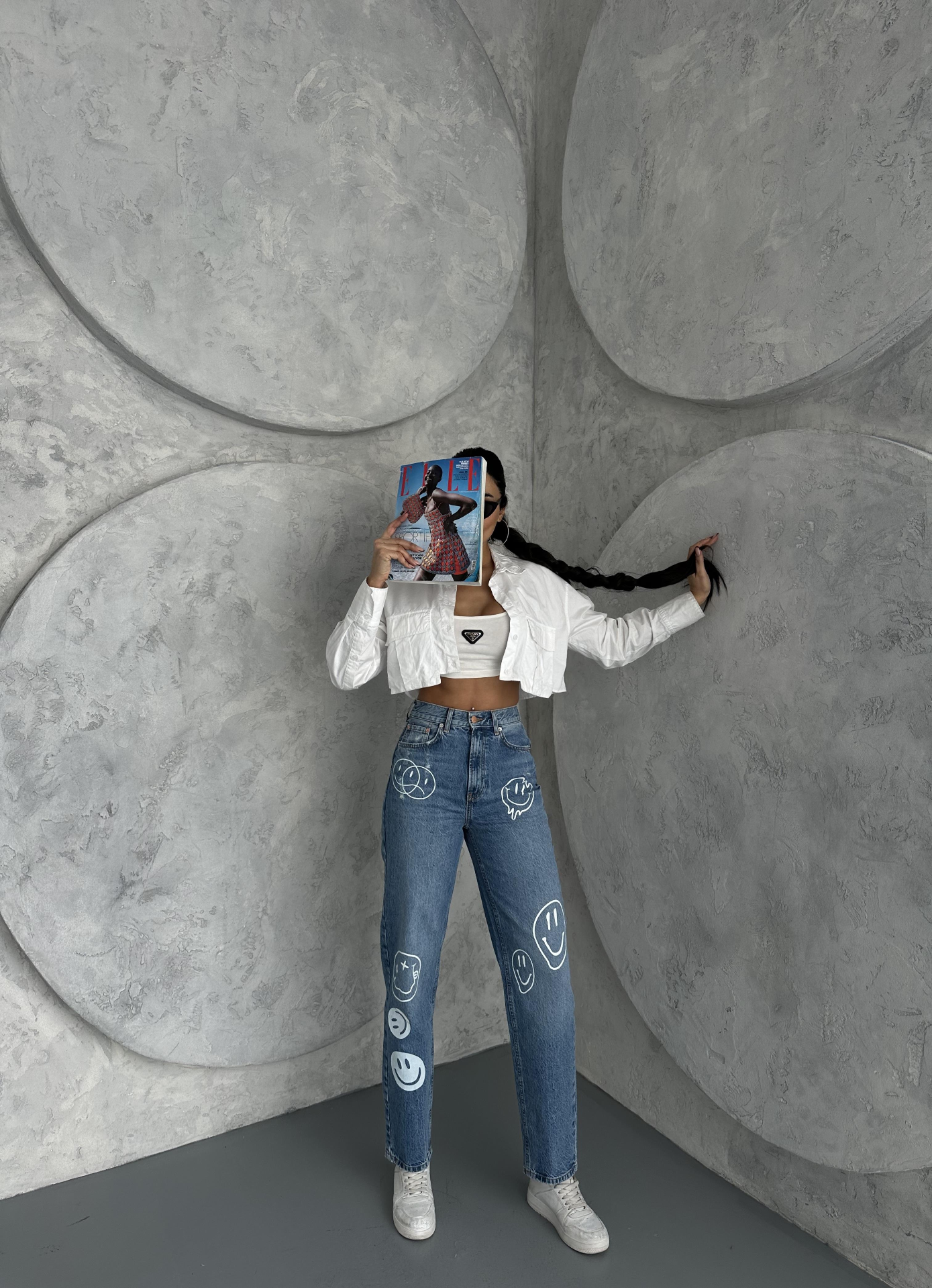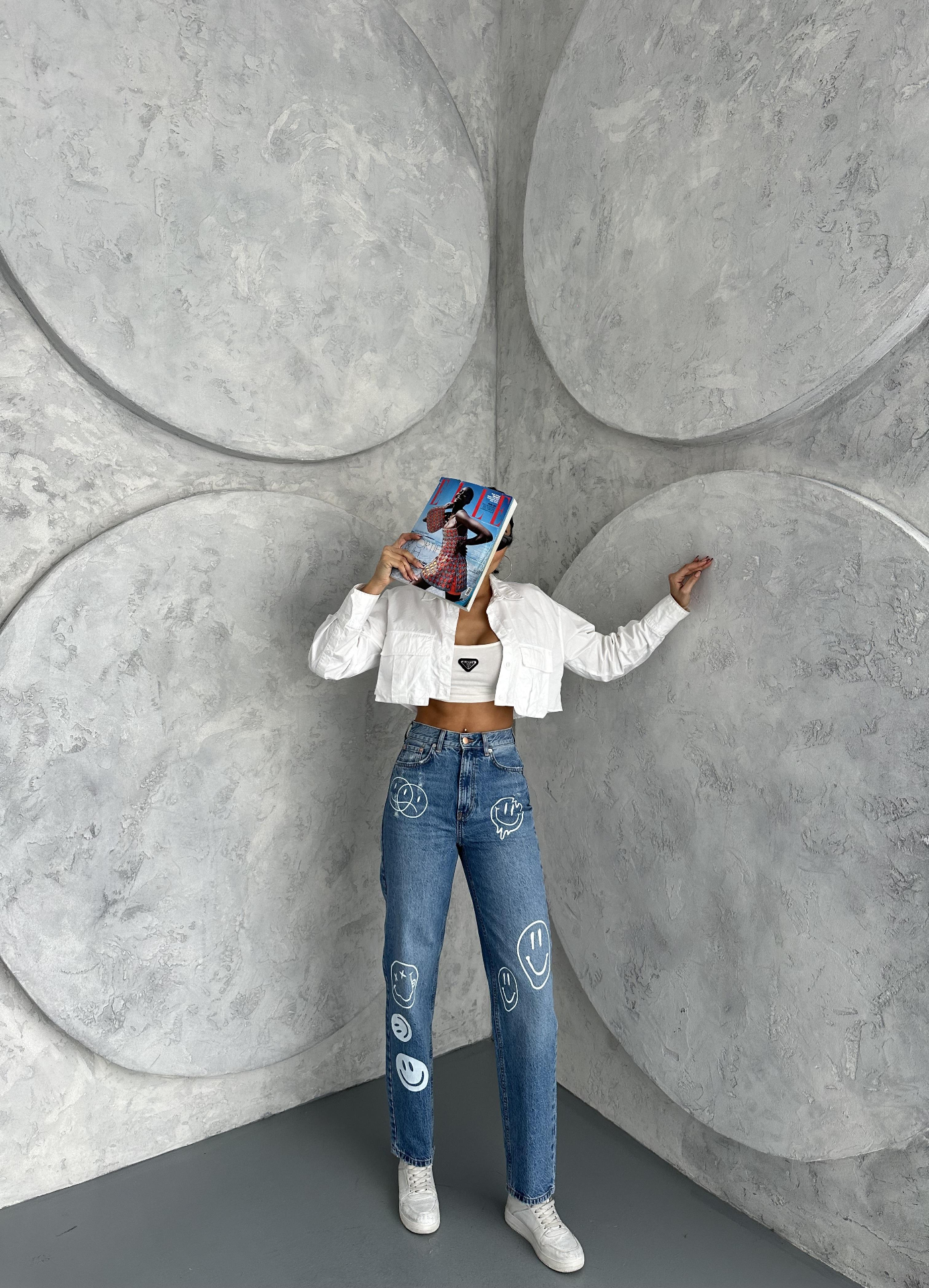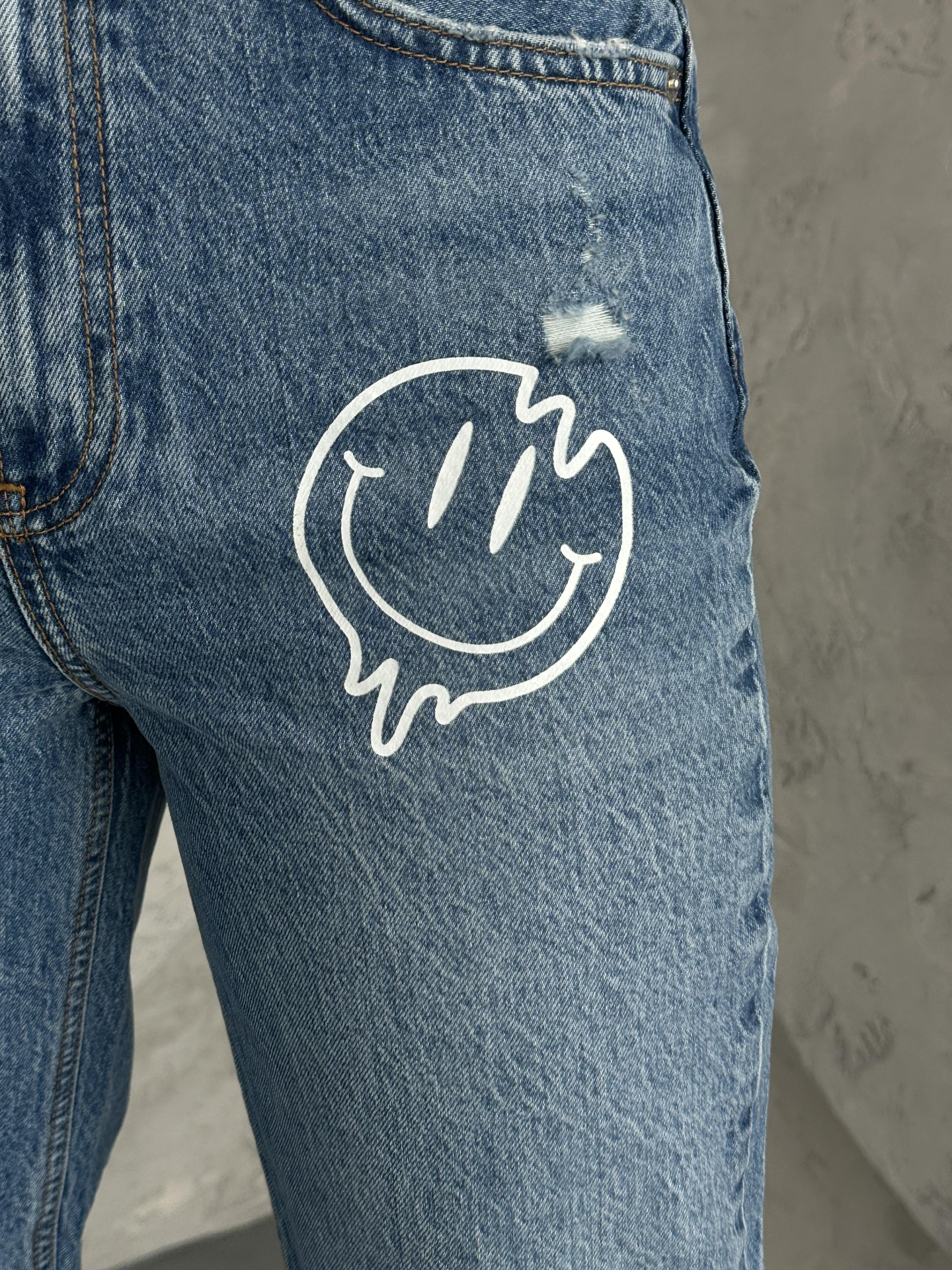 Açık Mavi Şekillendiren Etki Smile Baskılı Yüksel Bel Mom Jean