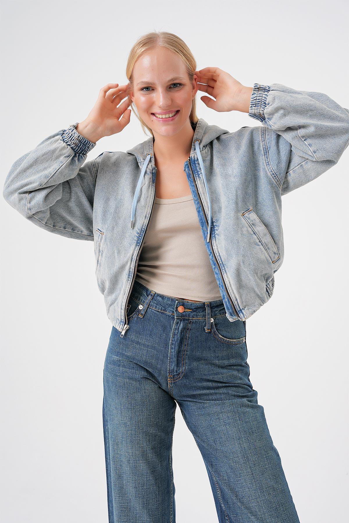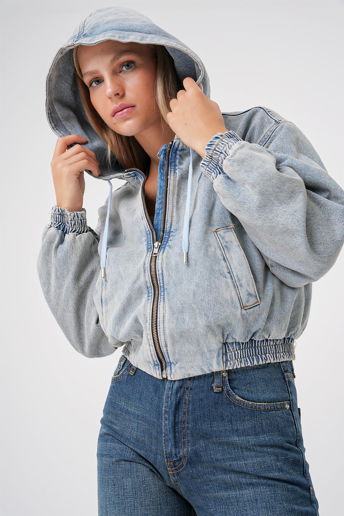 Açık Mavi Vintage Yiıkama Kapusonlu Oversize Denim Bomber Ceket