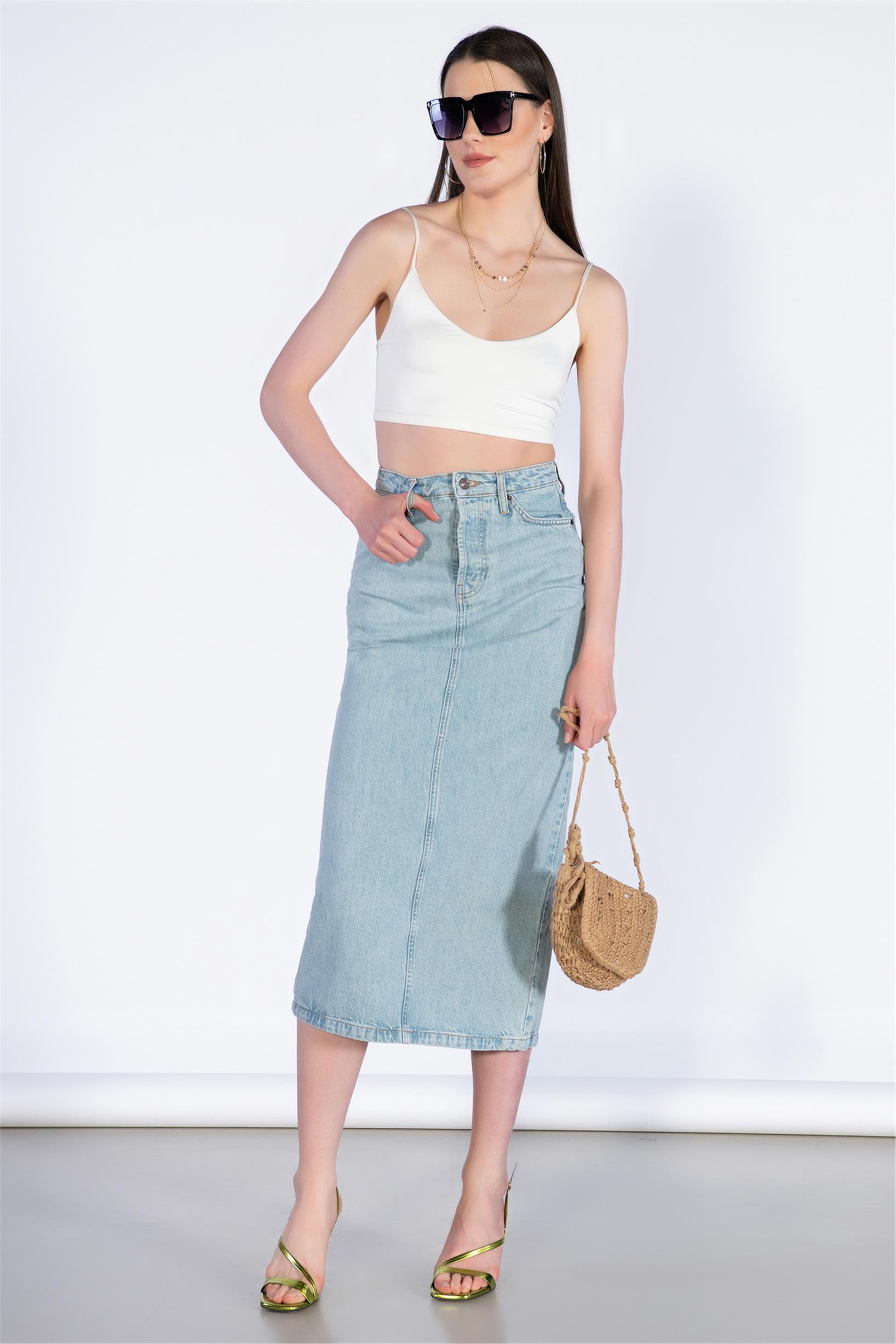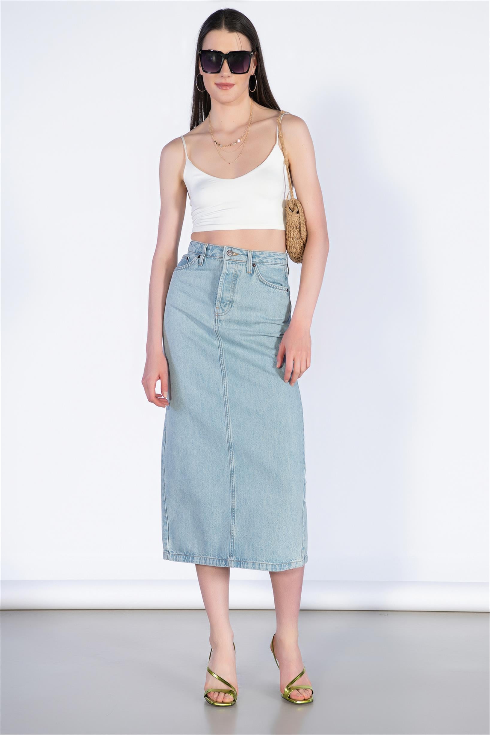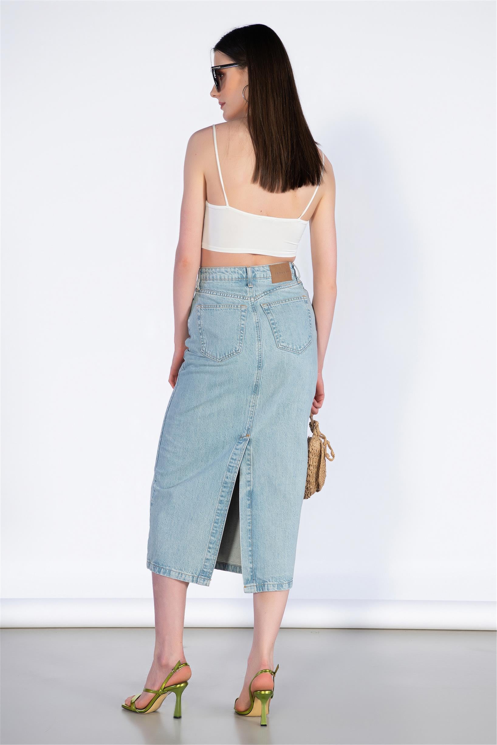 Açık Mavi Yüksek Bel Arka Yırtmaç Detay Midi Boy Denim Etek