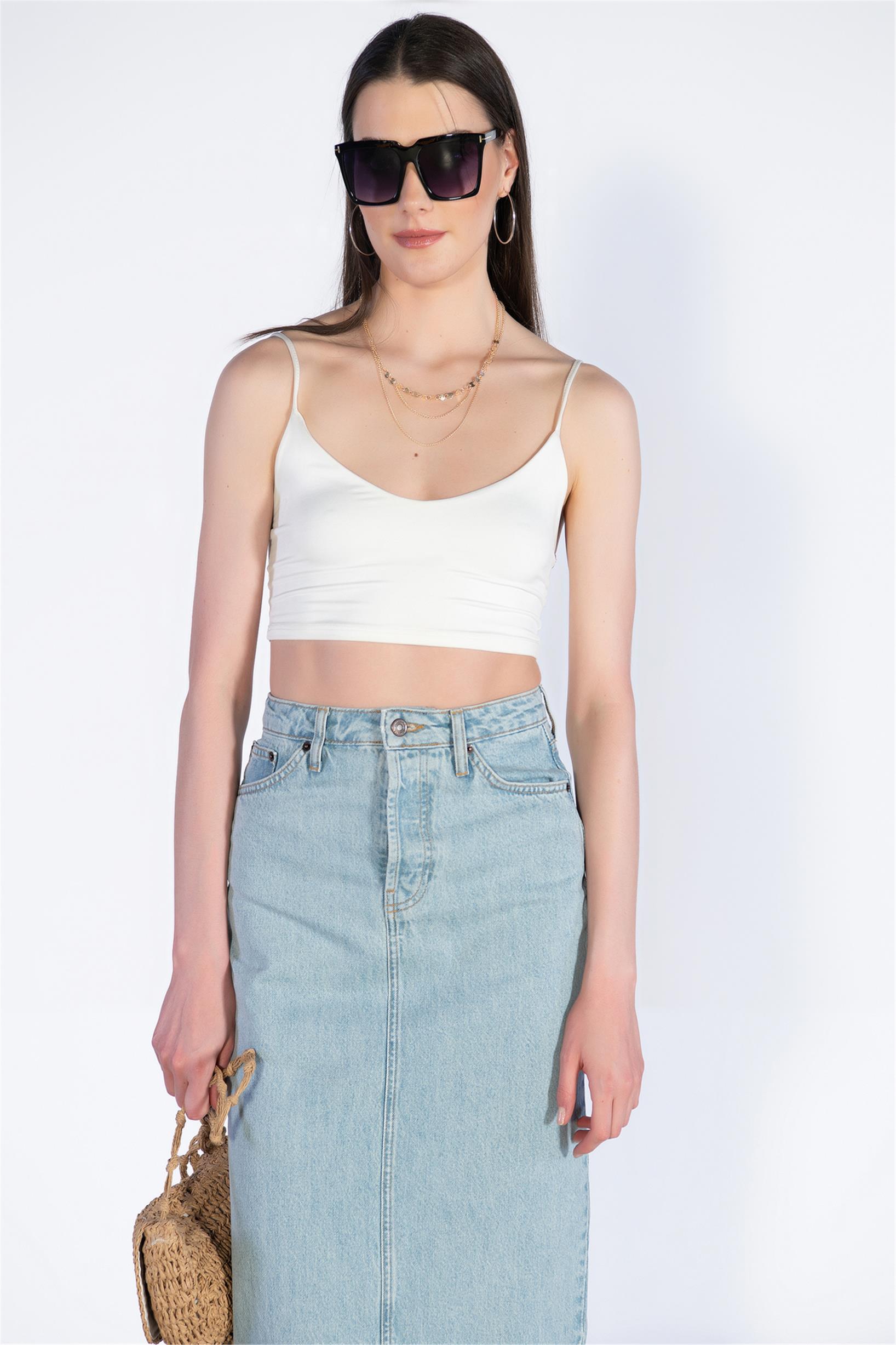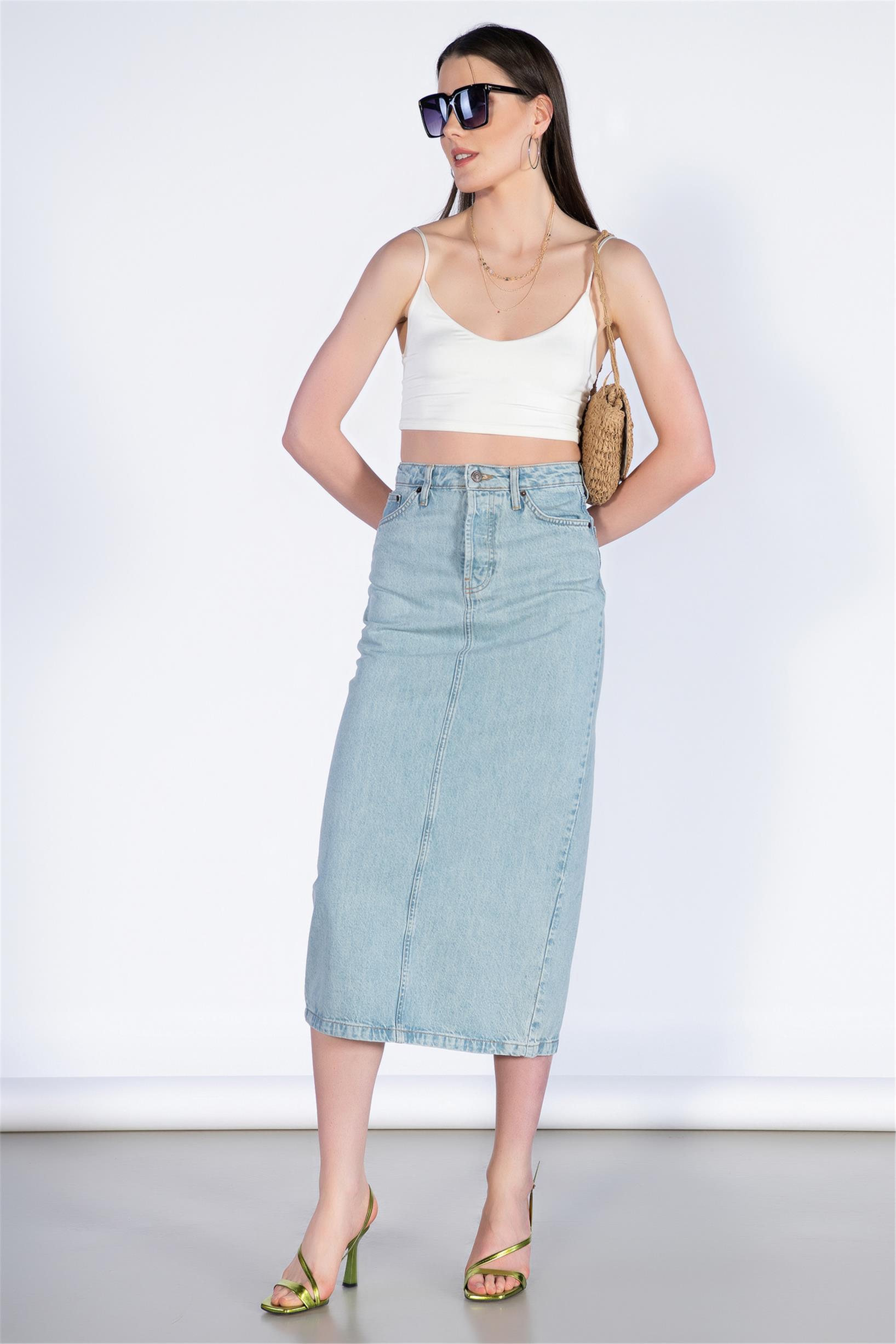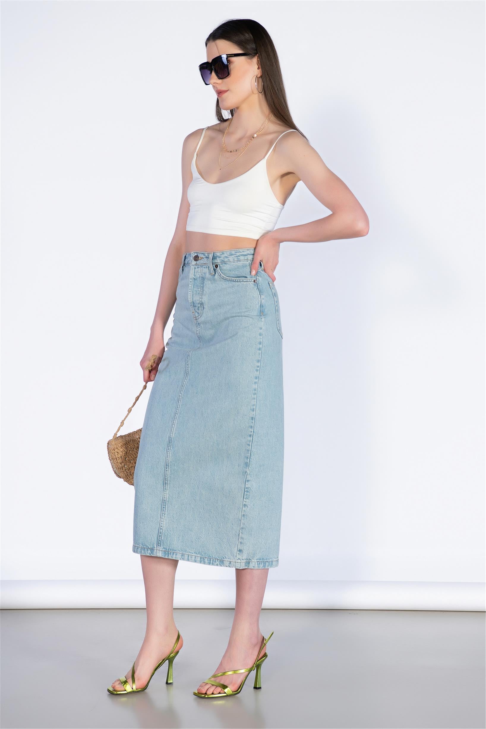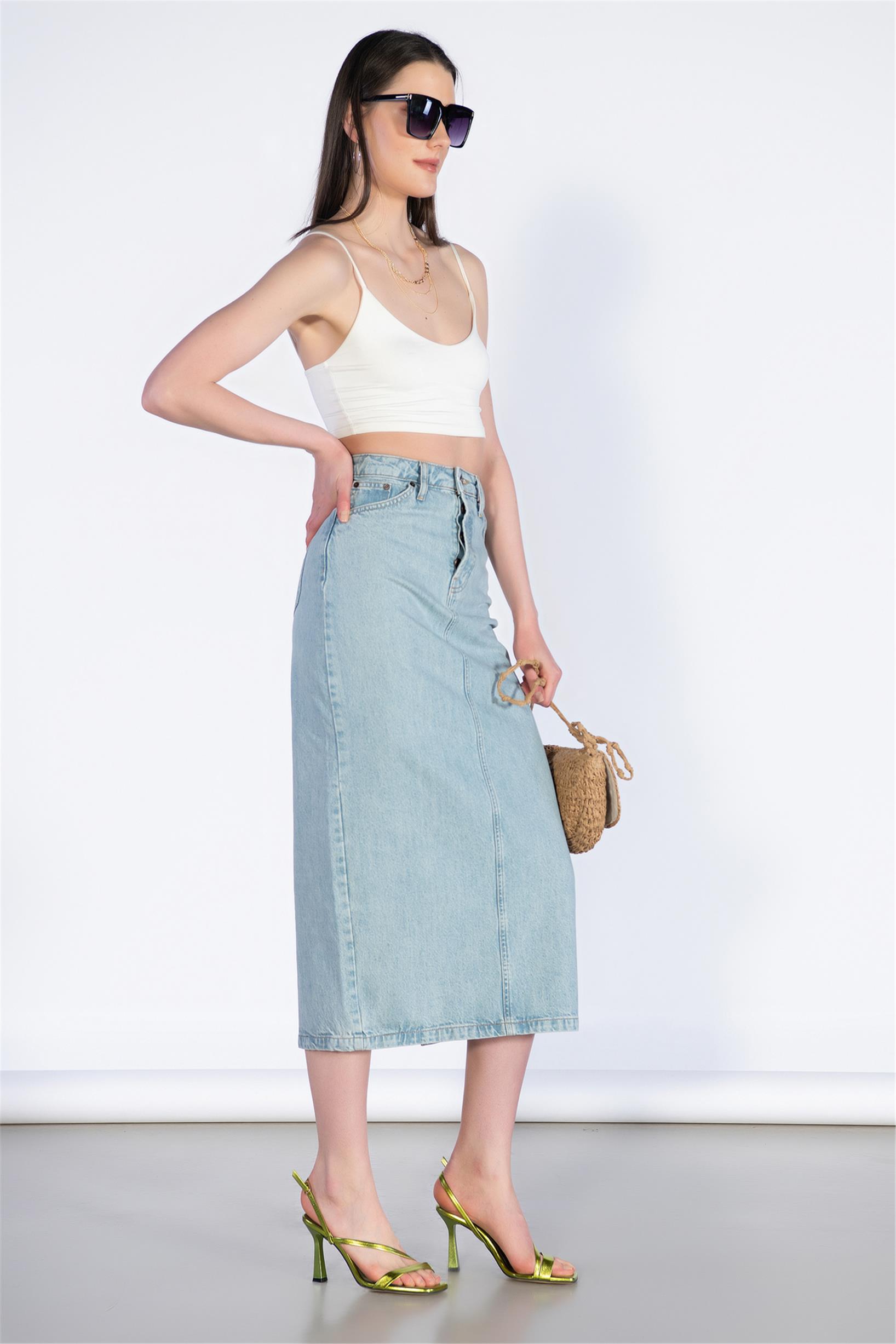 Açık Mavi Yüksek Bel Arka Yırtmaç Detay Midi Boy Denim Etek