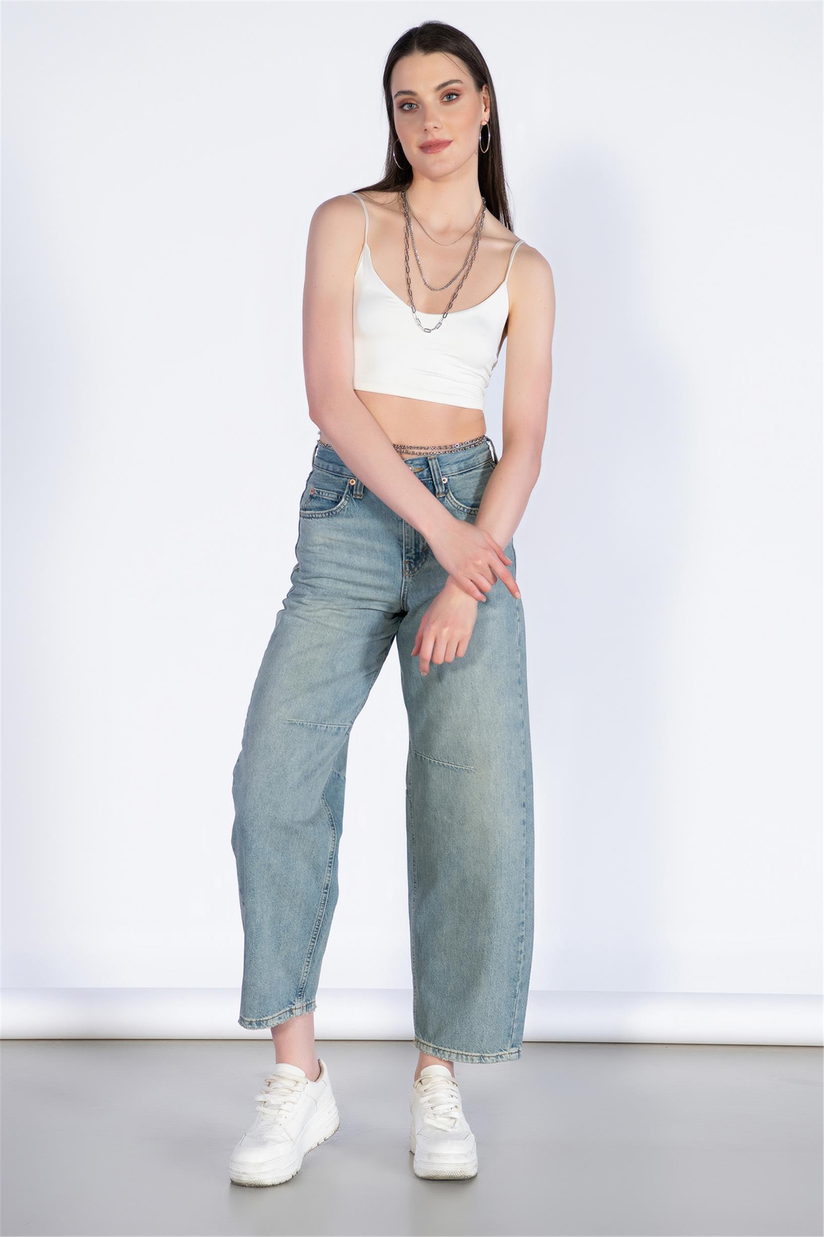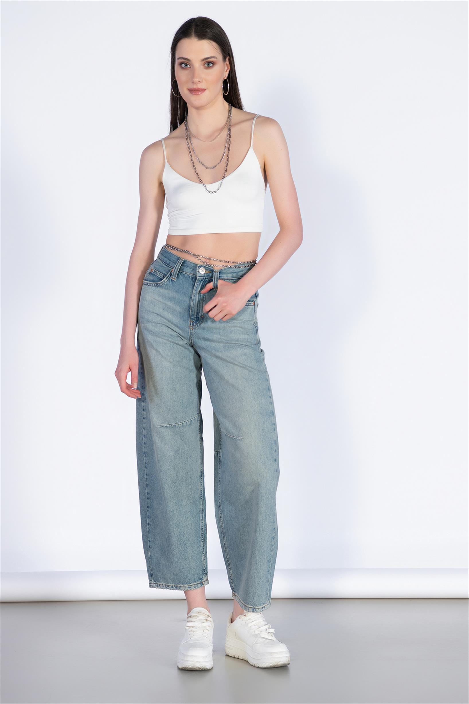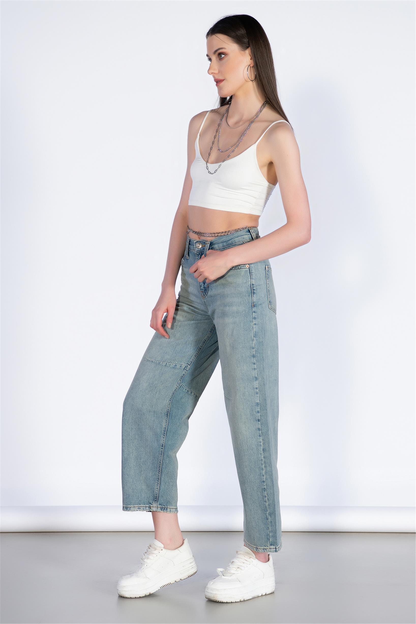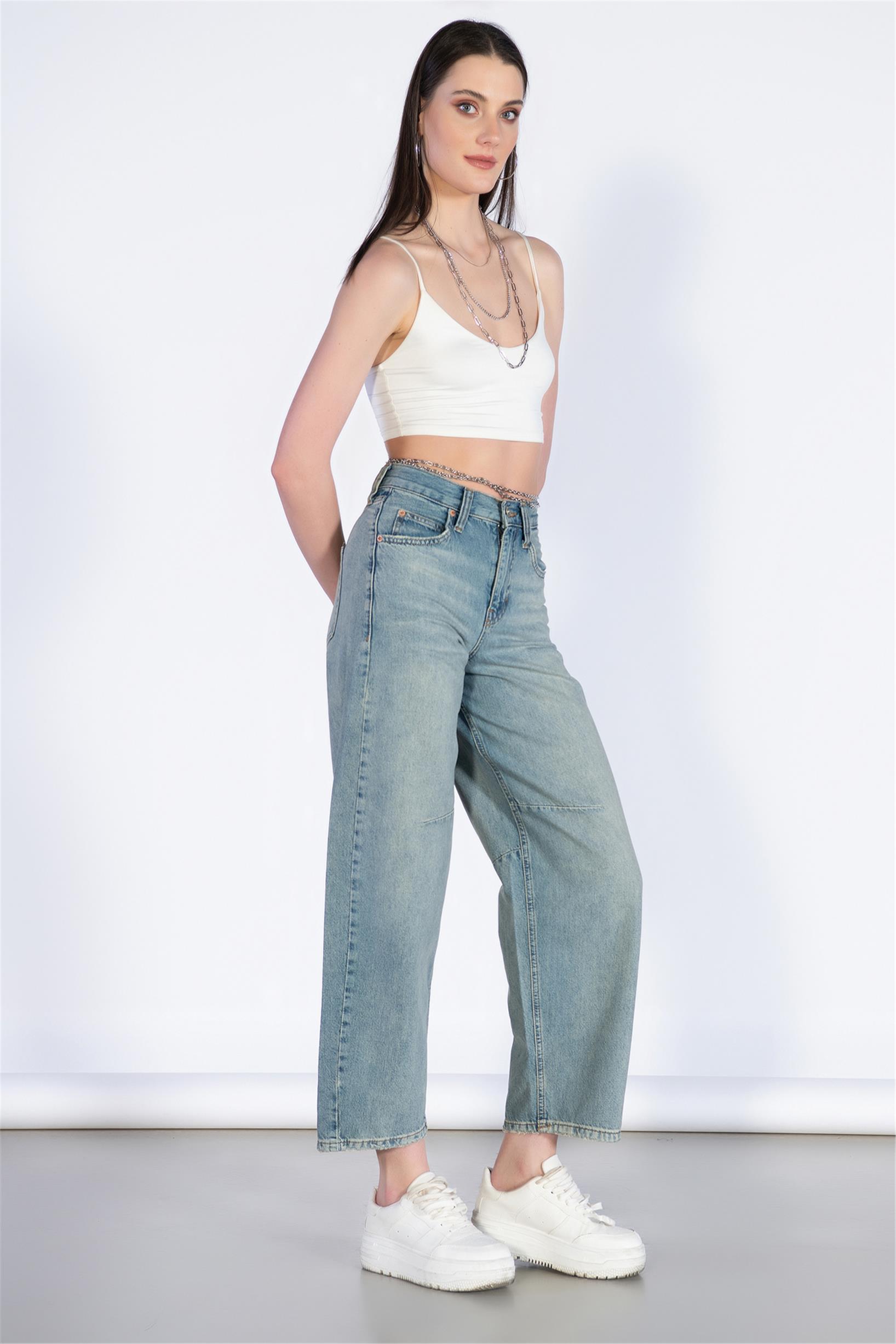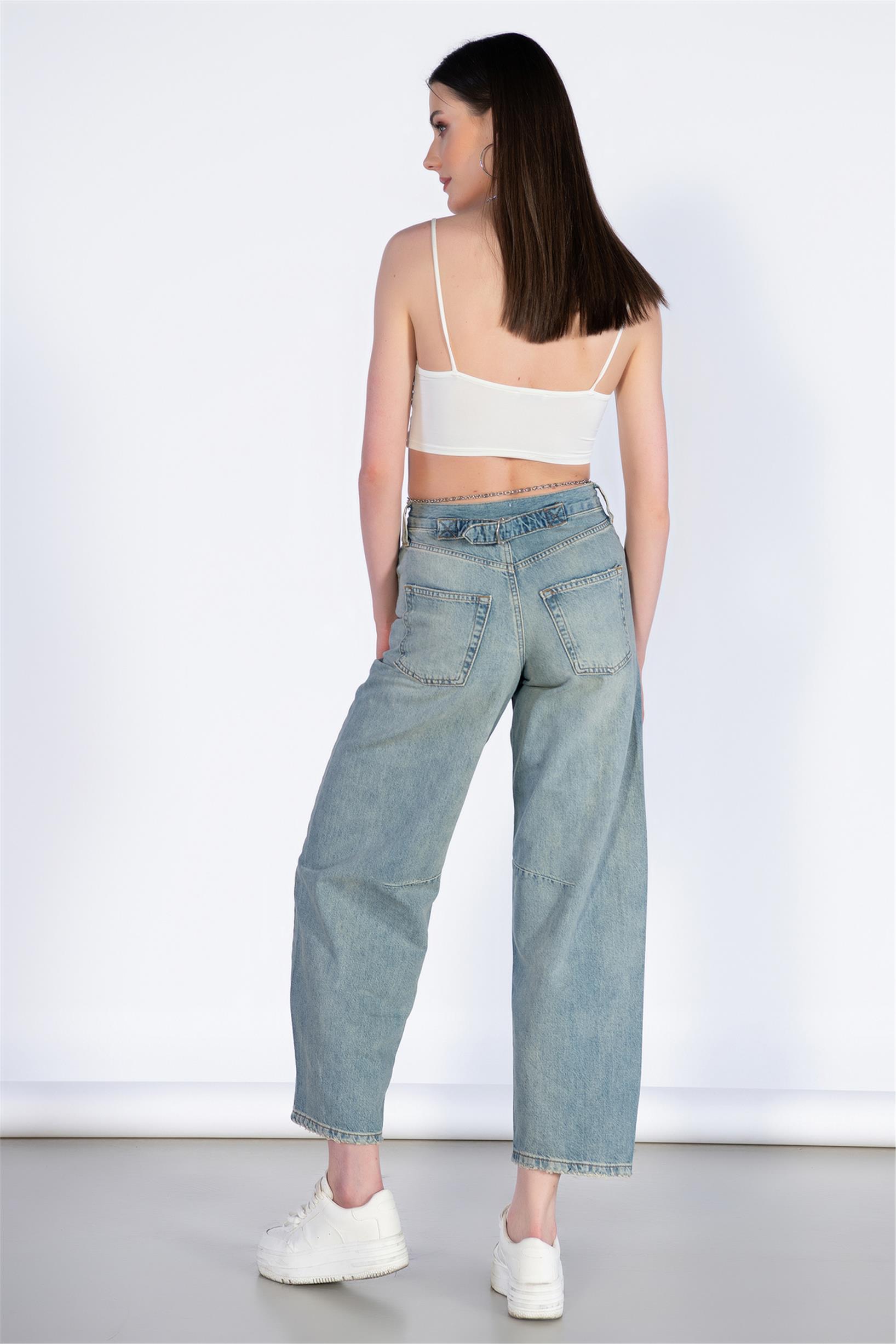 Açık Mavi Yüksek Bel Beli Tokalı Boyfriend Jeans