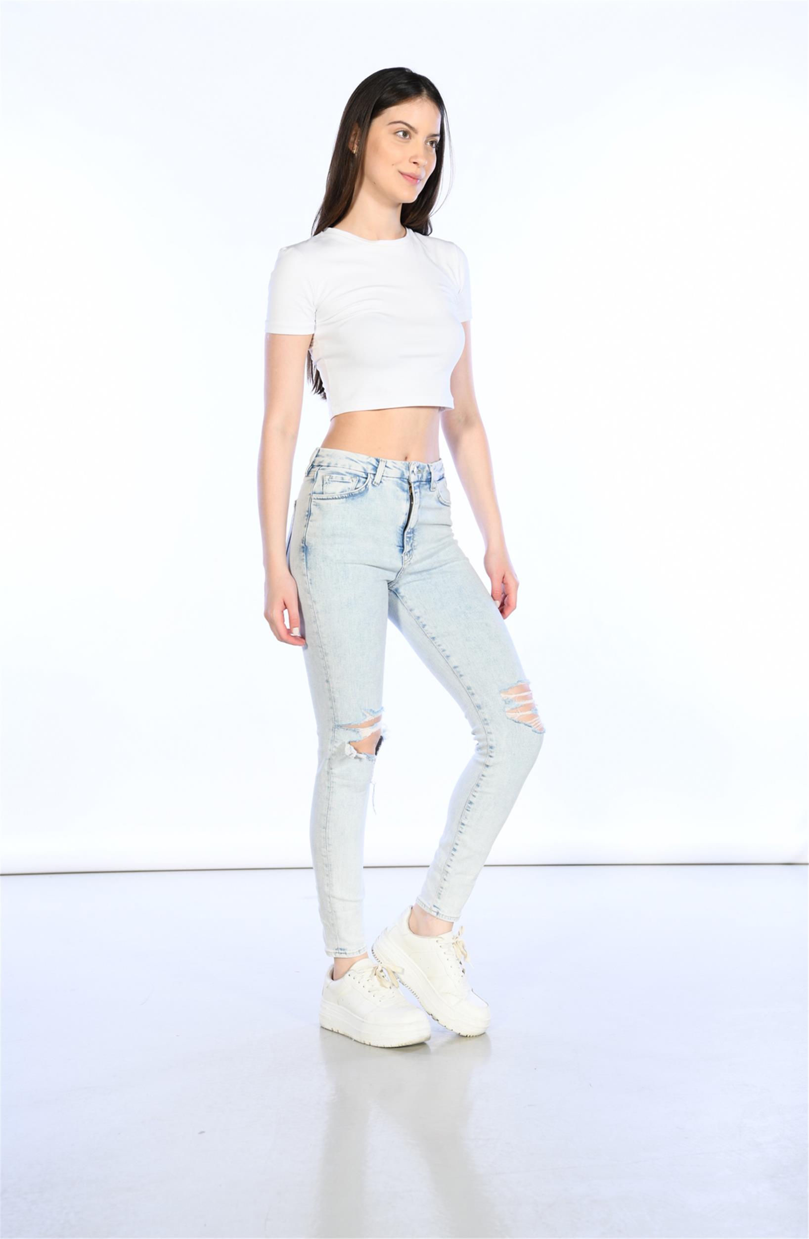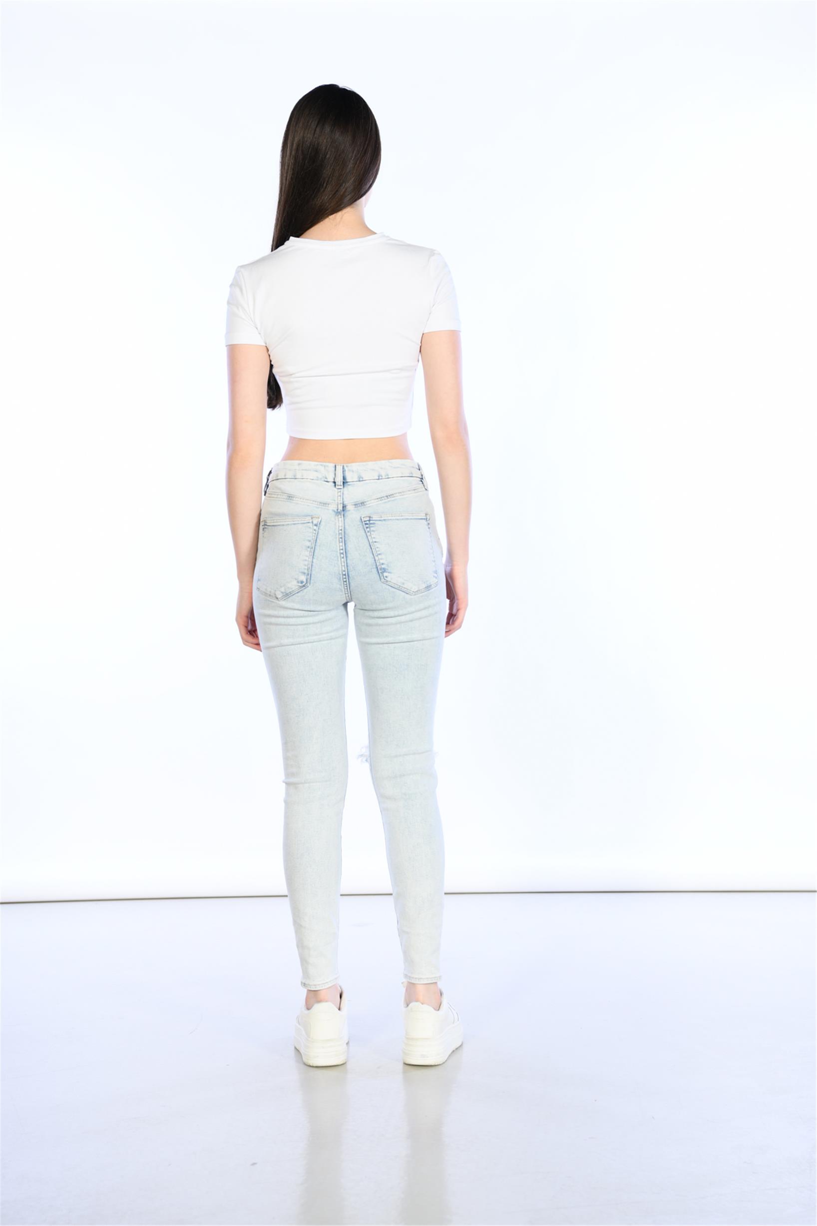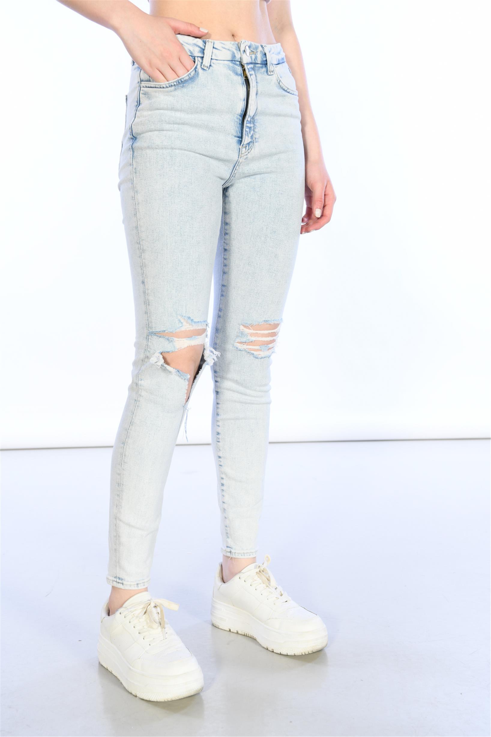 Açık Mavi Yüksek Bel Diz Lazer Detaylı Skinny Jeans