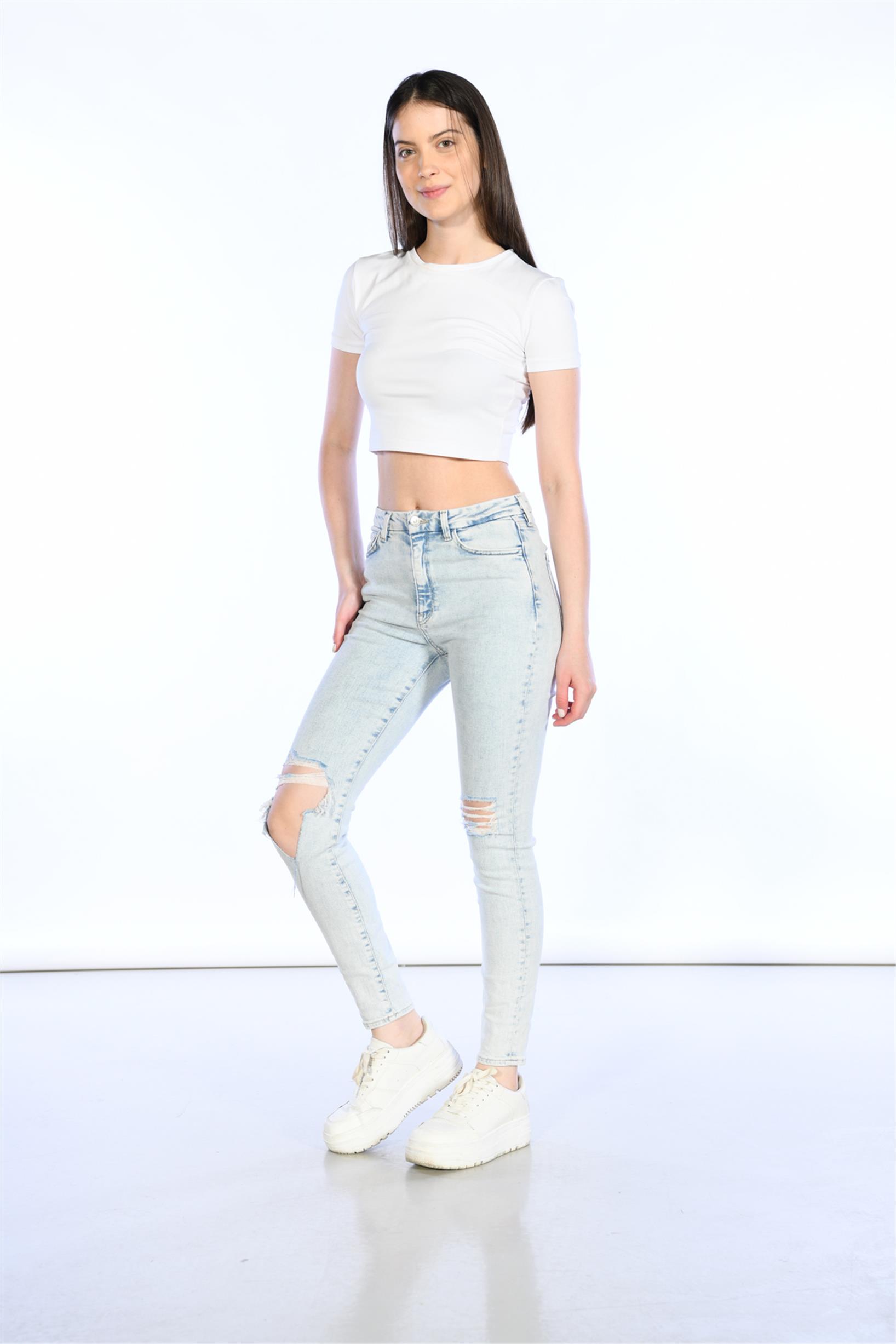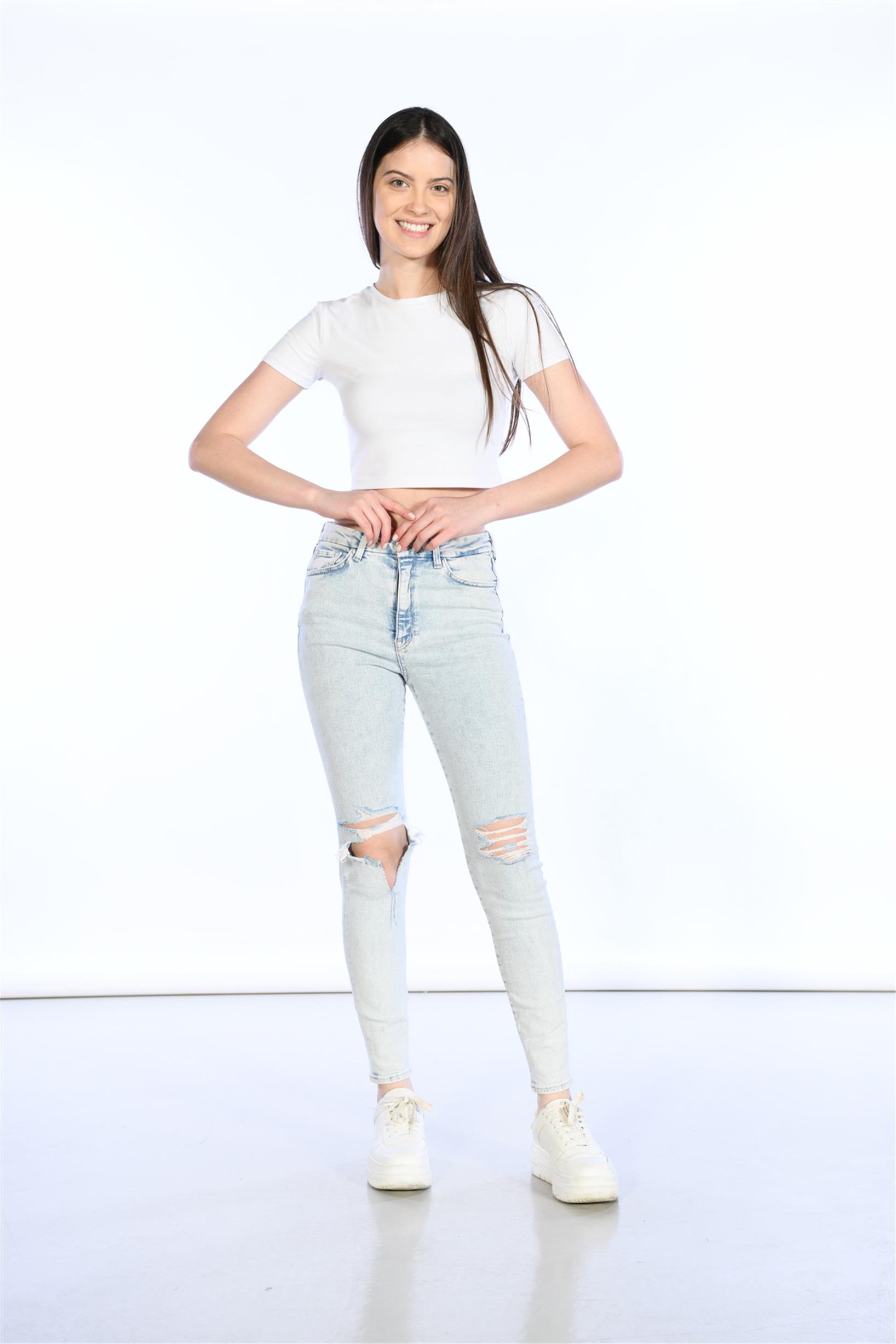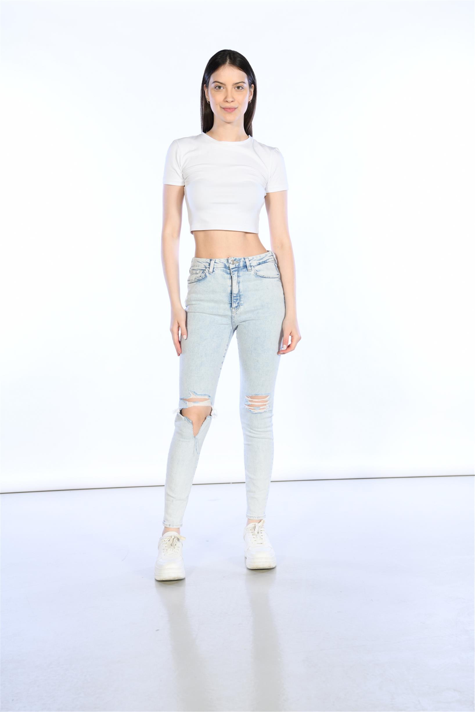 Açık Mavi Yüksek Bel Diz Lazer Detaylı Skinny Jeans