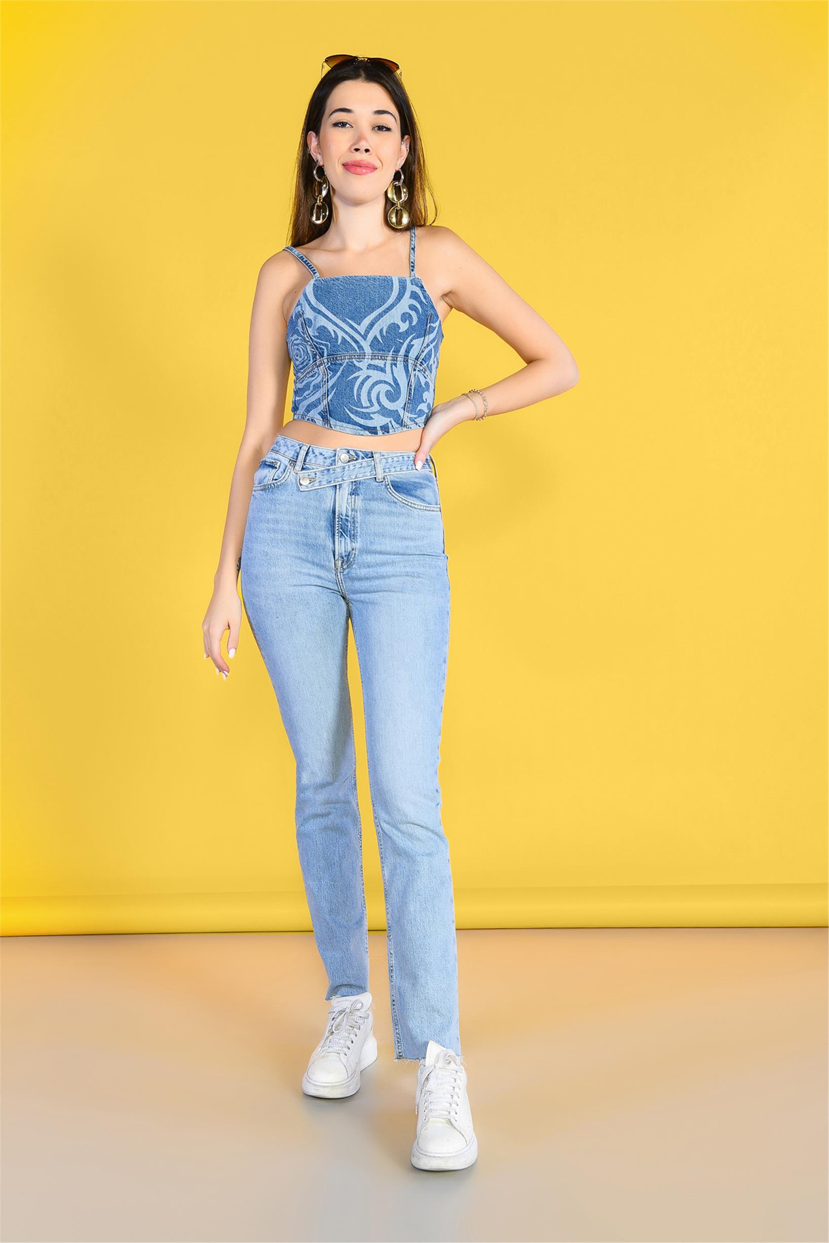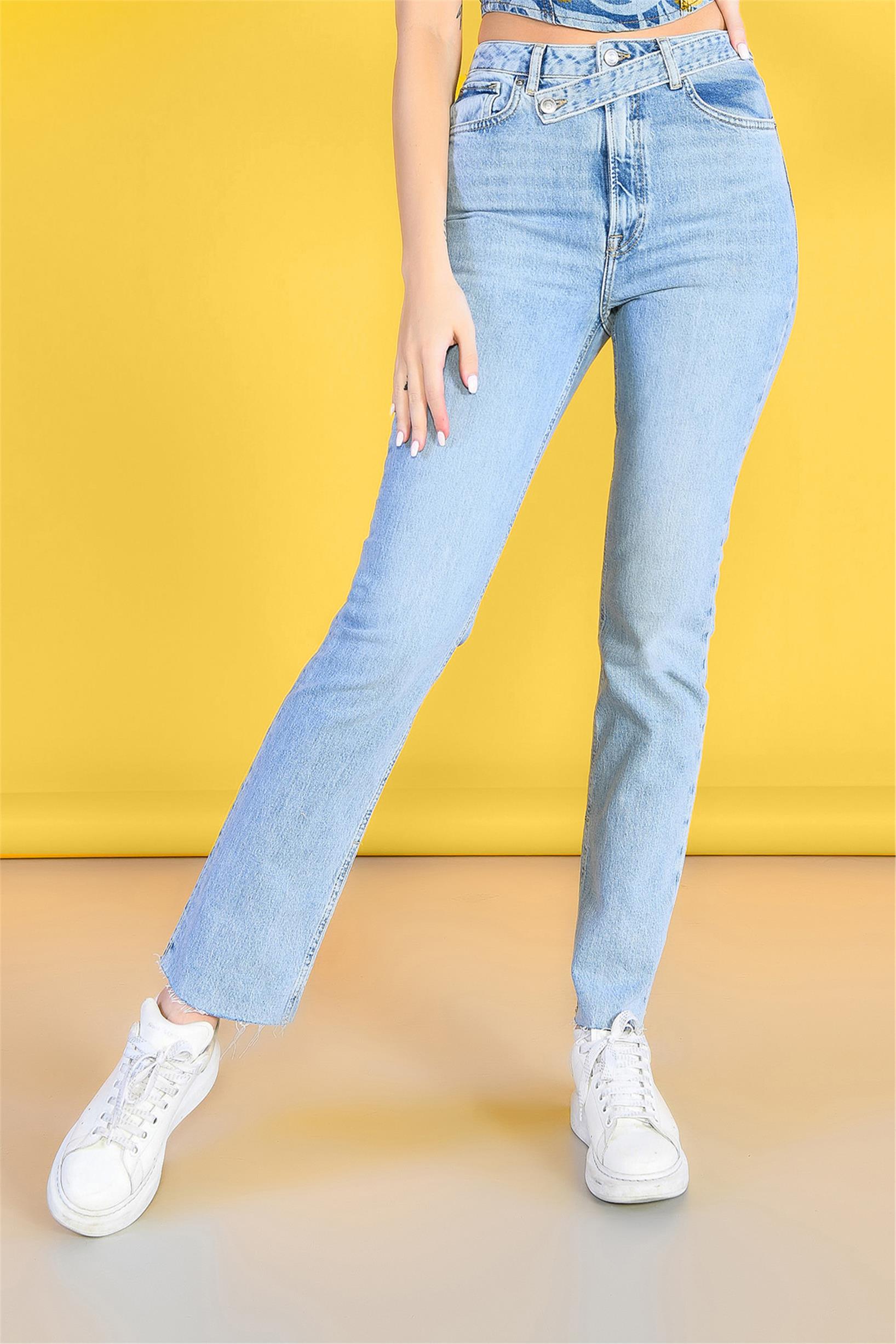 Açık Mavi Yüksek Bel Kemer Detaylı Wideleg Jeans