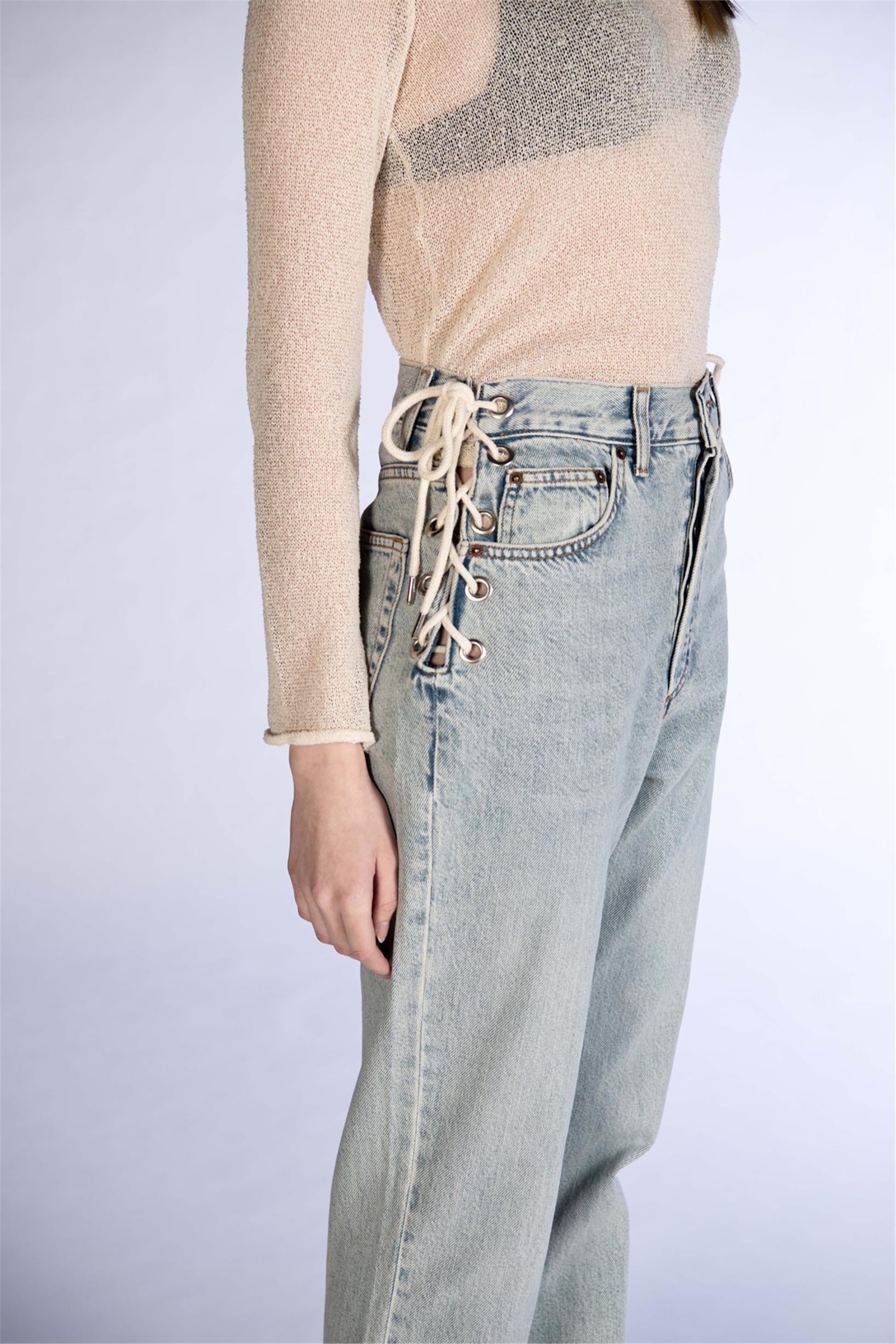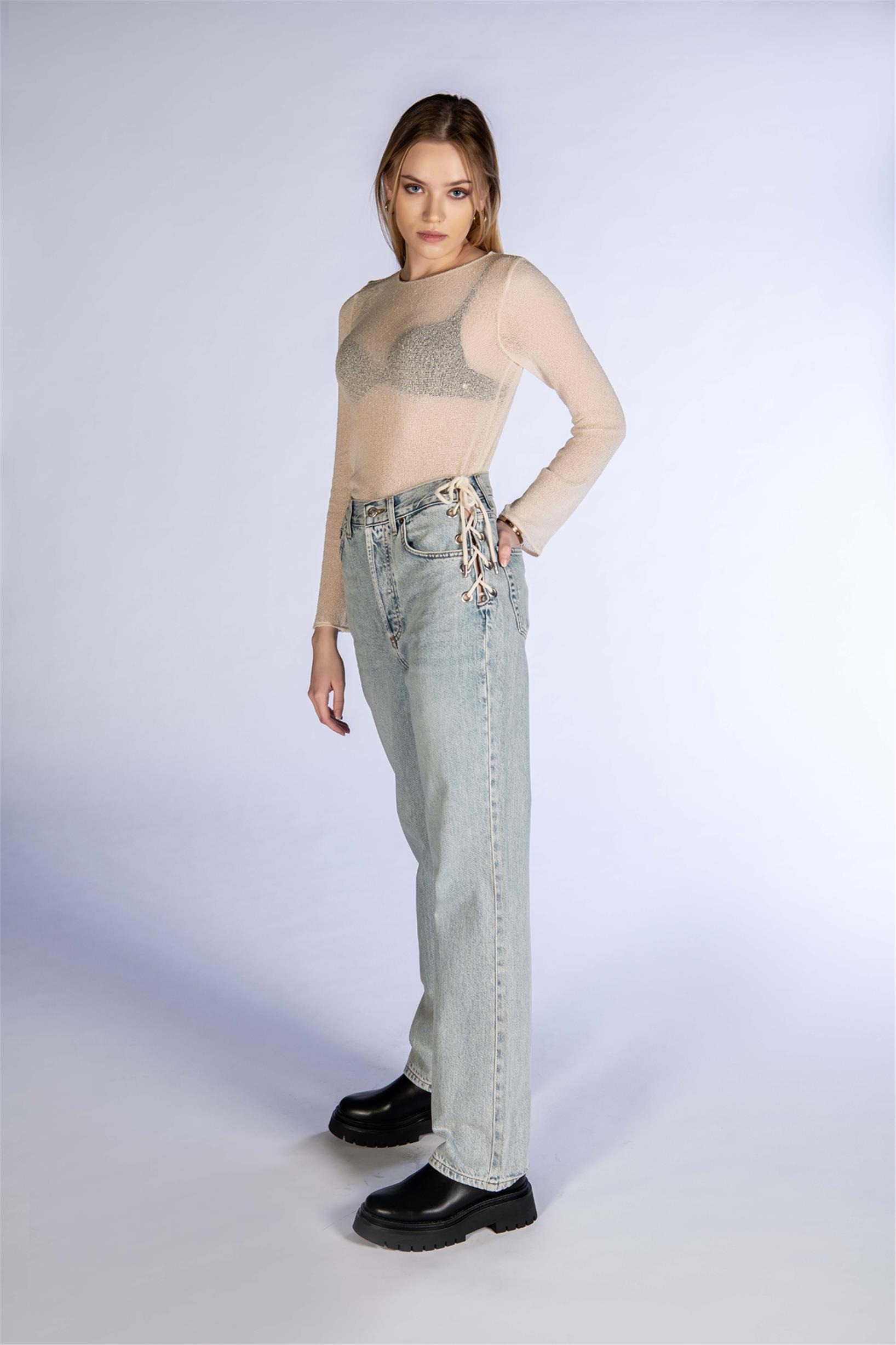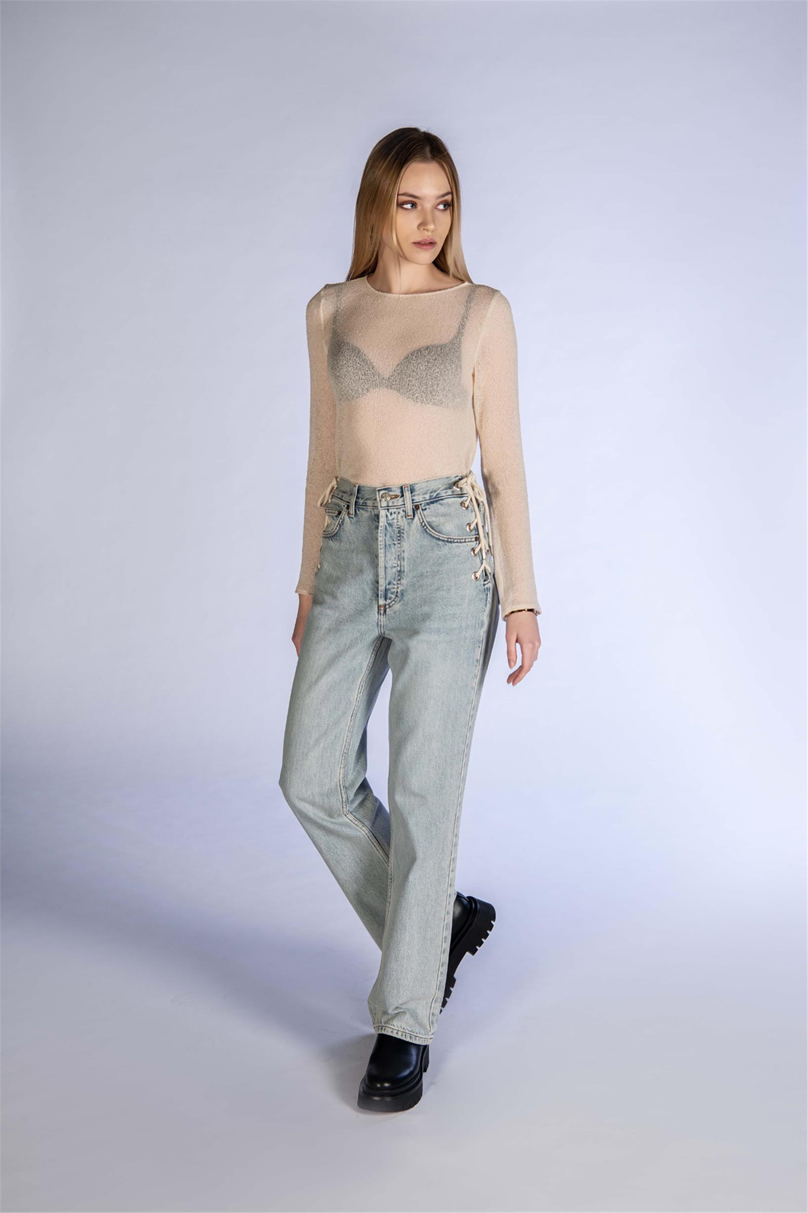 Açık Mavi Yüksek Bel Kuş Gözü Bel Detay Wide Leg Jeans