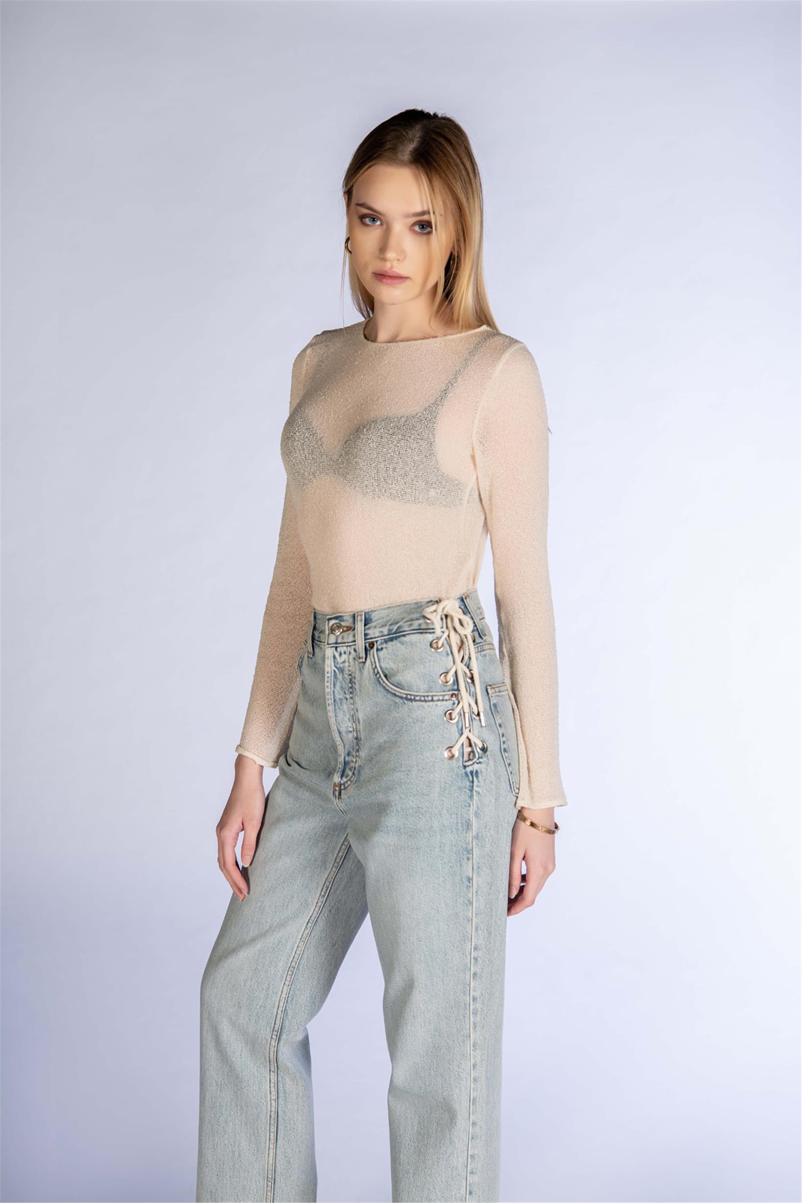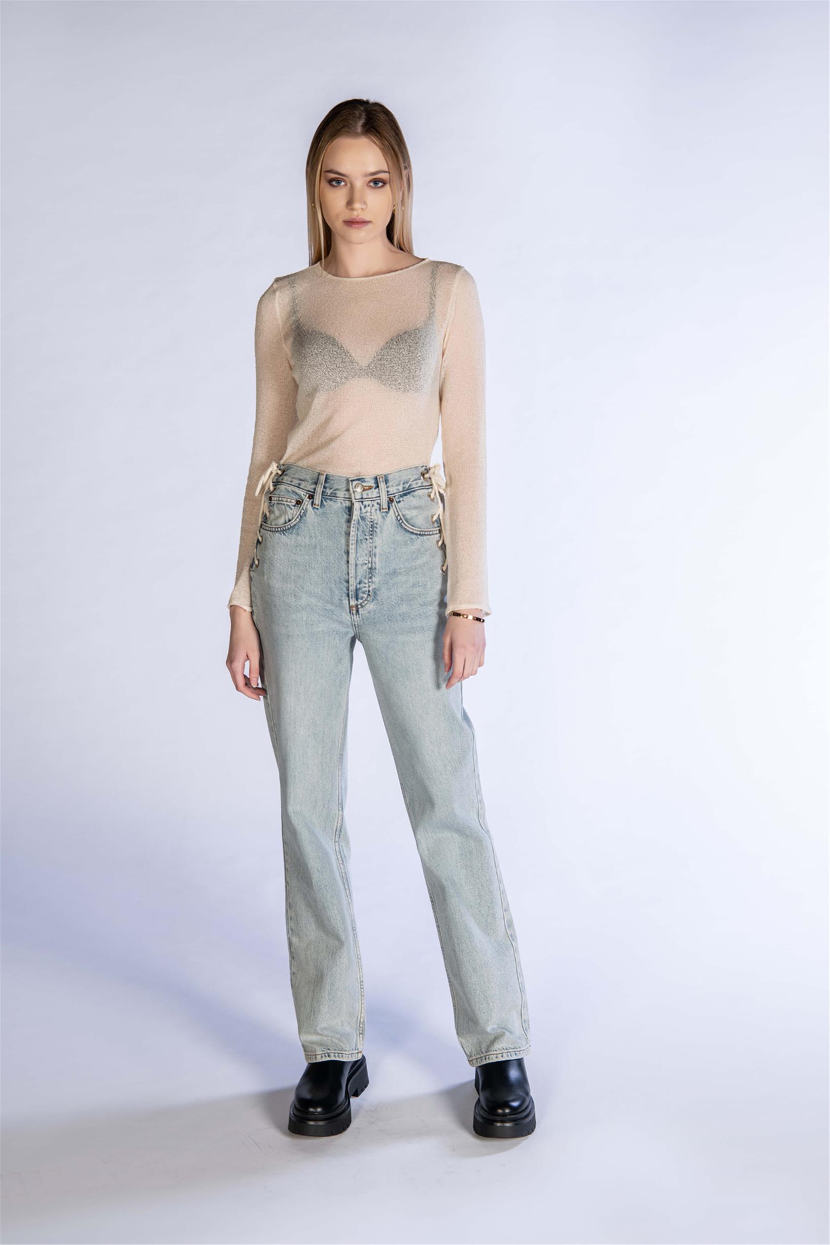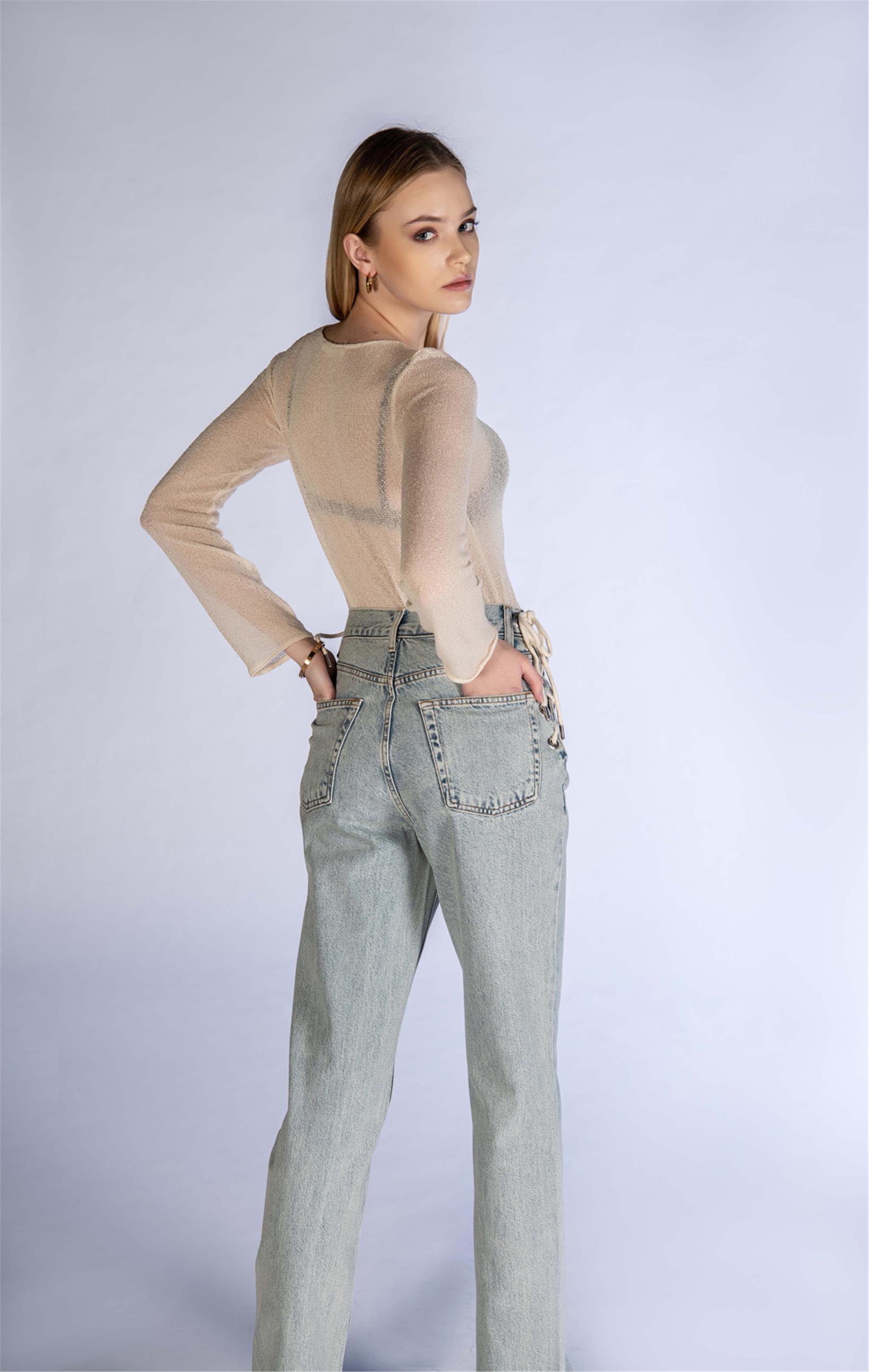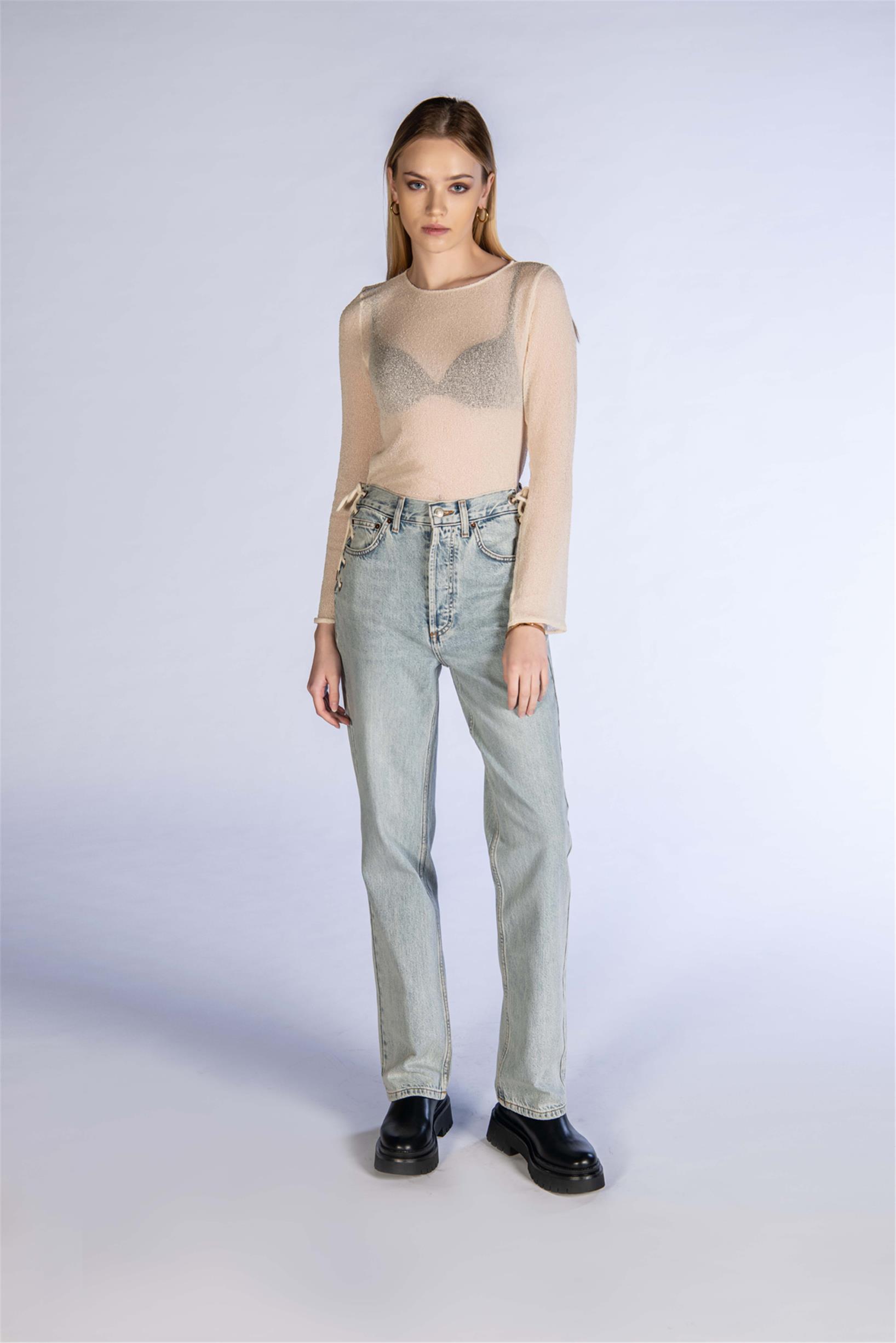 Açık Mavi Yüksek Bel Kuş Gözü Bel Detay Wide Leg Jeans