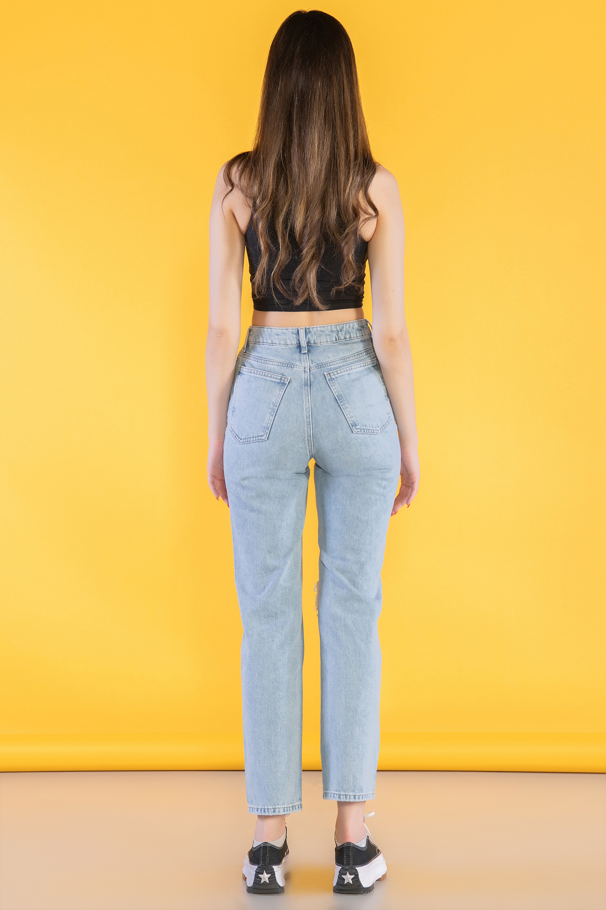 Açık Mavi Yüksek Bel Lazer Detaylı Mom Jeans