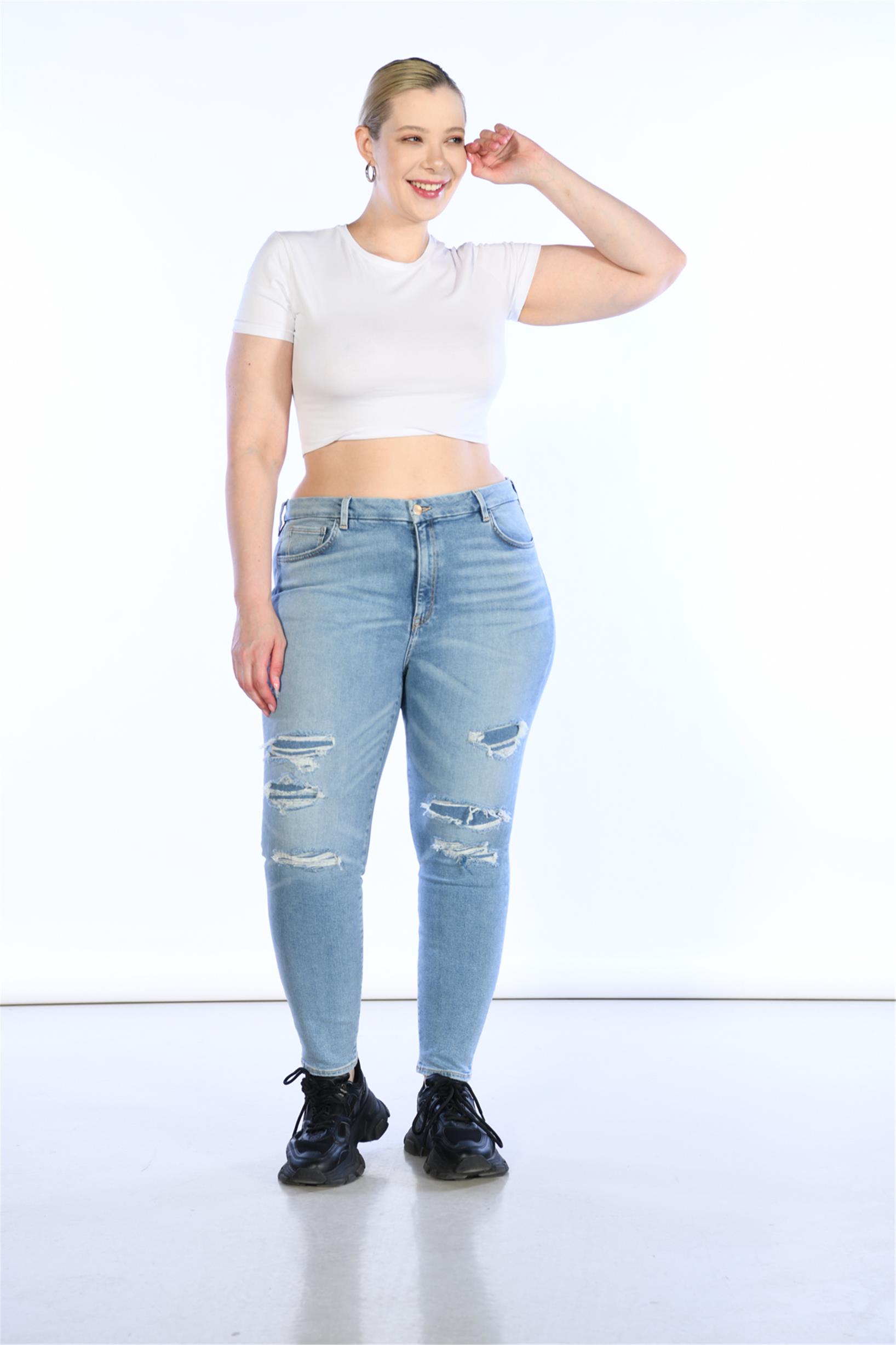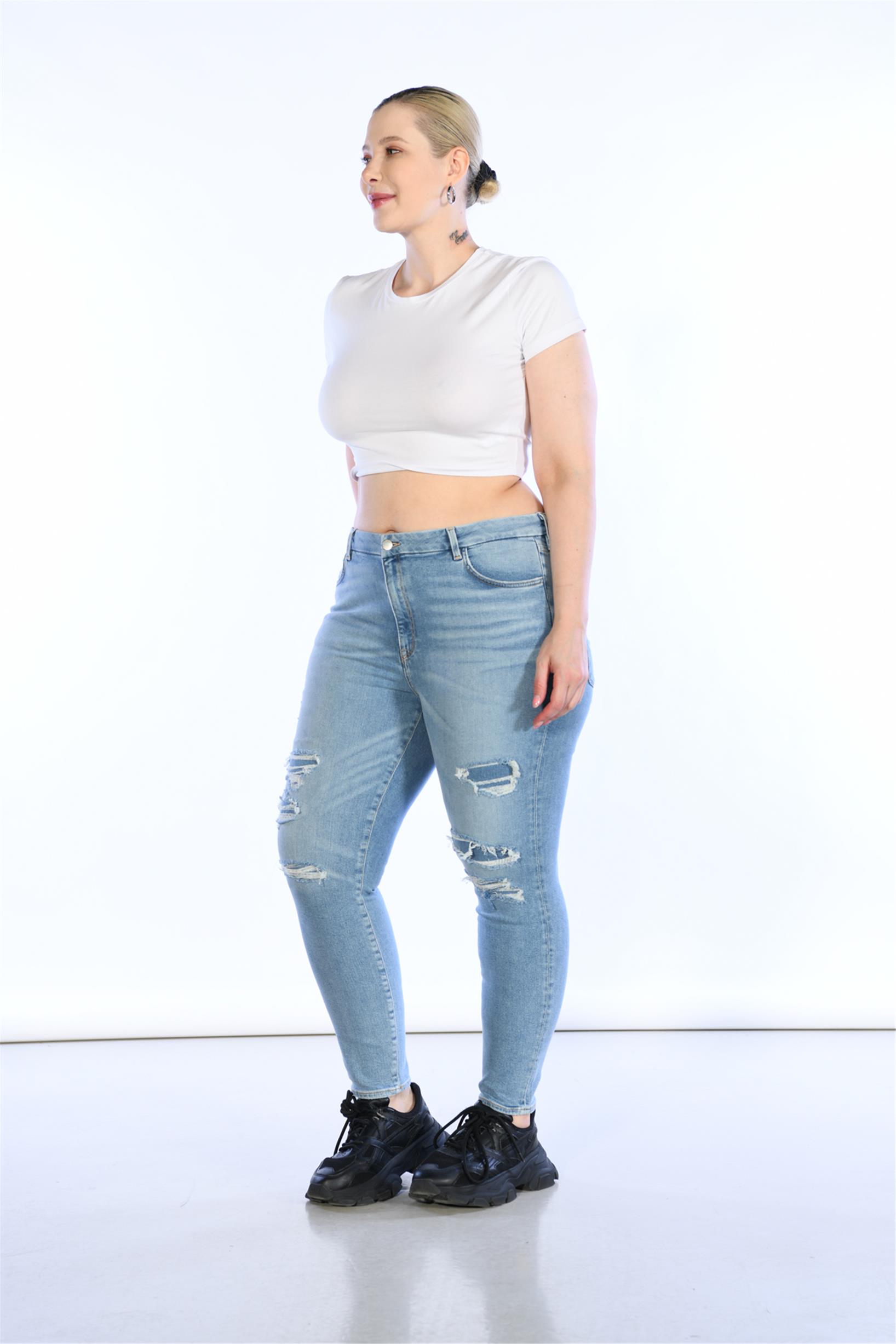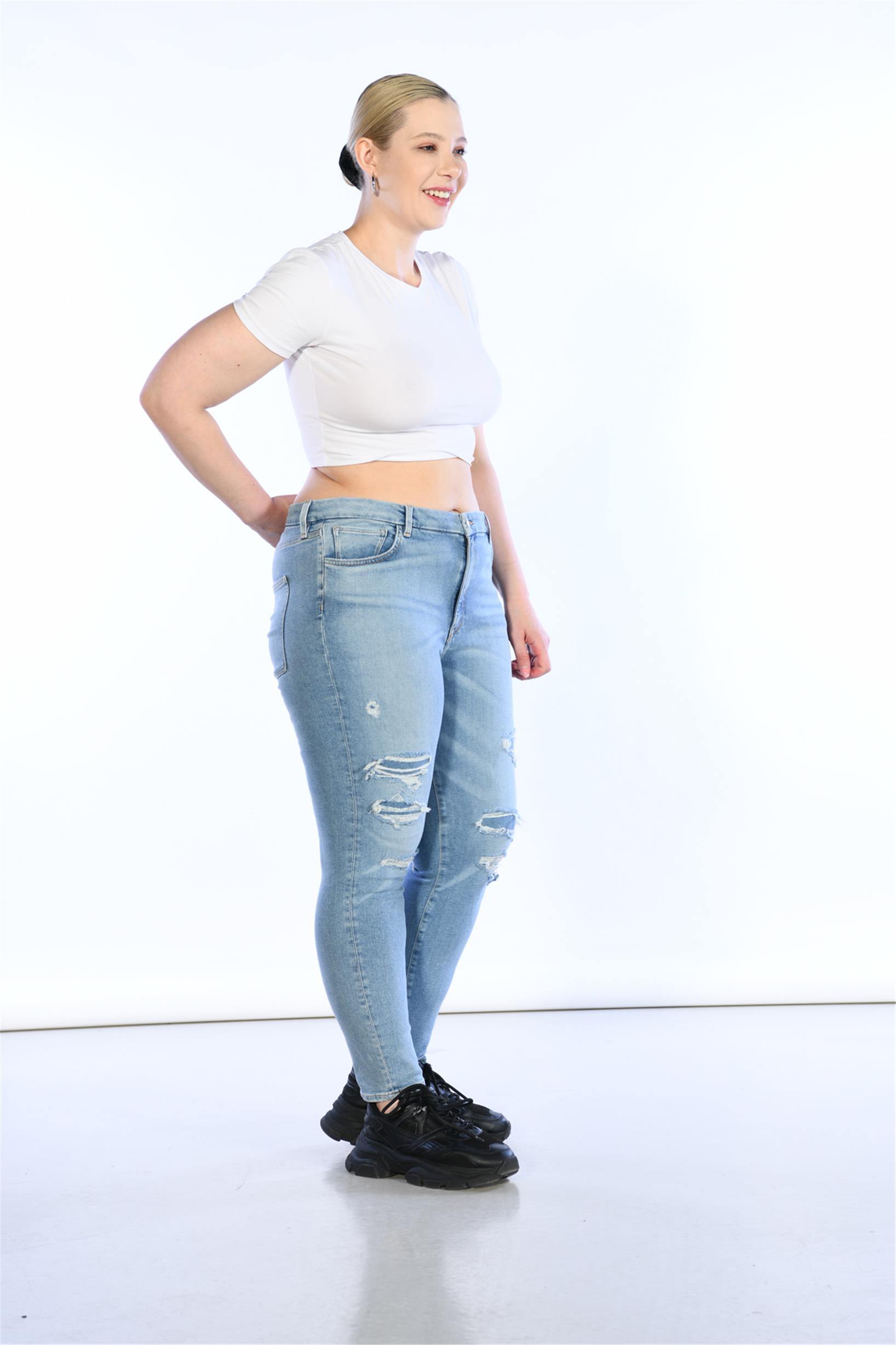 Açık Mavi Yüksek Bel Lazer Detaylı Skinny Jeans