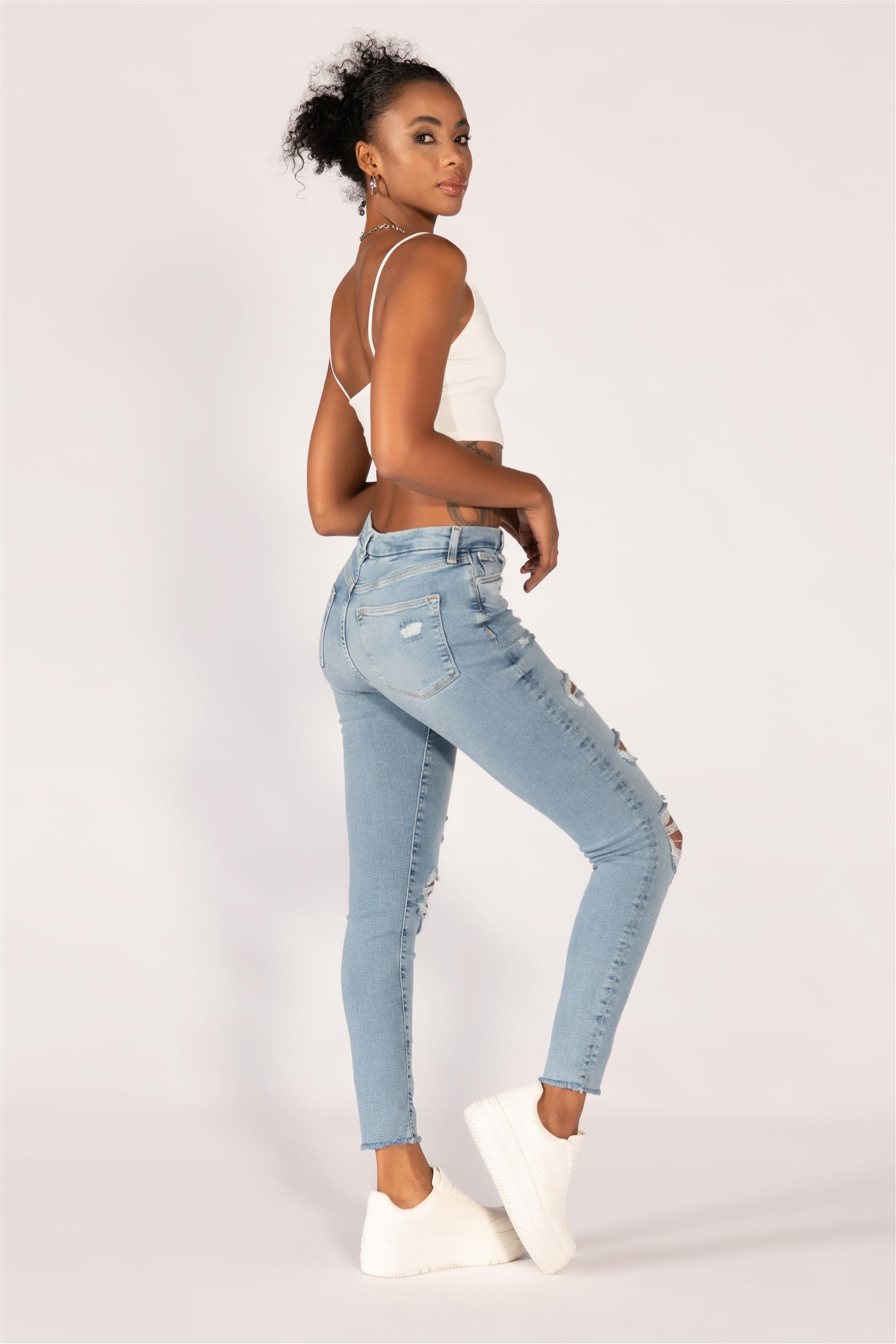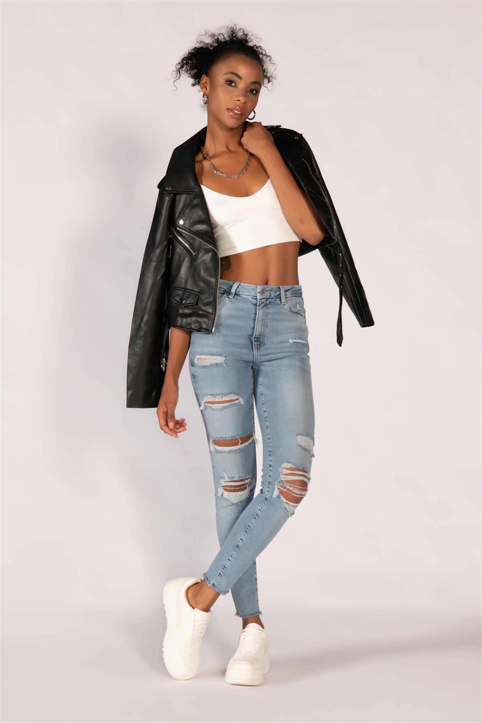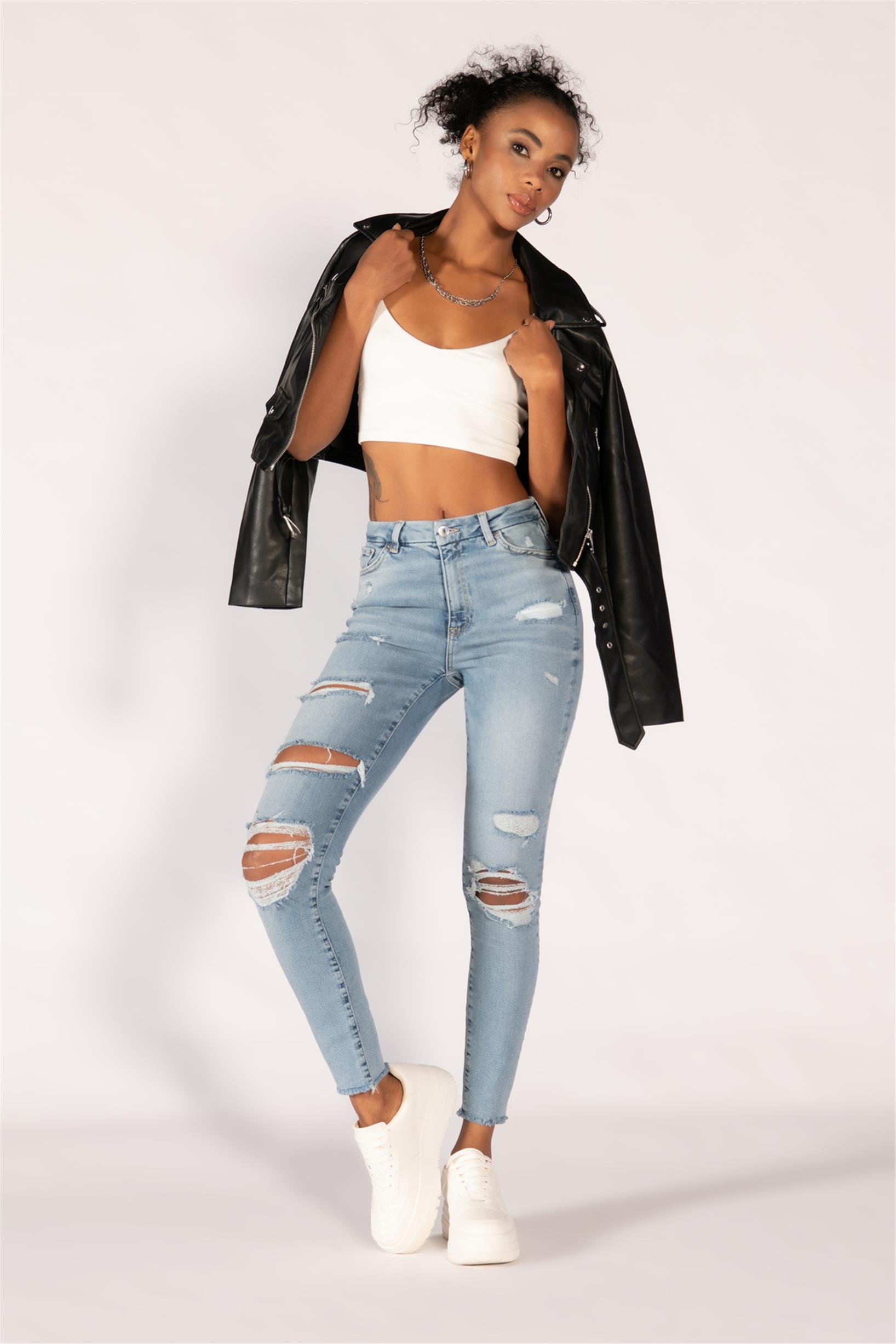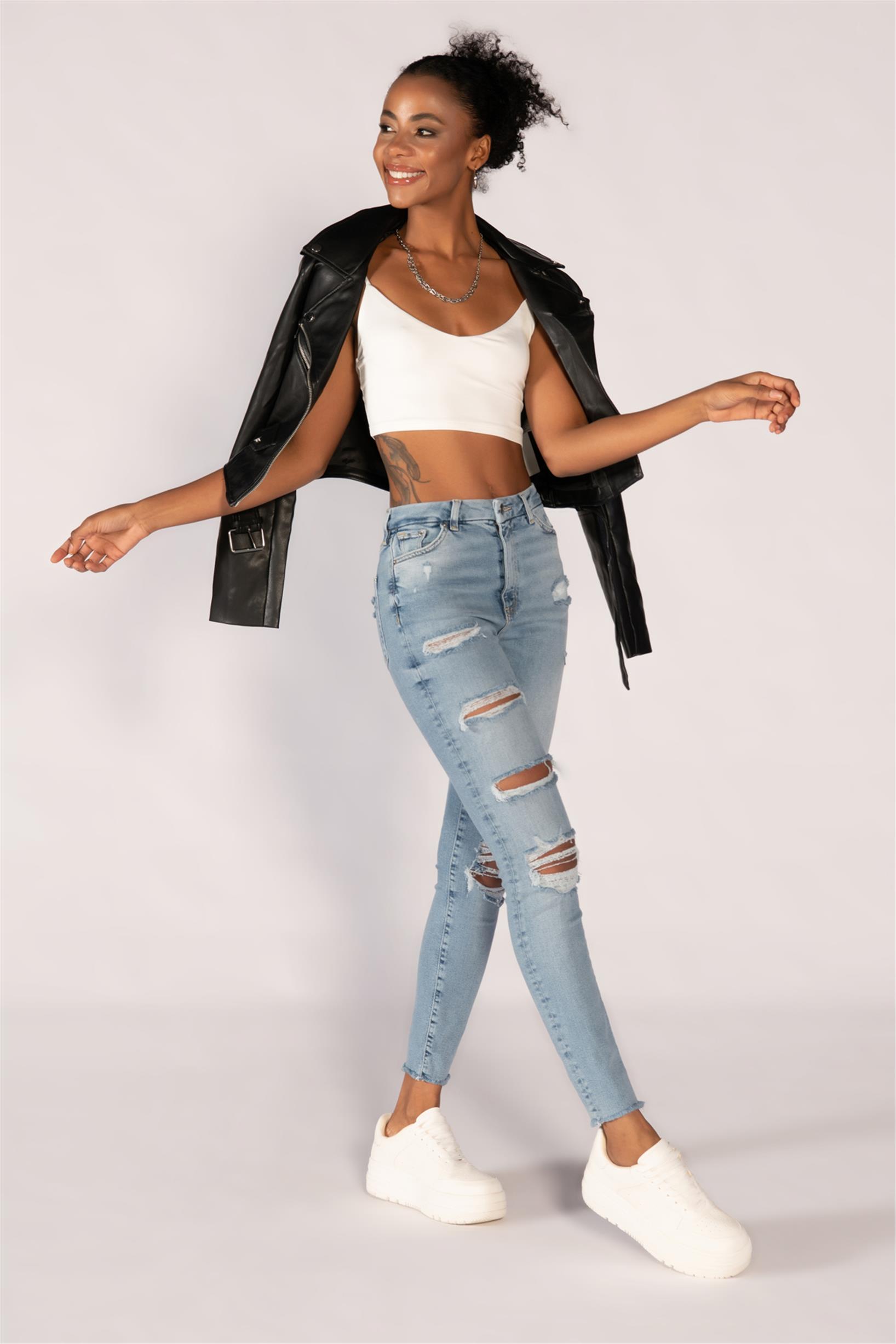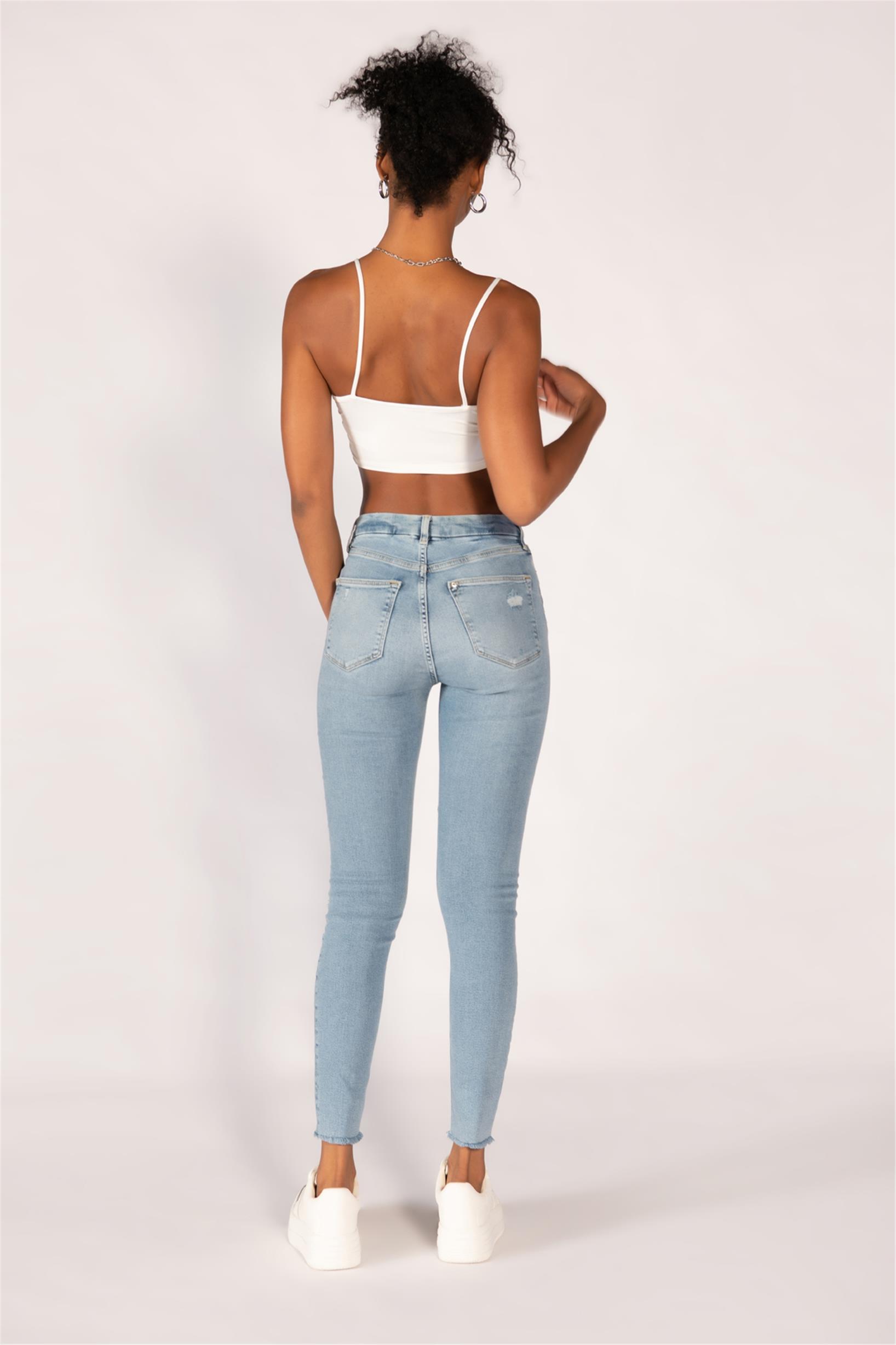 Açık Mavi Yüksek Bel Lazerli Skinny Jeans