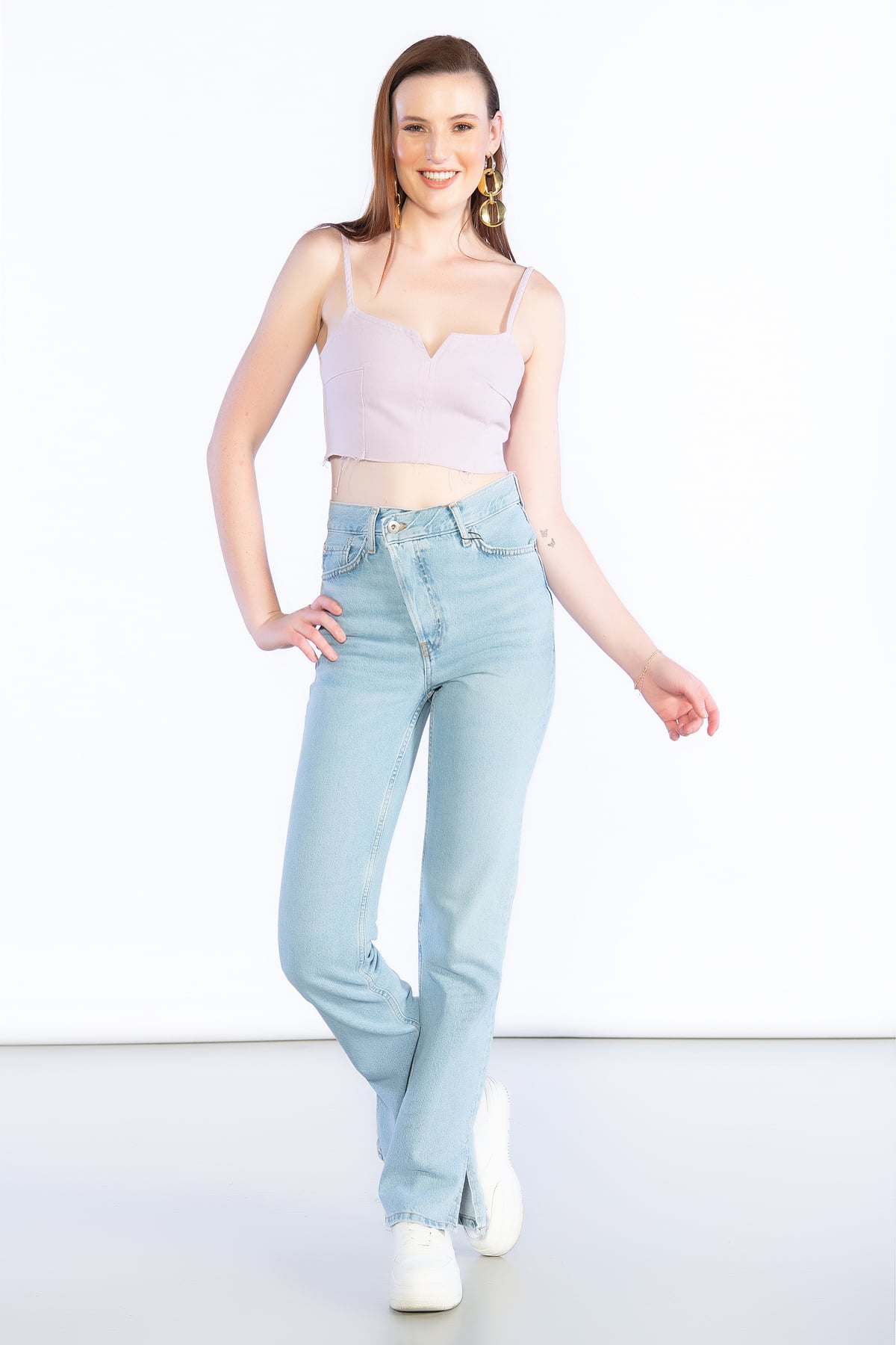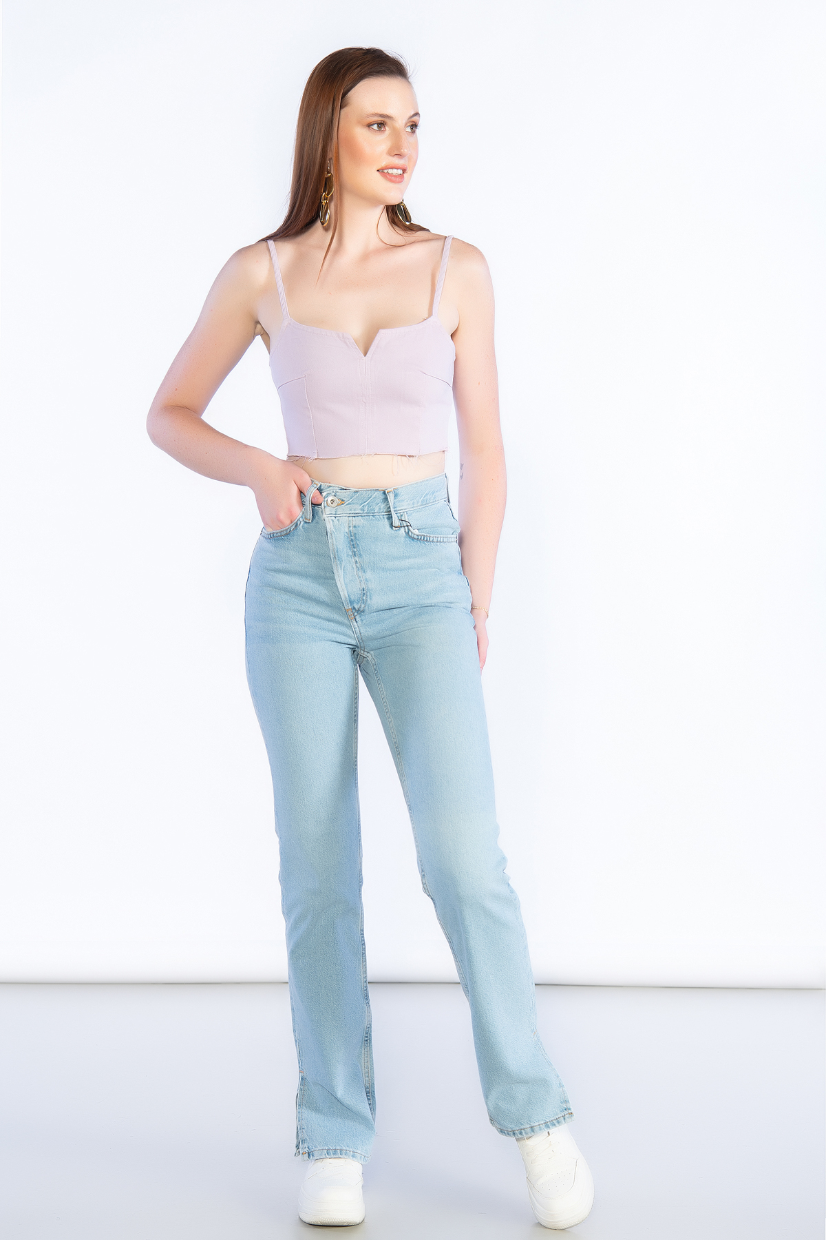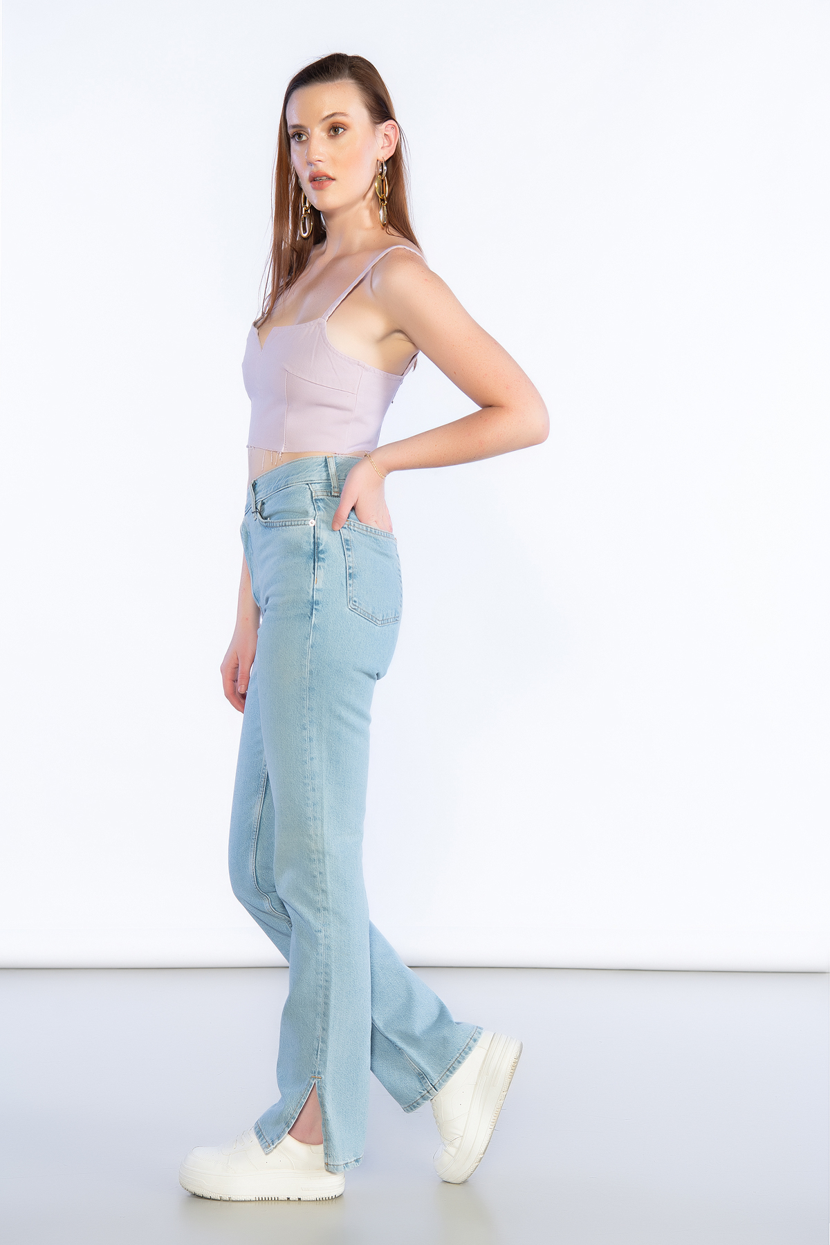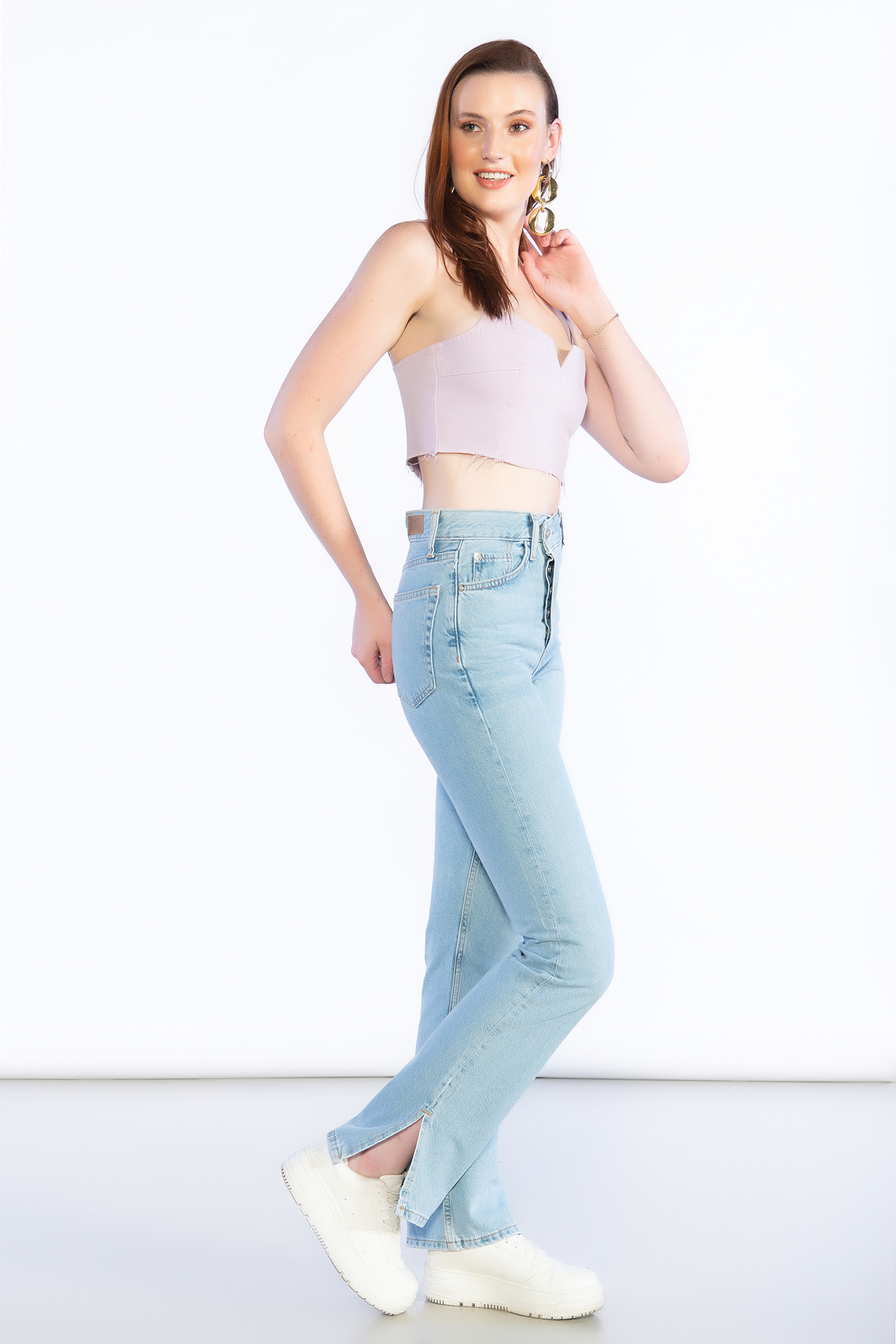 Açık Mavi Yüksek Bel Paça Yırtmaç Detay Straight Jeans
