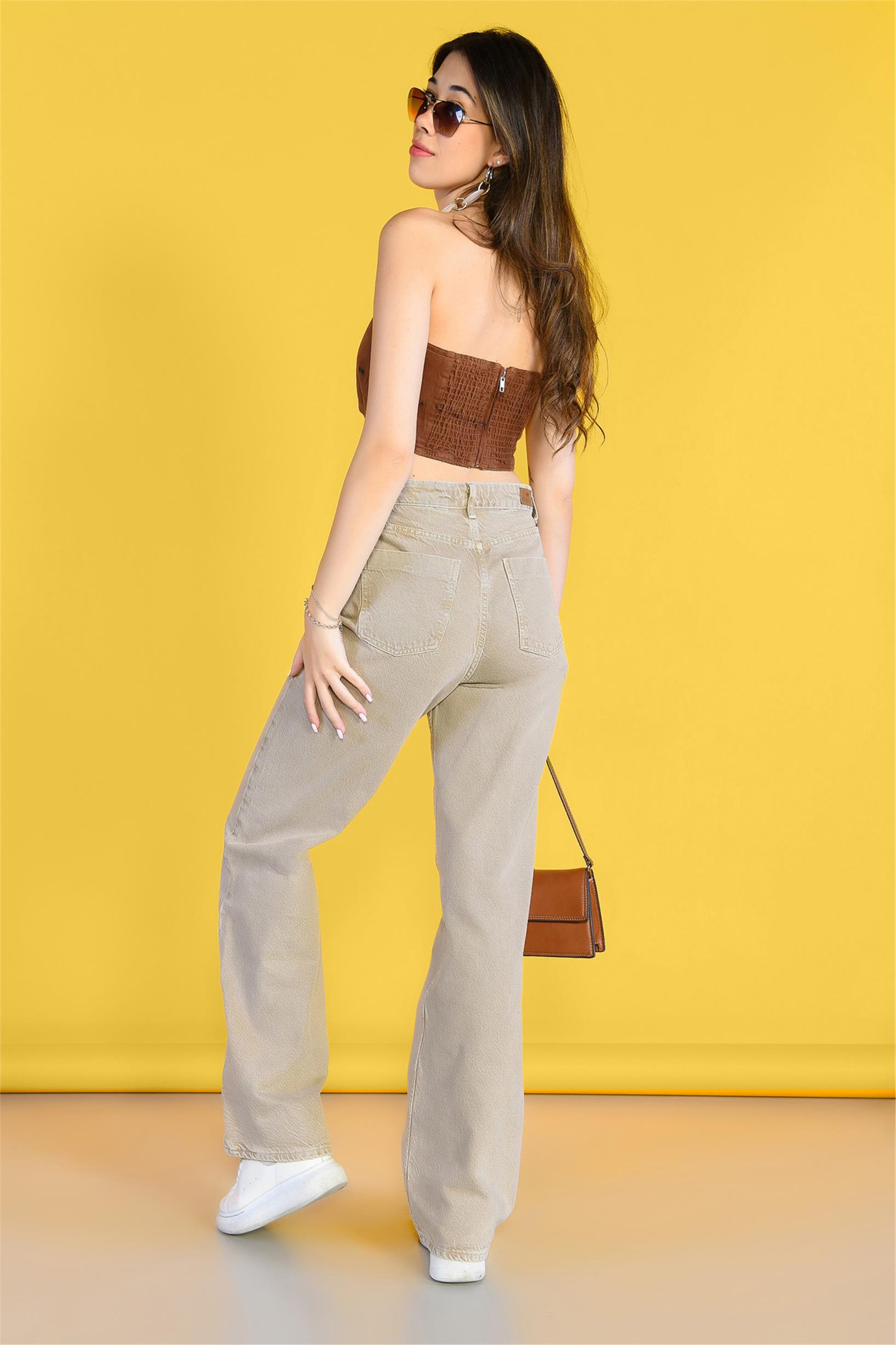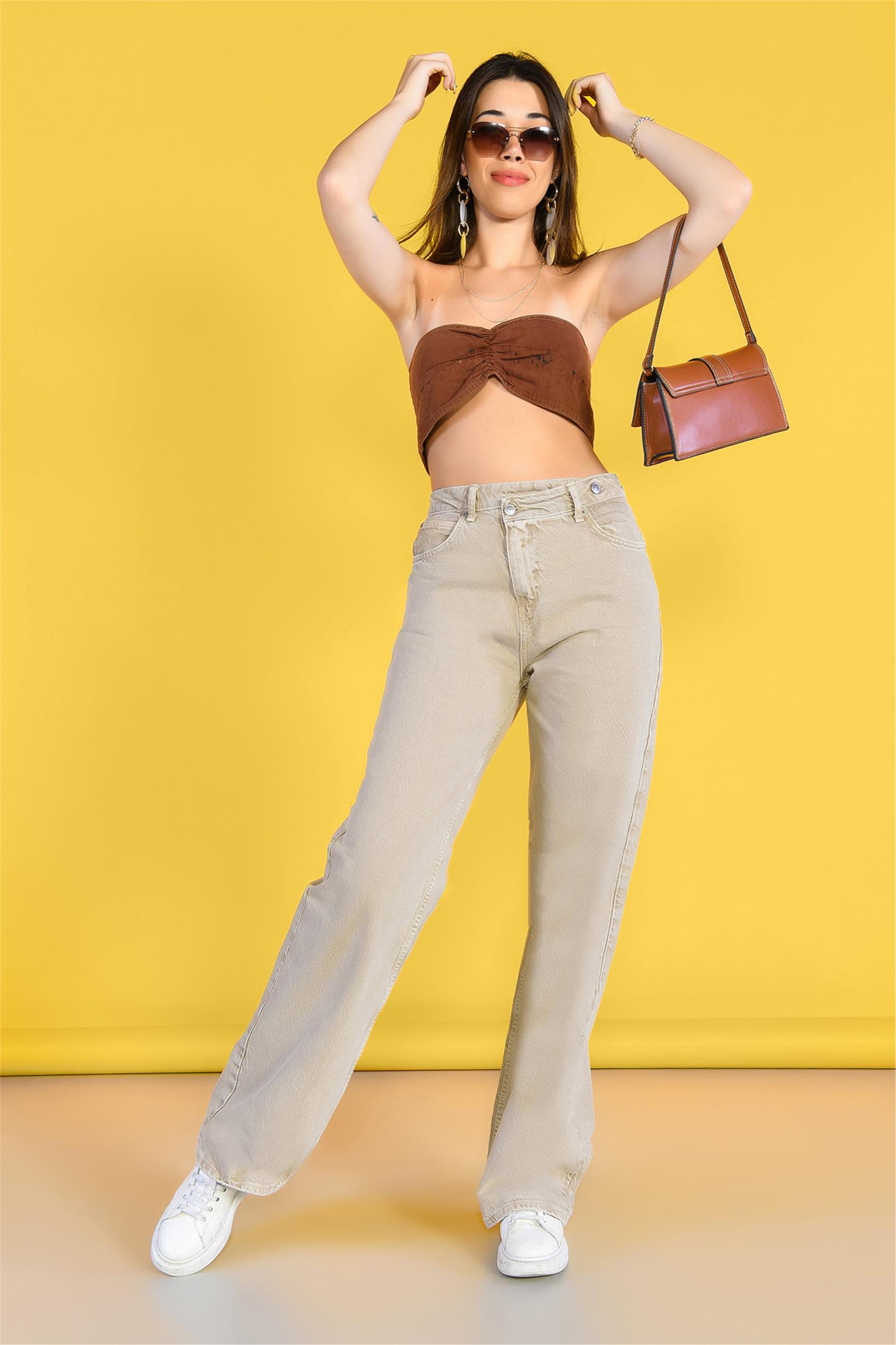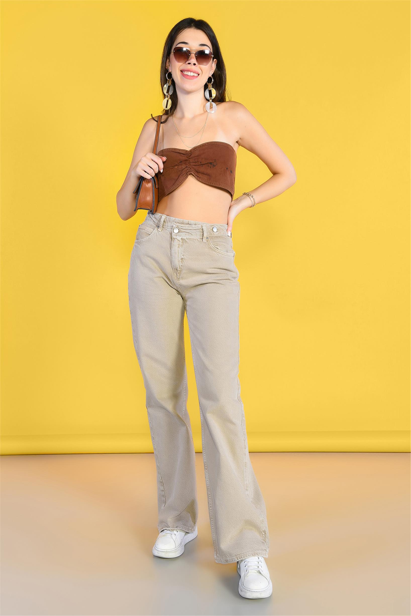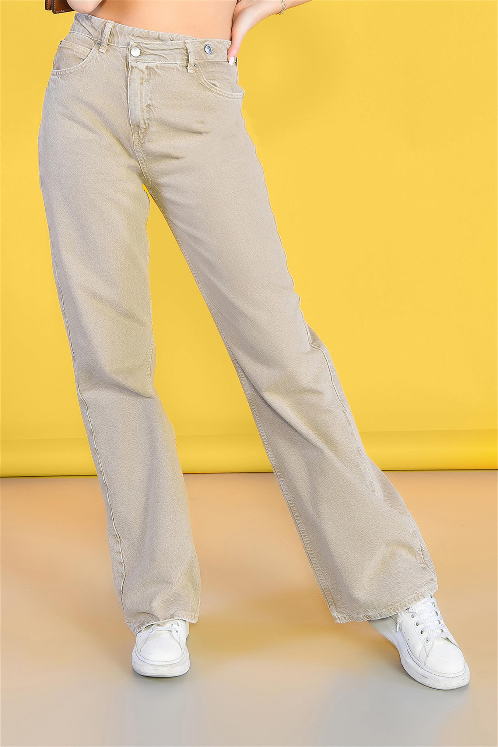 Açık Yeşil Yüksek Bel Ön Kemer Detaylı Wideleg Jeans