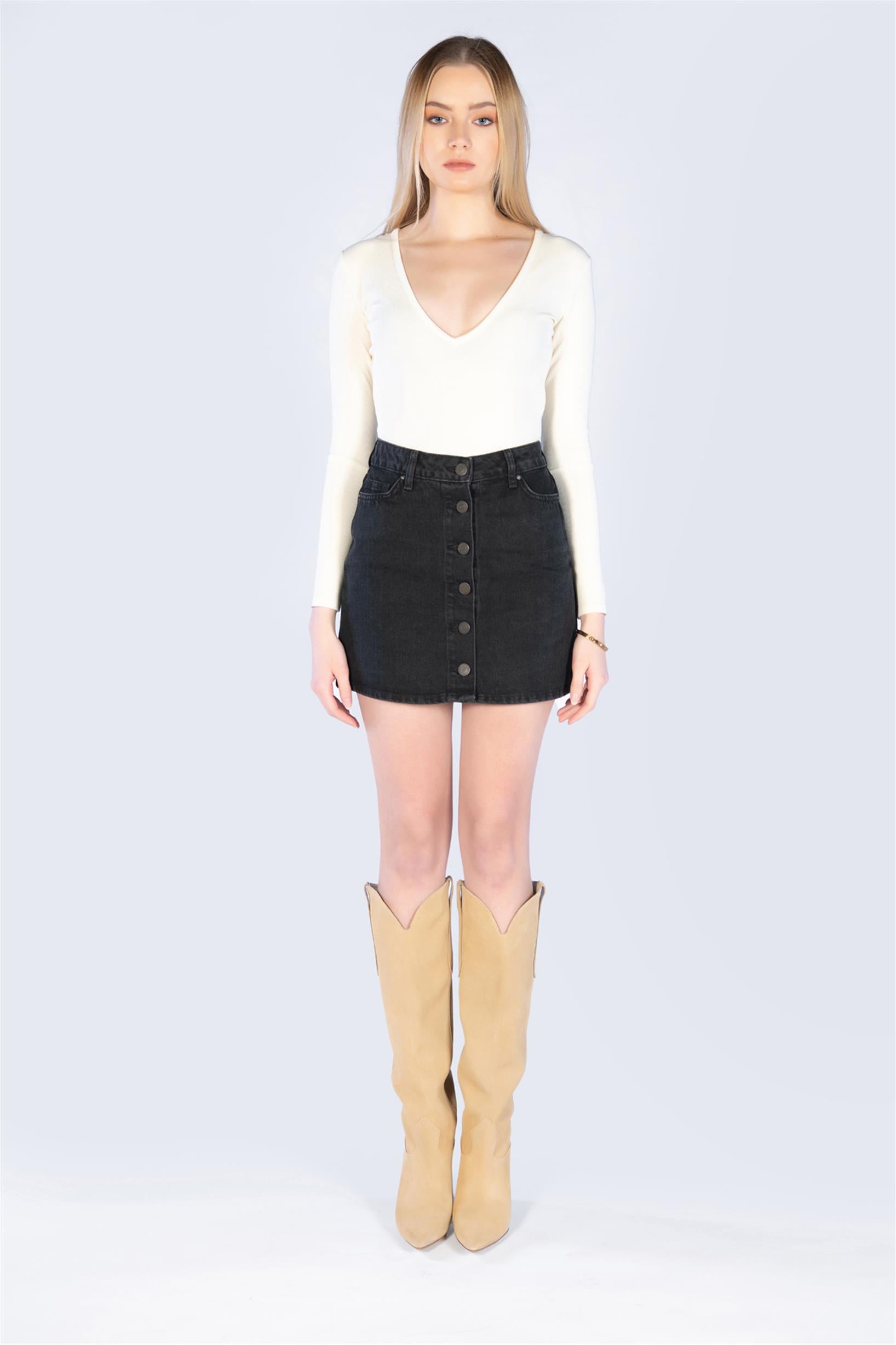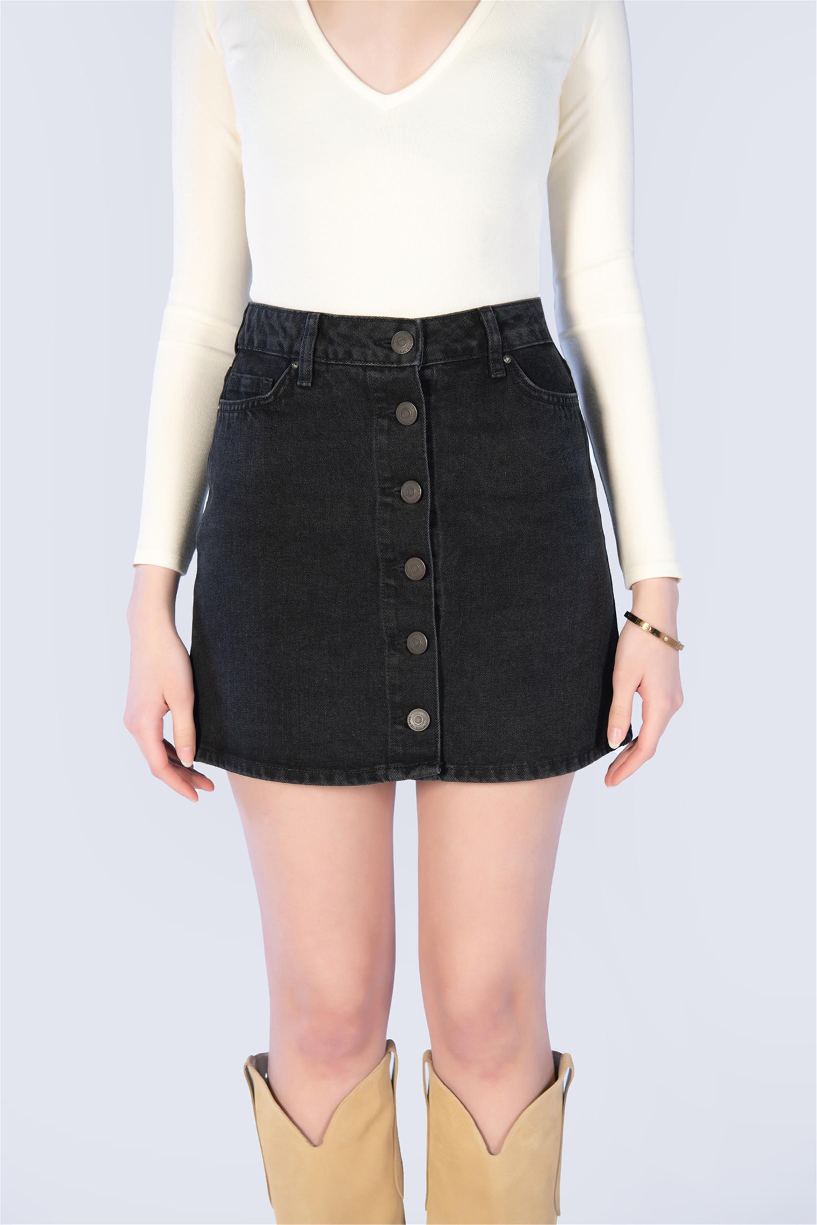 Antrasit Düğmeli Denim Mini Kot Etek