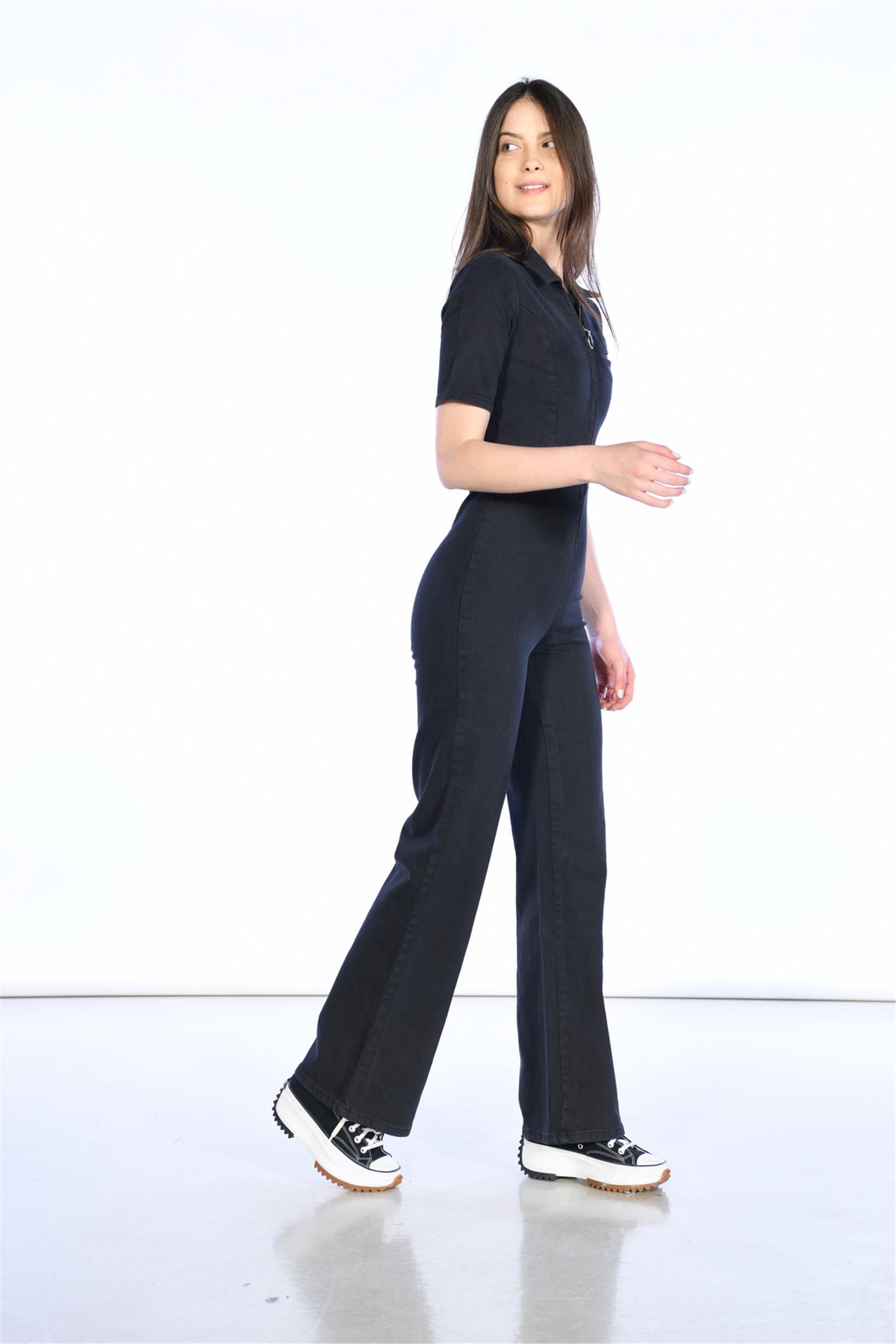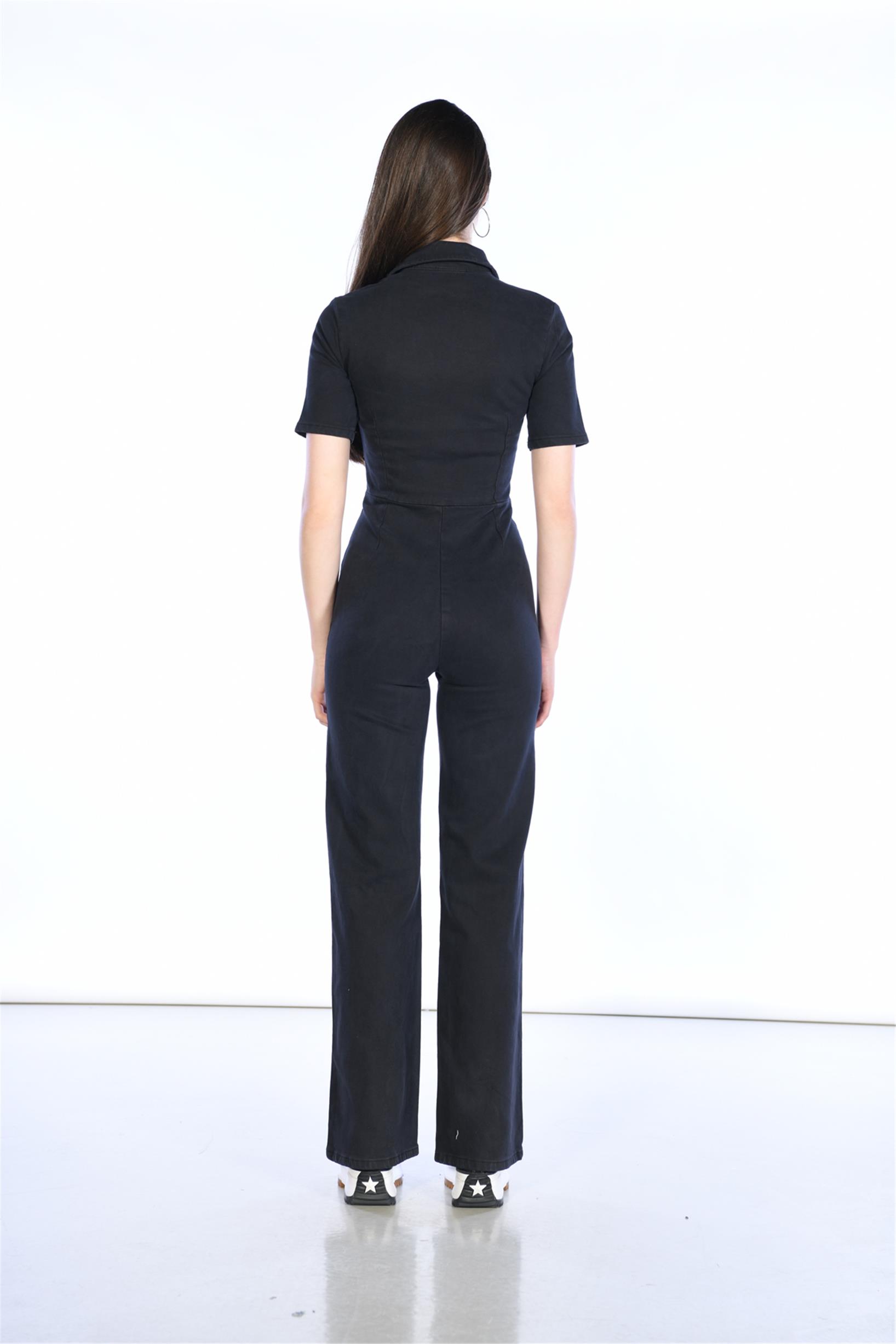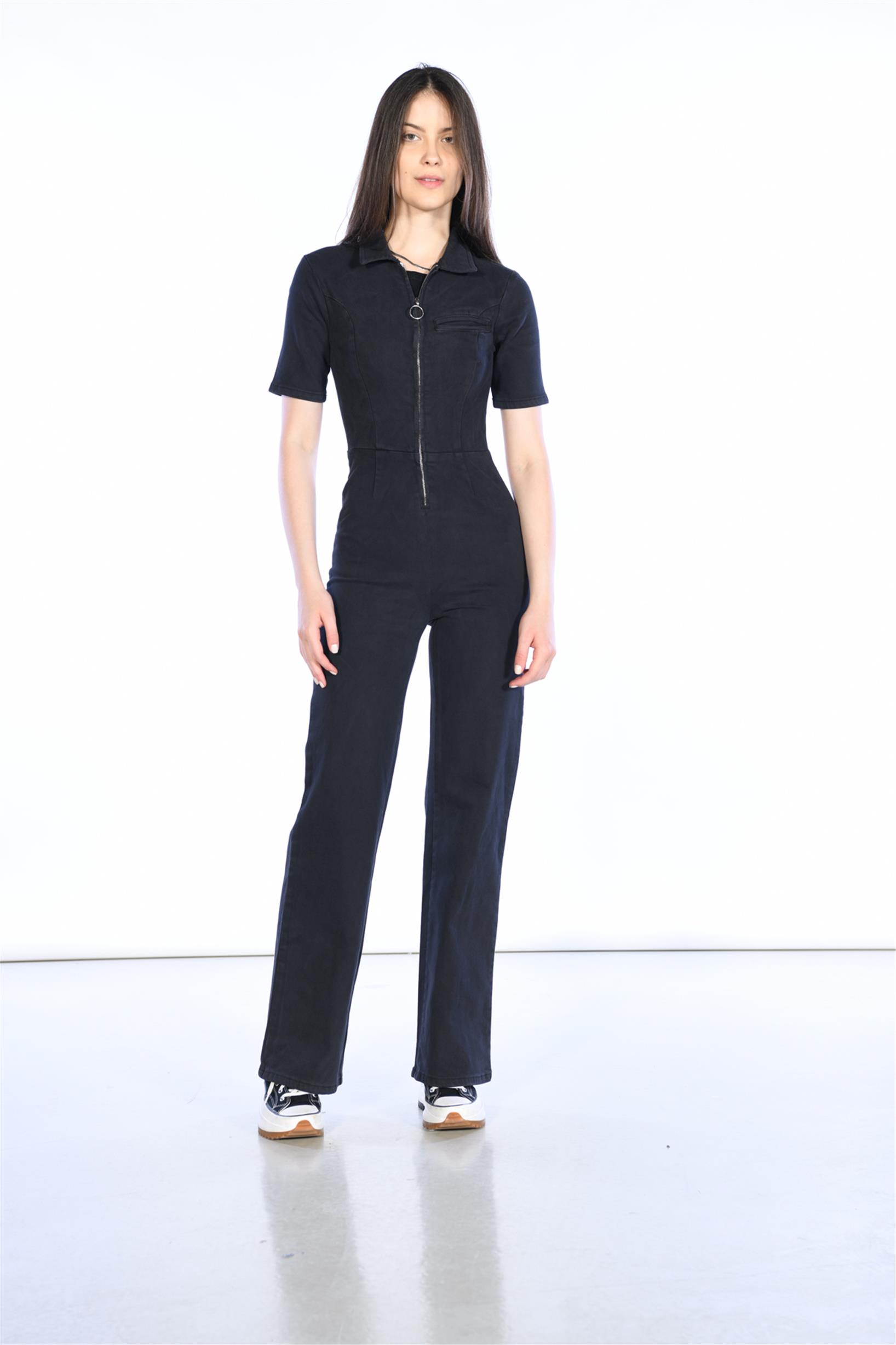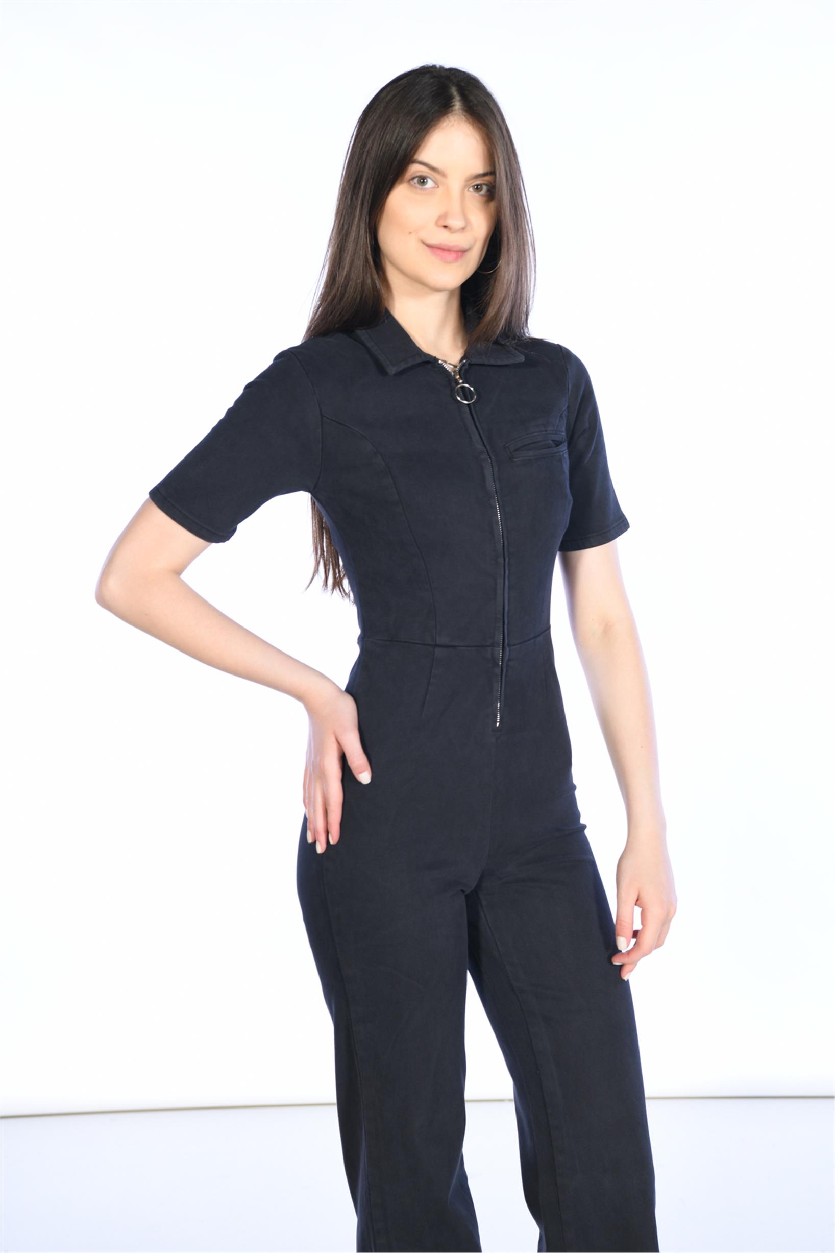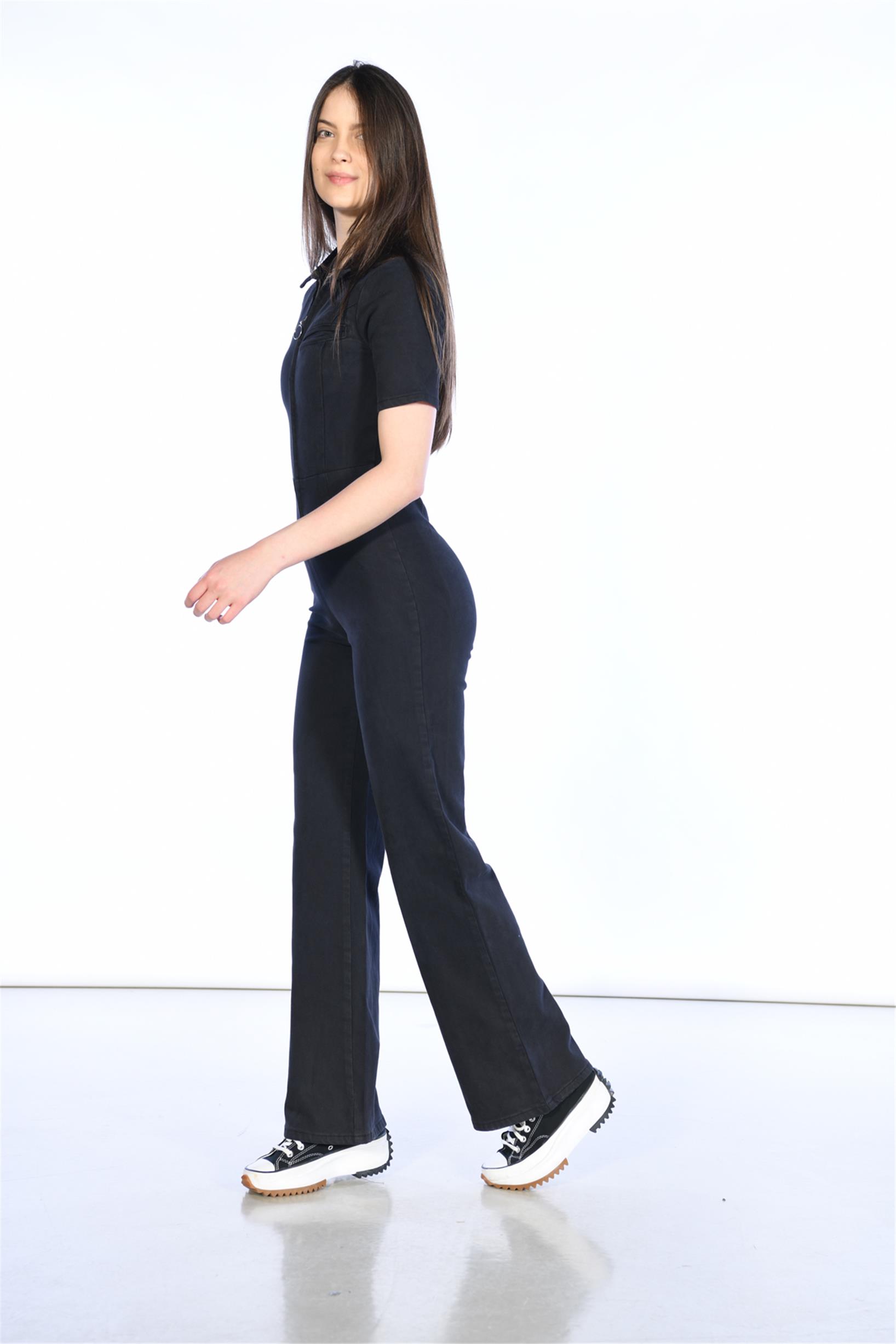 Antrasit Önden Feruarlı Kısa Kol Denim Tulum