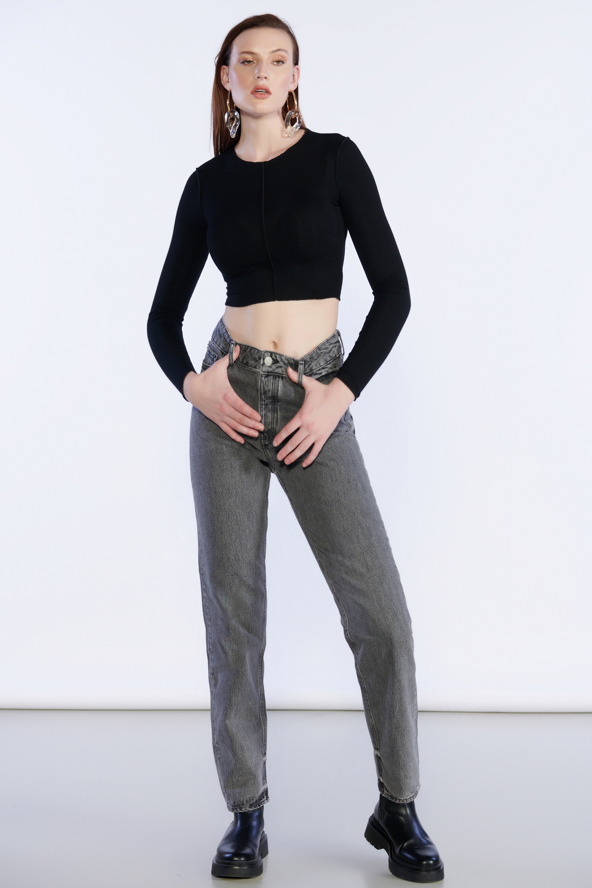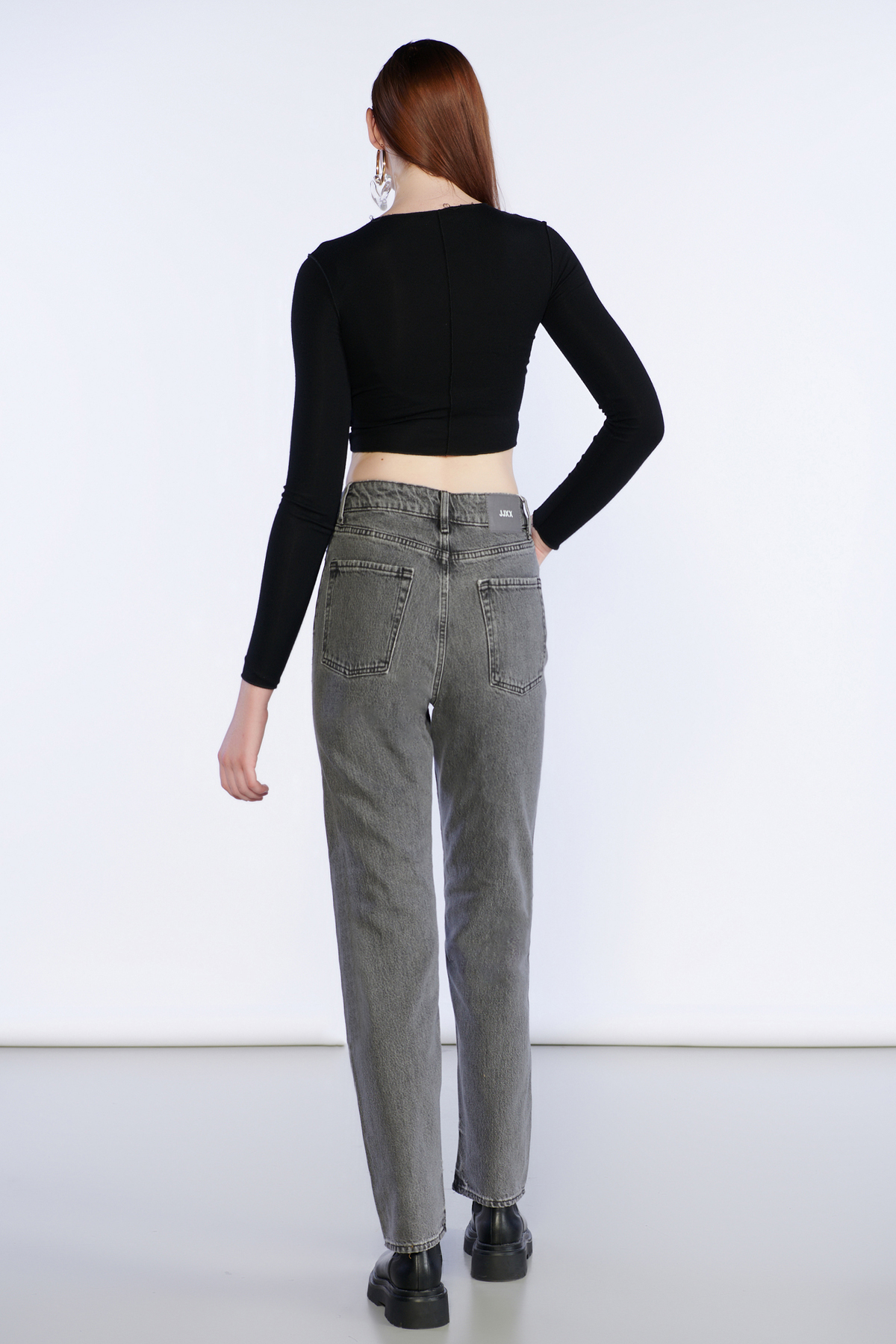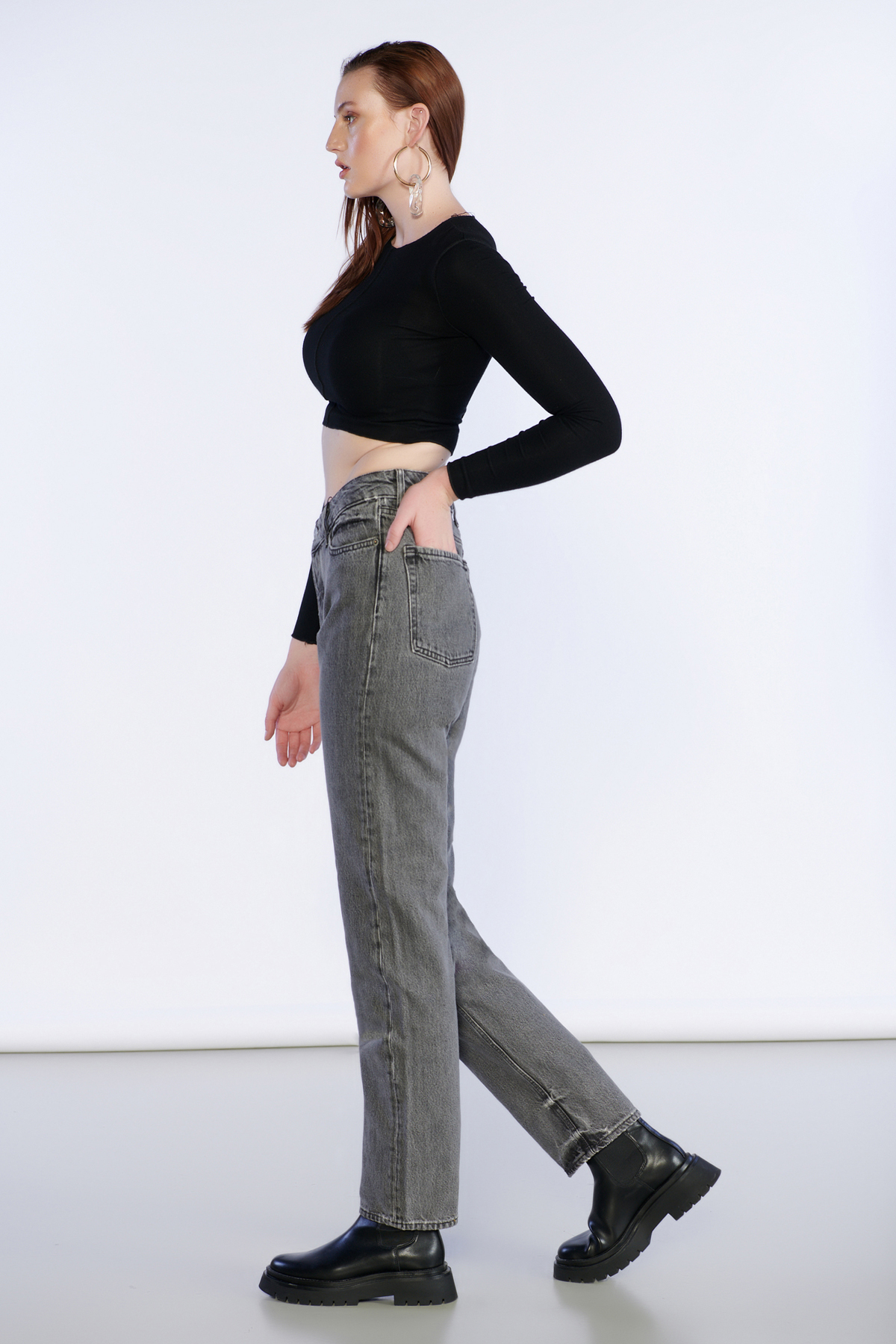 Antrasit Yüksek Bel Paça Lazer Detaylı Mom Jeans