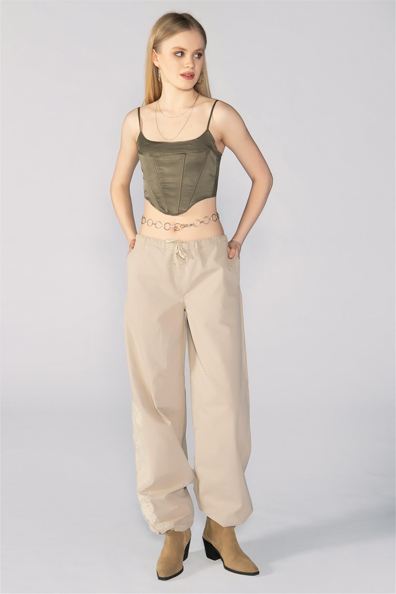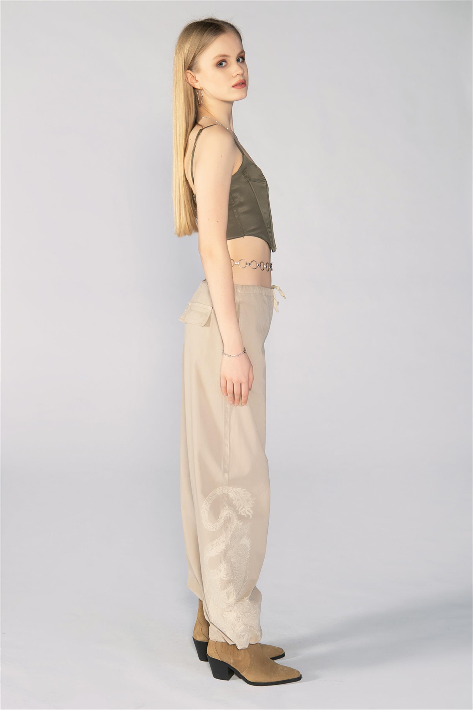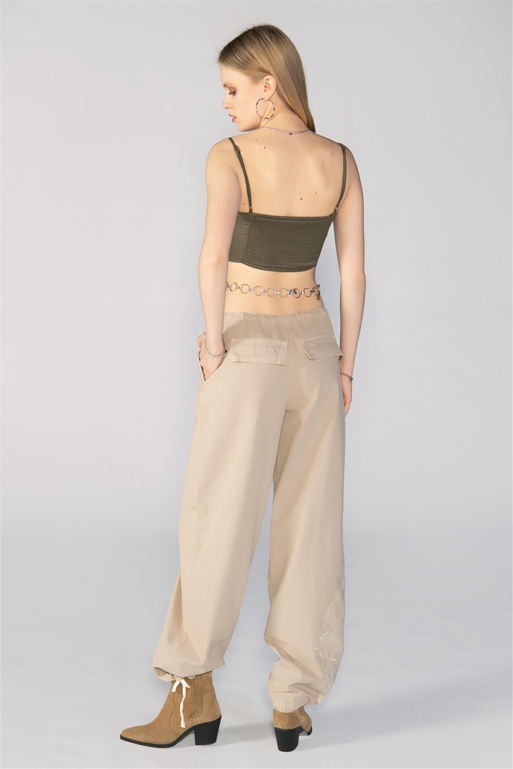 Bej Ayarlanabilir Bel Nakış Detay Paraşüt Kargo Pantolon
