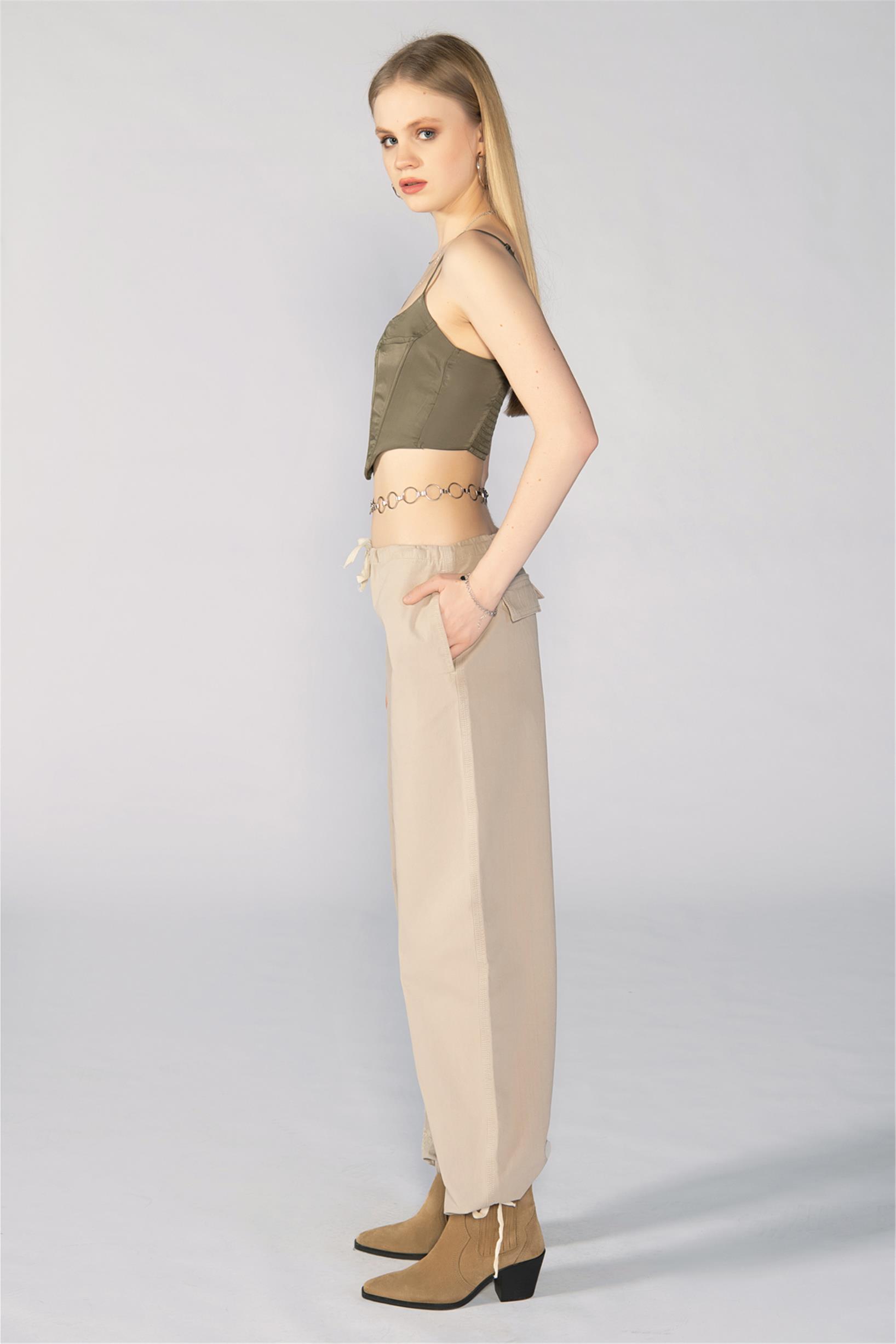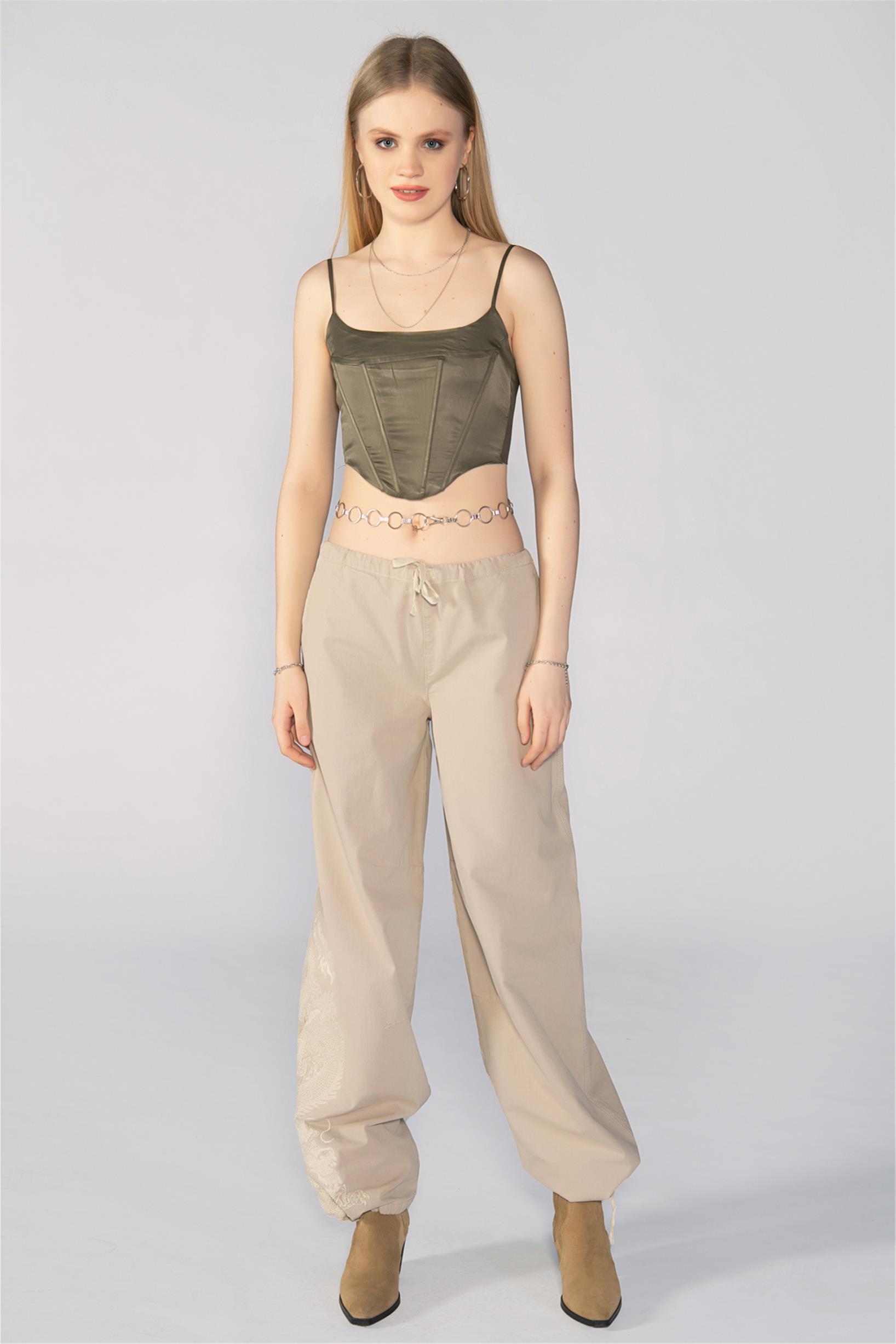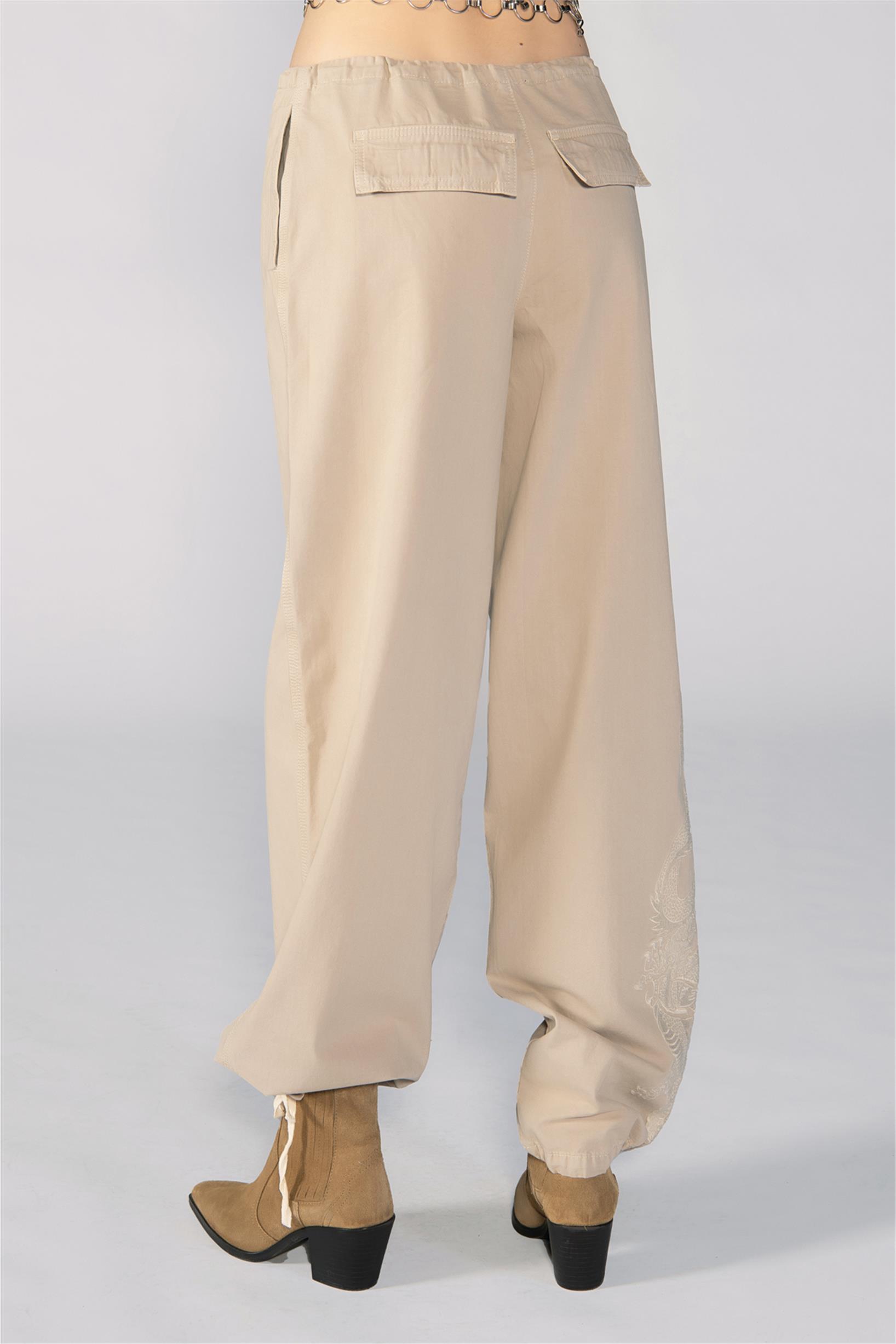 Bej Ayarlanabilir Bel Nakış Detay Paraşüt Kargo Pantolon