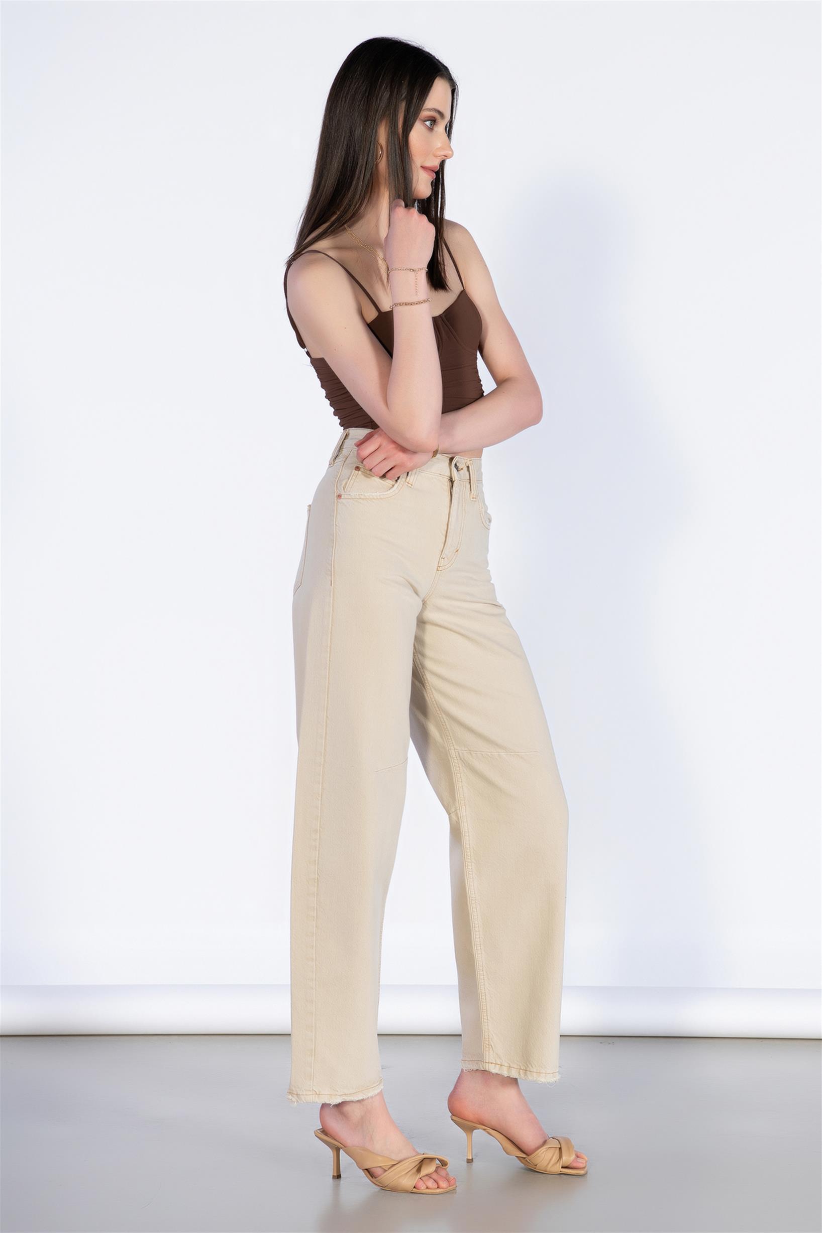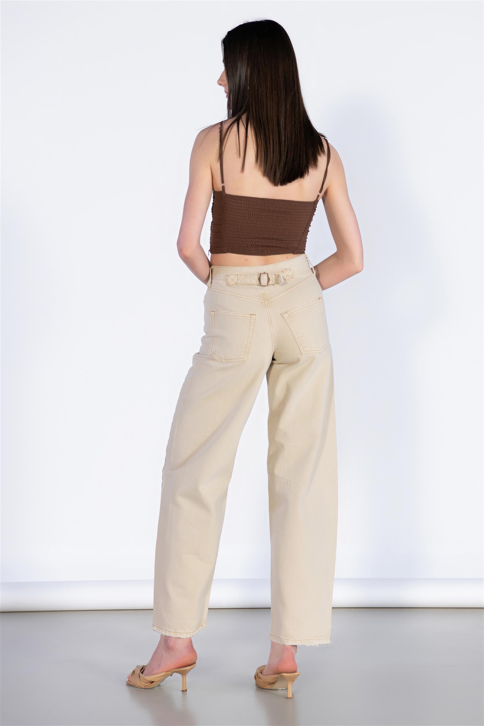 Bej Yüksek Bel Beli Kemerli Boyfirend Jeans