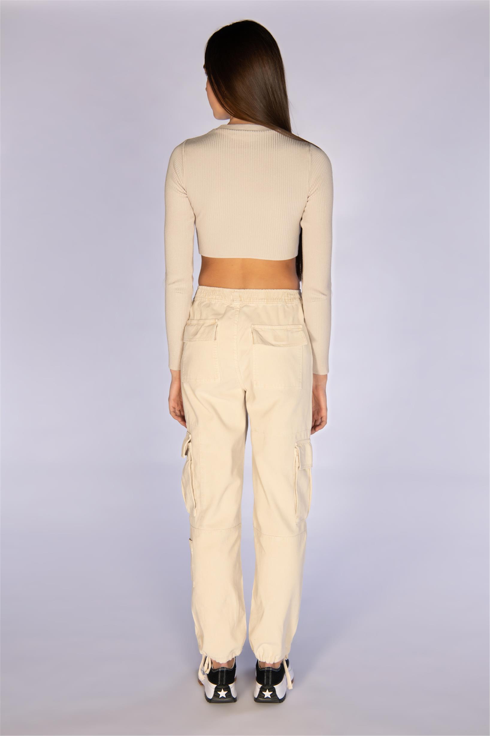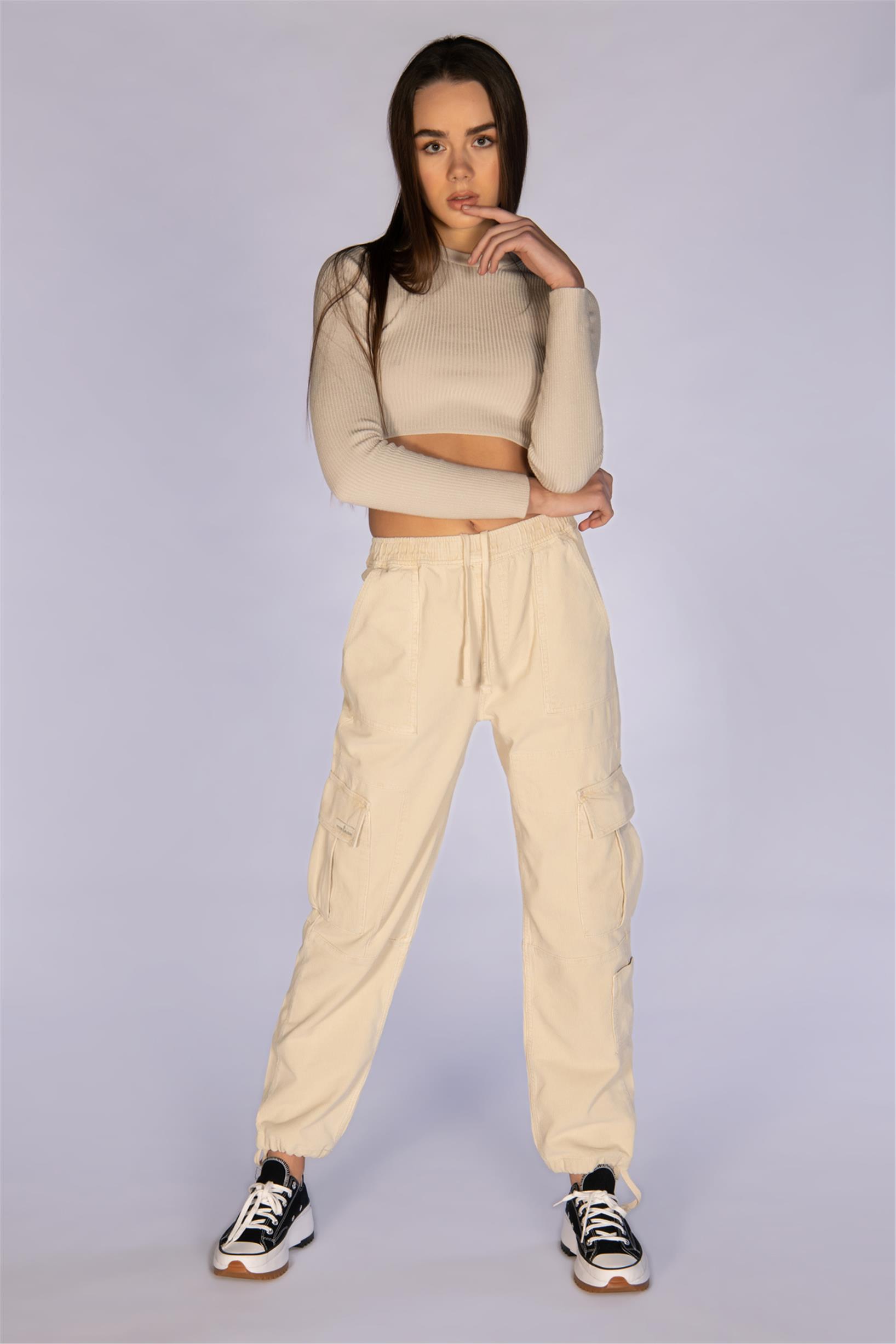 Bej Yüksek Bel Fitilli Kadife Jogger Kargo Pantolon