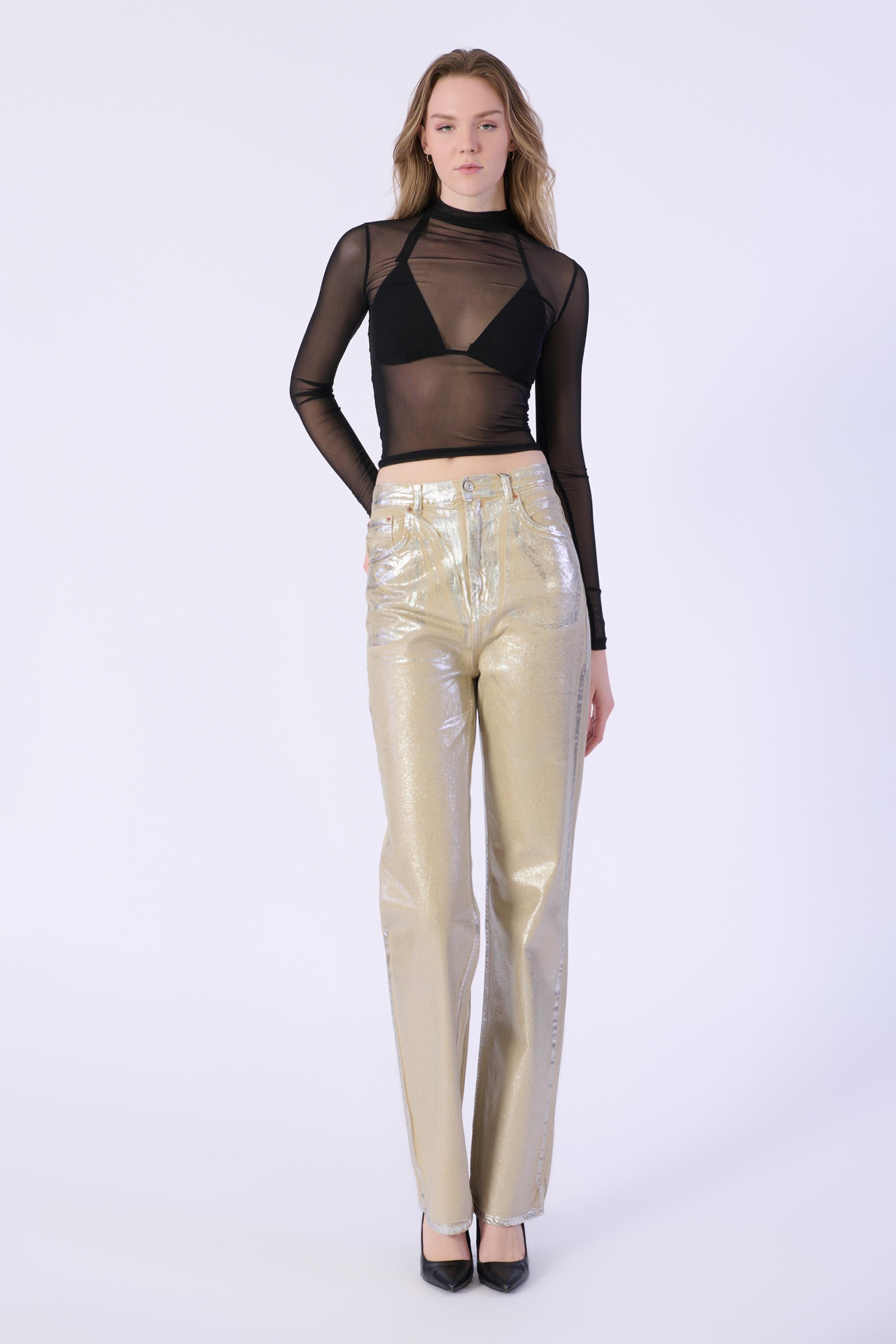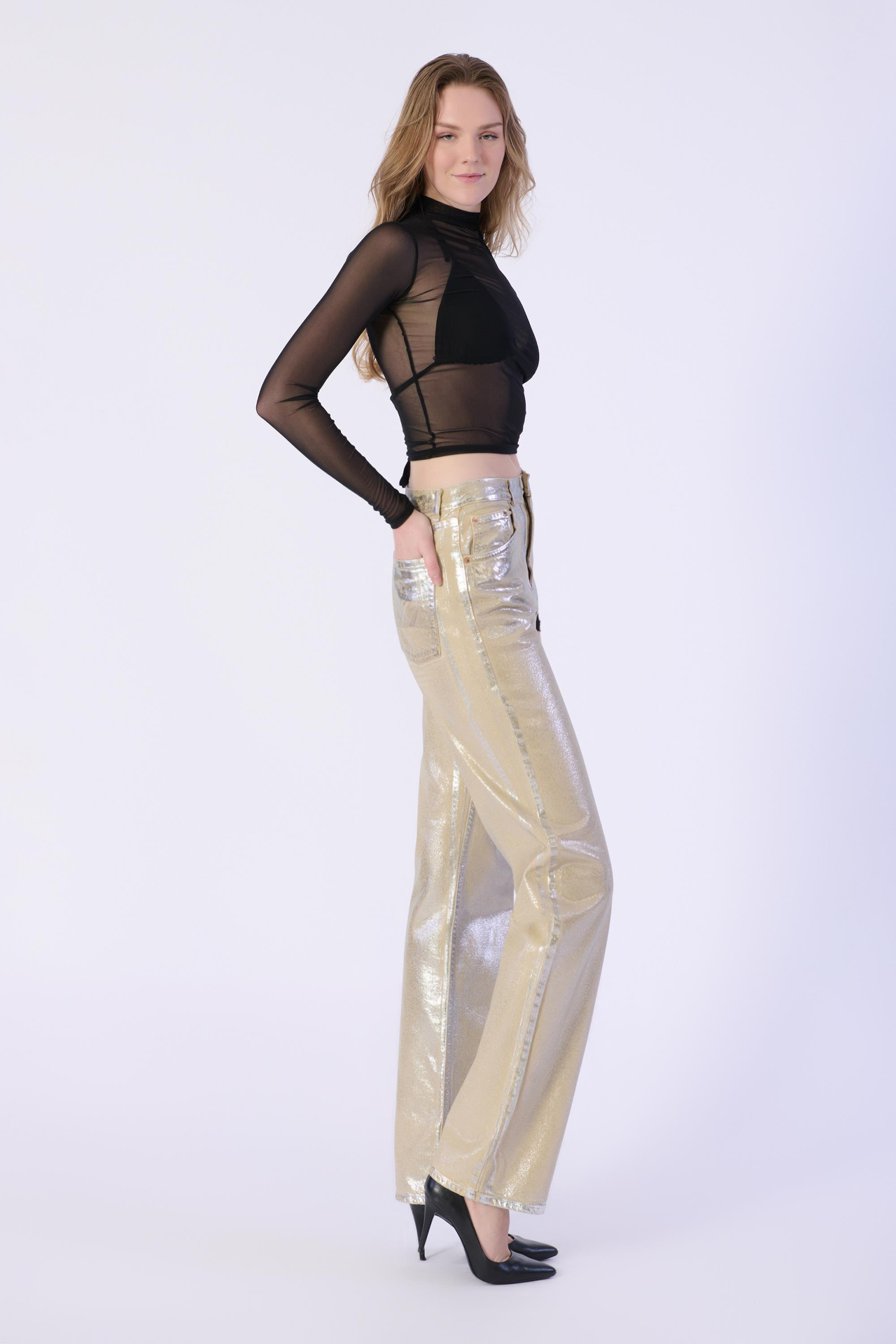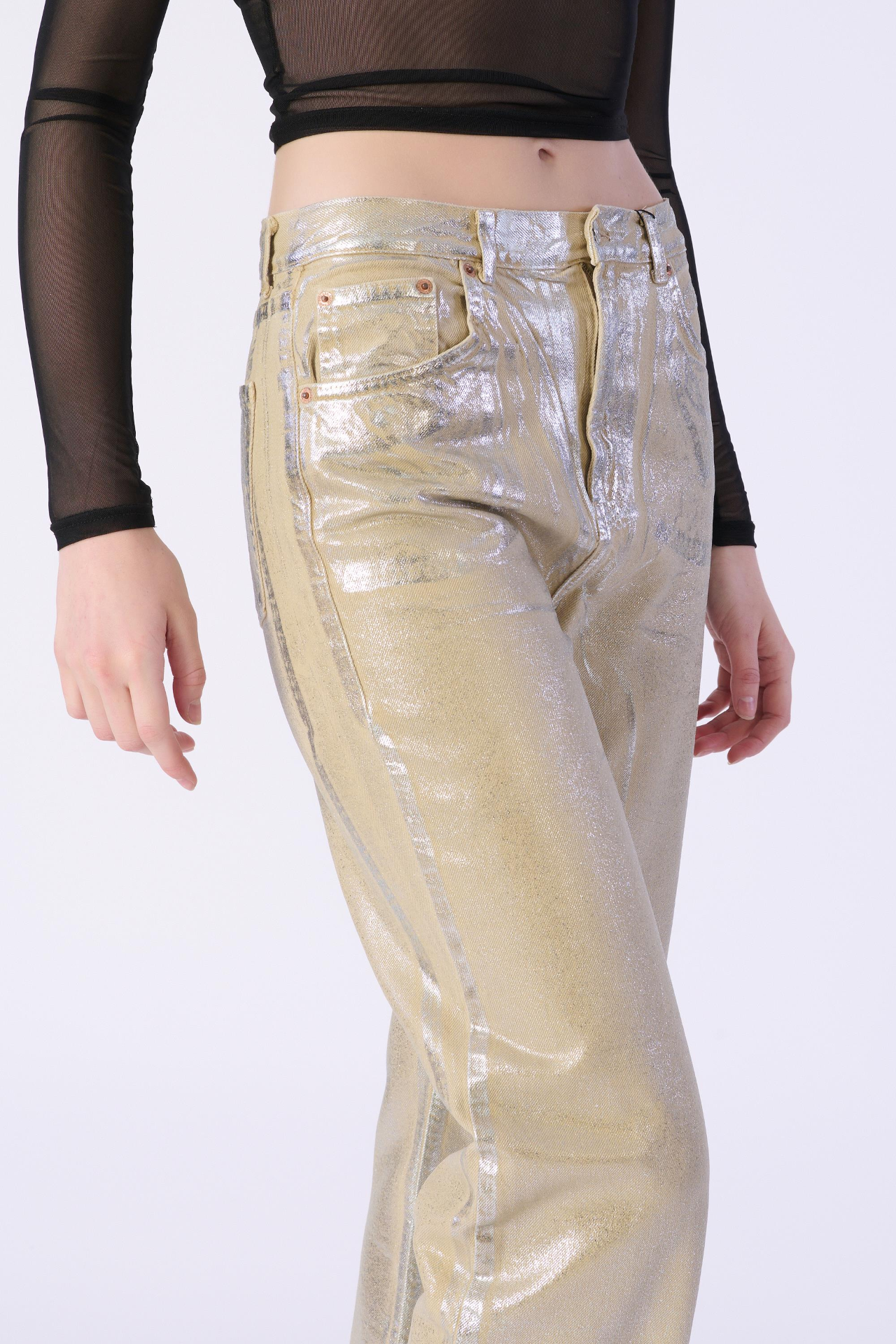 Bej Yüksek Bel Wide Leg Jeans Varaklı Pantolon