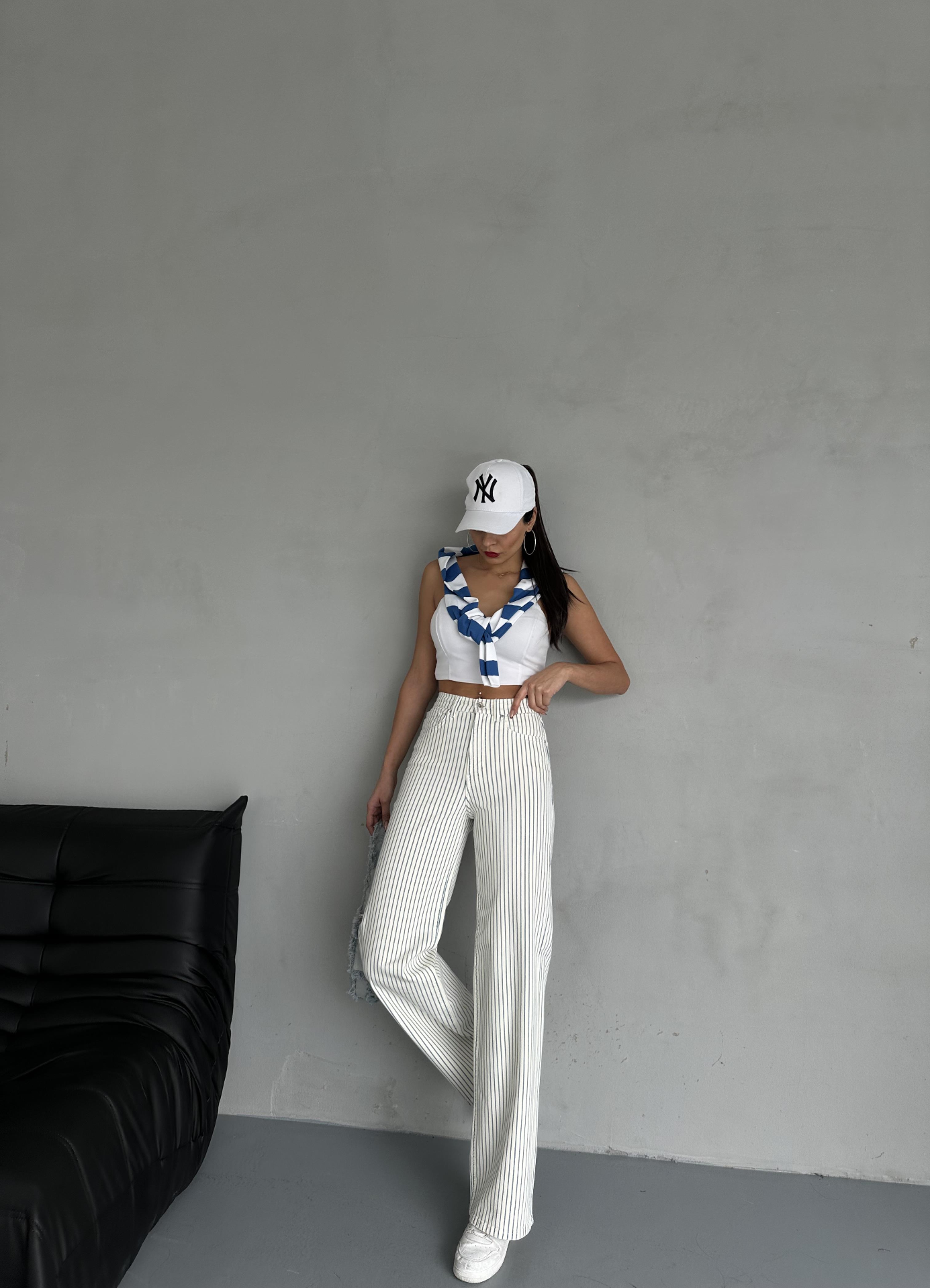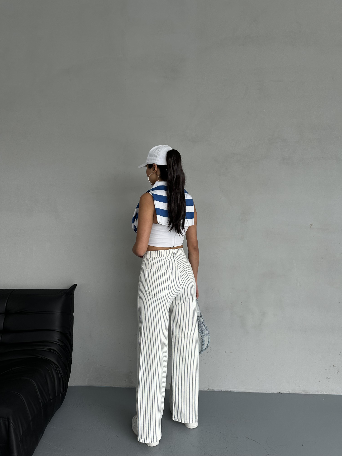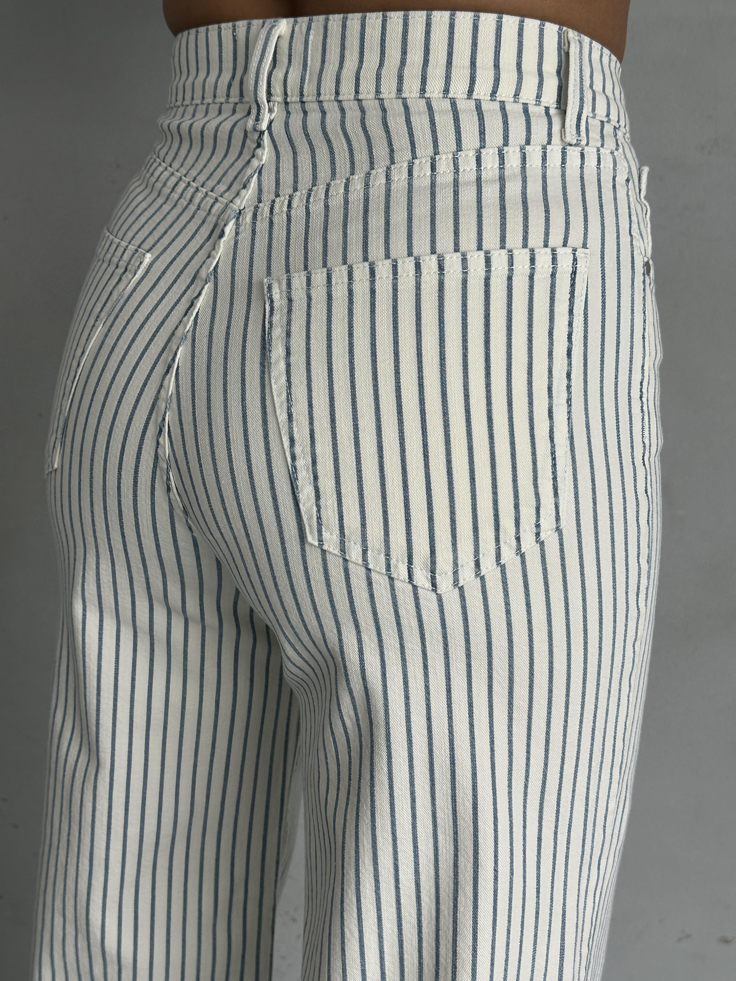Beyaz Mavi Çizgi Detaylı Wide Leg Gabardin Pantolon
