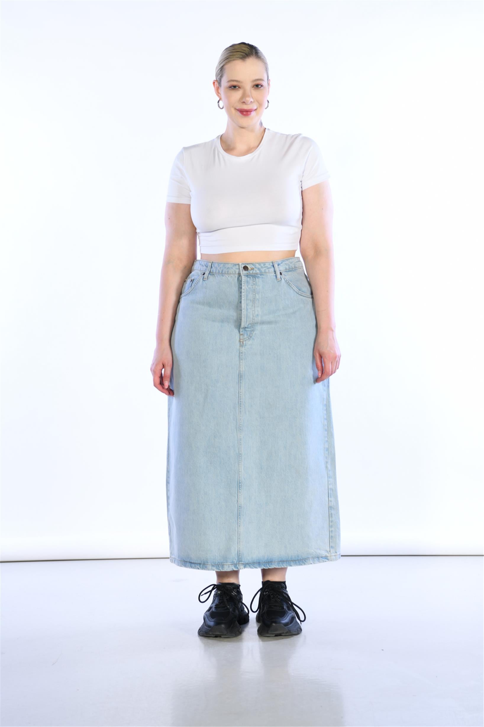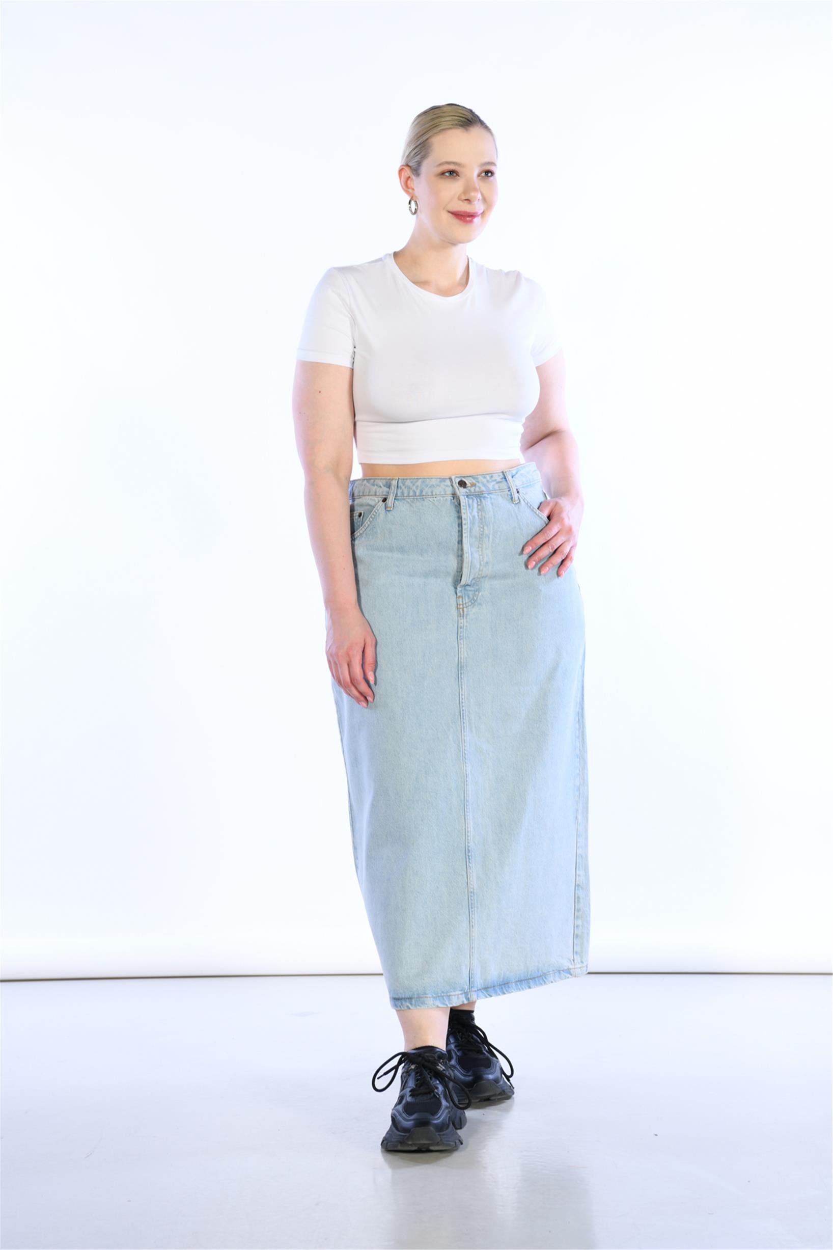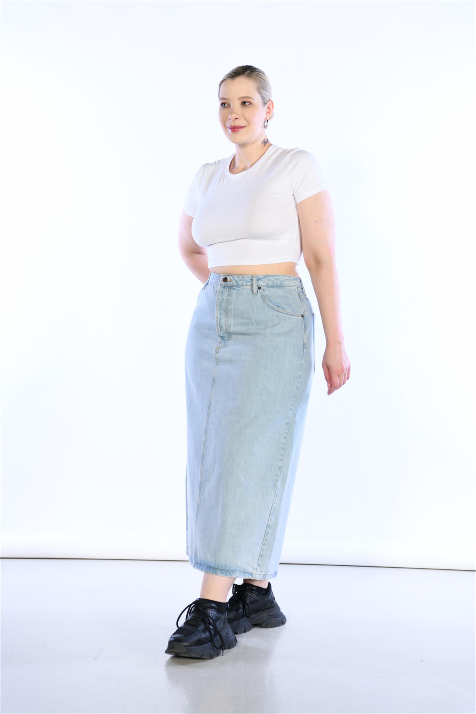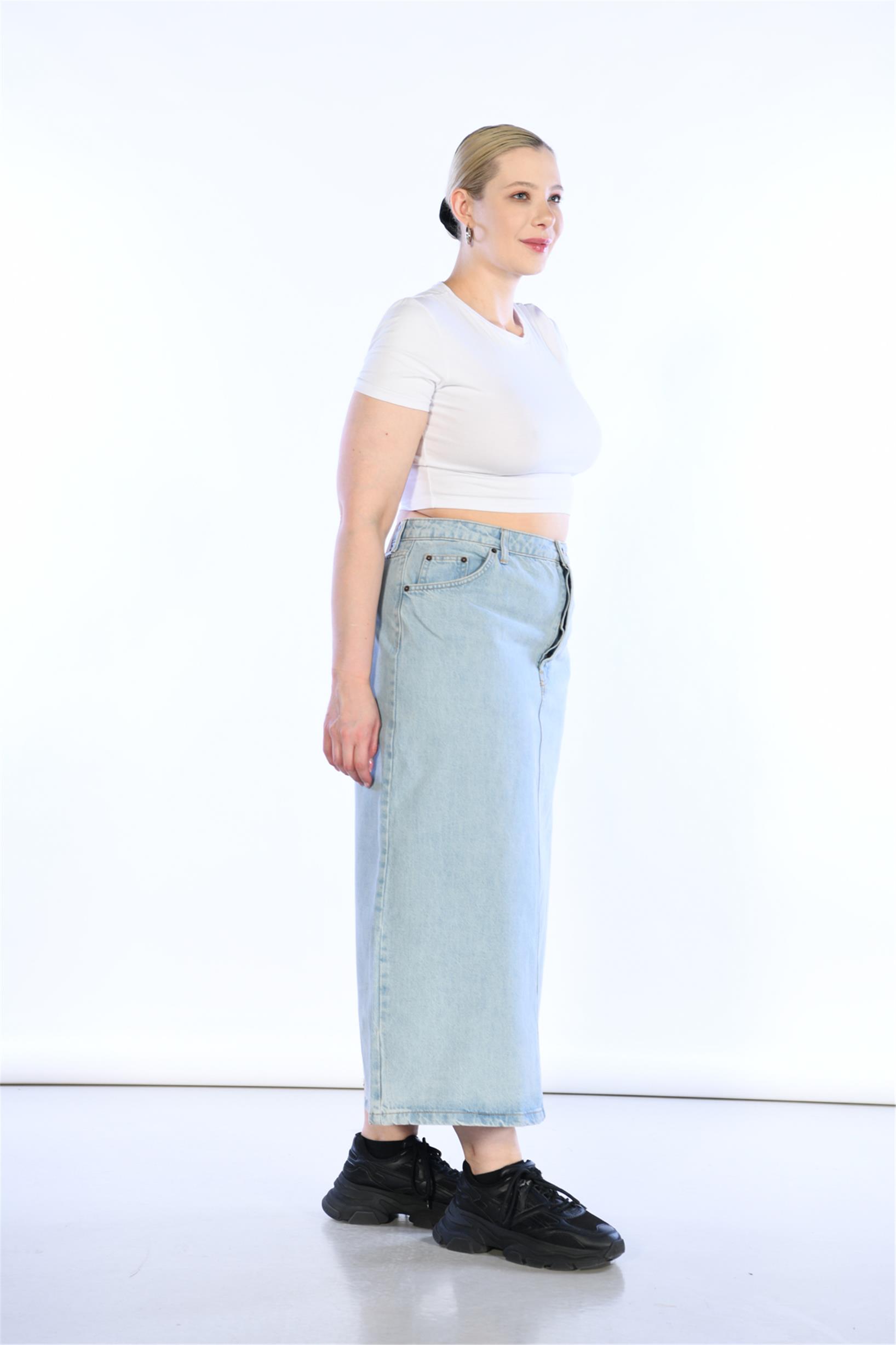 Büyük Beden Açık Mavi Yüksek Bel Arka Yırtmaç Detaylı Midi Boy Kot Etek