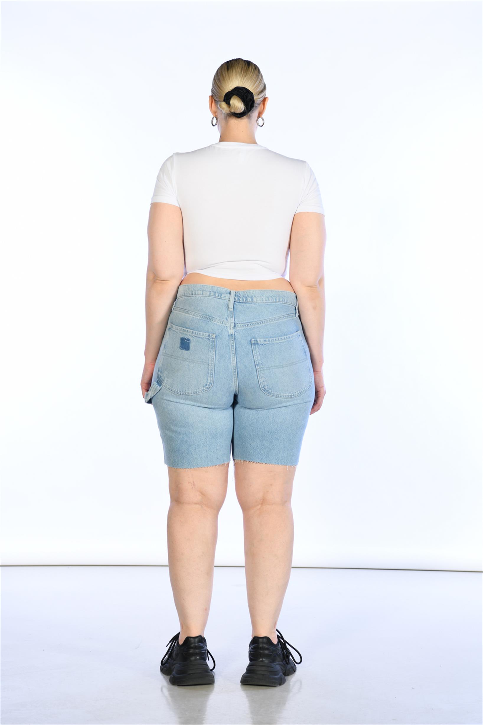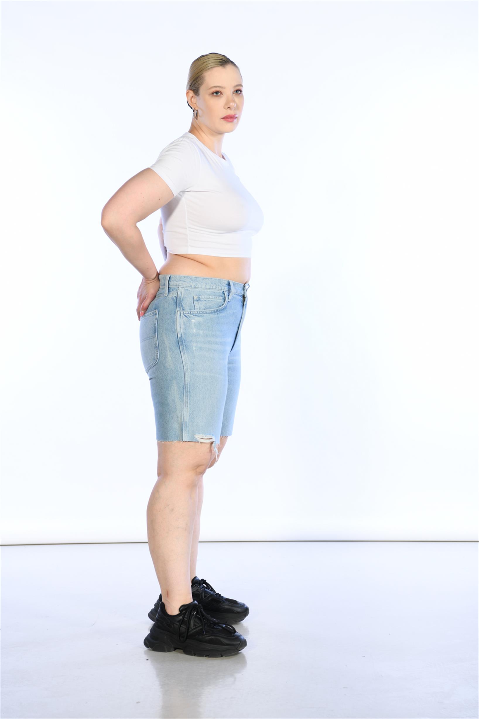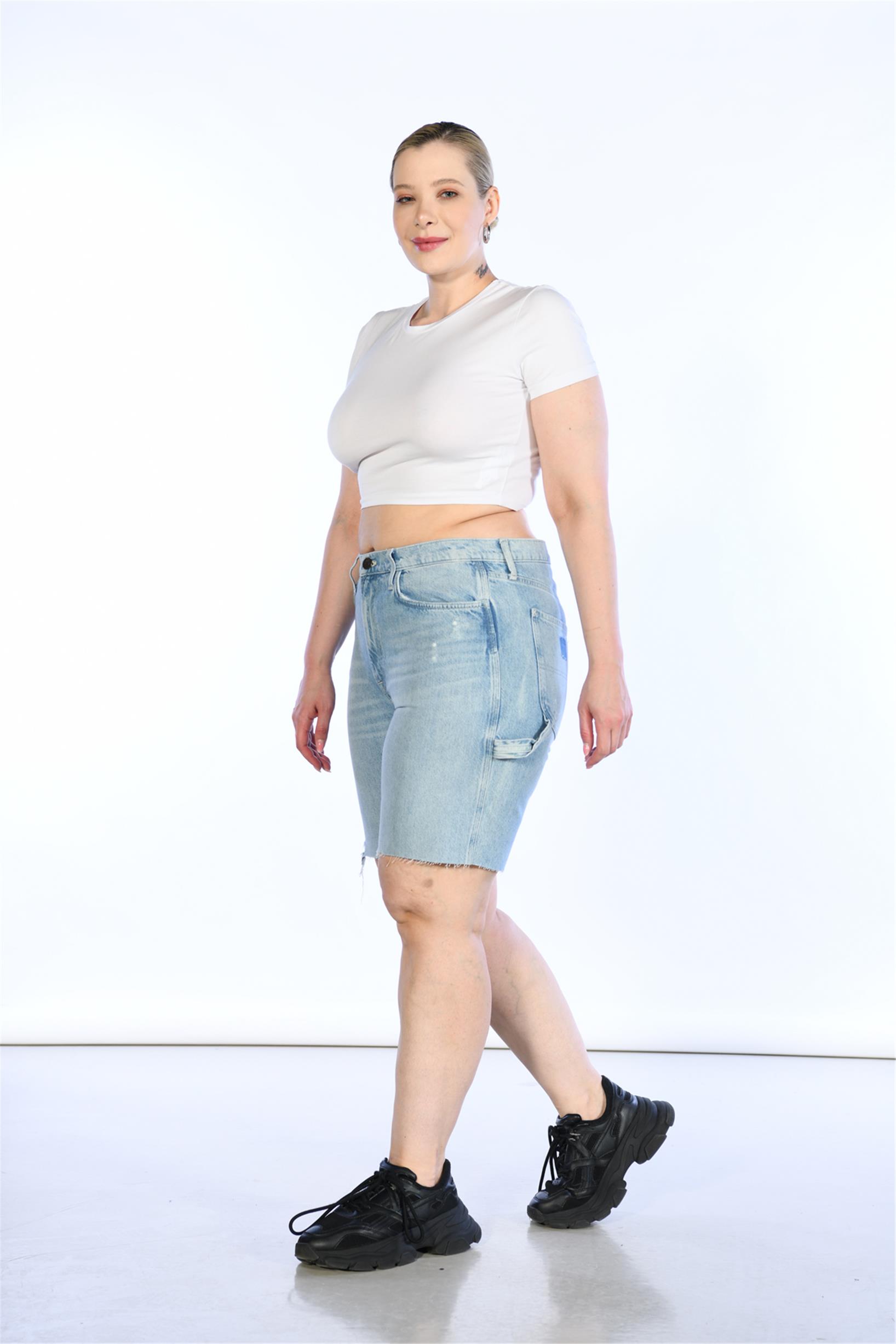 Büyük Beden Açık Mavi Yüksek Bel Lazer Detay Bermuda Kot Şort