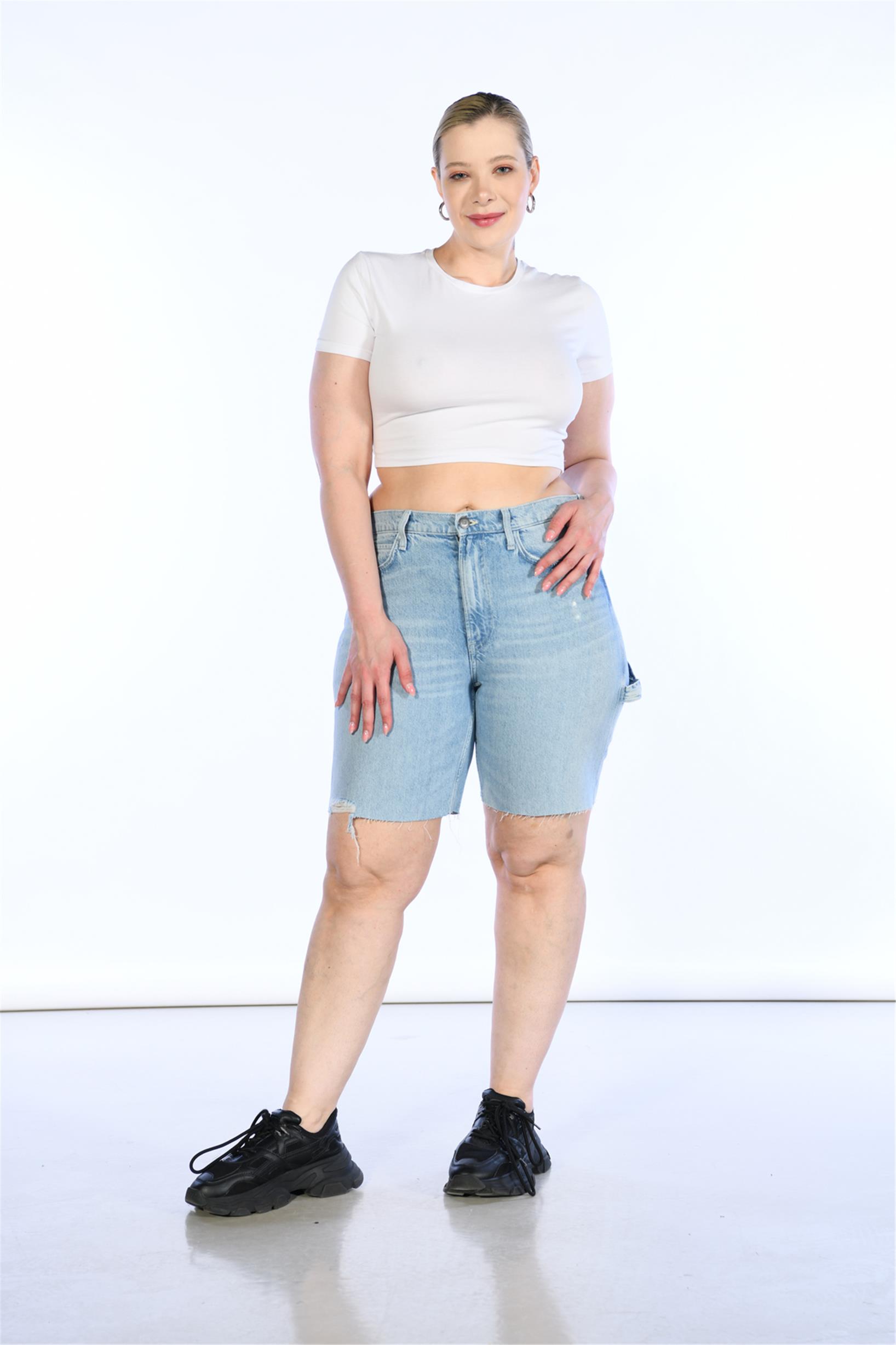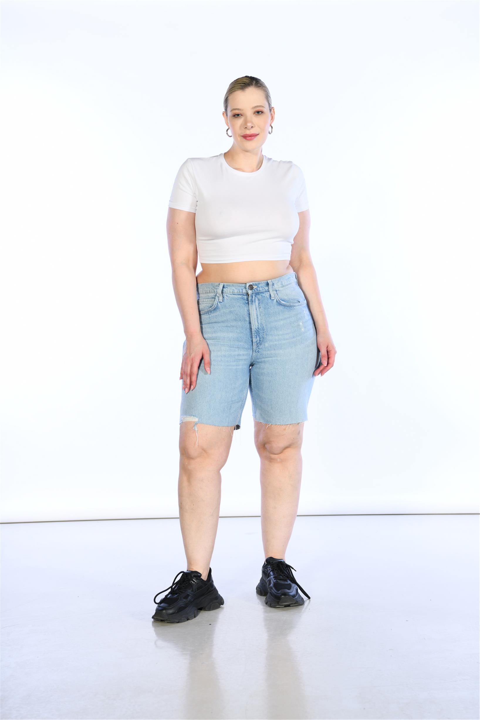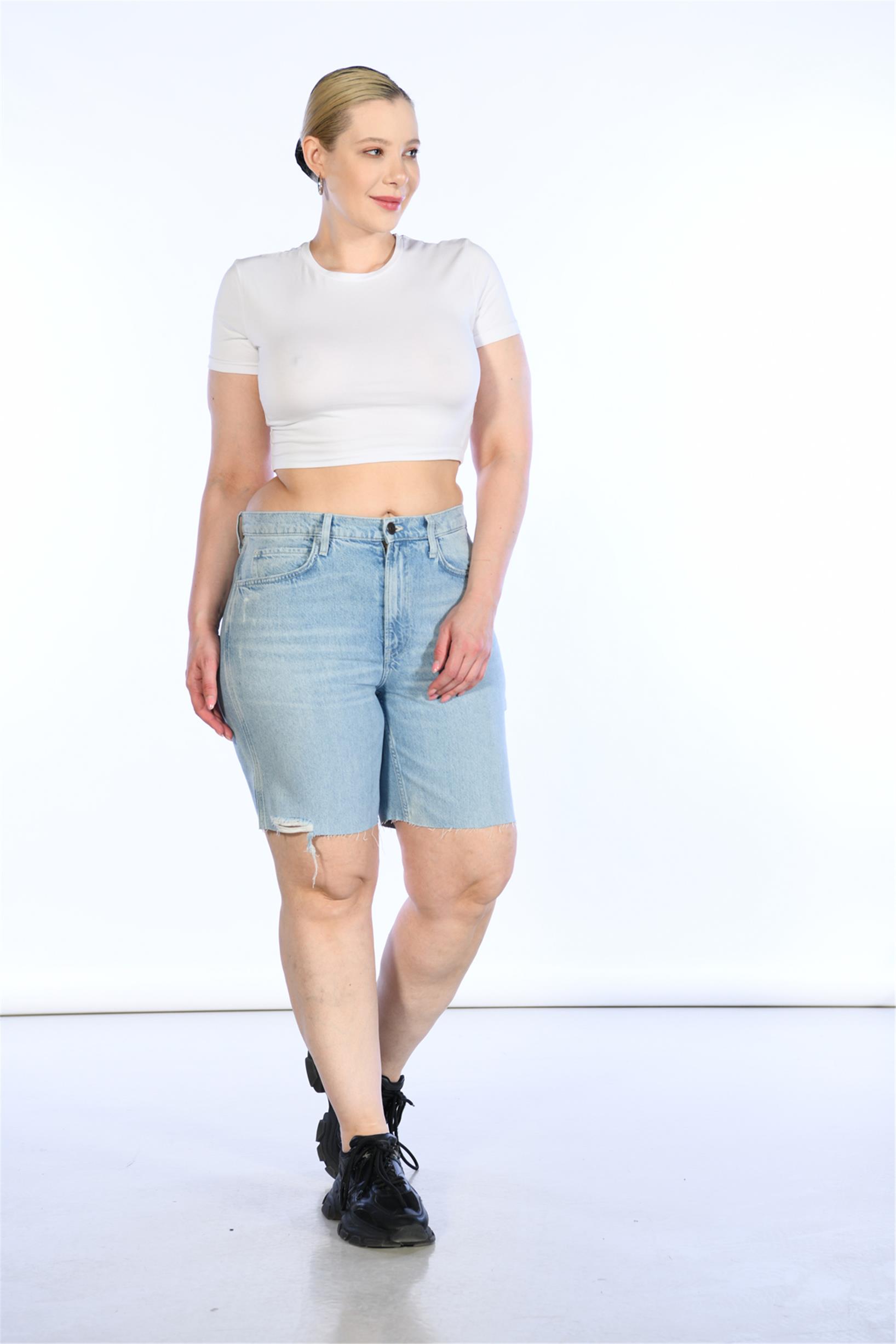 Büyük Beden Açık Mavi Yüksek Bel Lazer Detay Bermuda Kot Şort