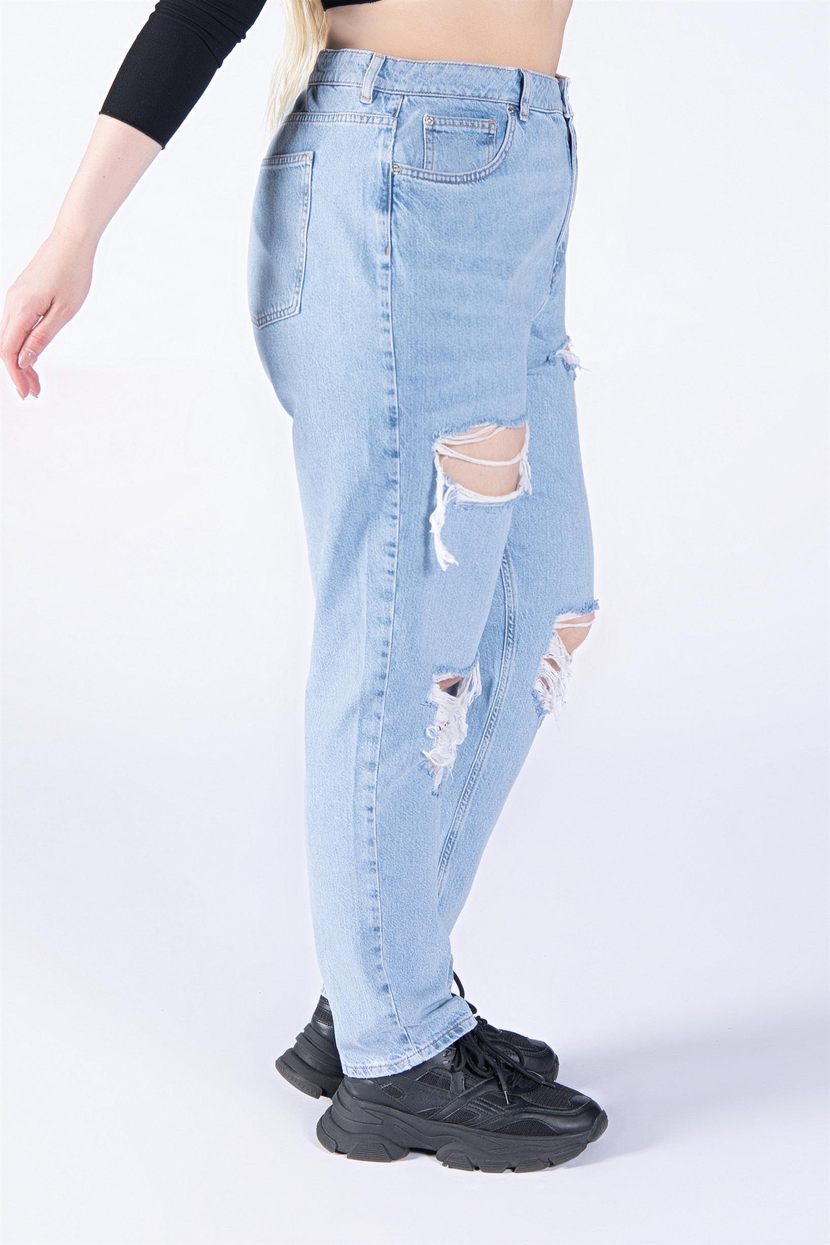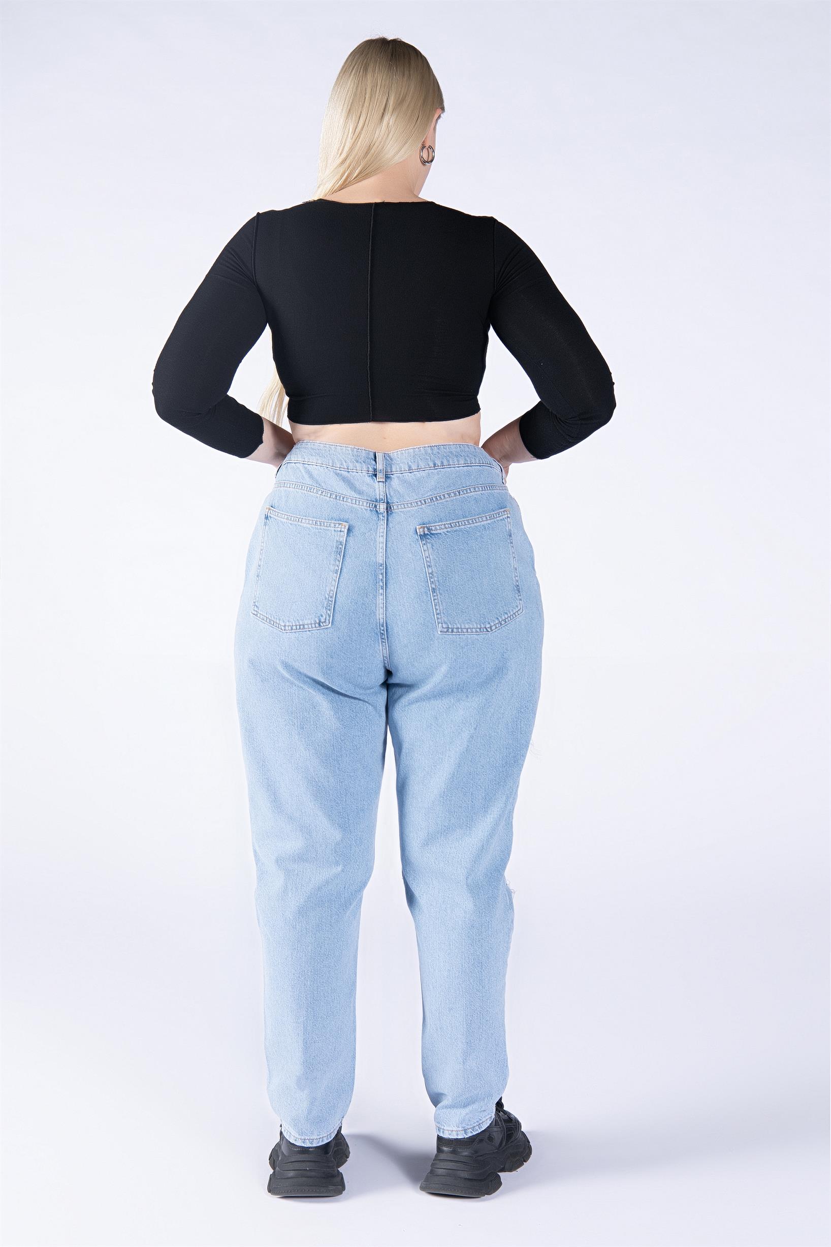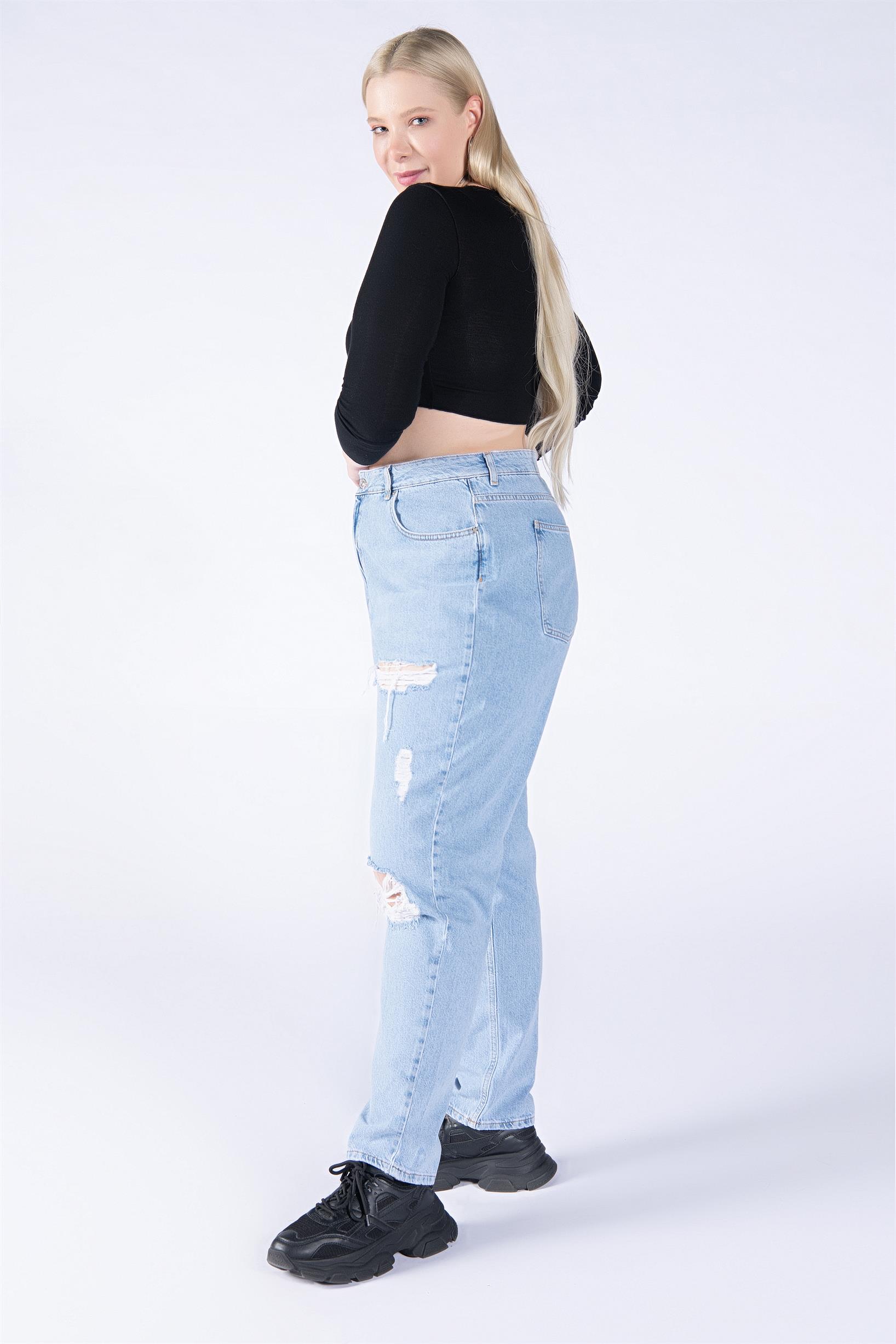 Büyük Beden Açık Mavi Yüksek Bel Lazerli Wide Leg Jeans