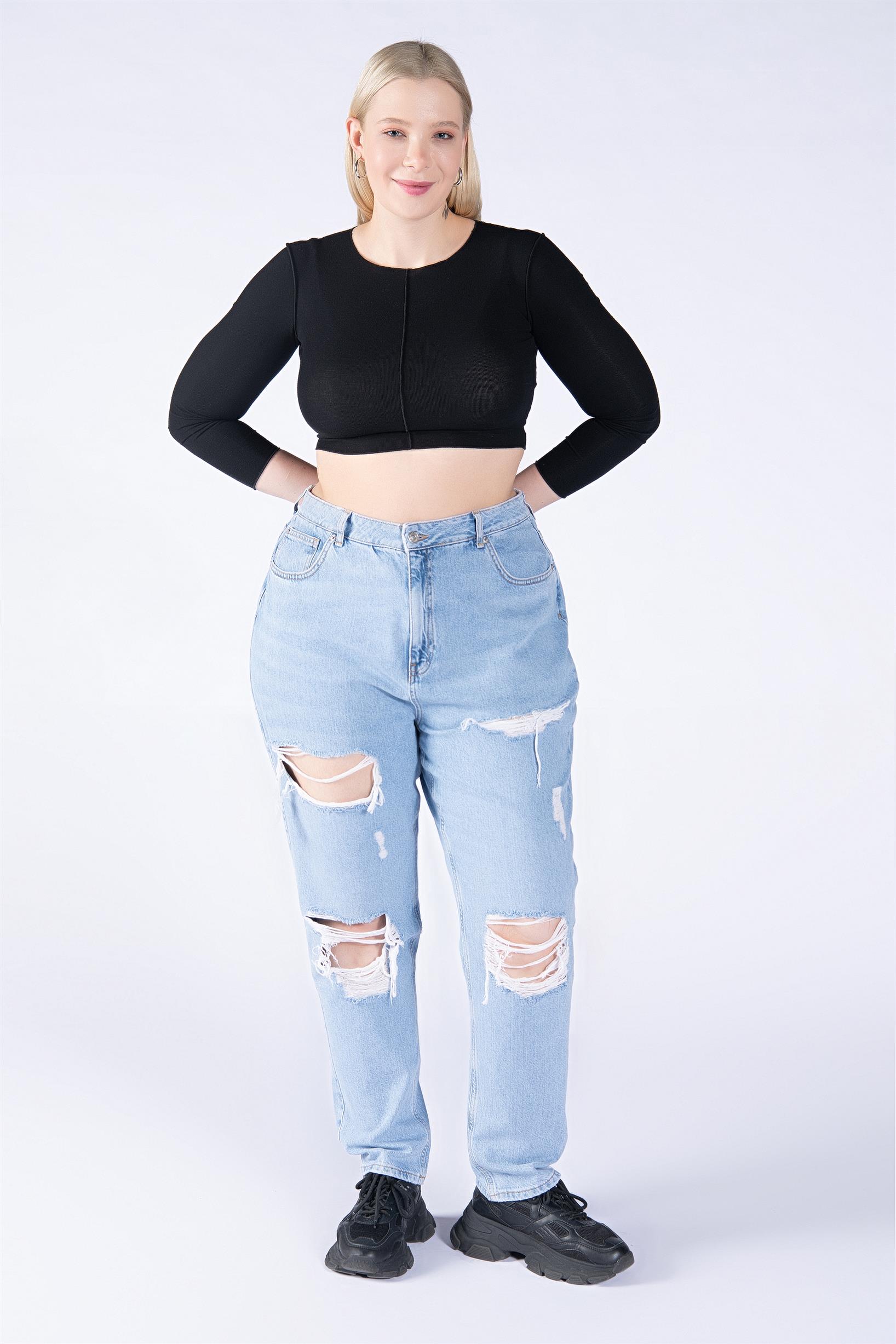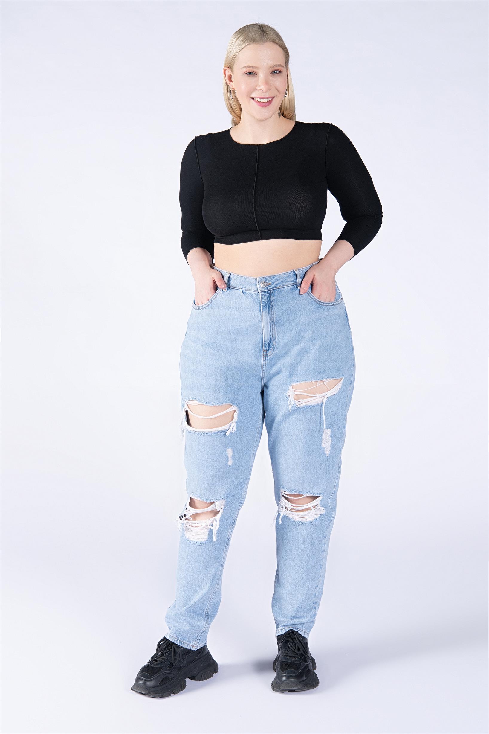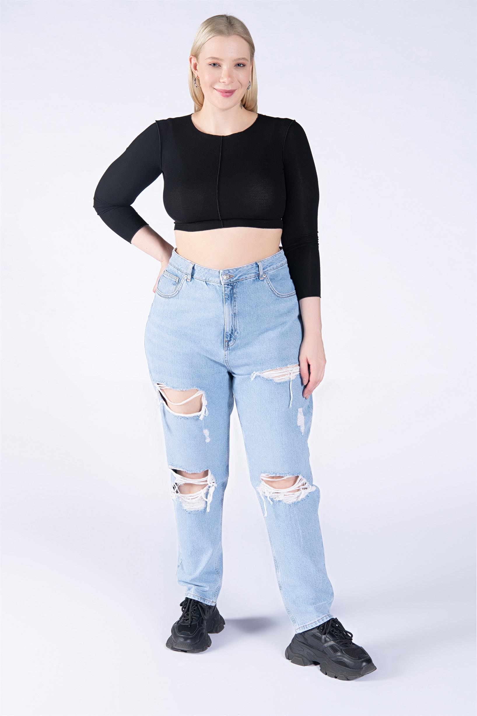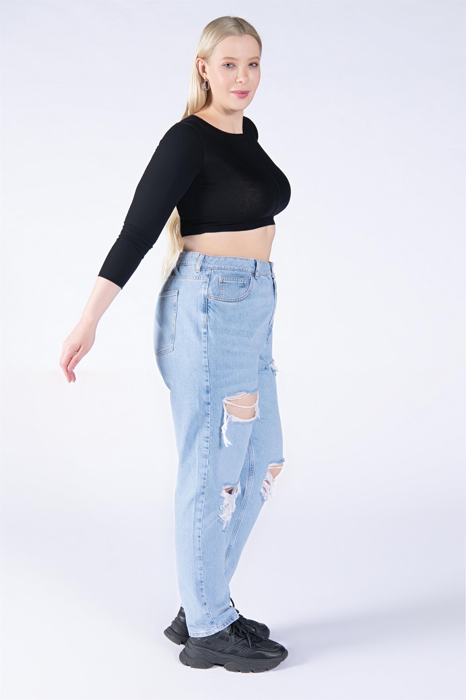 Büyük Beden Açık Mavi Yüksek Bel Lazerli Wide Leg Jeans