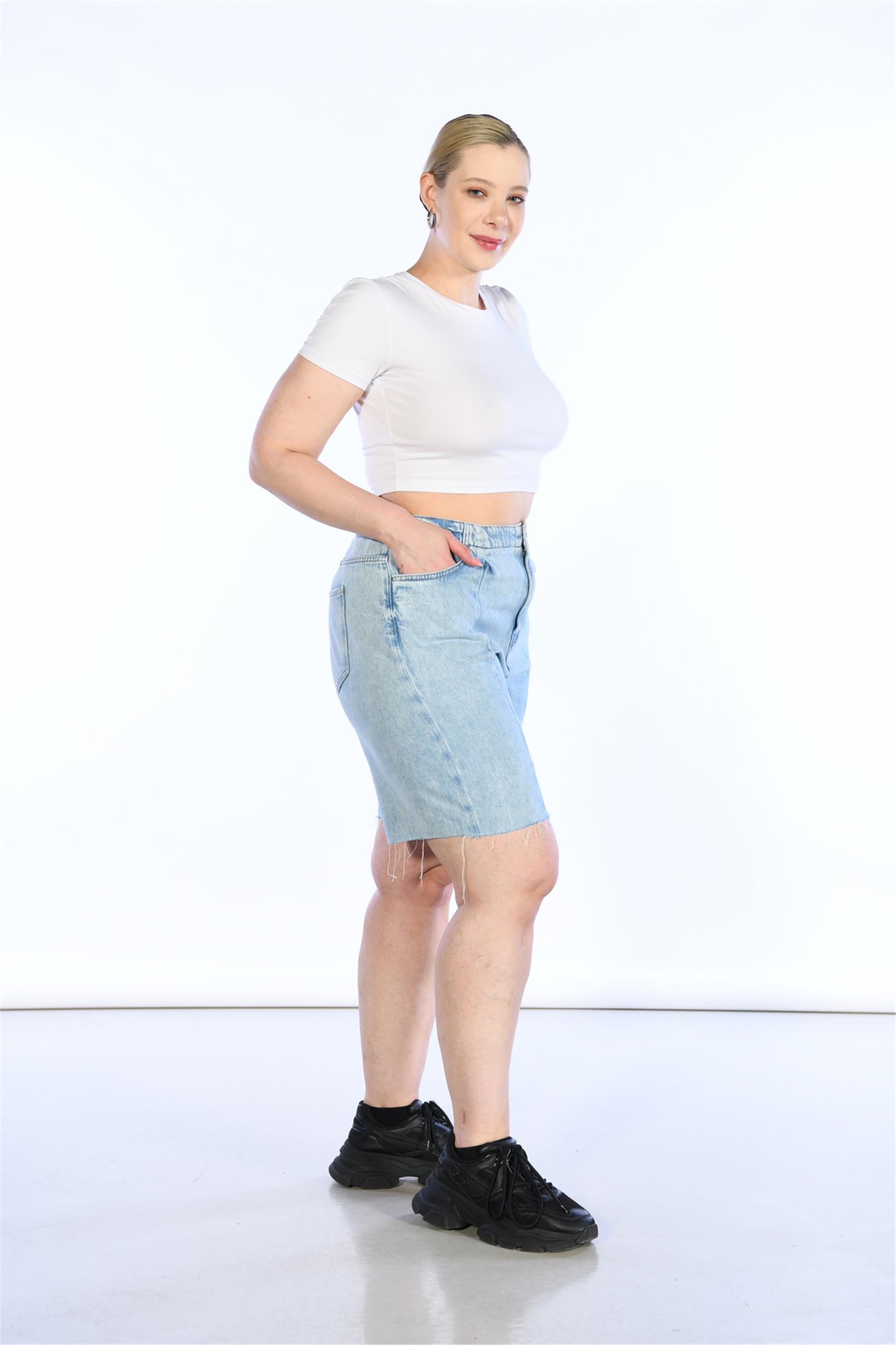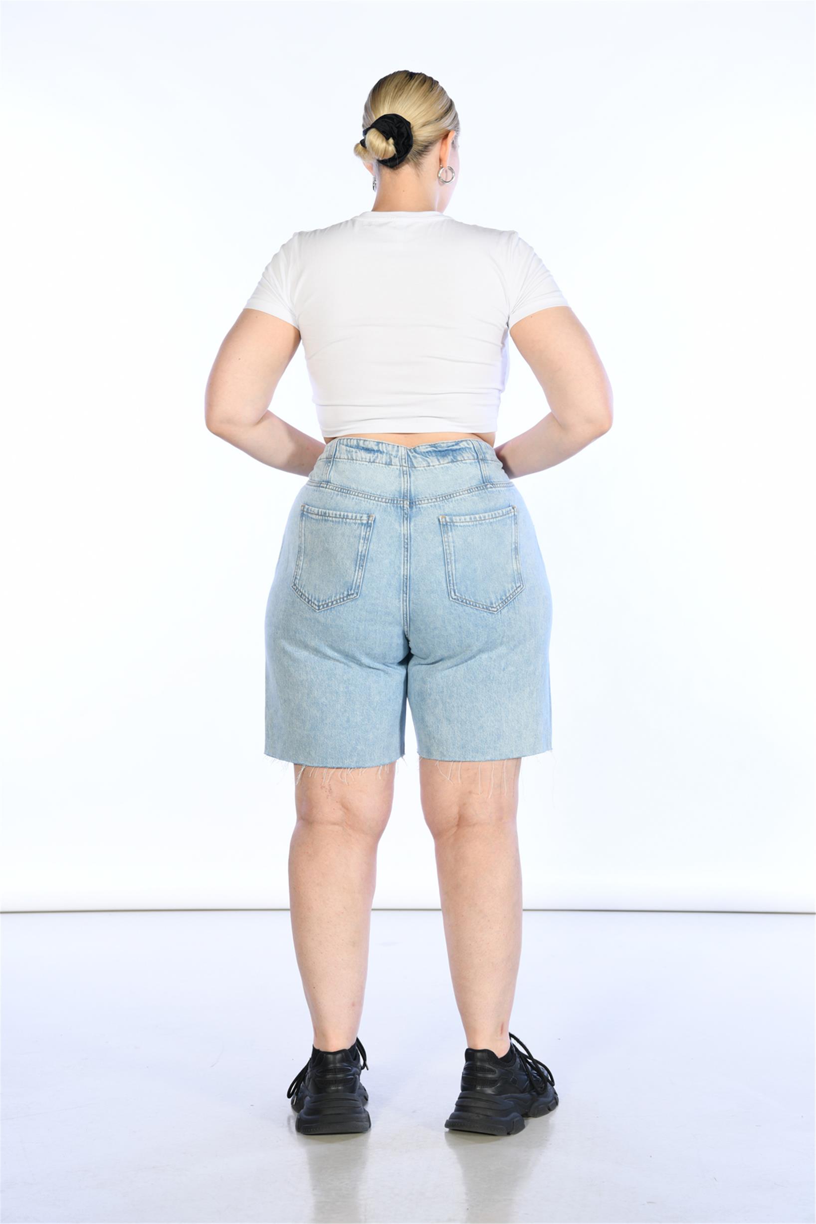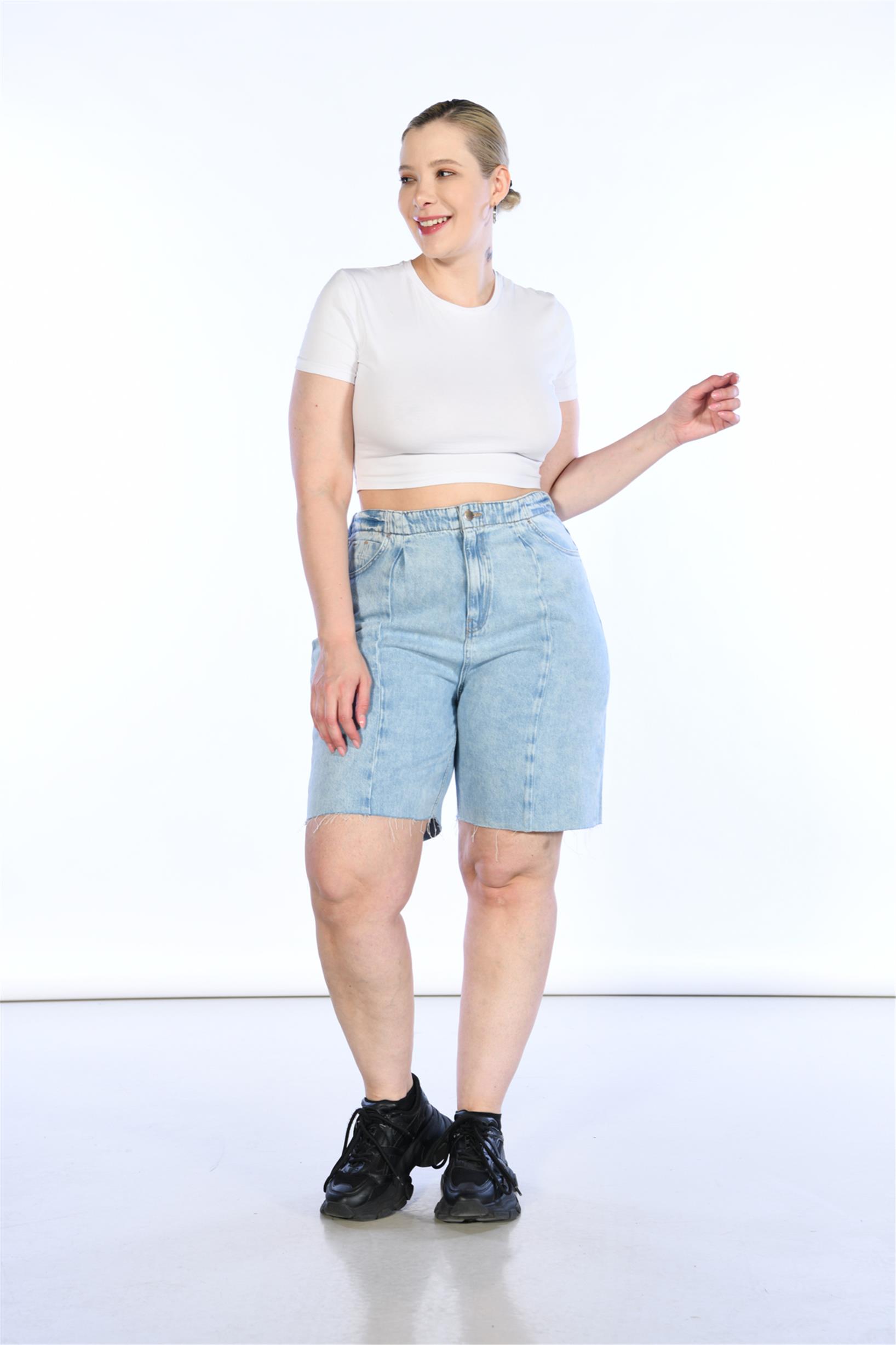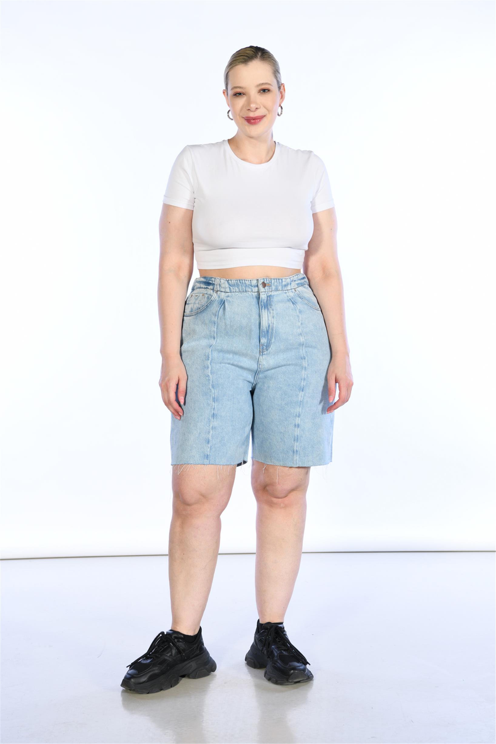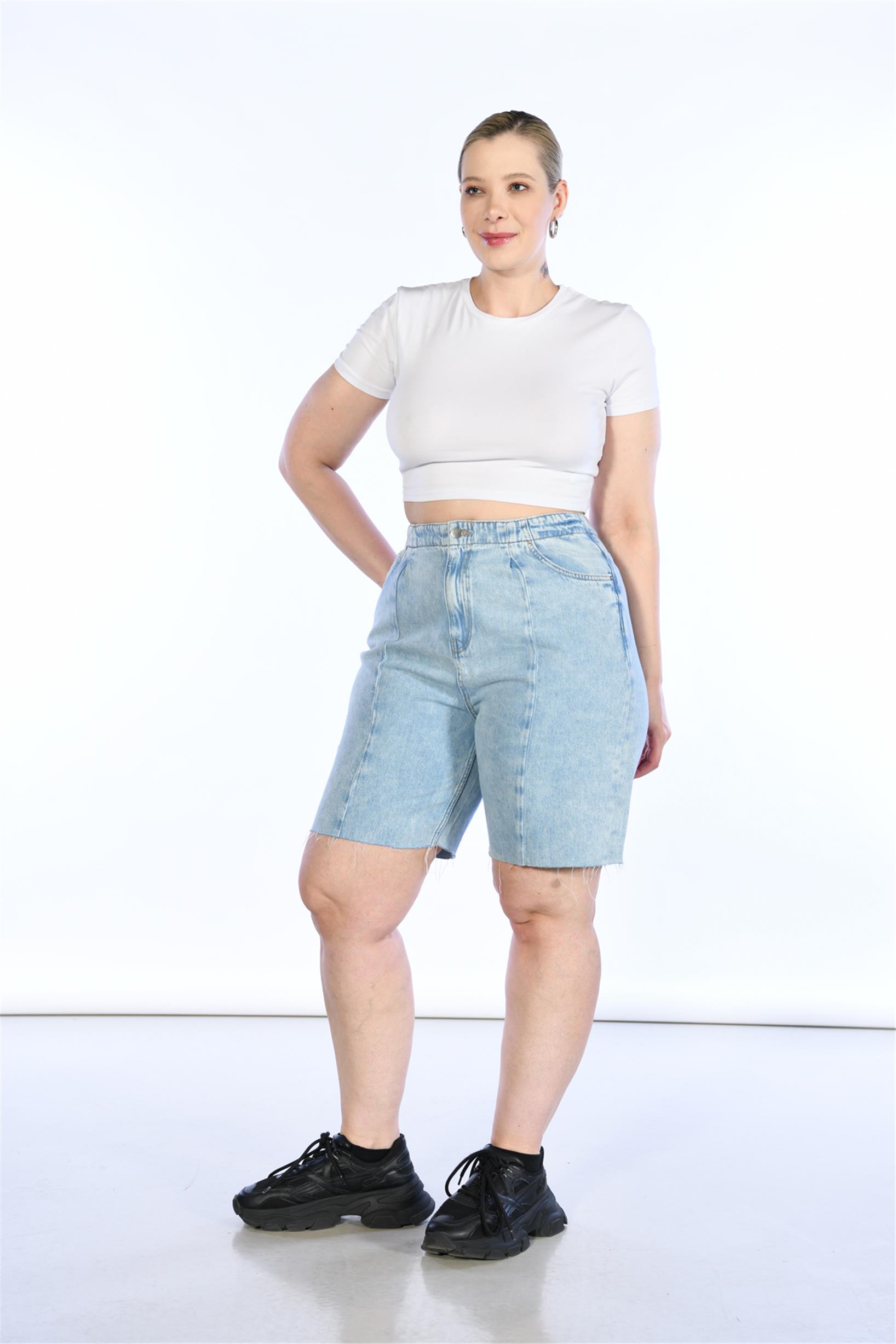 Büyük Beden Açık Mavi Yüksek Bel Ön Dikiş Detaylı Bermuda Kot Şort