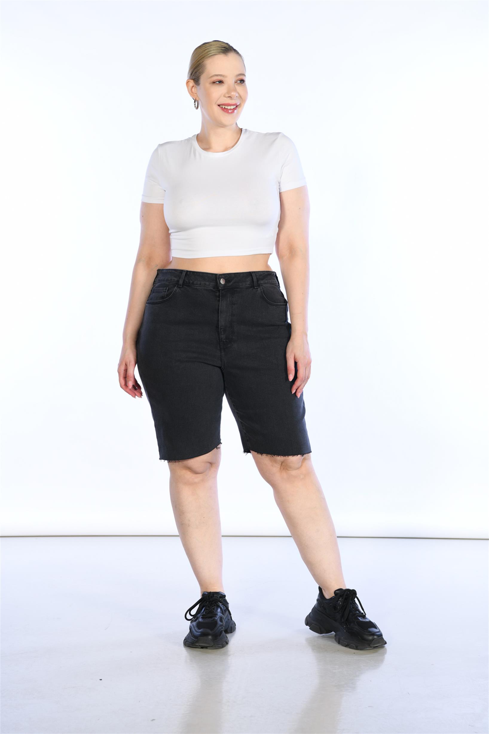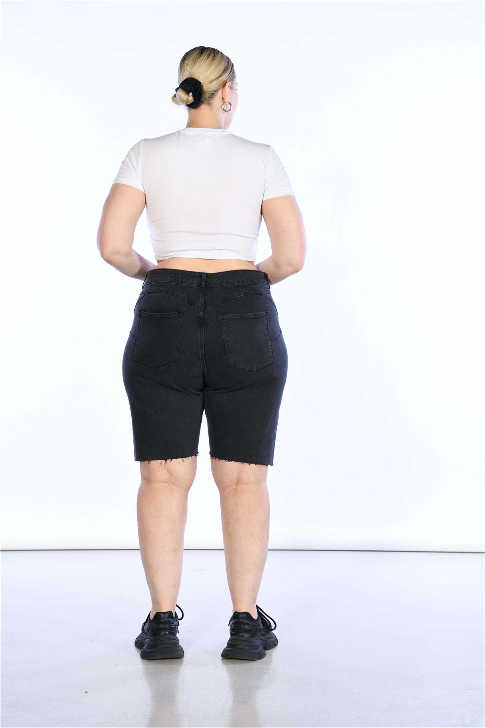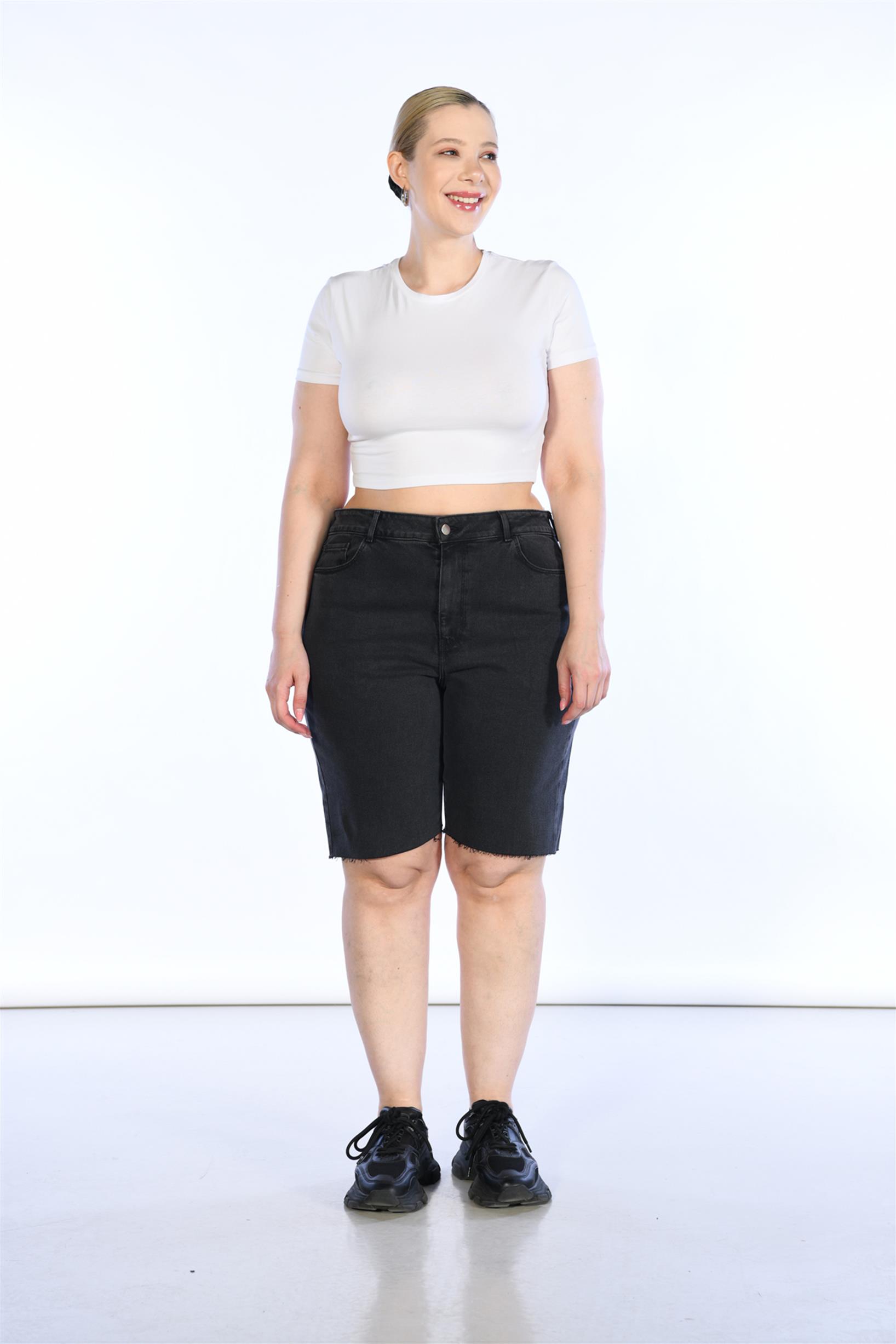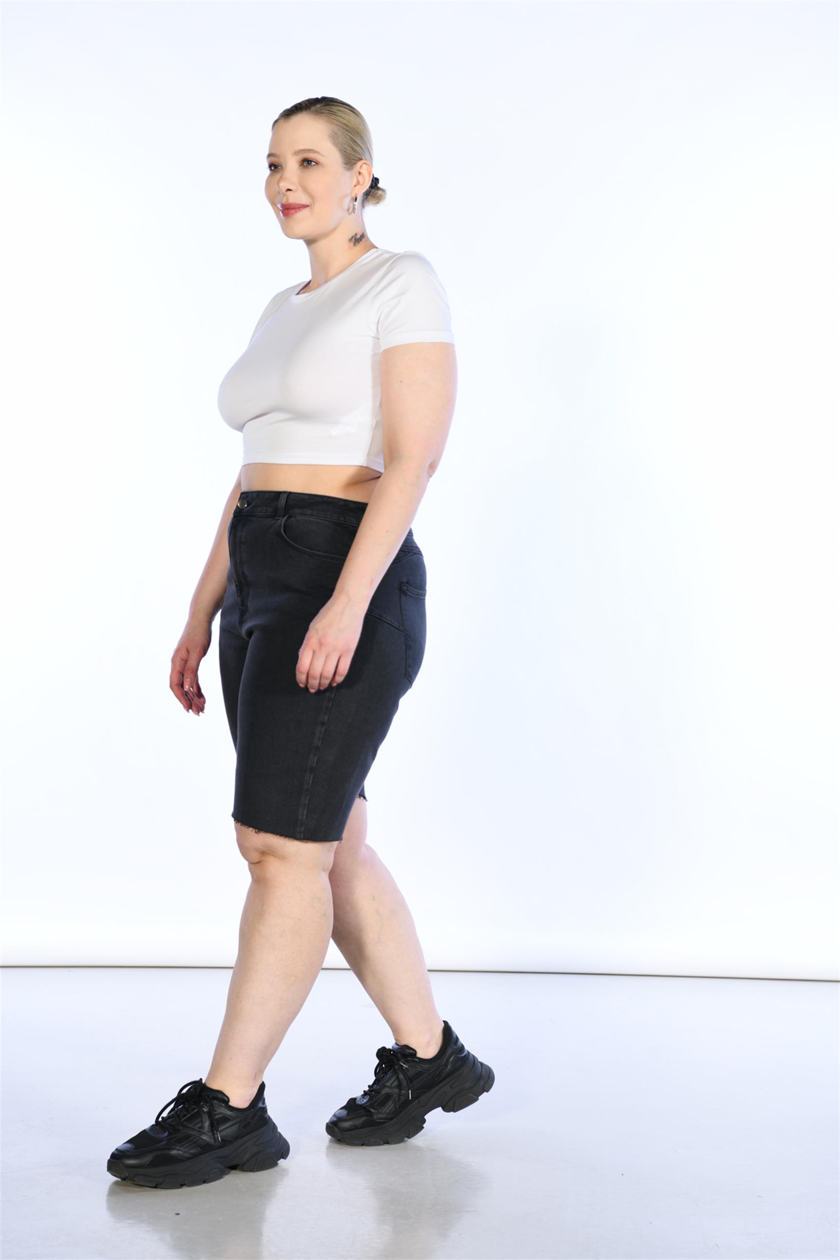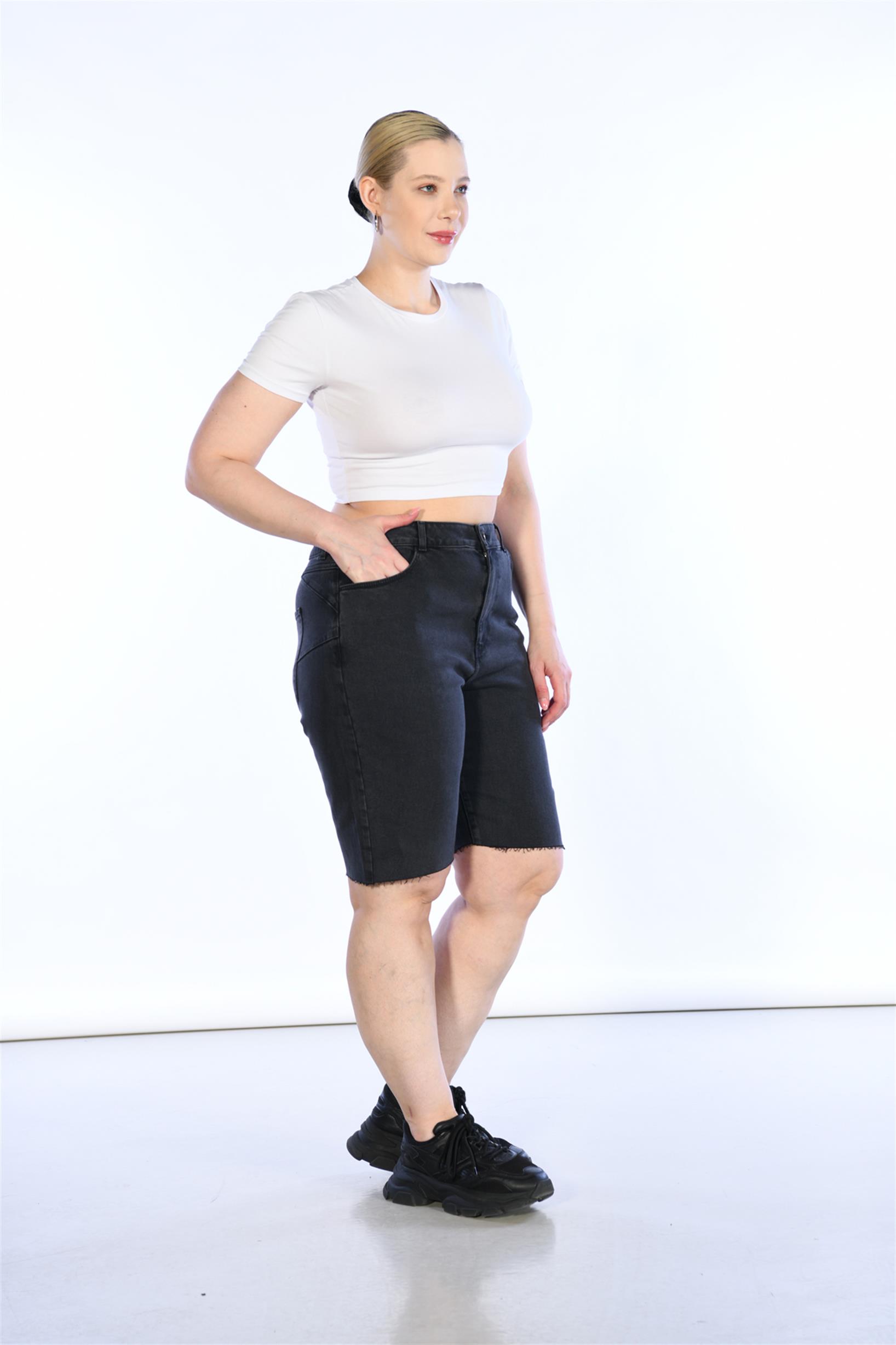 Büyük Beden Antrasit Yüksek Bel Bermuda Kot Şort