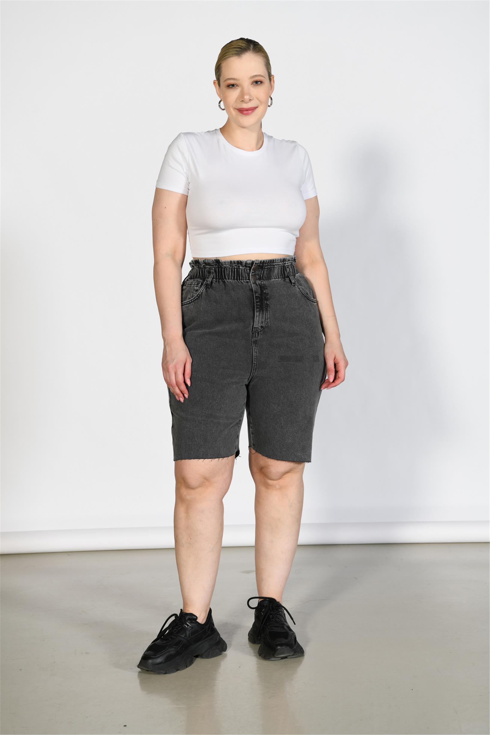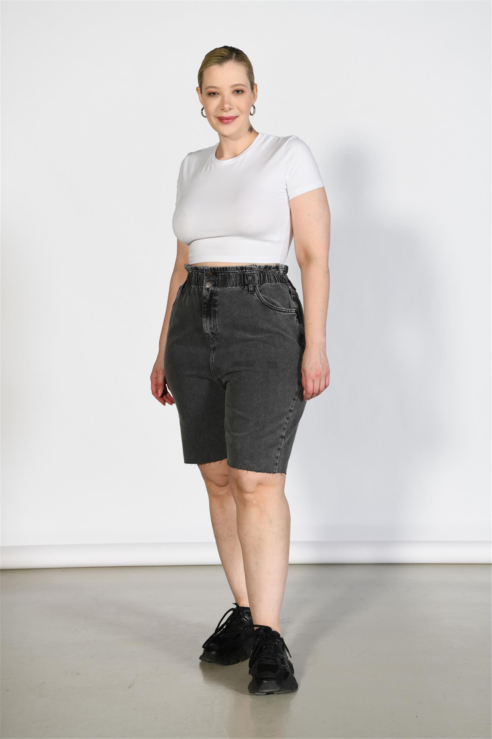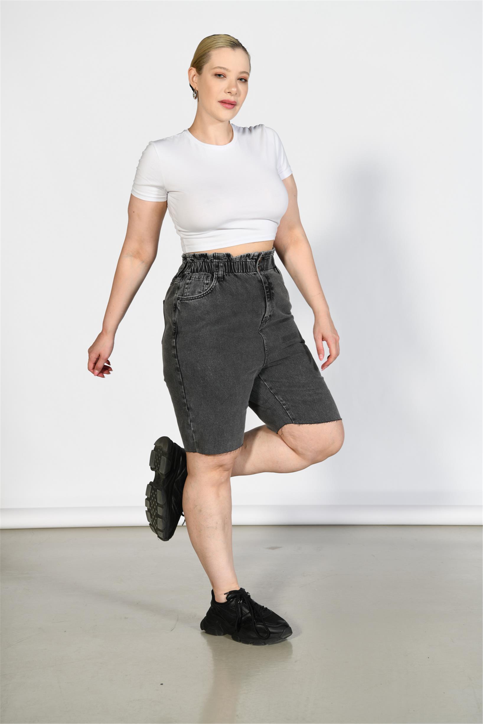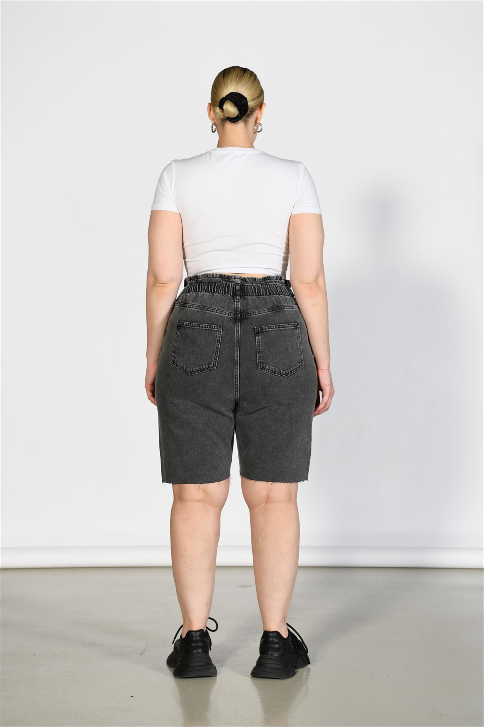 Büyük Beden Antrasit Yüksek Bel Paper Bag Bermuda Kot Şort