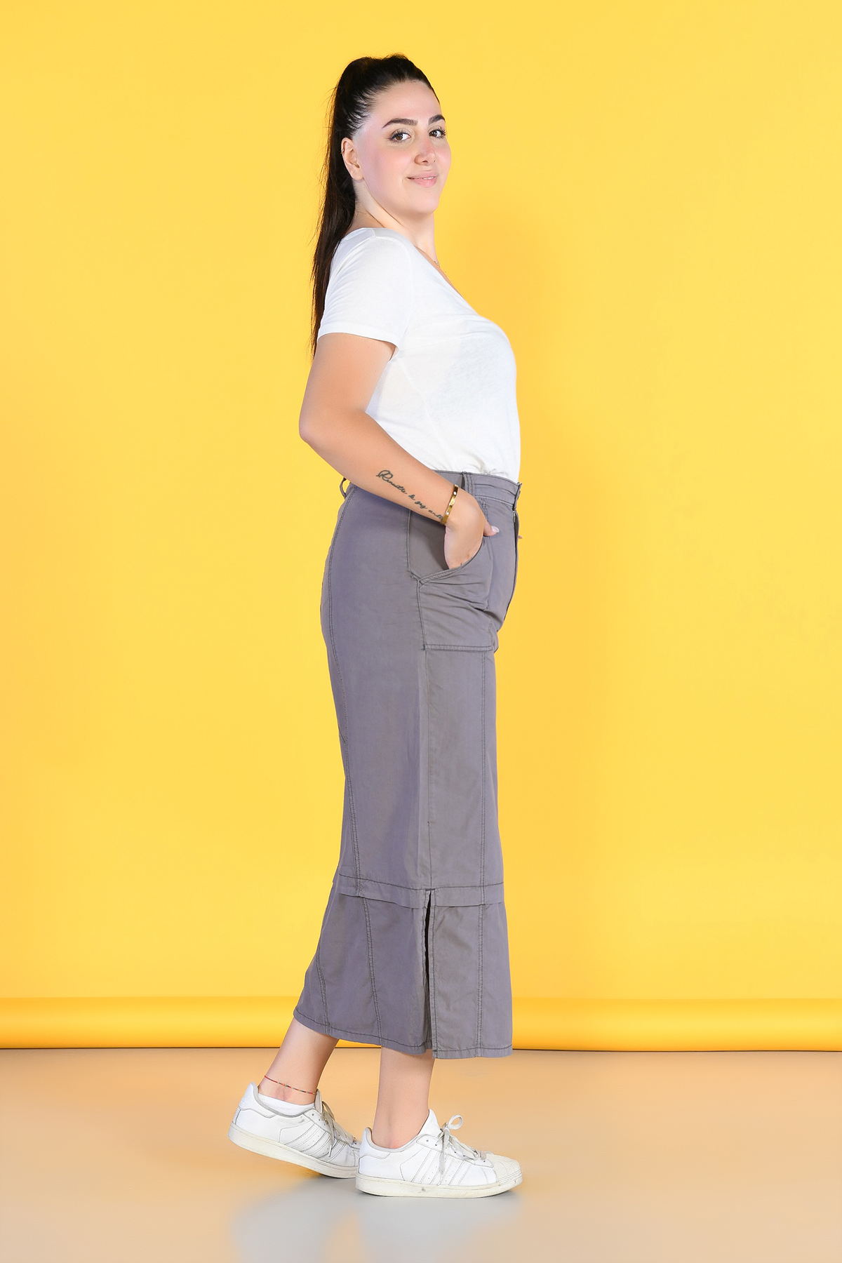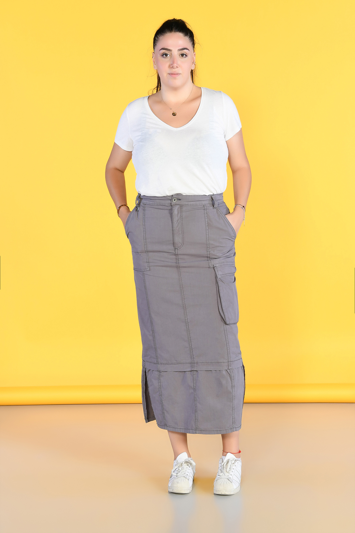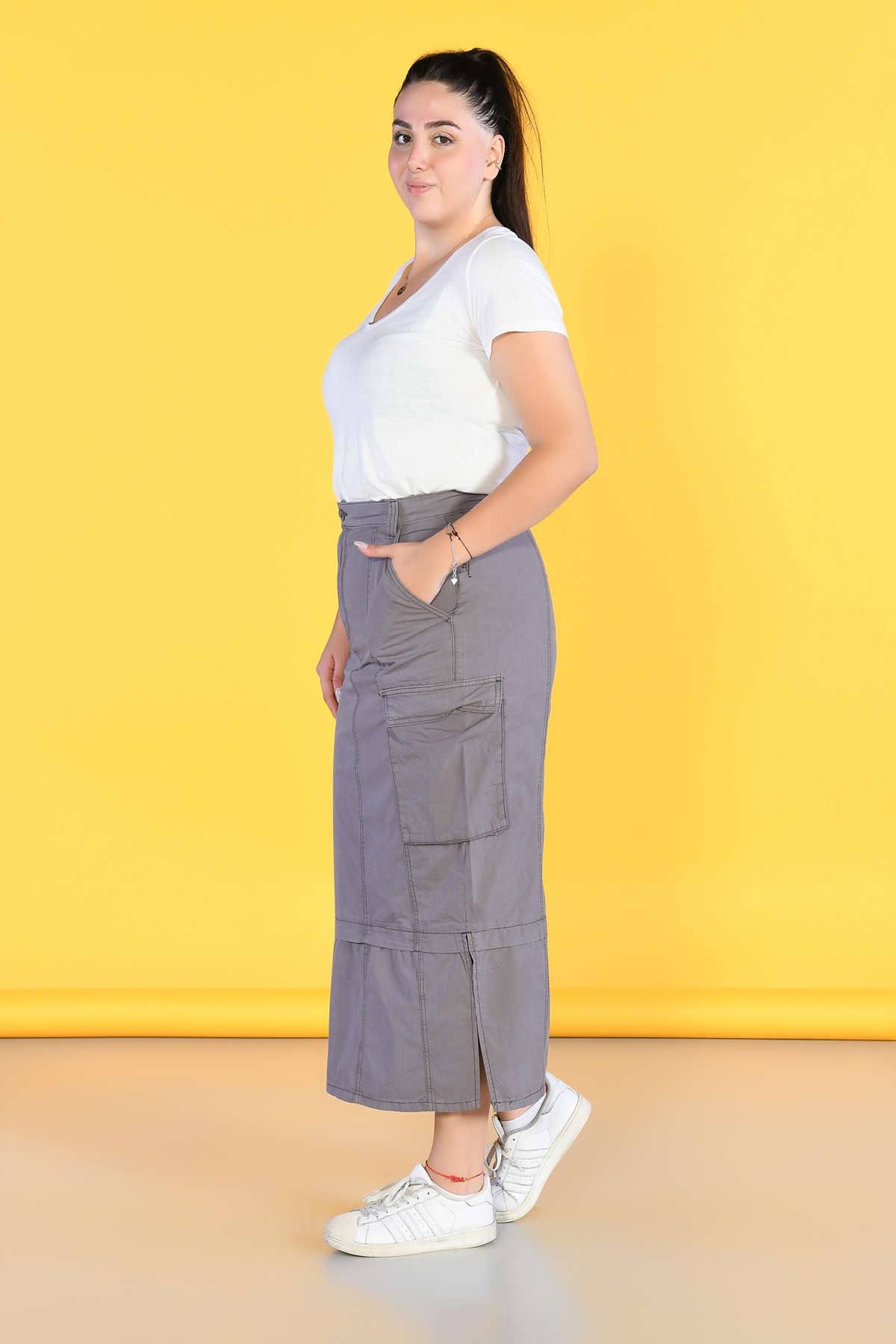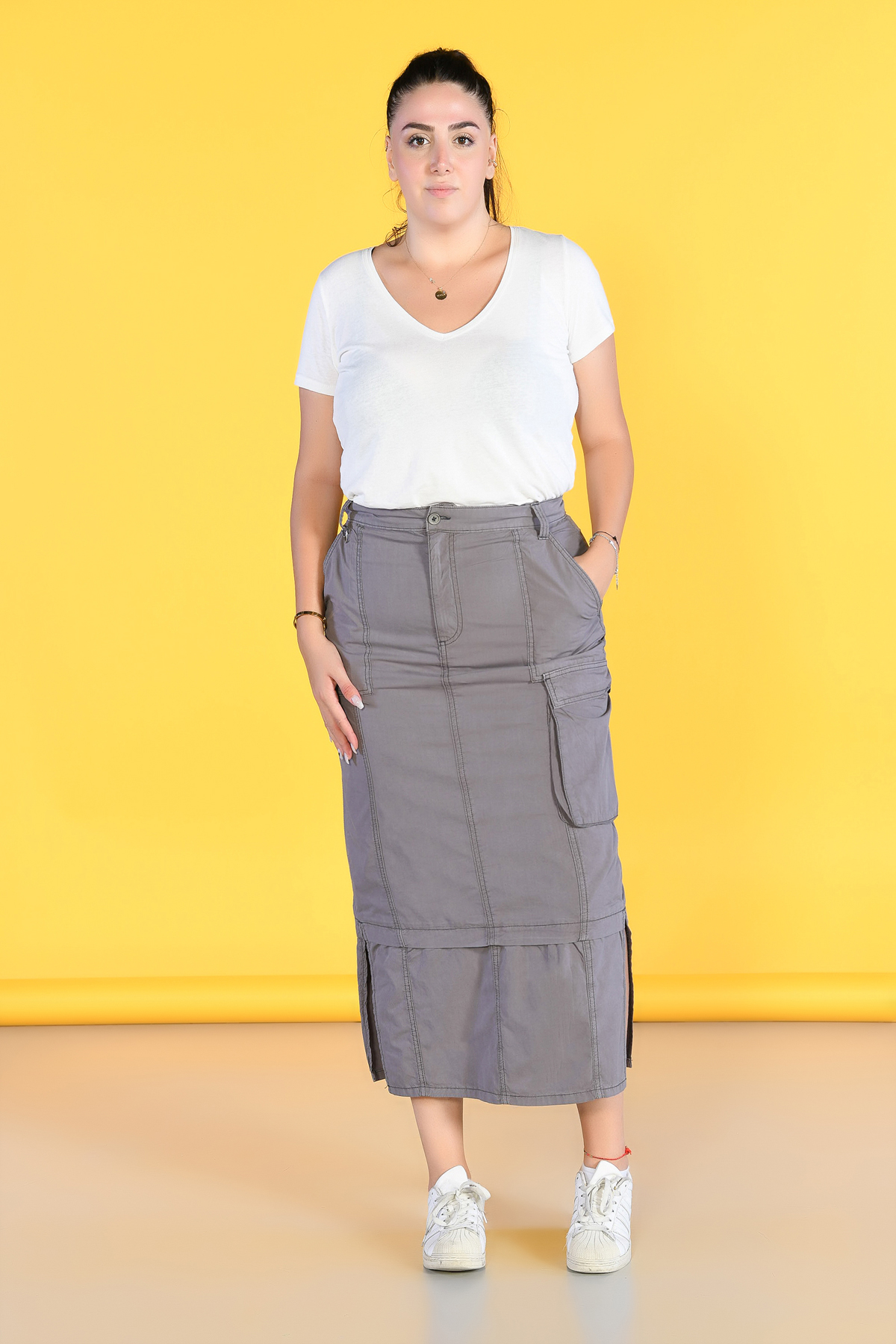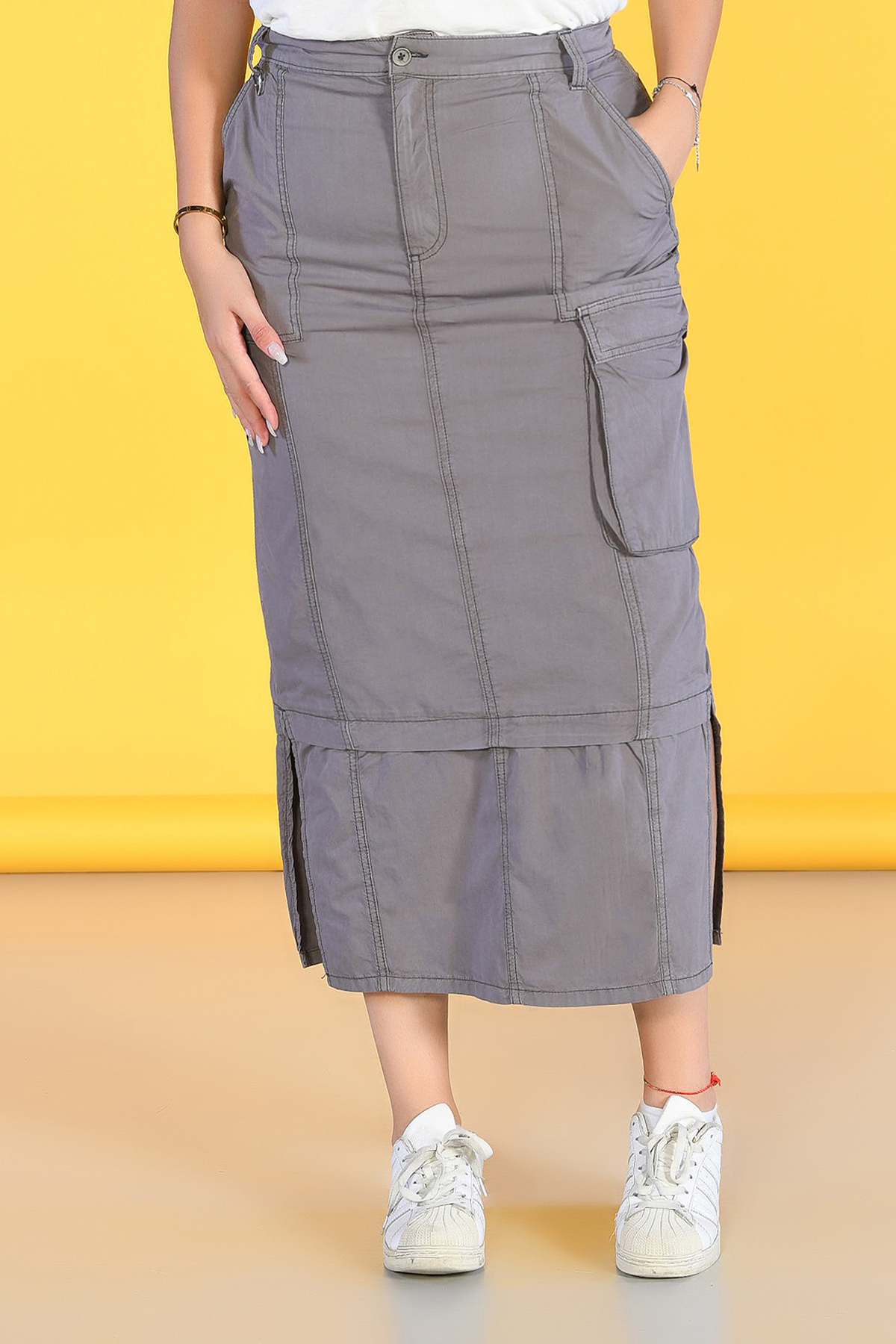 Büyük Beden Kahverengi Yırtmaçlı Kargo Etek