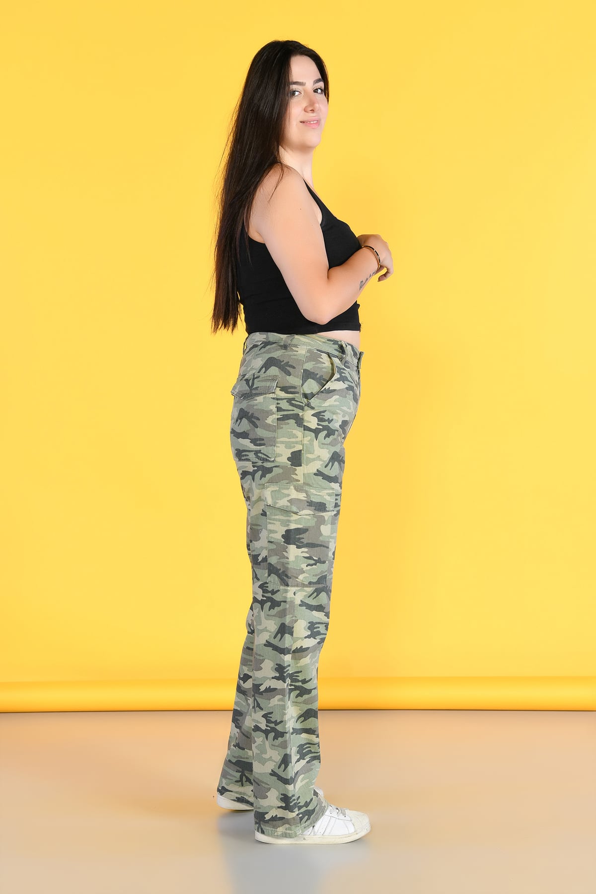 Büyük Beden Kamuflaj Desen Yüksek Bel Wide Leg Kargo Pantolon