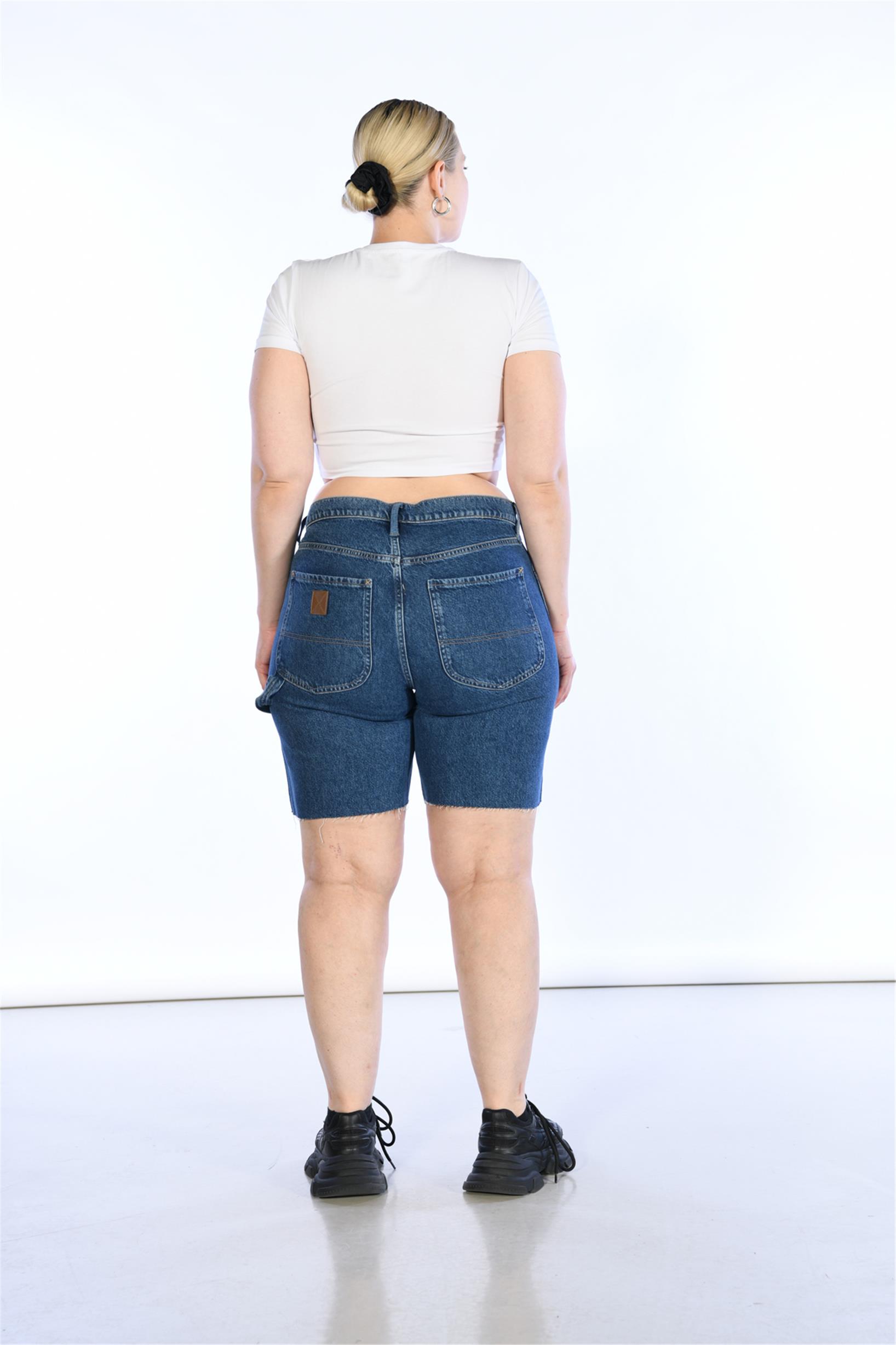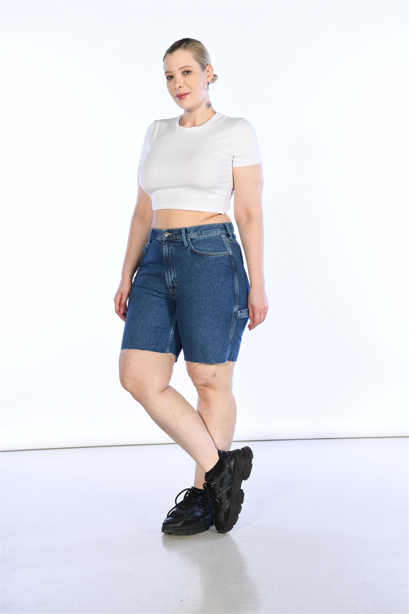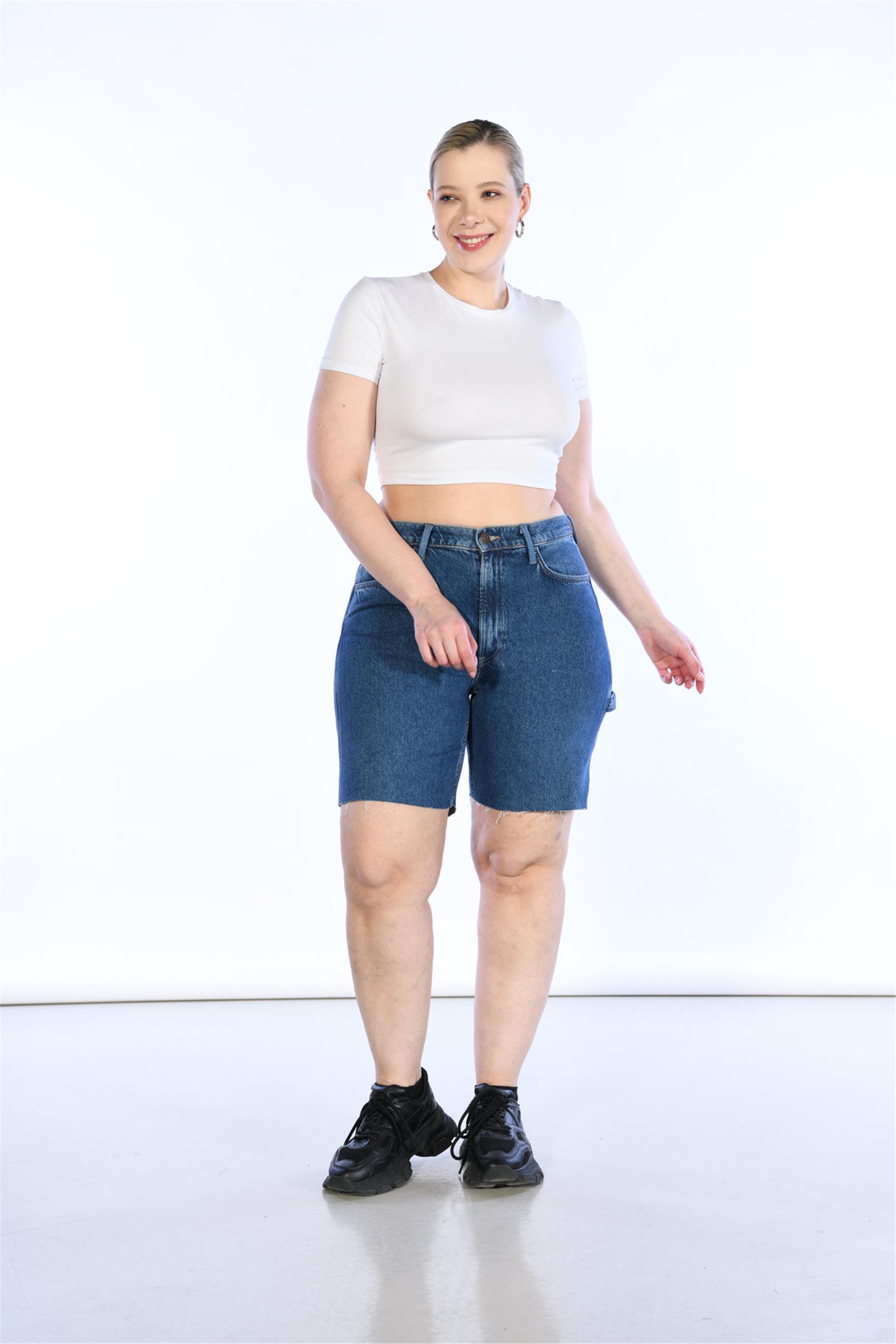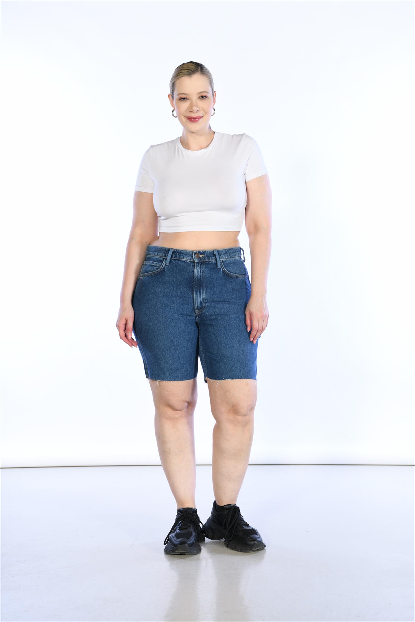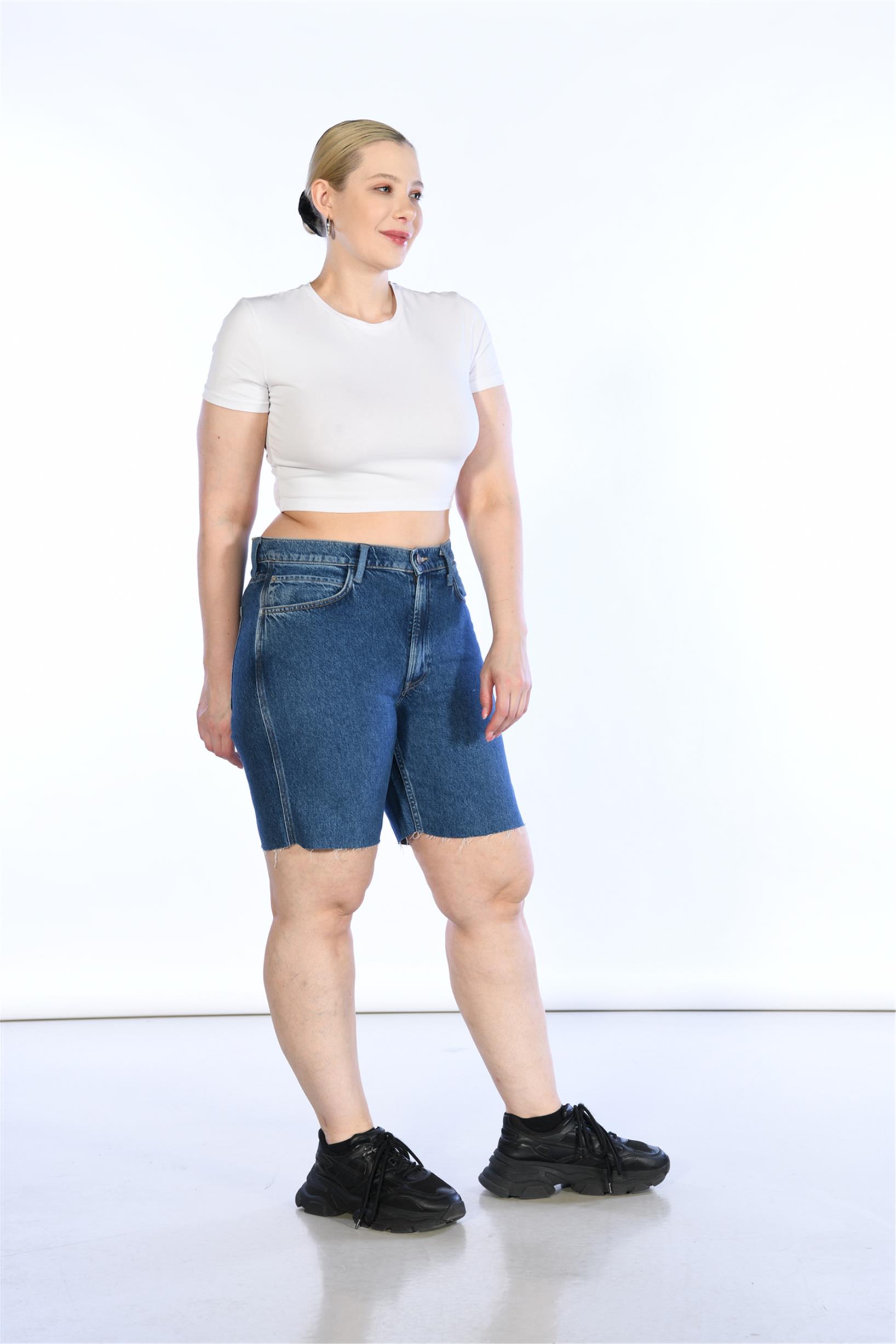 Büyük Beden Koyu Mavi Yüksek Bel Bermuda Kot Şort