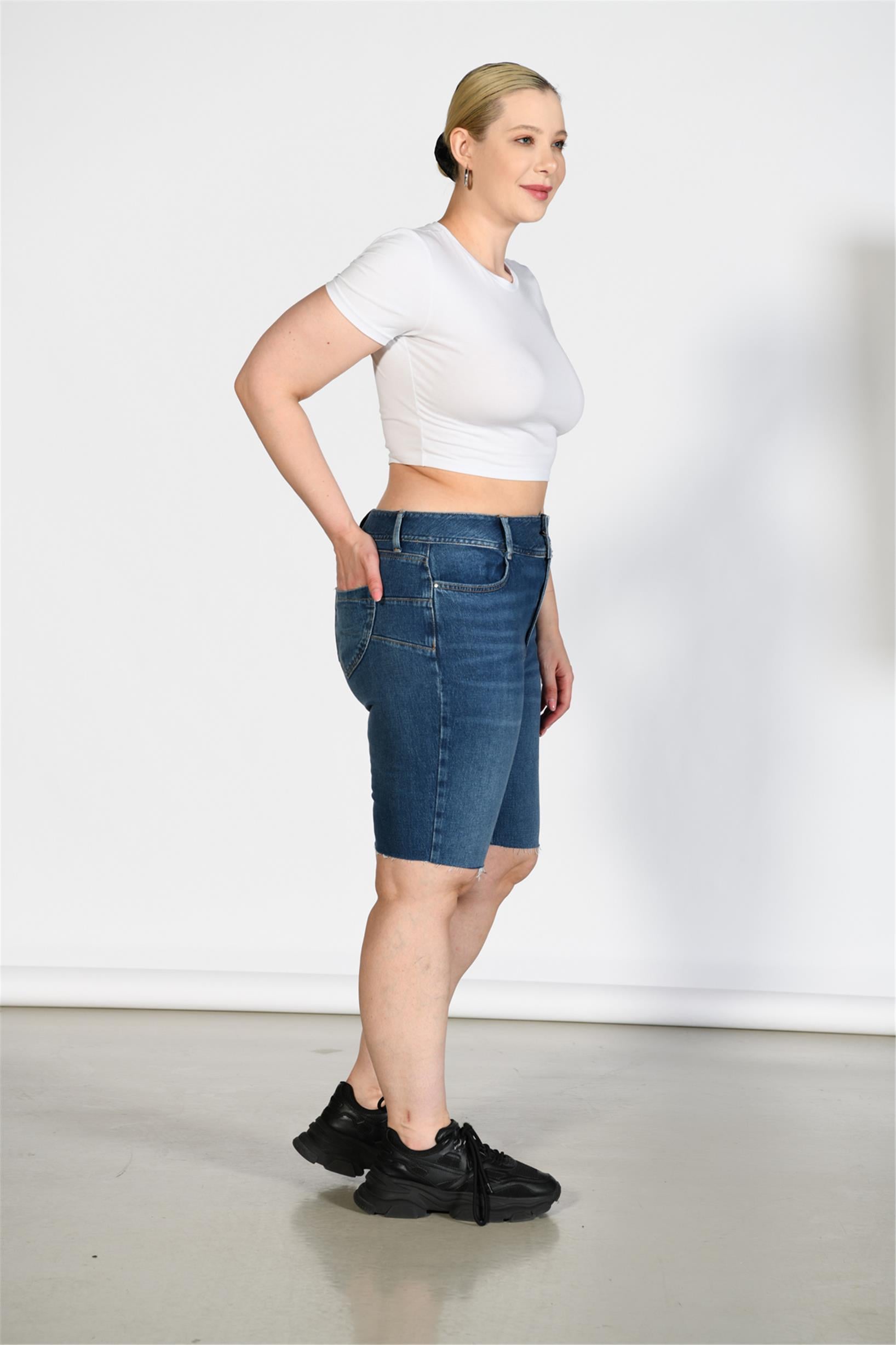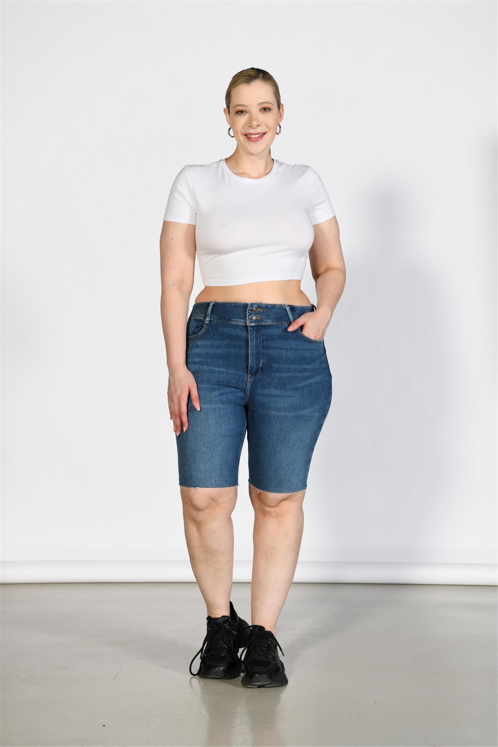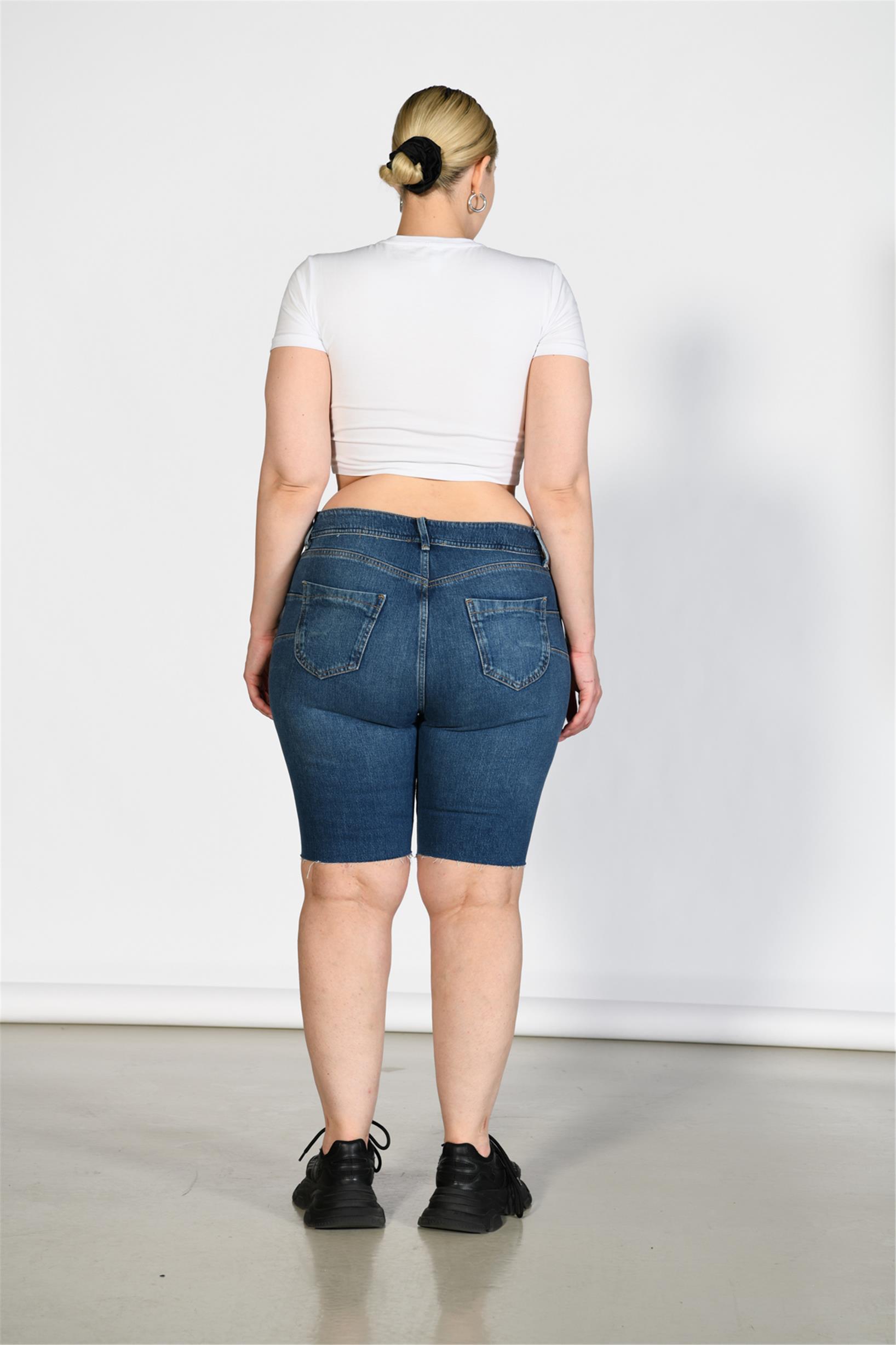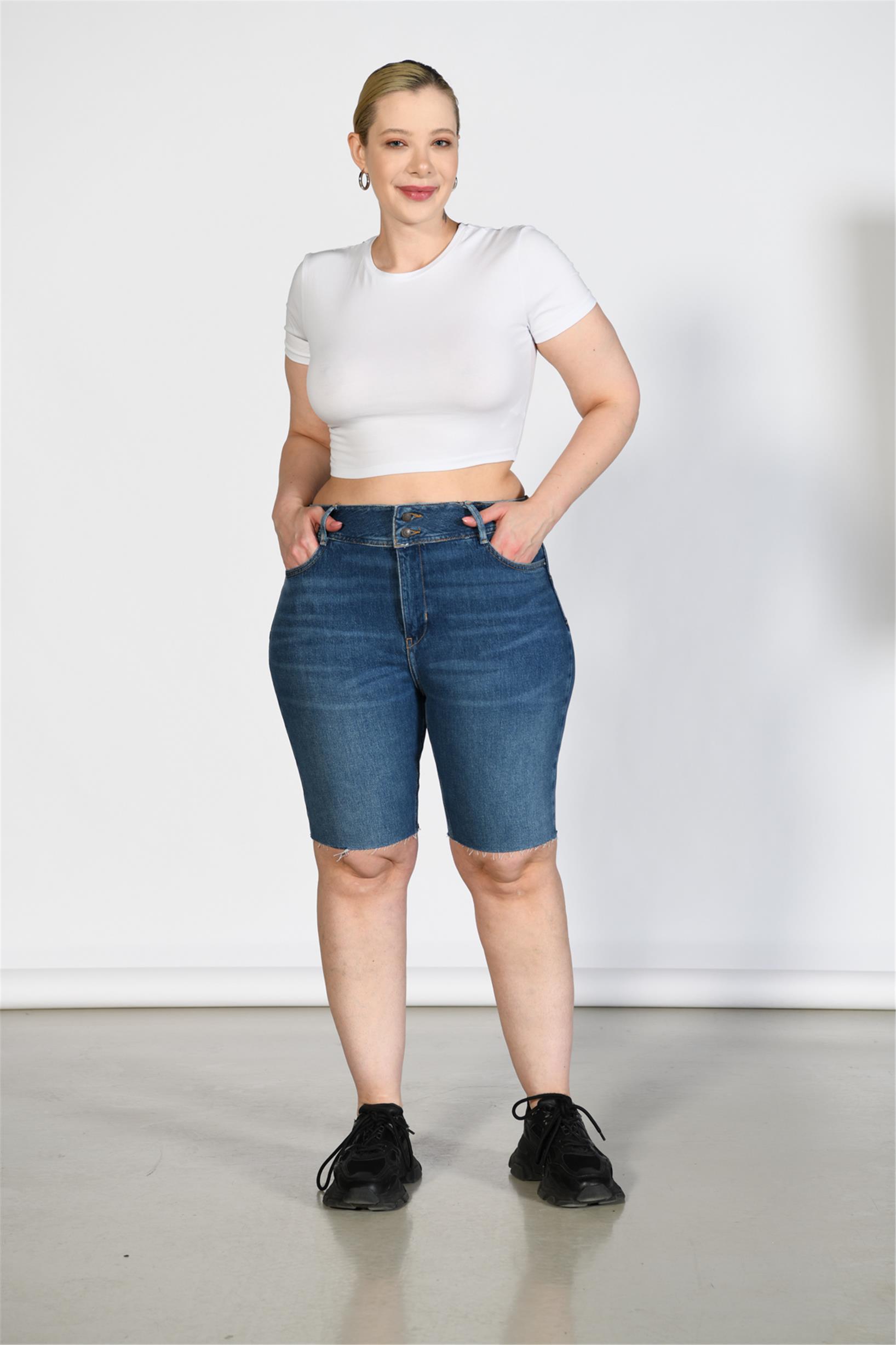 Büyük Beden Koyu Mavi Yüksek Bel Bermuda Şort