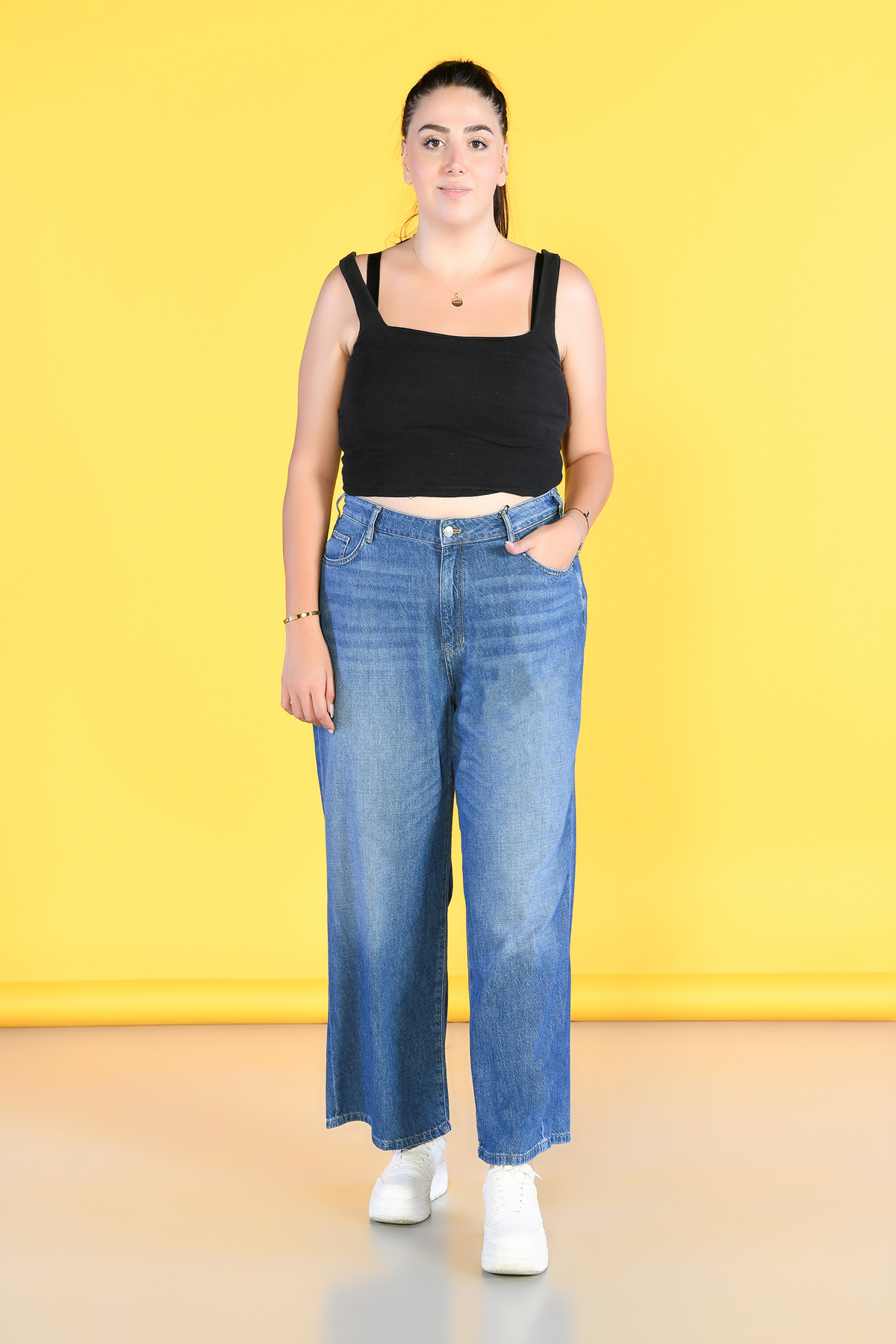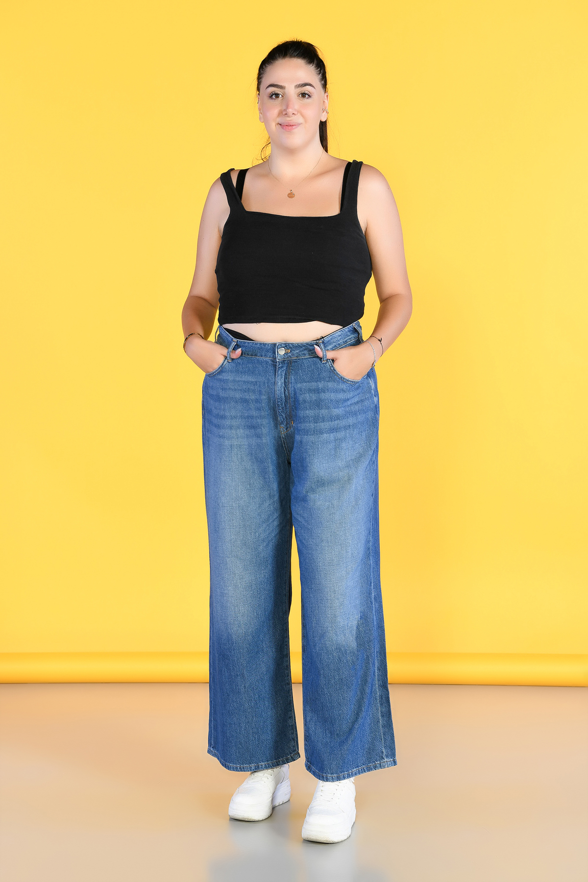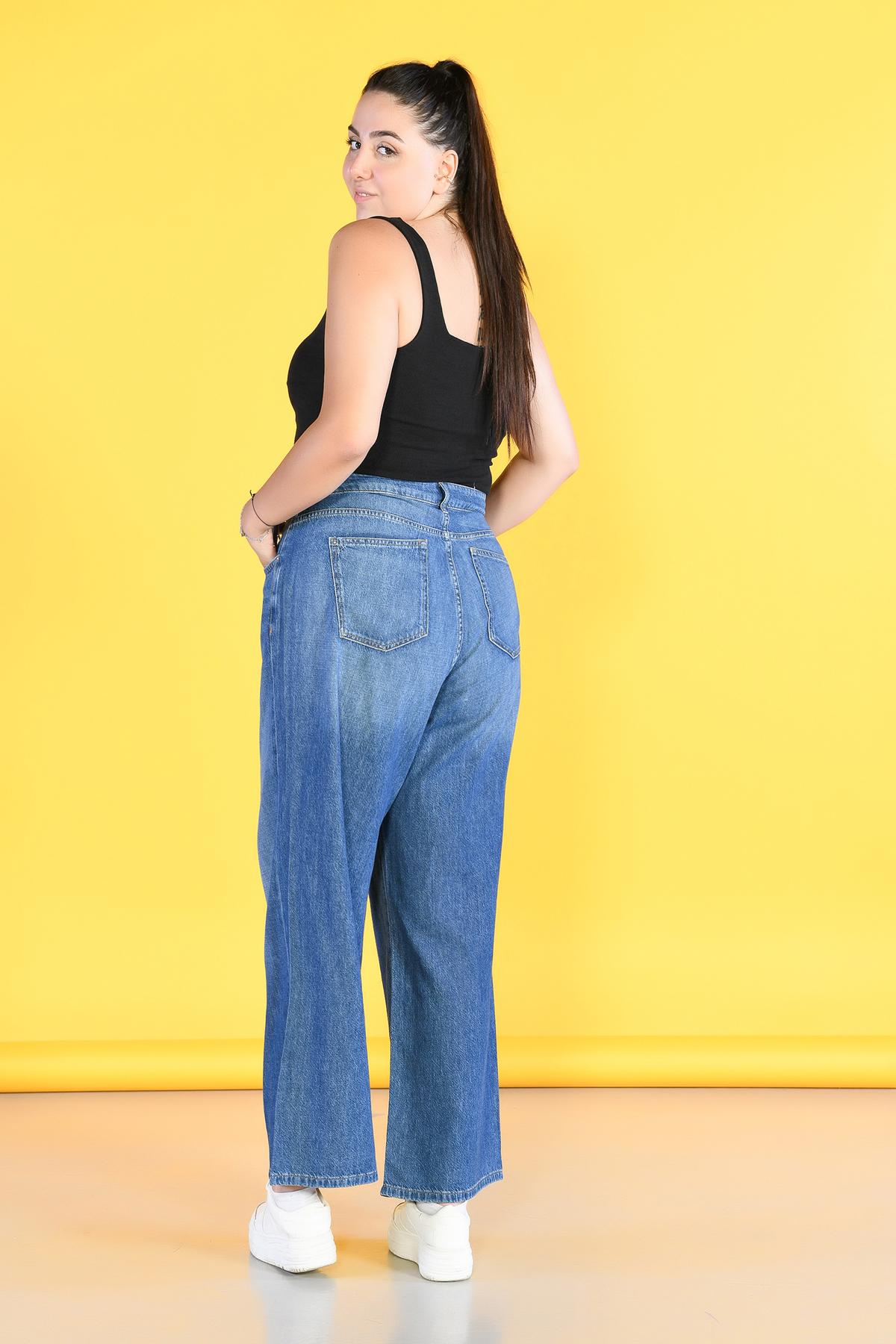 Büyük Beden Koyu Mavi Yüksek Bel Palazzo Jeans