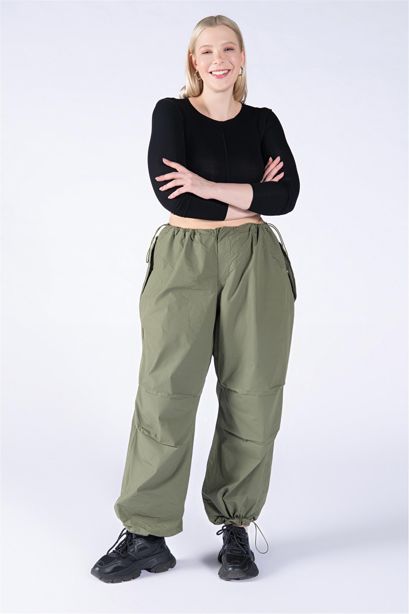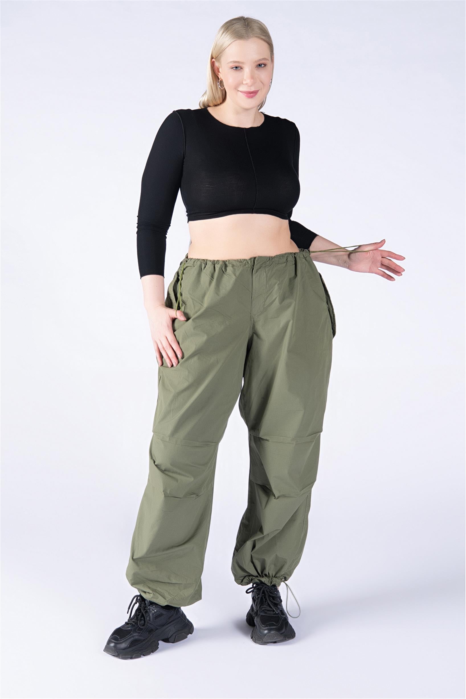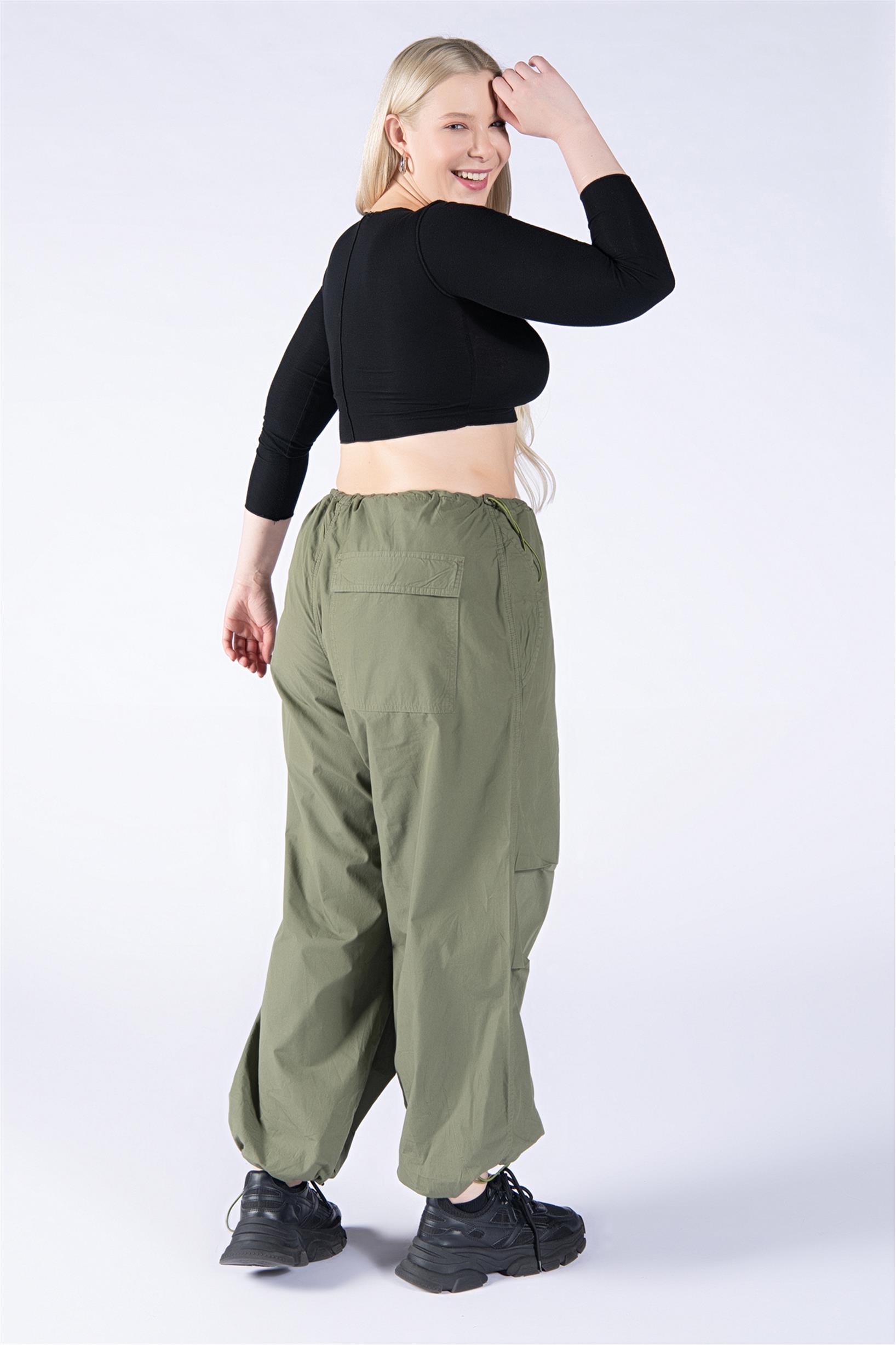 Büyük Beden Koyu Yeşil Stoperli Kargo Paraşüt Pantolon