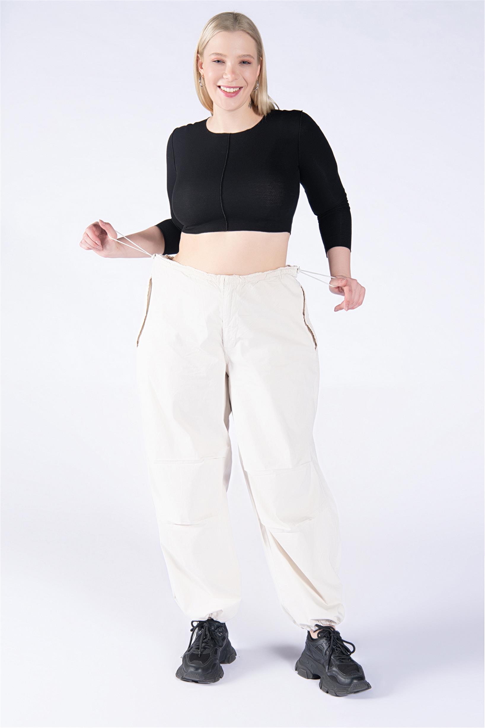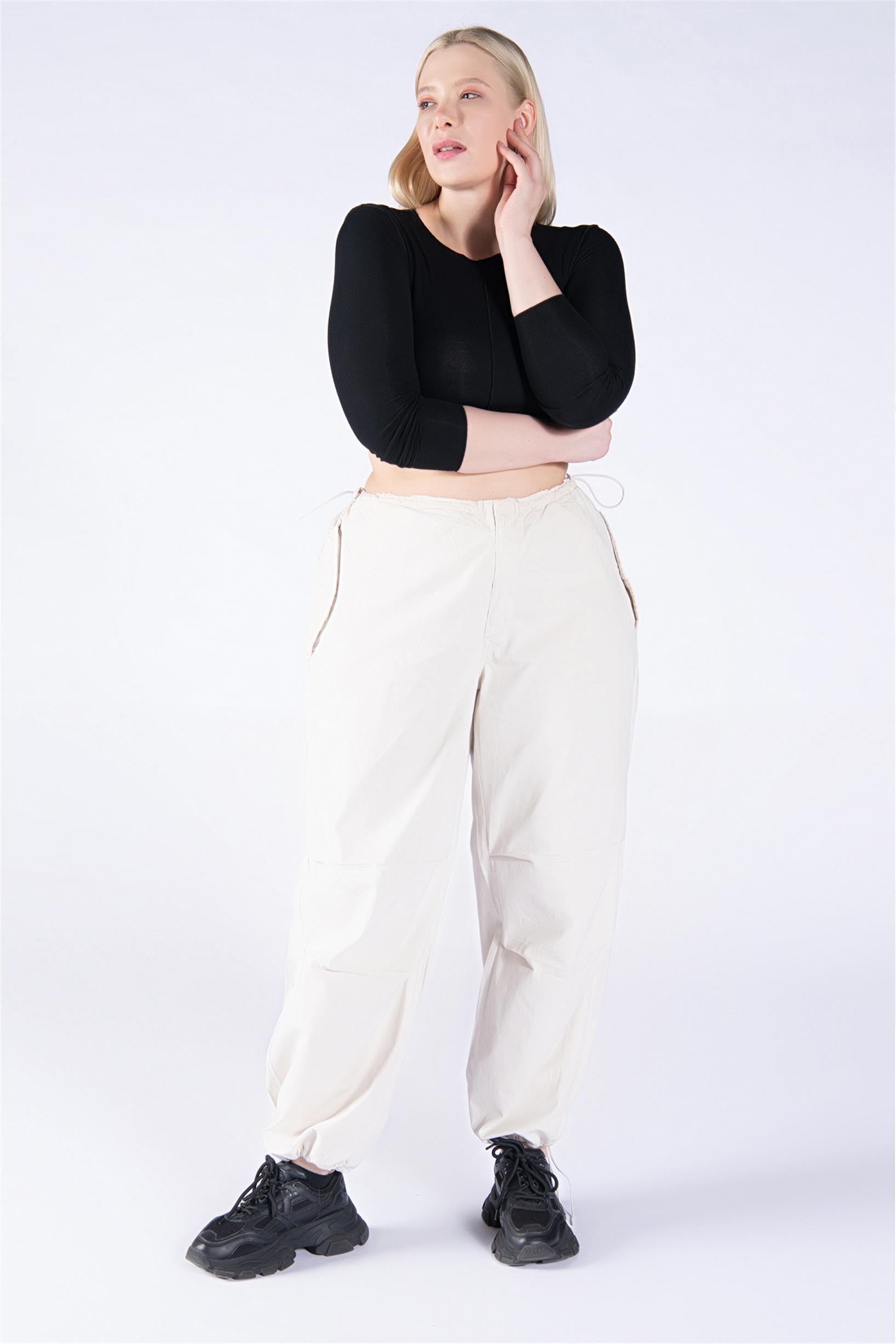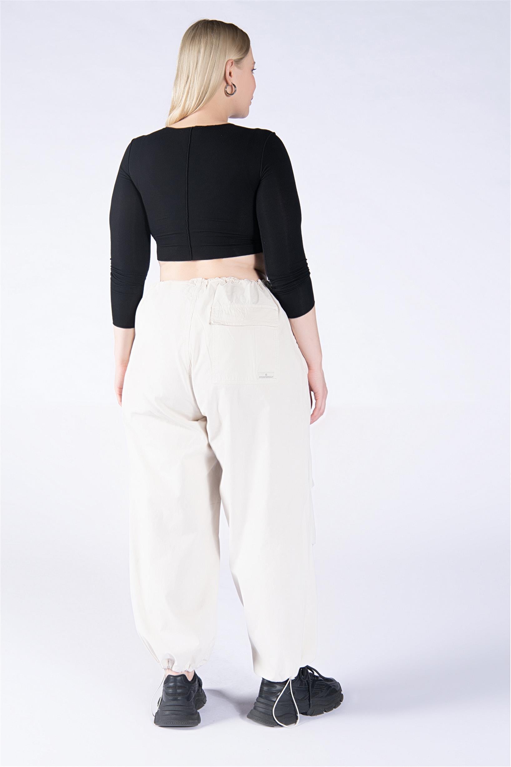 Büyük Beden Krem Stoperli Kargo Paraşüt Pantolon