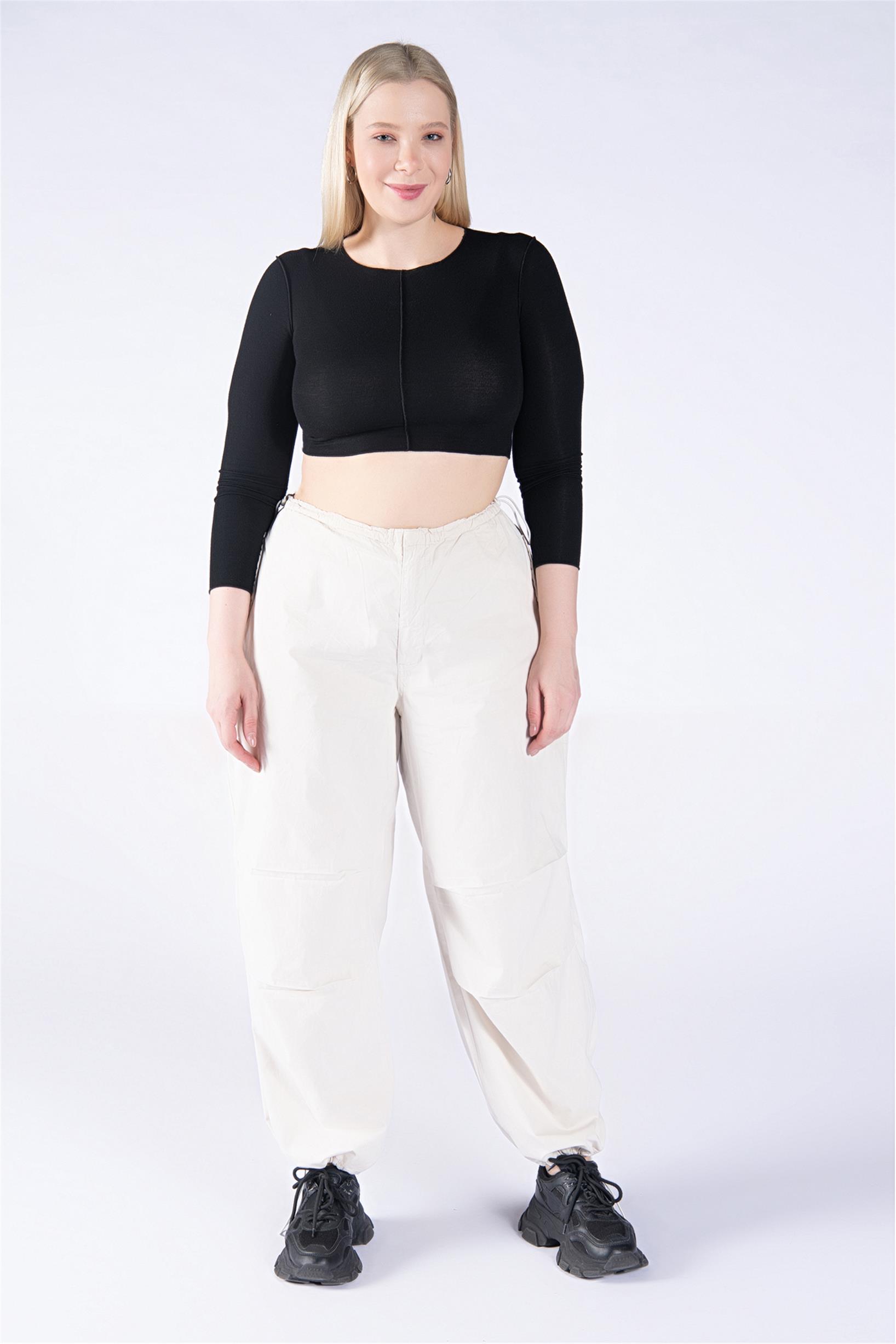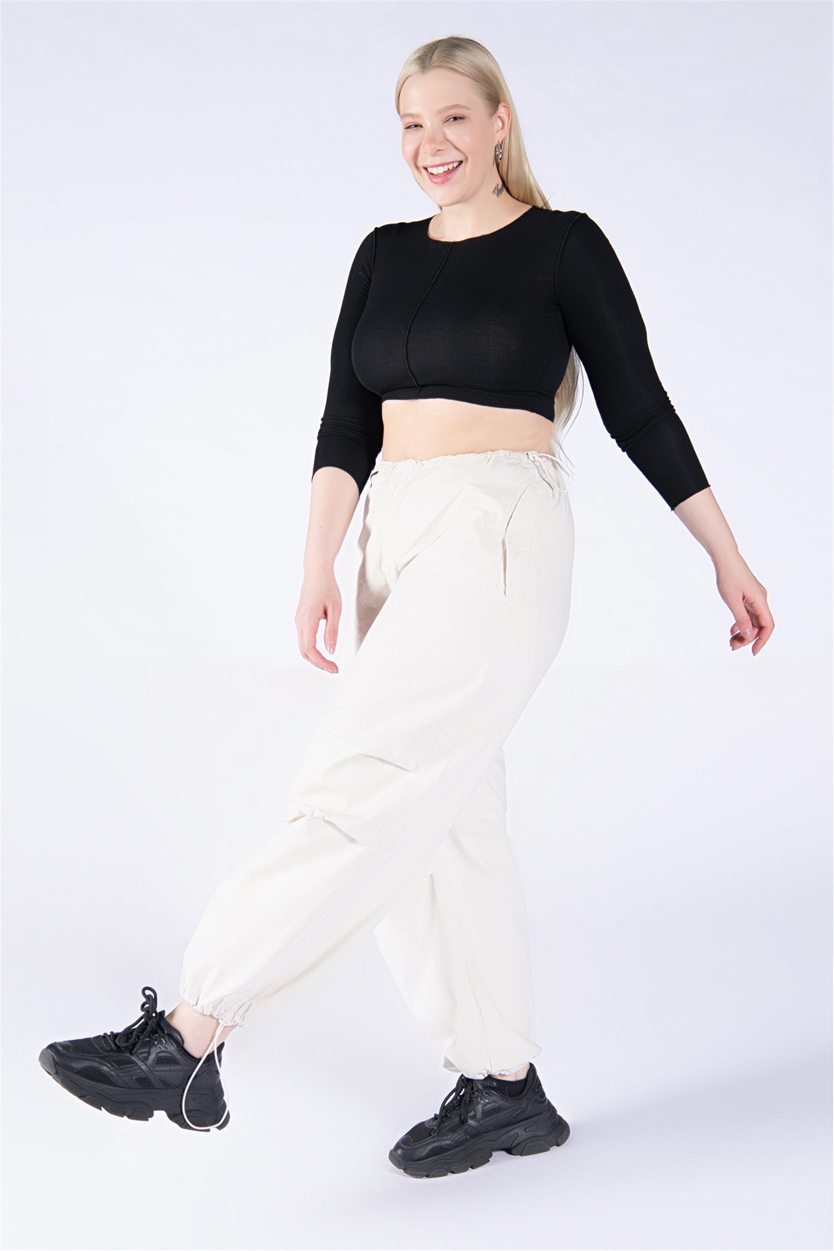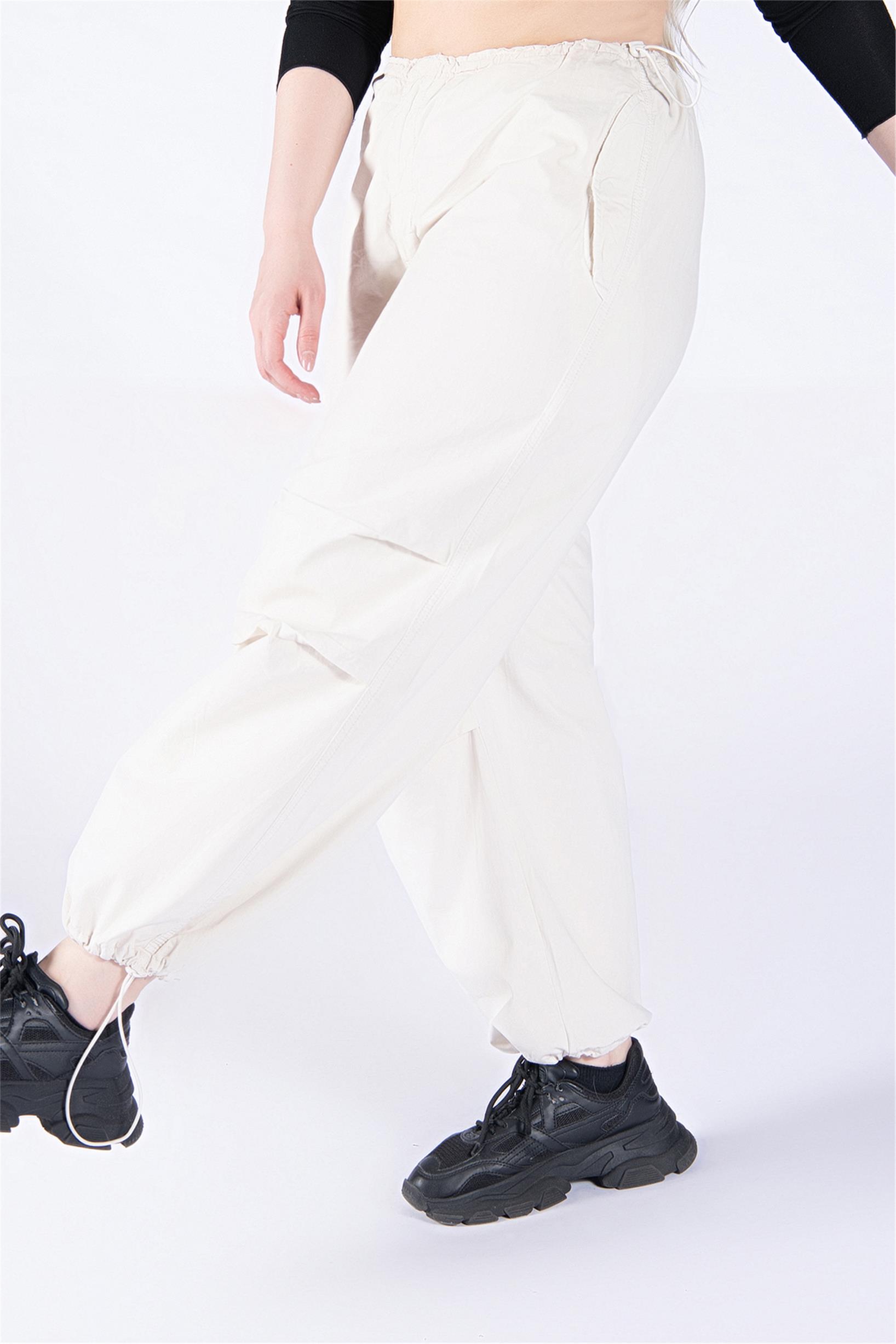 Büyük Beden Krem Stoperli Kargo Paraşüt Pantolon