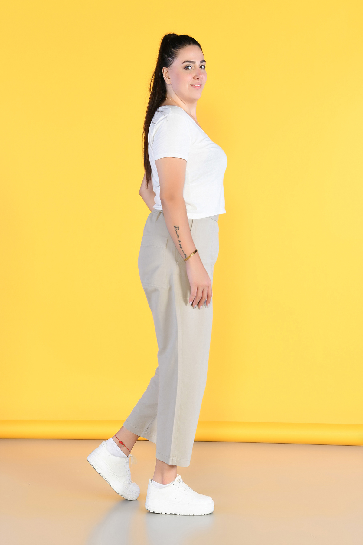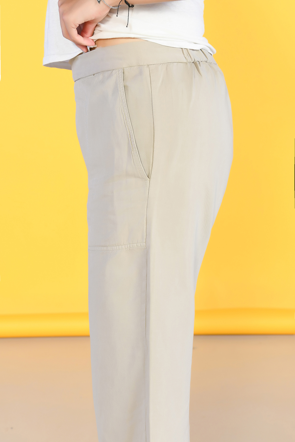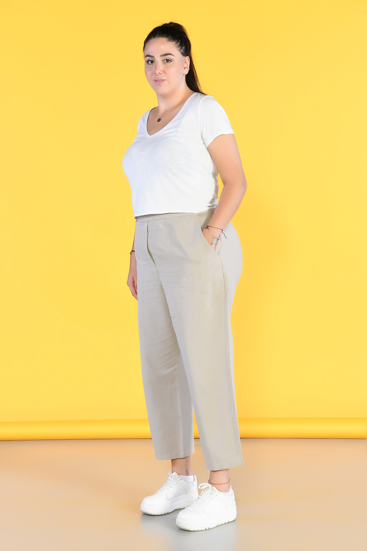 Büyük Beden Krem Yüksek Bel Cep Detaylı Kumaş Pantolon