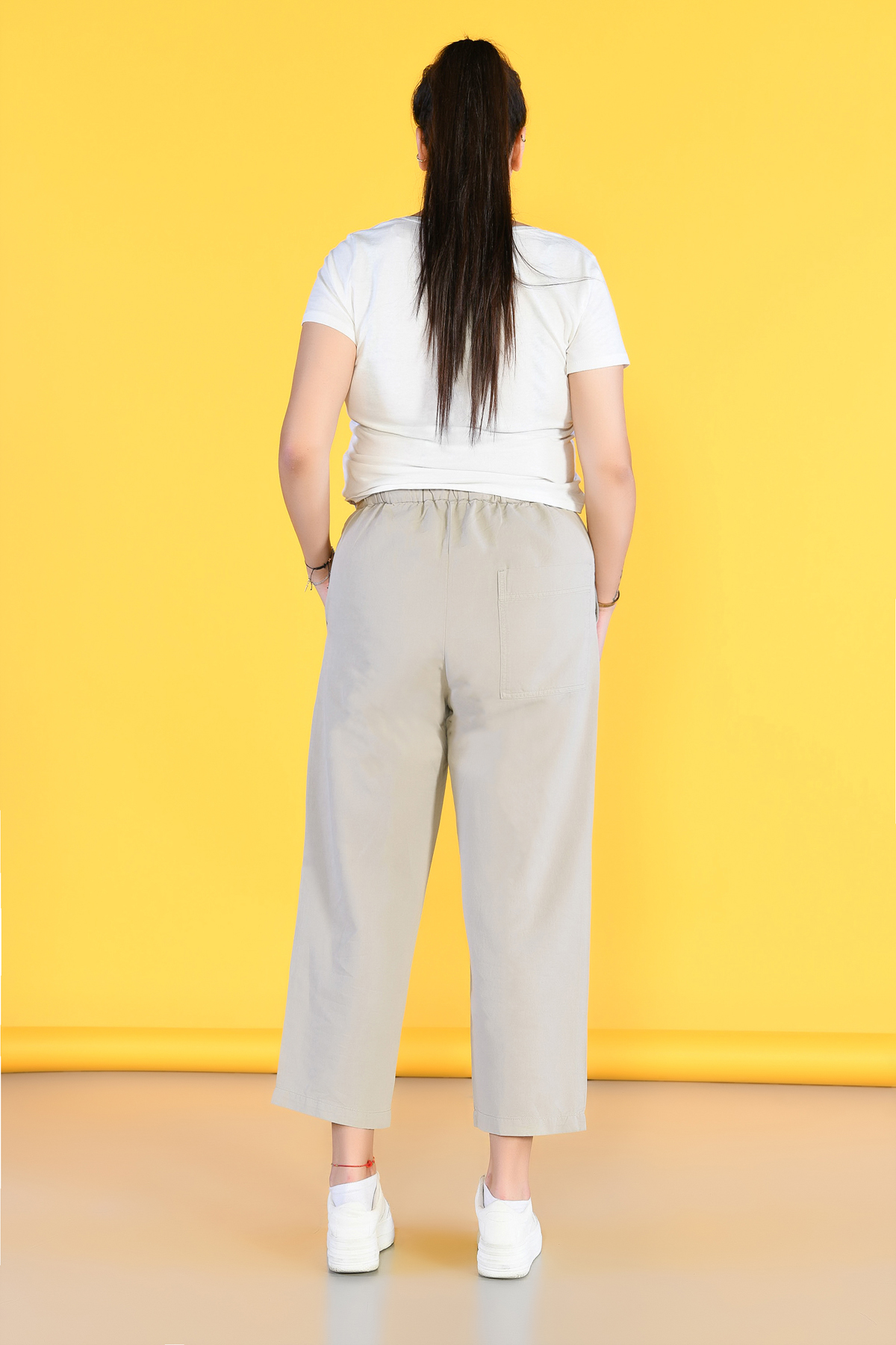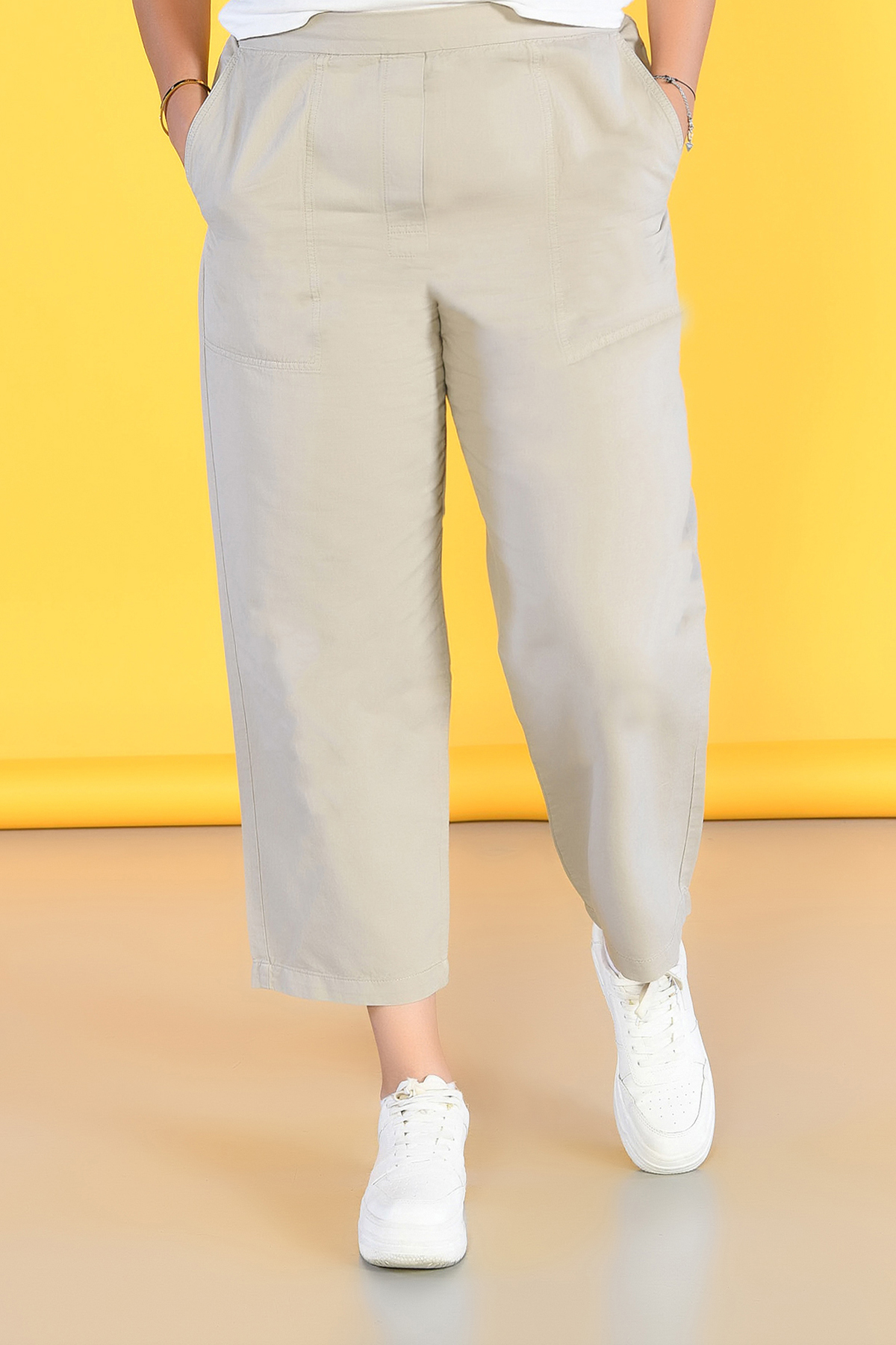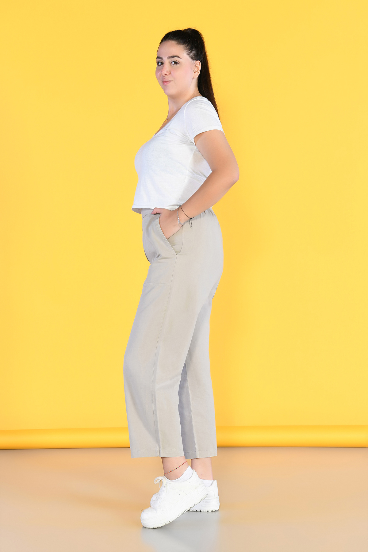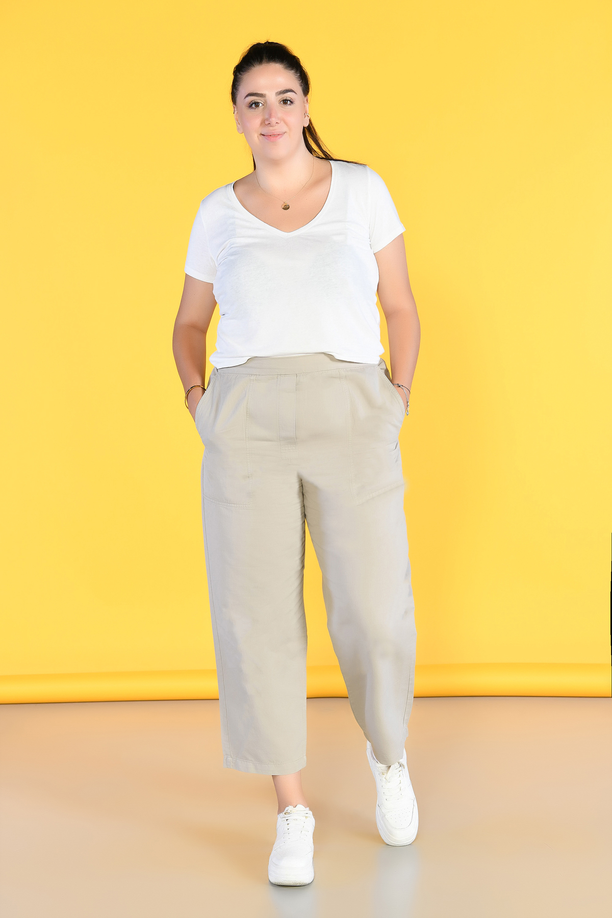 Büyük Beden Krem Yüksek Bel Cep Detaylı Kumaş Pantolon