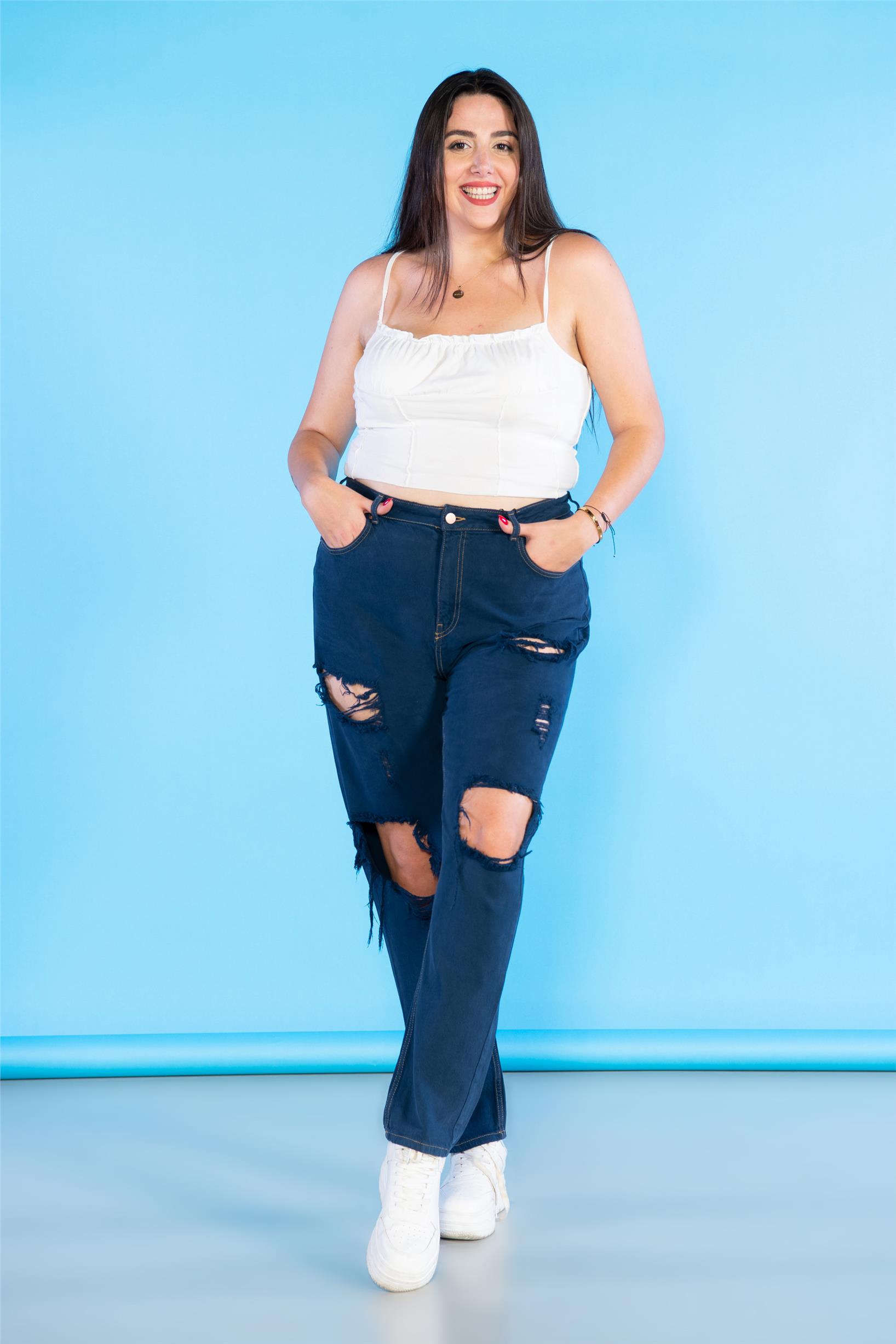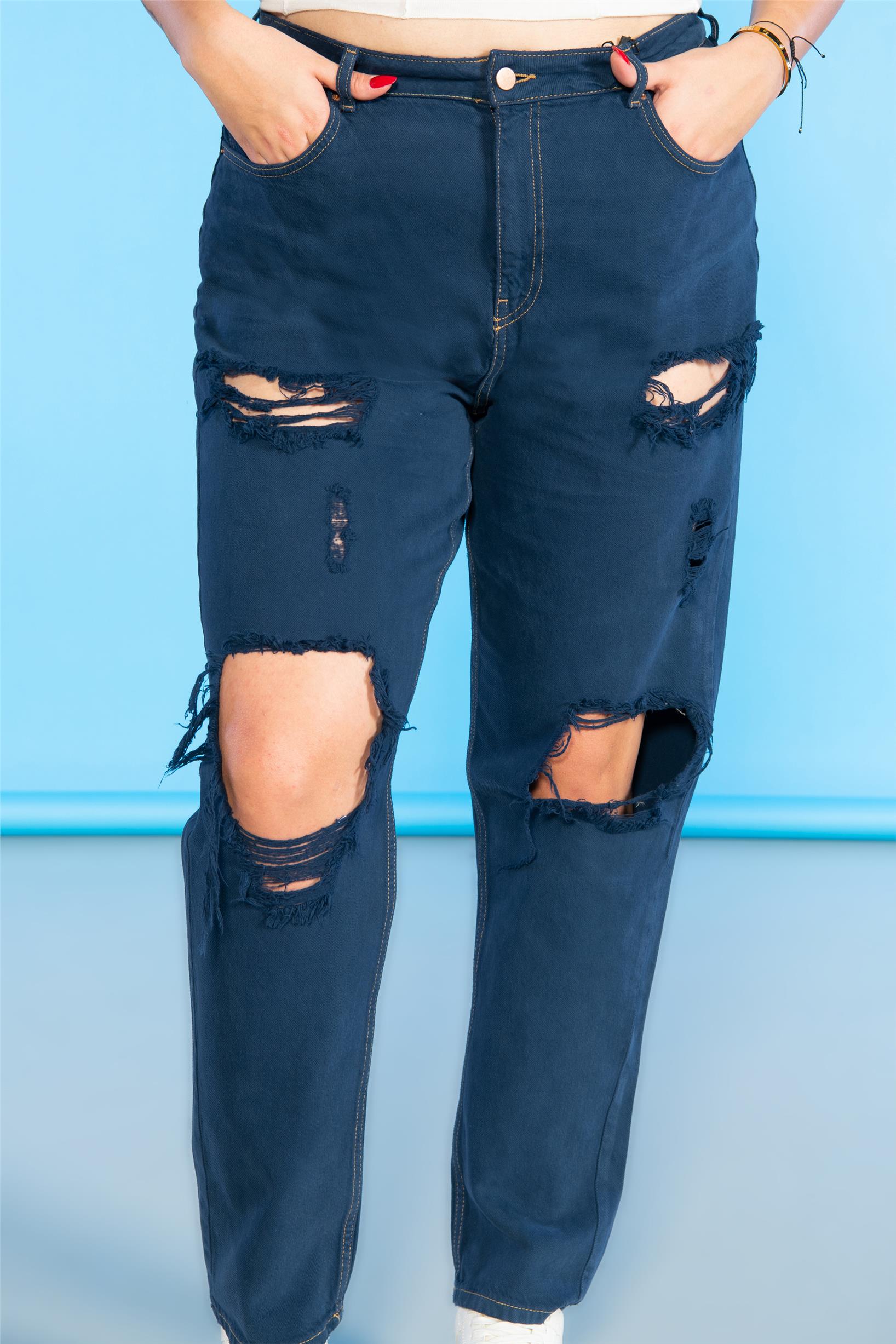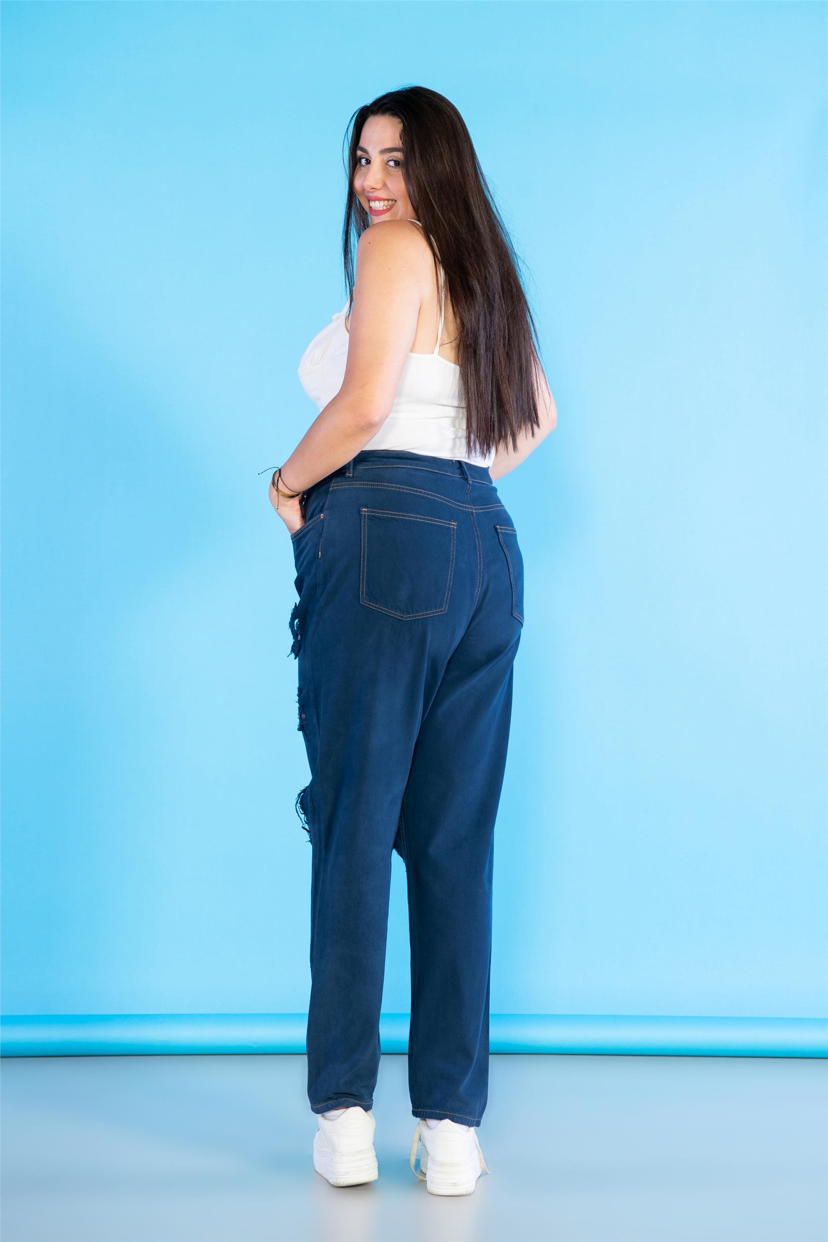 Büyük Beden Lacivert Yüksek Bel Diz Lazer Detay Mom Jeans