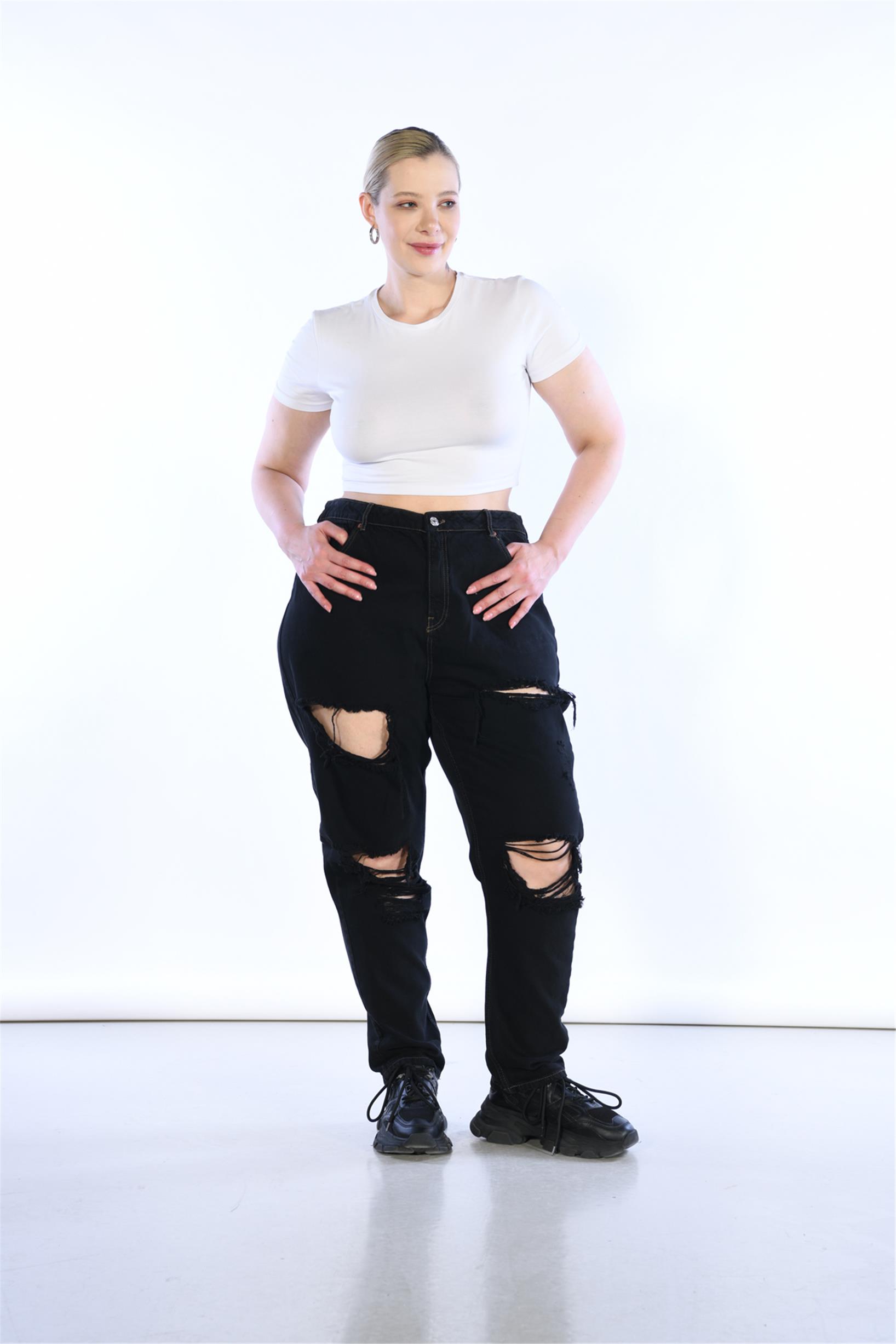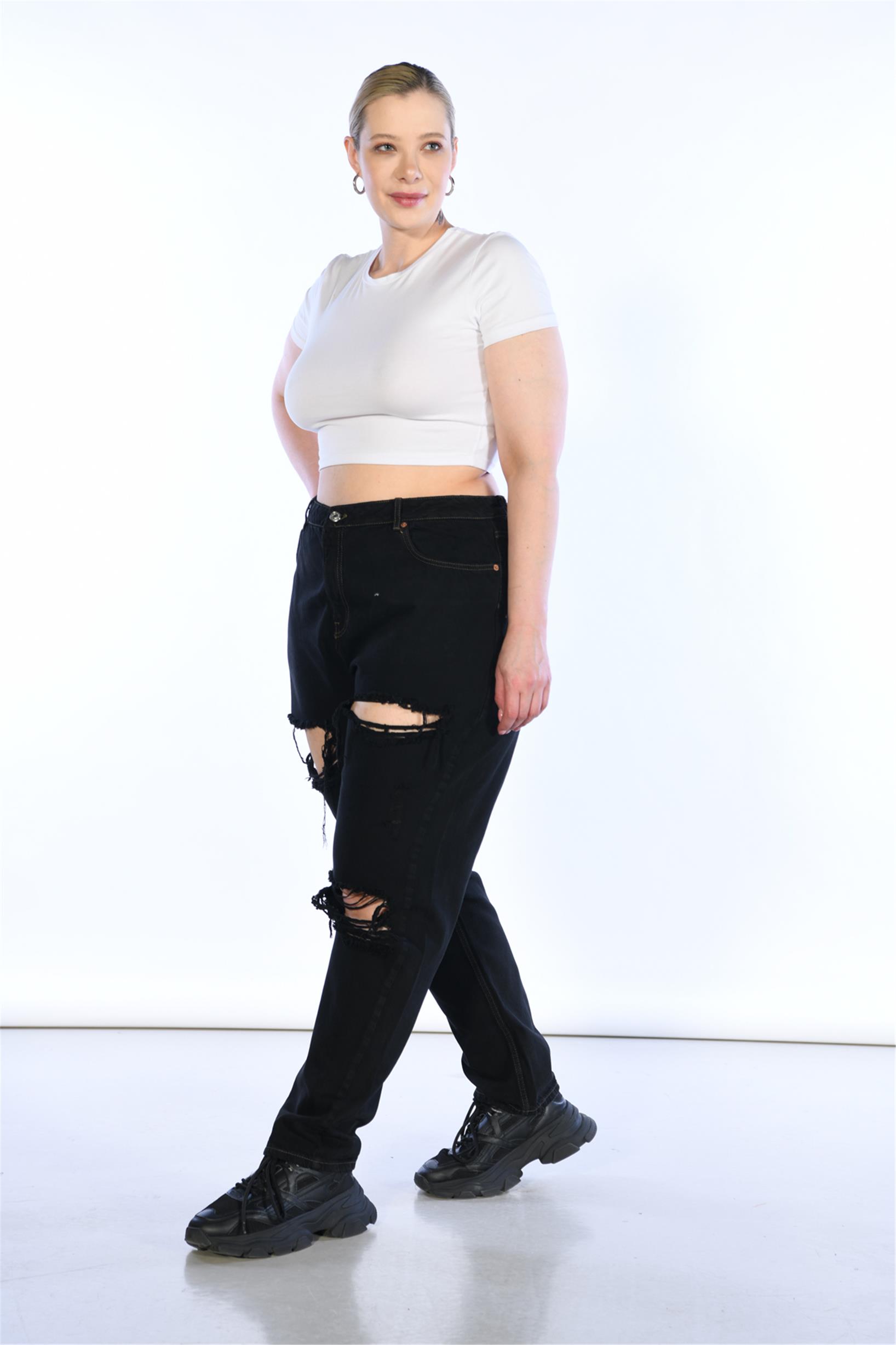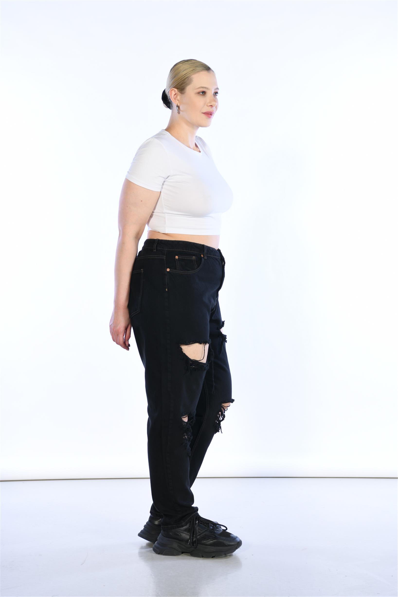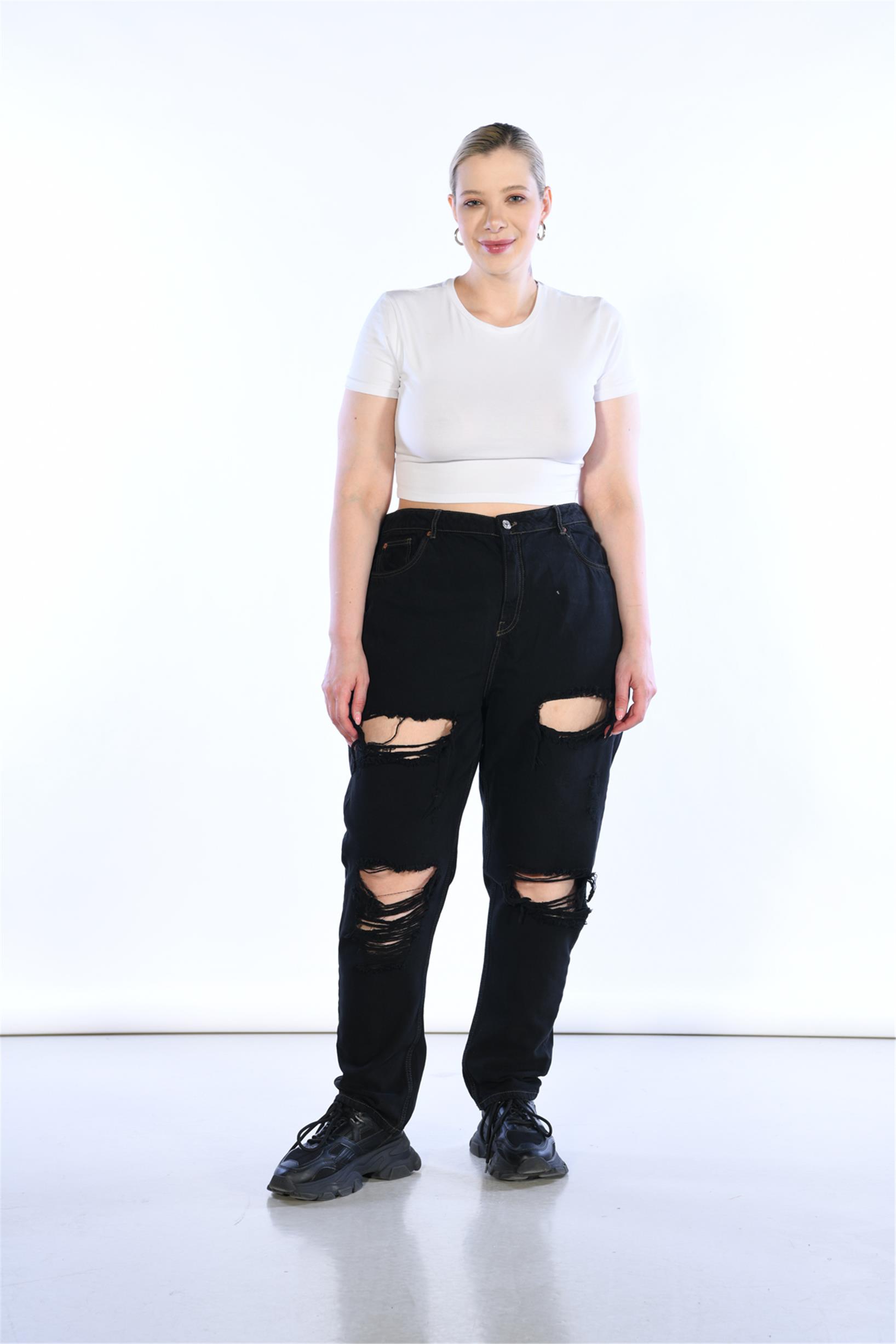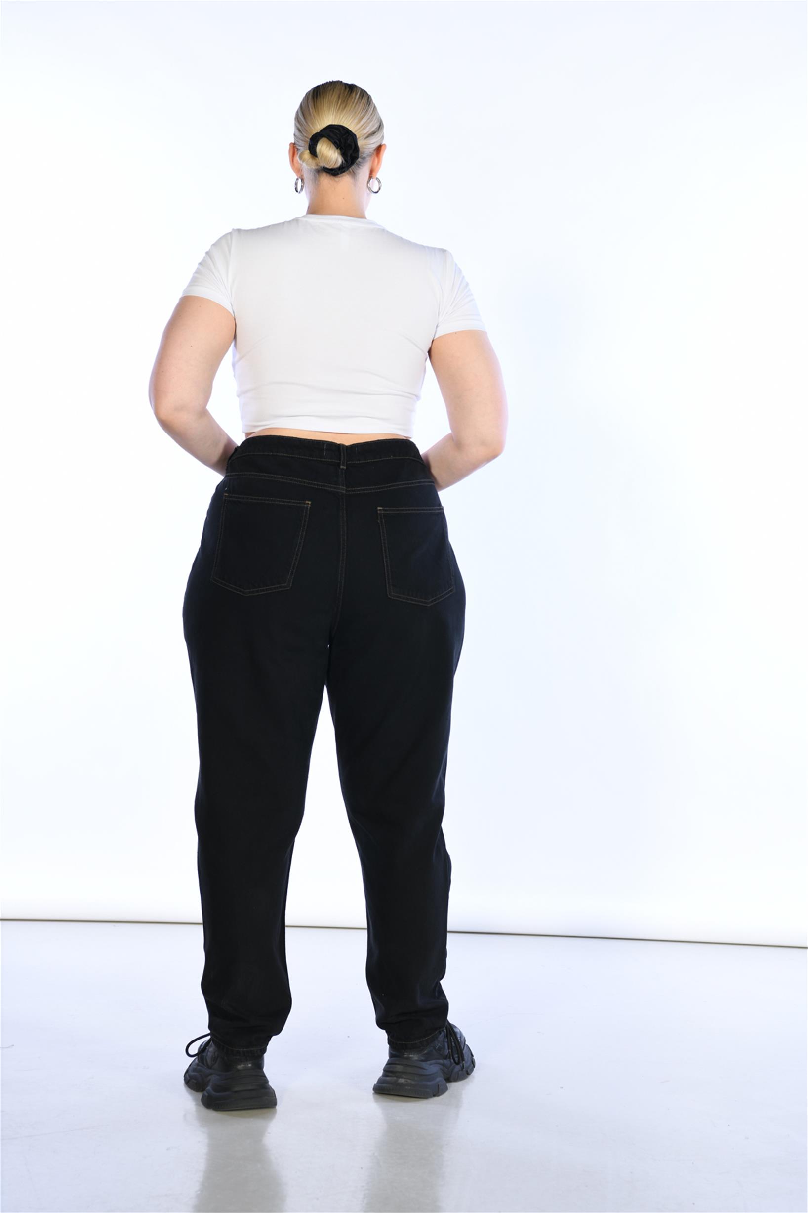 Büyük Beden Lacivert Yüksek Bel Lazerli Mom Jeans