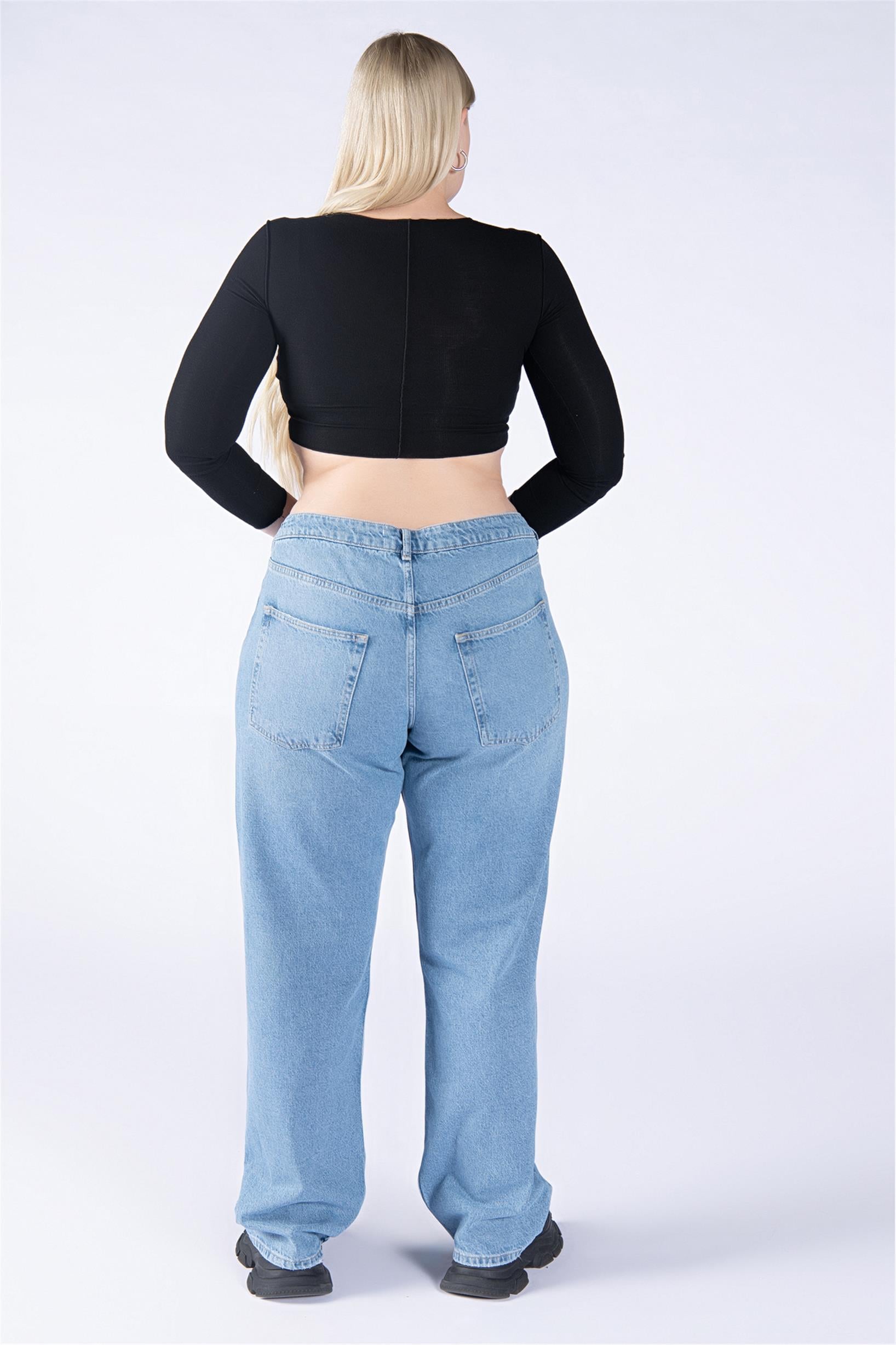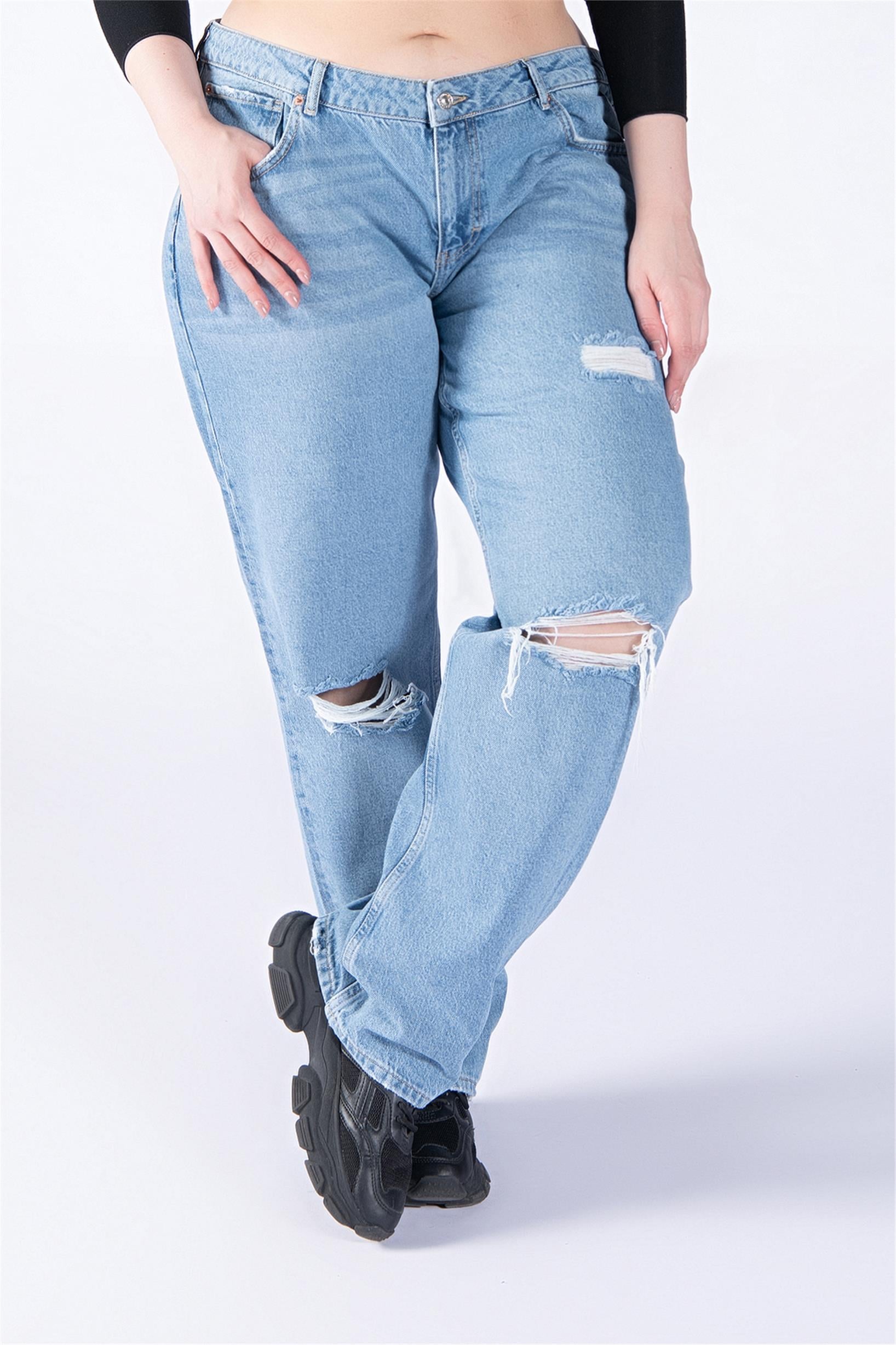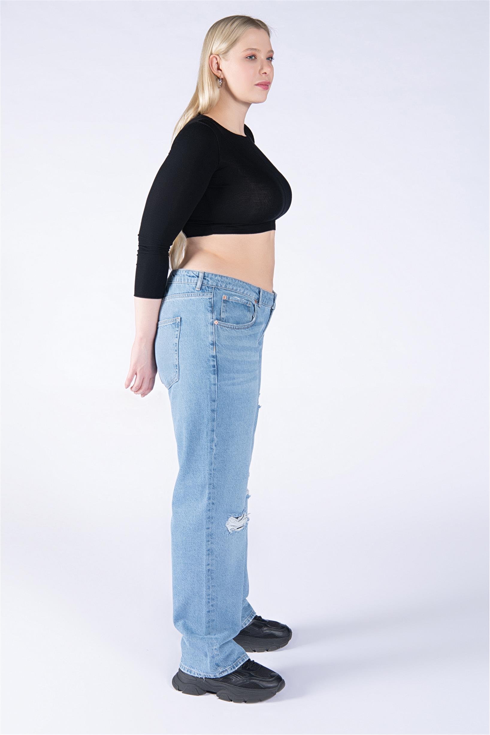 Büyük Beden Mavi Normal Bel Diz Lazer Wide Leg Jeans