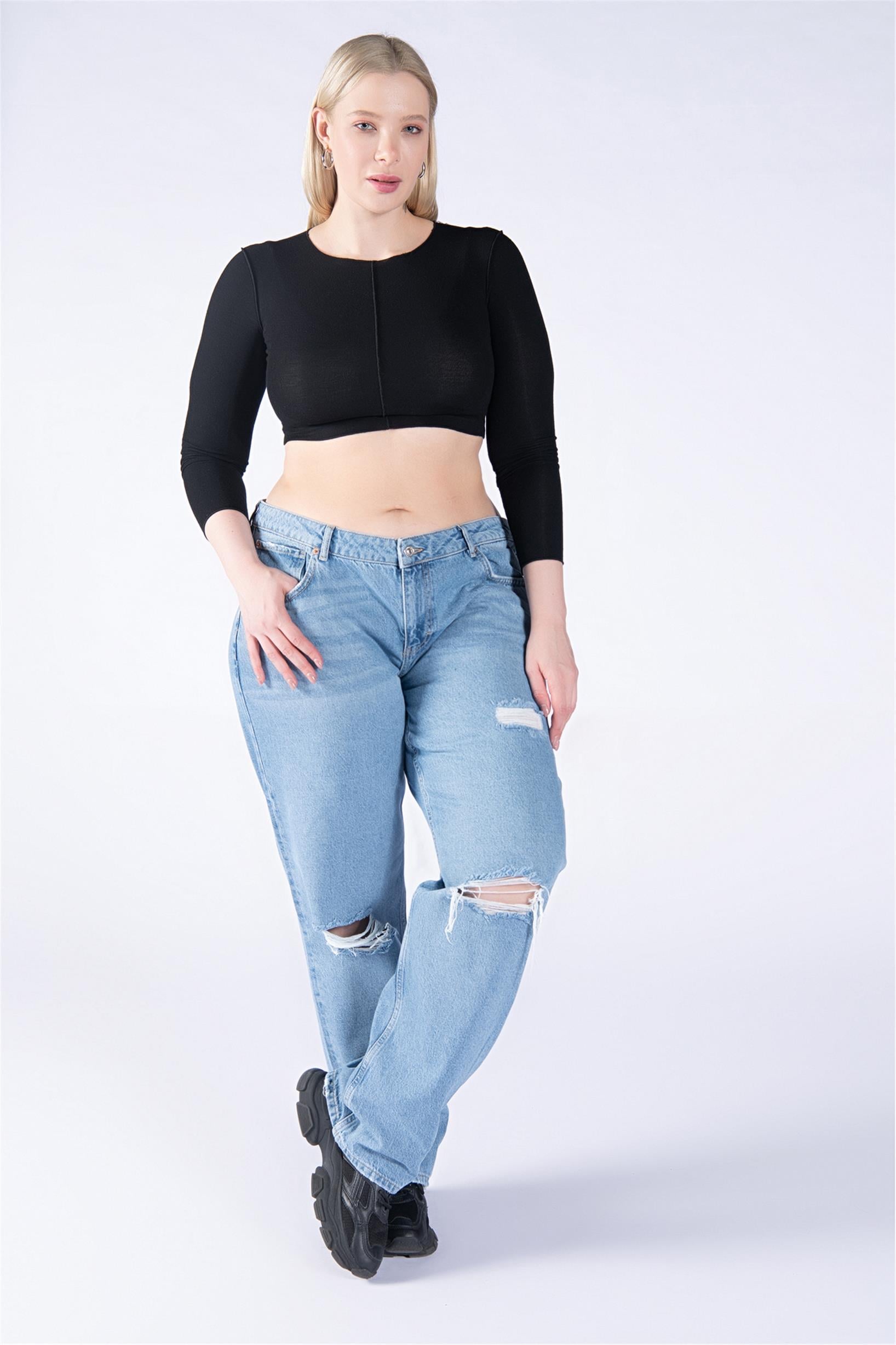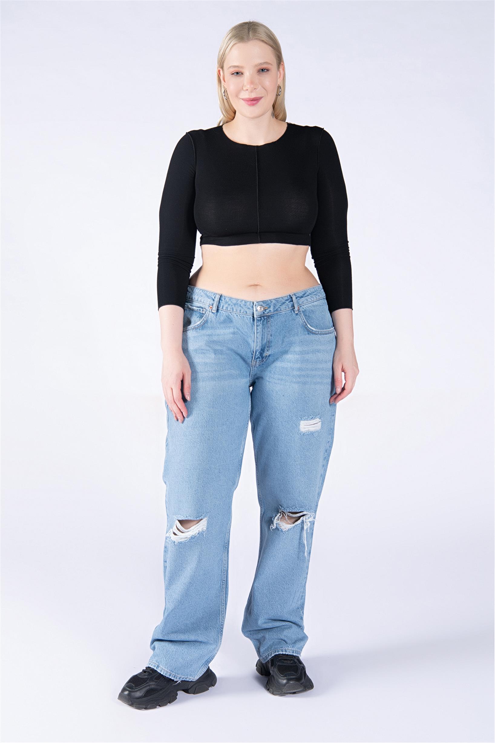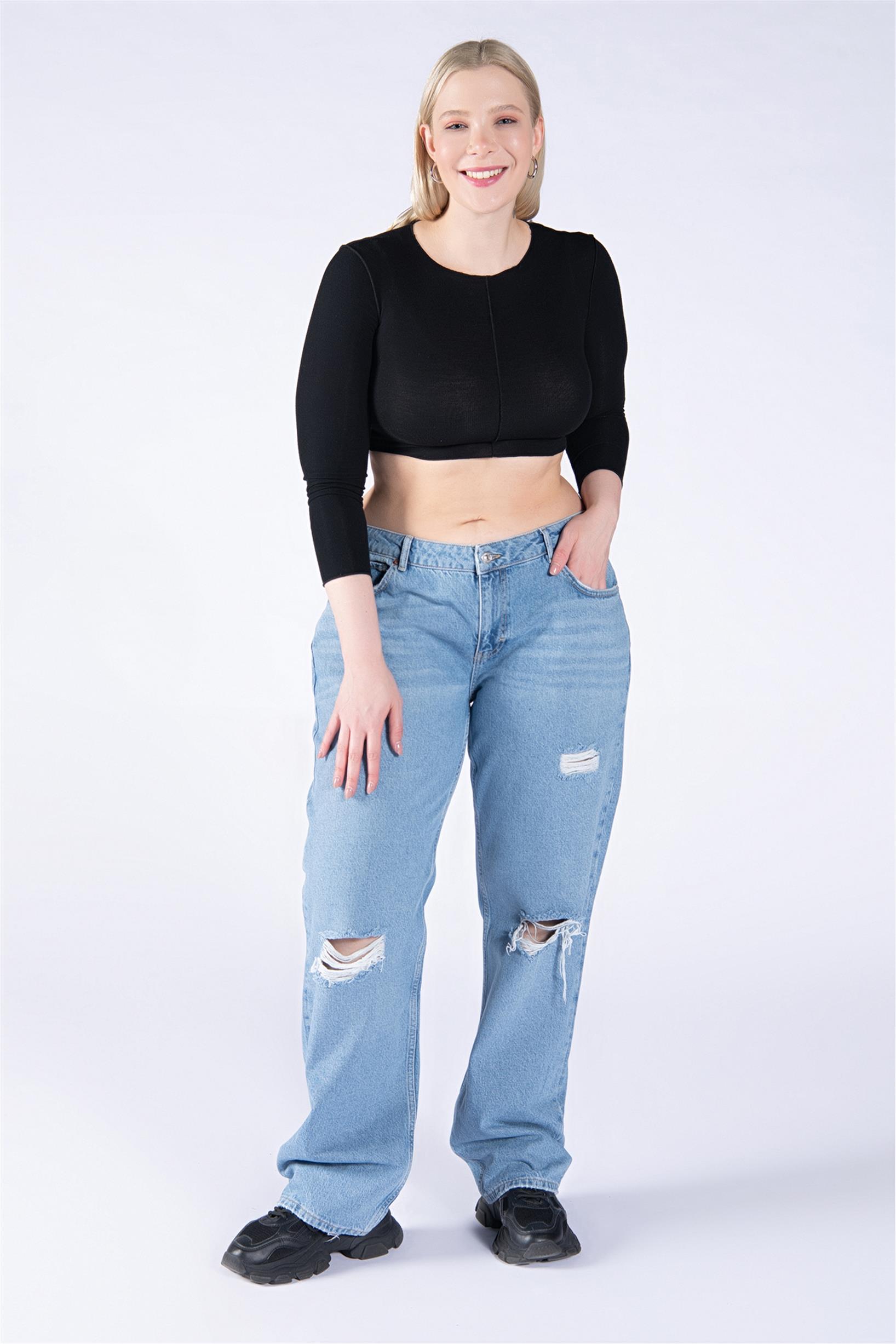 Büyük Beden Mavi Normal Bel Diz Lazer Wide Leg Jeans